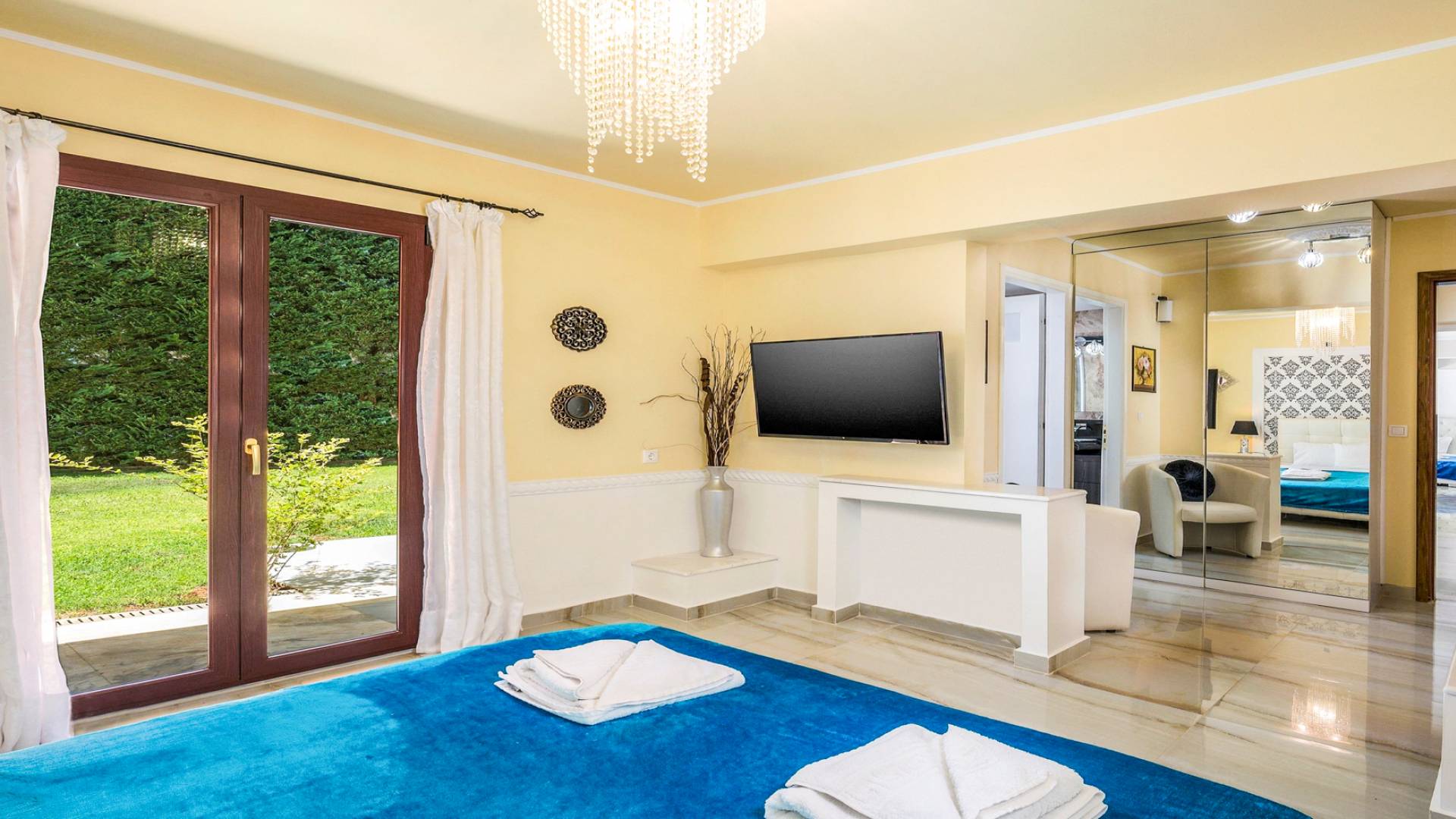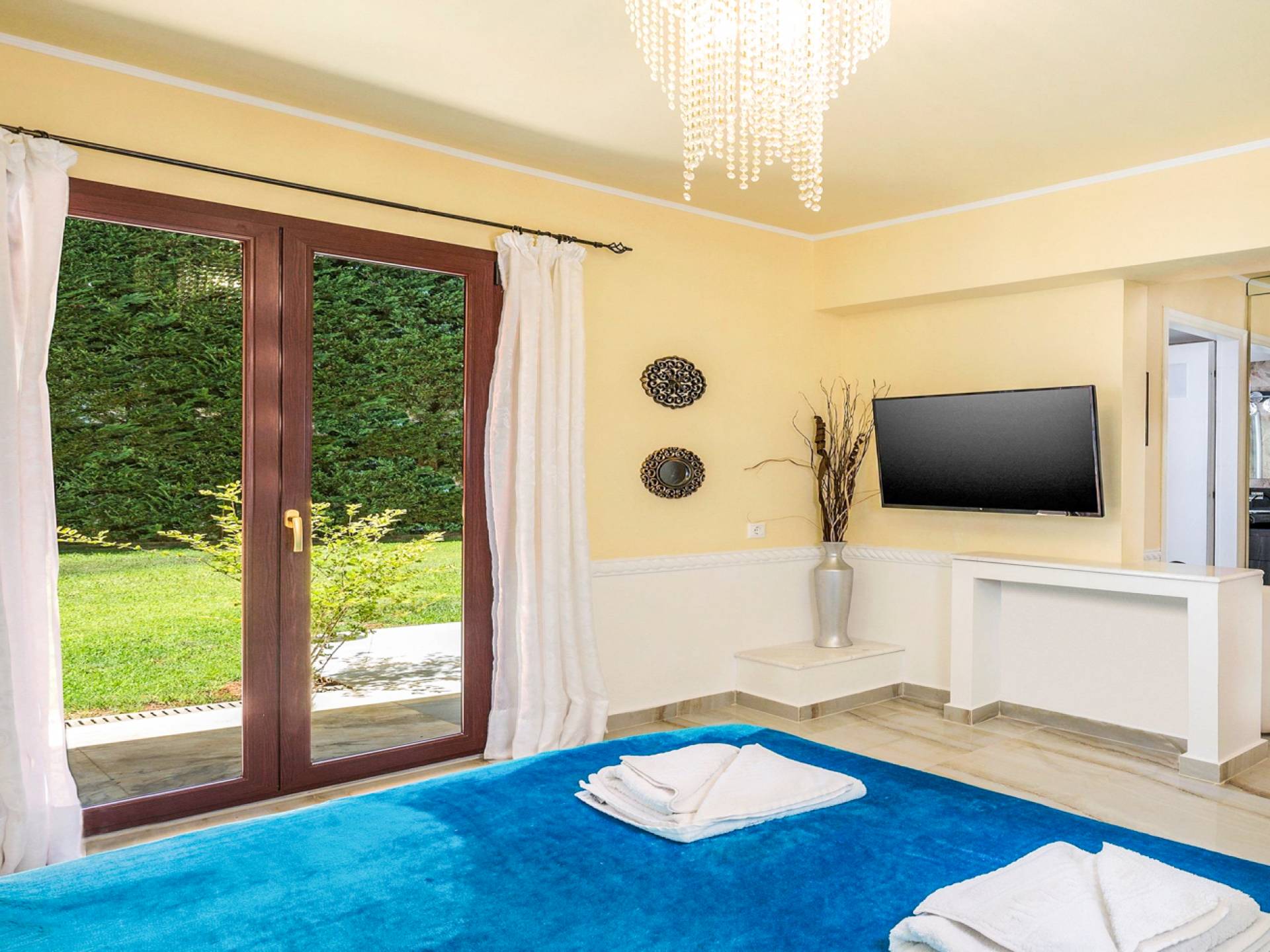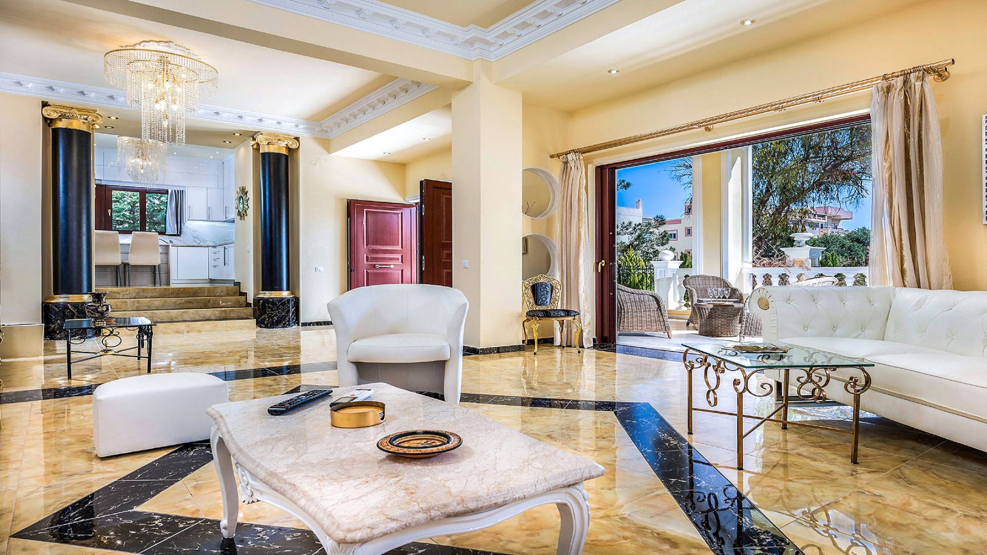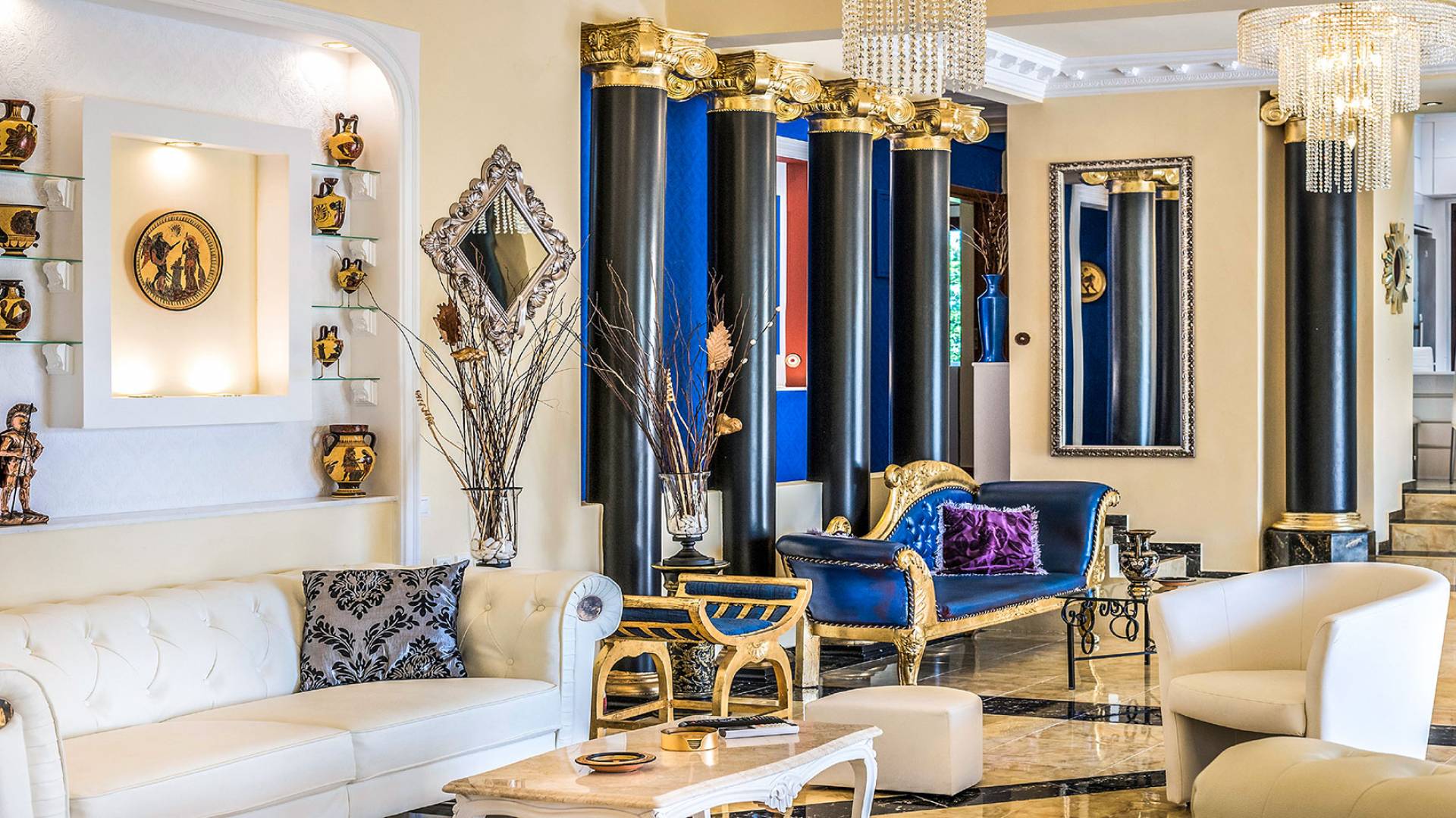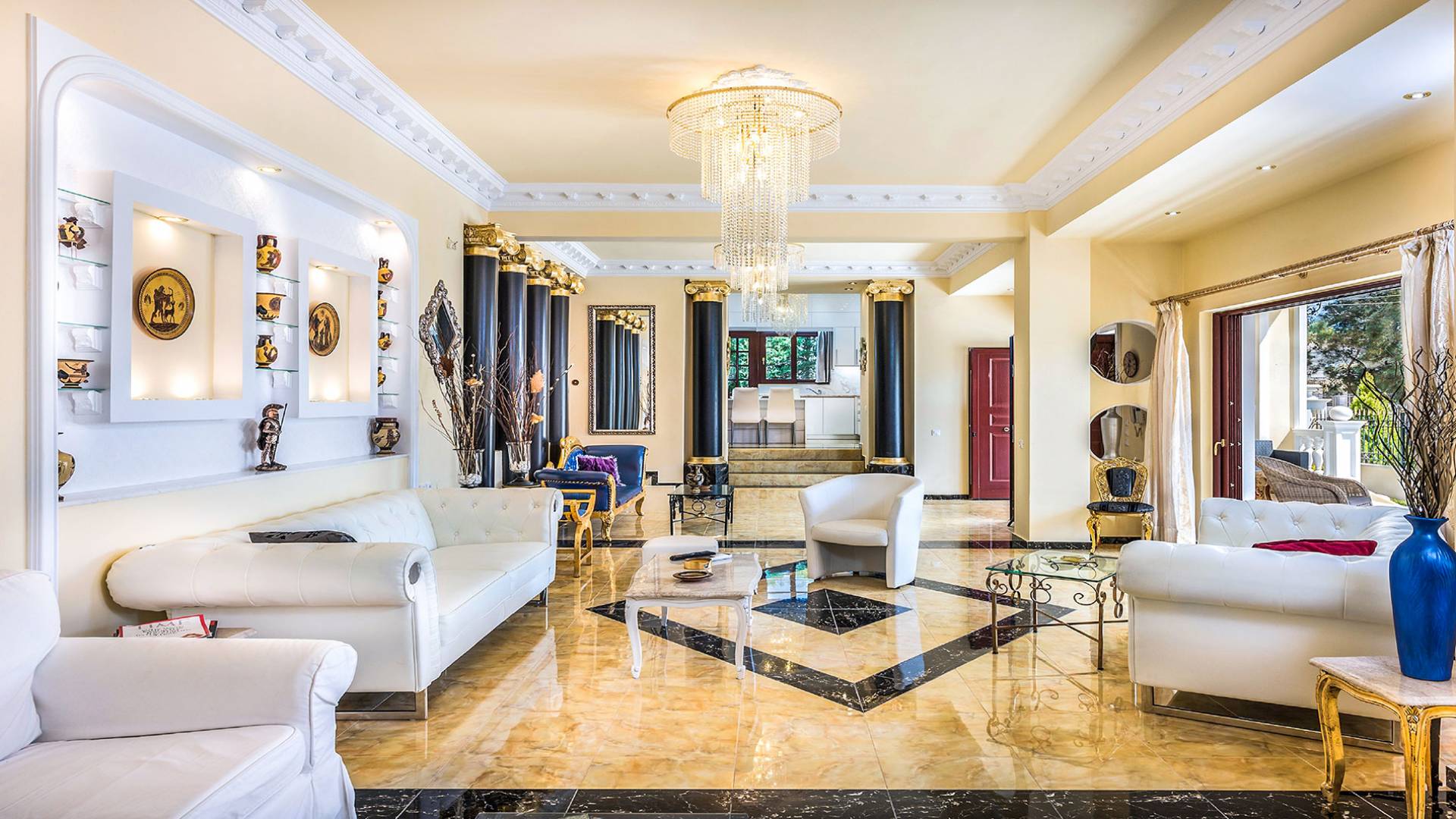 Μπείτε στο Villa Crown Chania, τα 3 μεγάλα σαλόνια με τις αρχαιοελληνικές κολώνες και τις χρυσές διακοσμήσεις, το σκαλισμένο τζάκι, η πρόσβαση στη μεγάλη βεράντα με τα λευκά μάρμαρα «Διονύσου» και τους τρεις επιχρυσωμένους πολυελαίους Swarovski θα σας εντυπωσιάσουν απόλυτα. Γιατί κάθε χρυσό πράγμα στη βίλα δεν είναι βαμμένο αλλά αληθινό φύλλο χρυσού 24 Κ. ή πλάκα χρυσού, σε συνδυασμό με τα γυαλιστερά δάπεδα, τον κρυφό φωτισμό, τα χρώματα, τα γύψινα σκαλίσματα και τους πίνακες, σου μεταφέρουν την αίσθηση της πολυτελούς κατασκευής και ακόμα και στους πιο ρομαντικούς ανθρώπους, την αίσθηση της Αρχαίας Ελλάδας. Αφού επιλέξετε να καθίσετε σε μερικές από τις πολυθρόνες ή τους άνετους καναπέδες που υπάρχουν στα σαλόνια και να ρυθμίσετε τον αυτόματο κλιματισμό, έχετε πρόσβαση στη μεγάλη τηλεόραση Smart led 55' με το home cinema, το DVD, τη δορυφορική τηλεόραση και το σύστημα Hi-Fi.