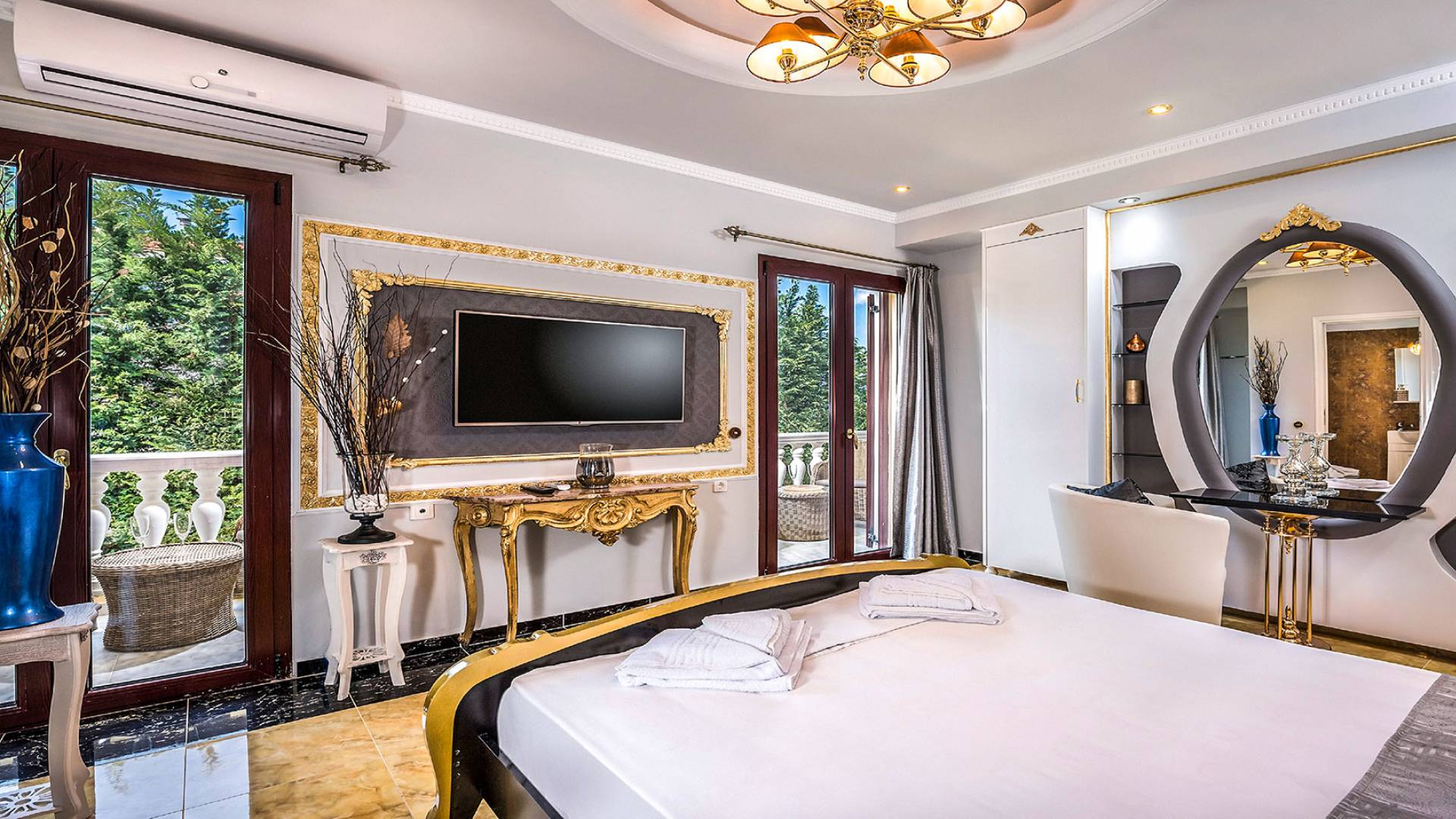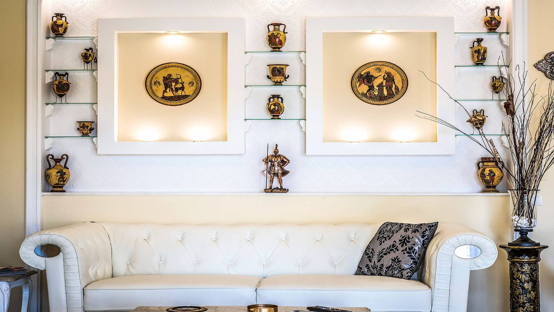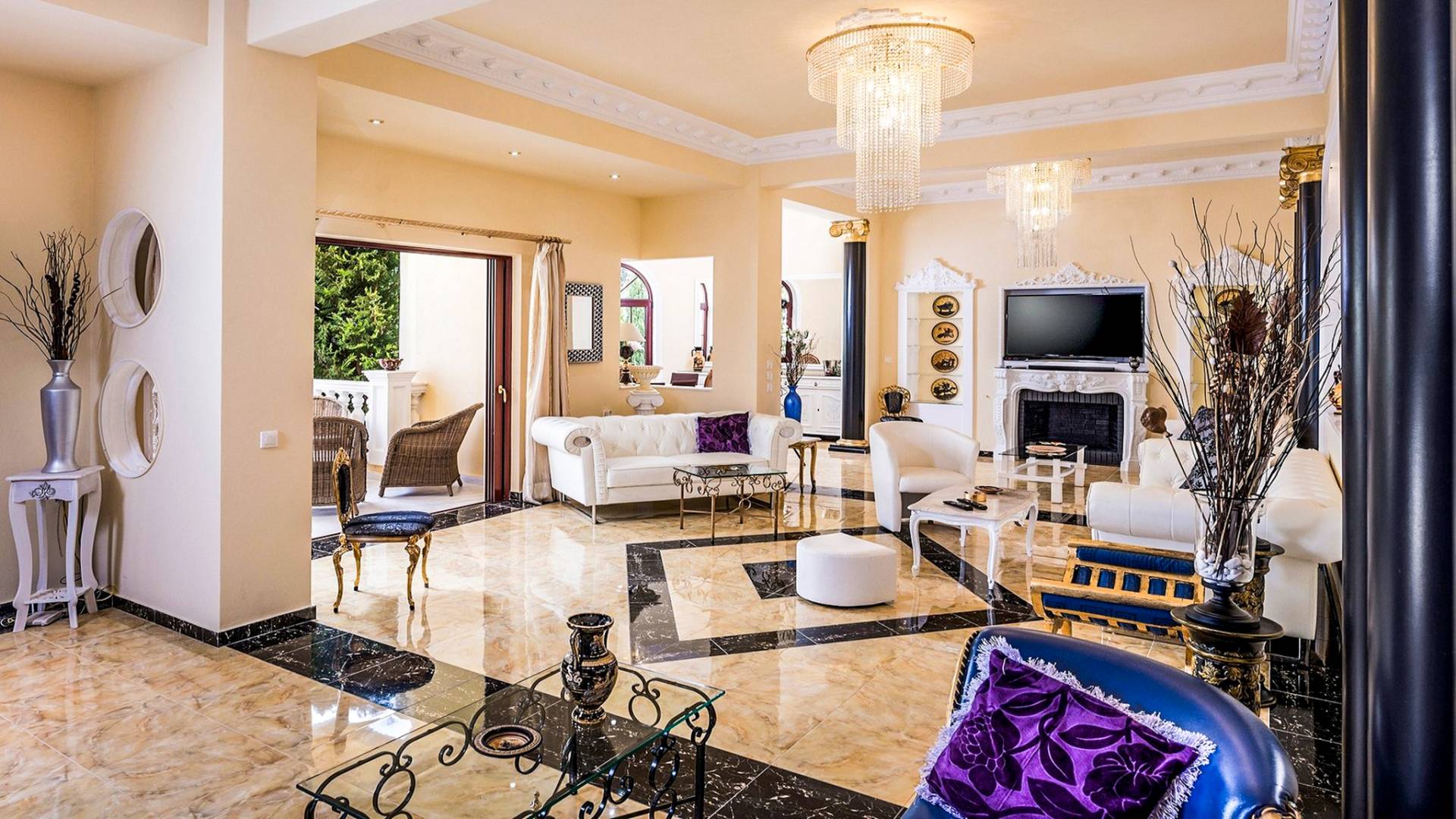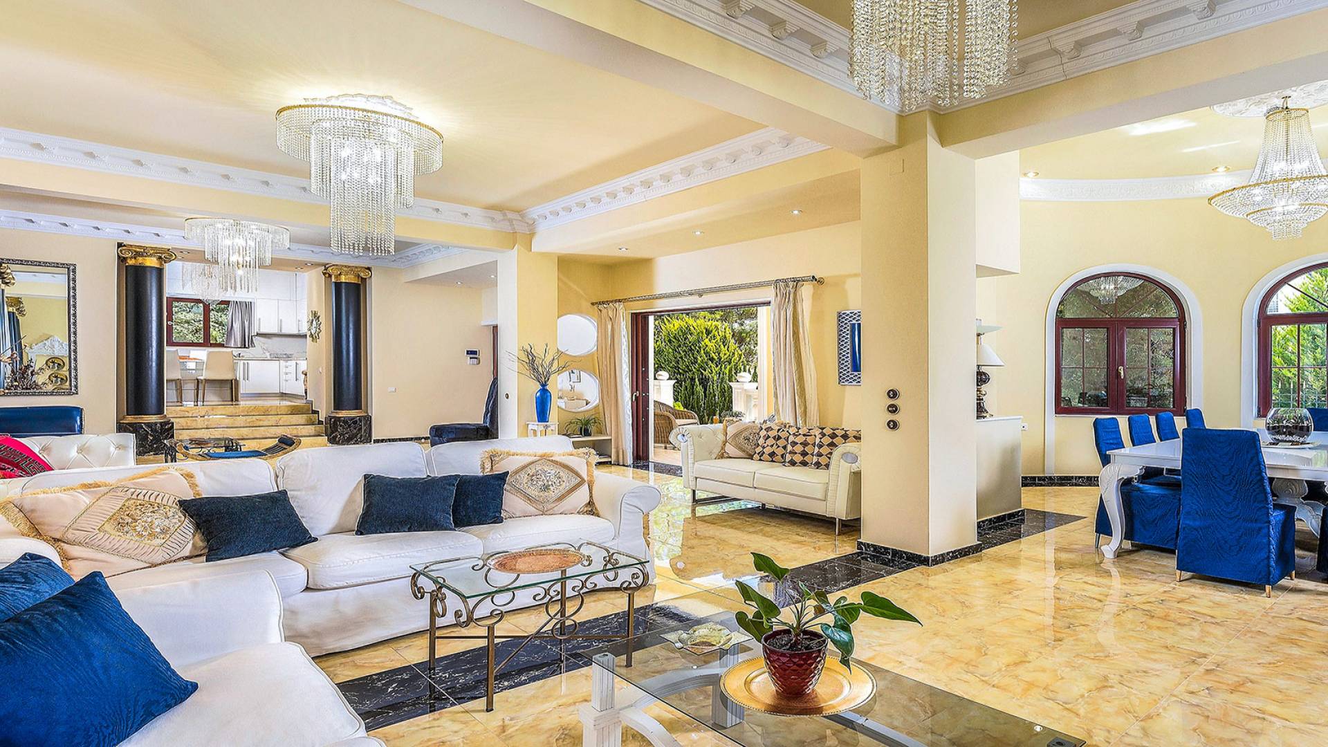 Μπείτε στο Villa Crown Chania, τα 3 μεγάλα σαλόνια με τις αρχαιοελληνικές κολώνες και τις χρυσές διακοσμήσεις, το σκαλισμένο τζάκι, η πρόσβαση στη μεγάλη βεράντα με τα λευκά μάρμαρα «Διονύσου» και τους τρεις επιχρυσωμένους πολυελαίους Swarovski θα σας εντυπωσιάσουν απόλυτα. Γιατί κάθε χρυσό πράγμα στη βίλα δεν είναι βαμμένο αλλά αληθινό φύλλο χρυσού 24 Κ. ή πλάκα χρυσού, σε συνδυασμό με τα γυαλιστερά δάπεδα, τον κρυφό φωτισμό, τα χρώματα, τα γύψινα σκαλίσματα και τους πίνακες, σου μεταφέρουν την αίσθηση της πολυτελούς κατασκευής και ακόμα και στους πιο ρομαντικούς ανθρώπους, την αίσθηση της Αρχαίας Ελλάδας. Αφού επιλέξετε να καθίσετε σε μερικές από τις πολυθρόνες ή τους άνετους καναπέδες που υπάρχουν στα σαλόνια και να ρυθμίσετε τον αυτόματο κλιματισμό, έχετε πρόσβαση στη μεγάλη τηλεόραση Smart led 55' με το home cinema, το DVD, τη δορυφορική τηλεόραση και το σύστημα Hi-Fi.
