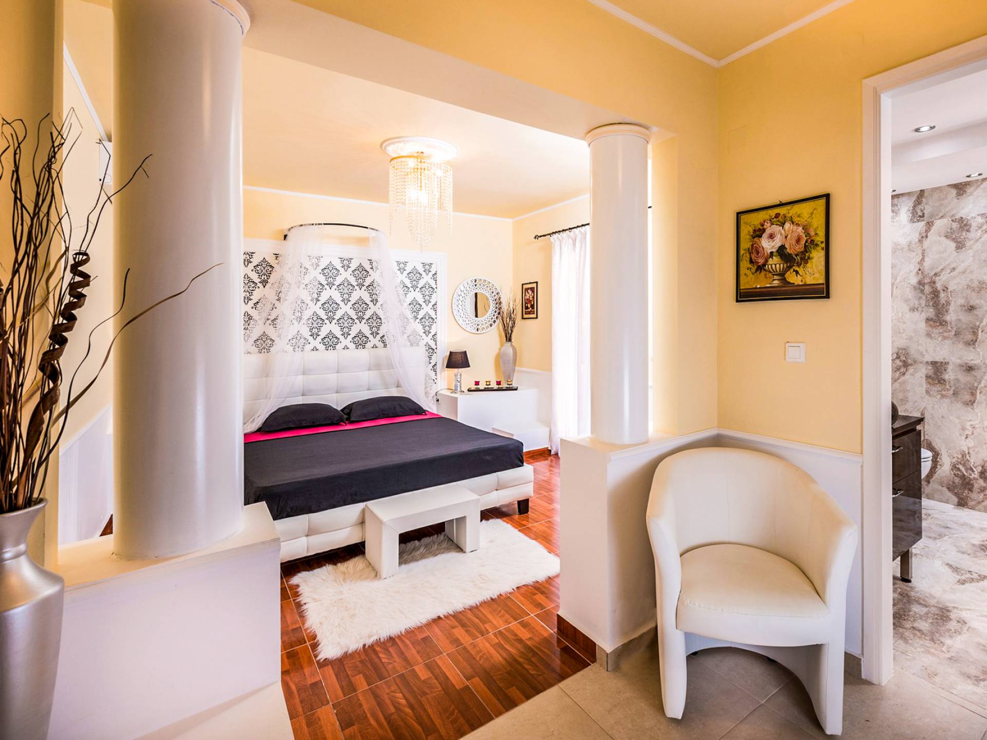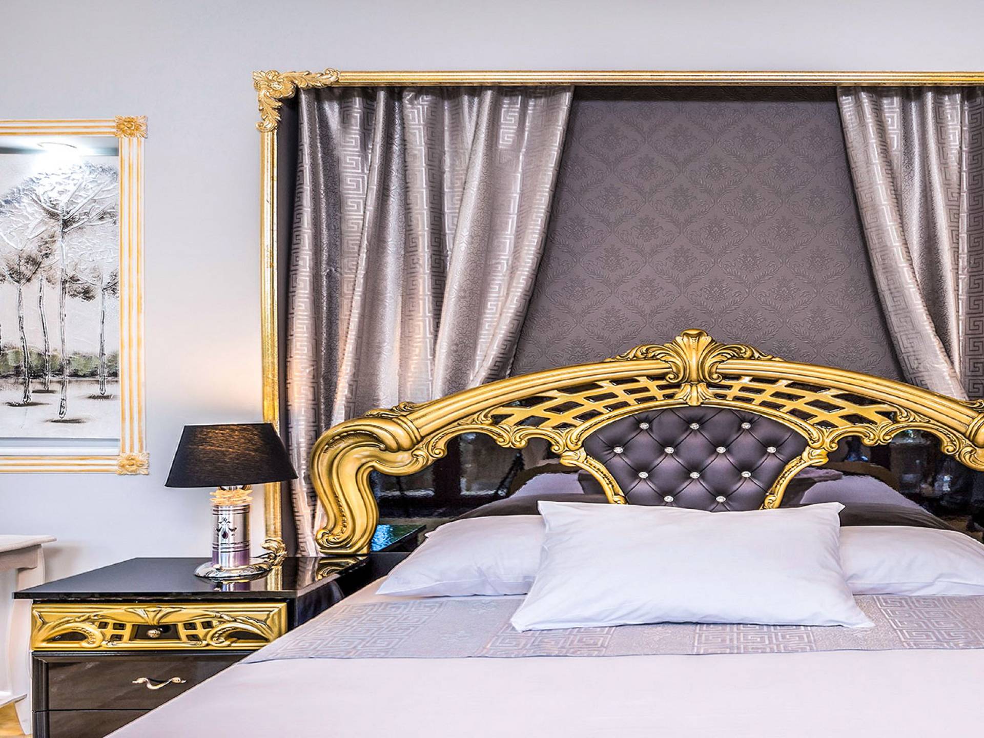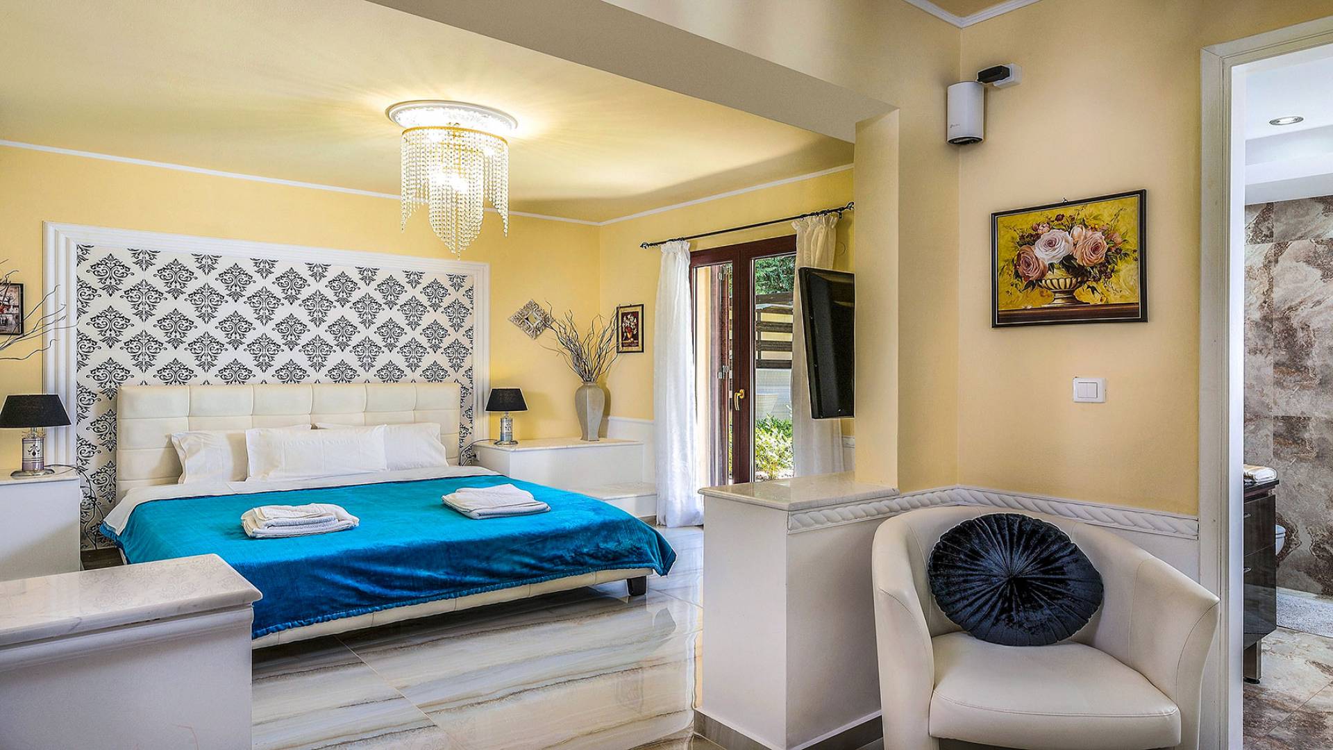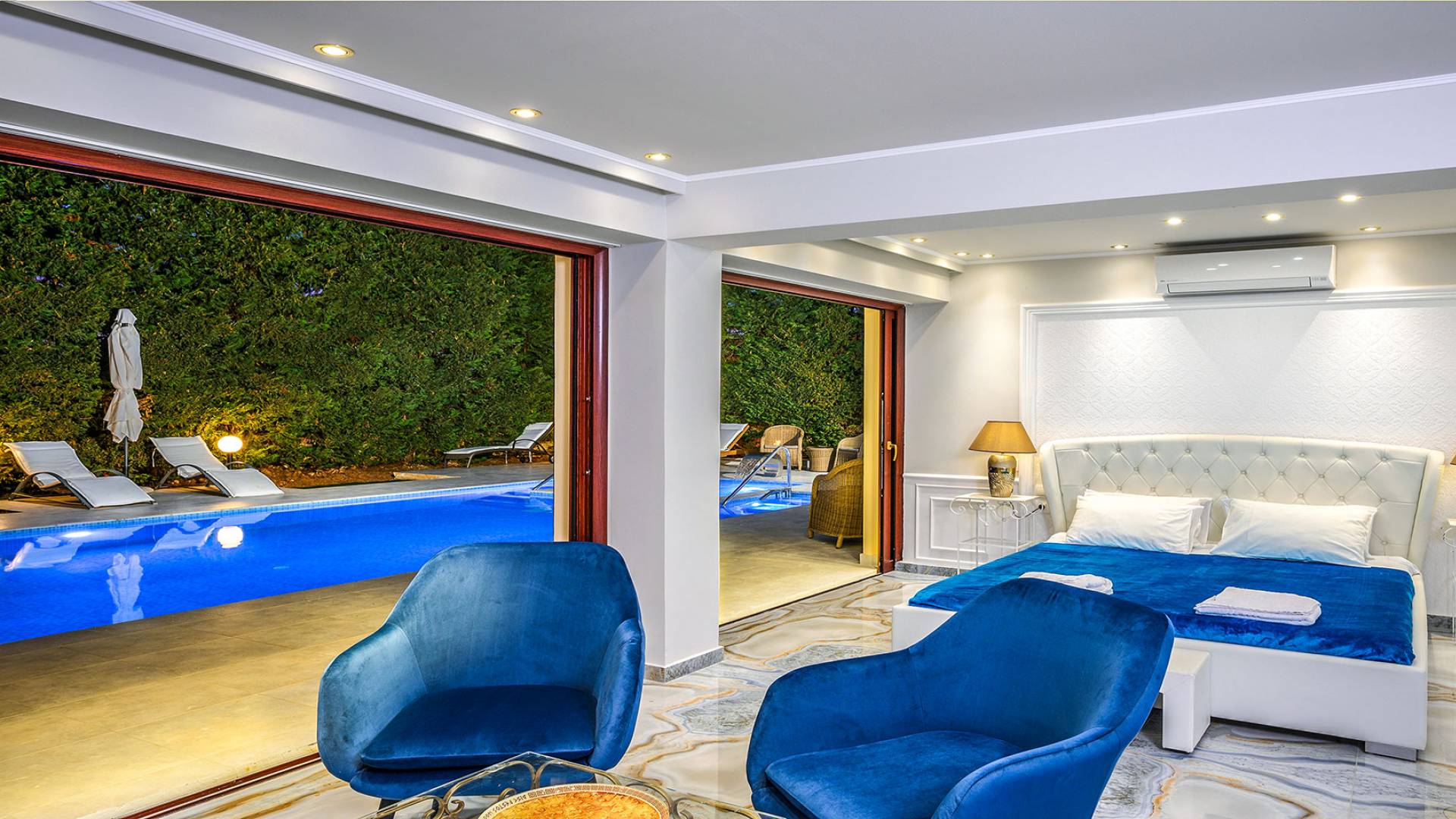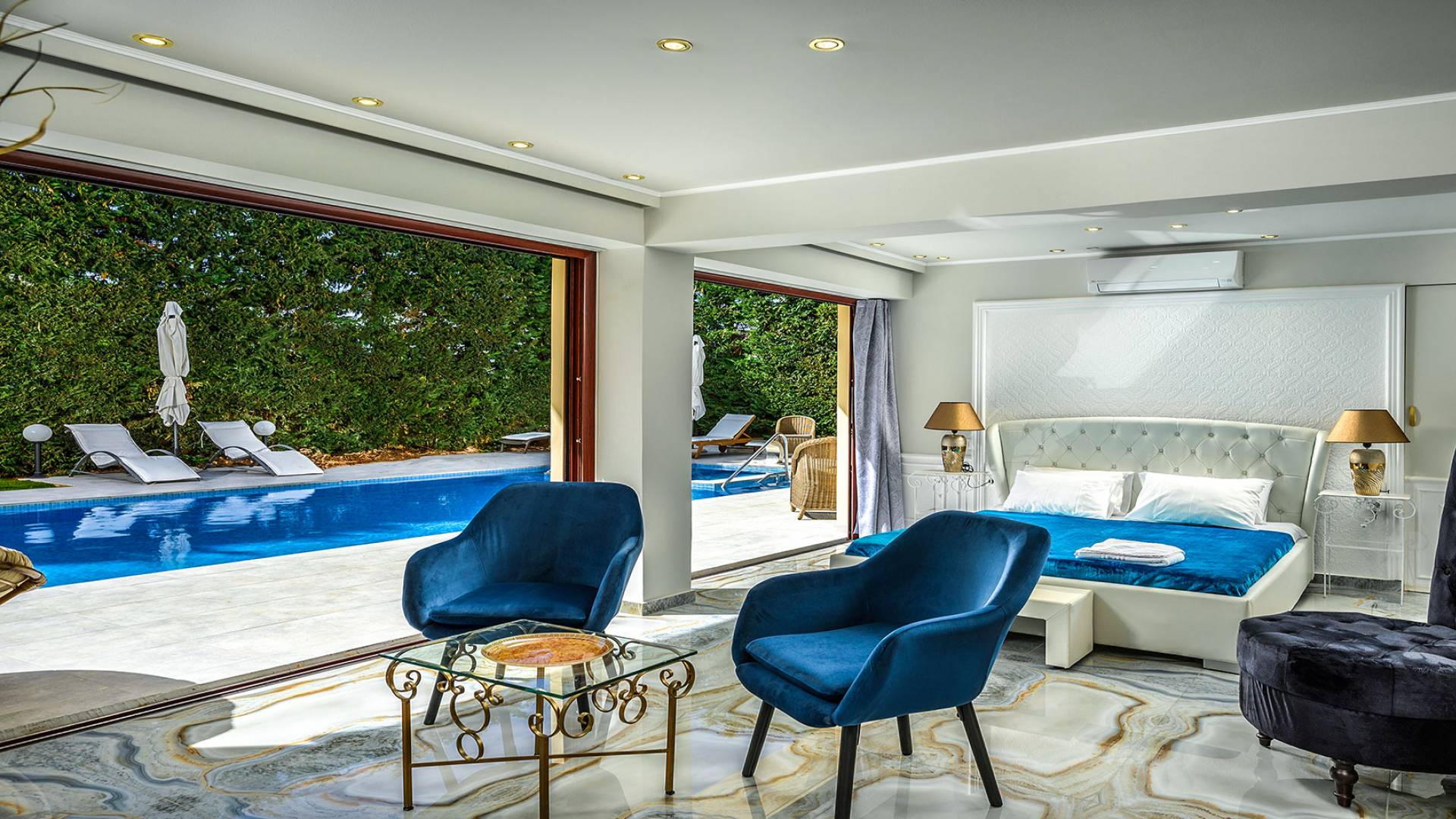 Μπείτε στο Villa Crown Chania, τα 3 μεγάλα σαλόνια με τις αρχαιοελληνικές κολώνες και τις χρυσές διακοσμήσεις, το σκαλισμένο τζάκι, η πρόσβαση στη μεγάλη βεράντα με τα λευκά μάρμαρα «Διονύσου» και τους τρεις επιχρυσωμένους πολυελαίους Swarovski θα σας εντυπωσιάσουν απόλυτα. Γιατί κάθε χρυσό πράγμα στη βίλα δεν είναι βαμμένο αλλά αληθινό φύλλο χρυσού 24 Κ. ή πλάκα χρυσού, σε συνδυασμό με τα γυαλιστερά δάπεδα, τον κρυφό φωτισμό, τα χρώματα, τα γύψινα σκαλίσματα και τους πίνακες, σου μεταφέρουν την αίσθηση της πολυτελούς κατασκευής και ακόμα και στους πιο ρομαντικούς ανθρώπους, την αίσθηση της Αρχαίας Ελλάδας. Αφού επιλέξετε να καθίσετε σε μερικές από τις πολυθρόνες ή τους άνετους καναπέδες που υπάρχουν στα σαλόνια και να ρυθμίσετε τον αυτόματο κλιματισμό, έχετε πρόσβαση στη μεγάλη τηλεόραση Smart led 55' με το home cinema, το DVD, τη δορυφορική τηλεόραση και το σύστημα Hi-Fi.