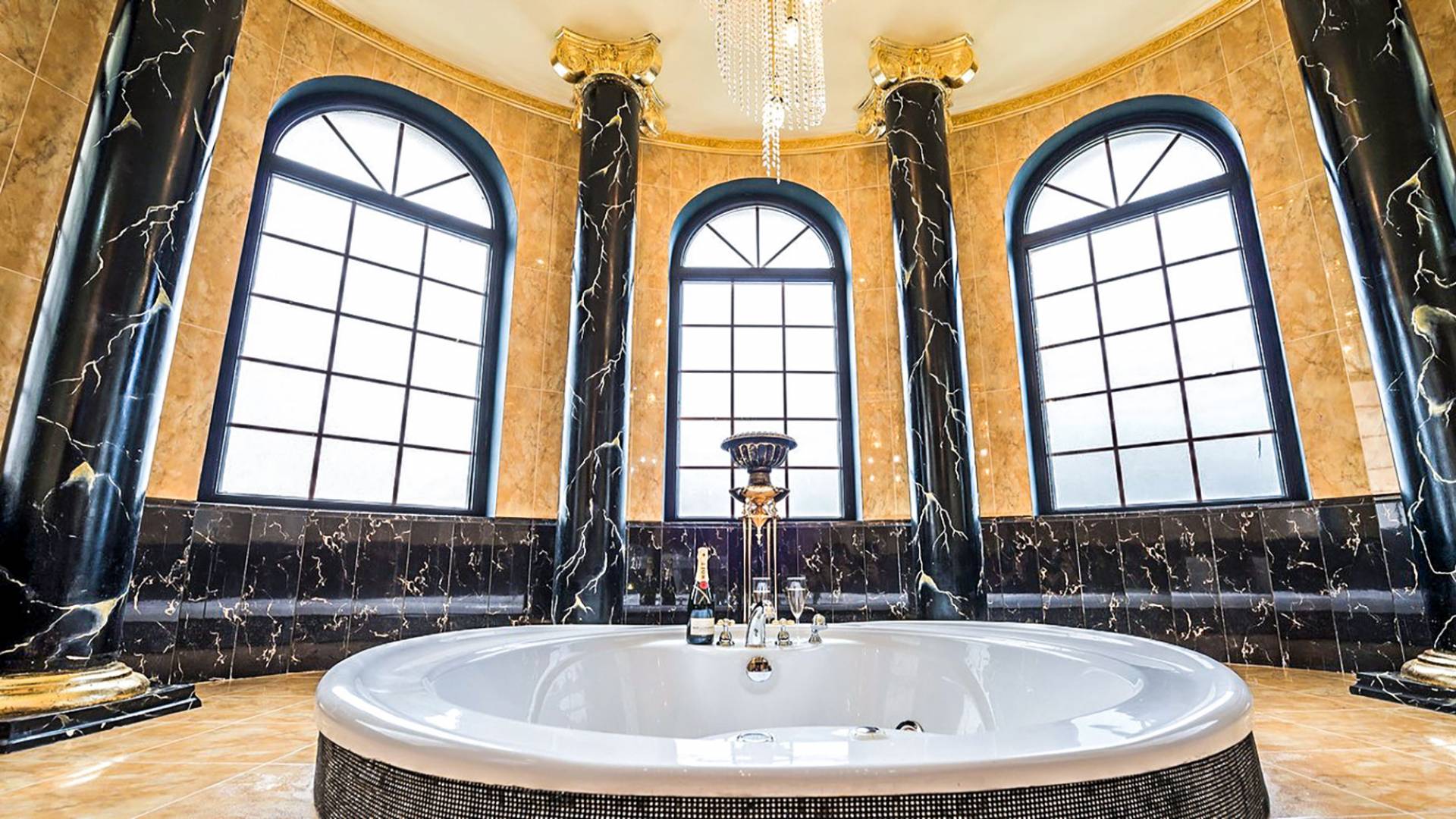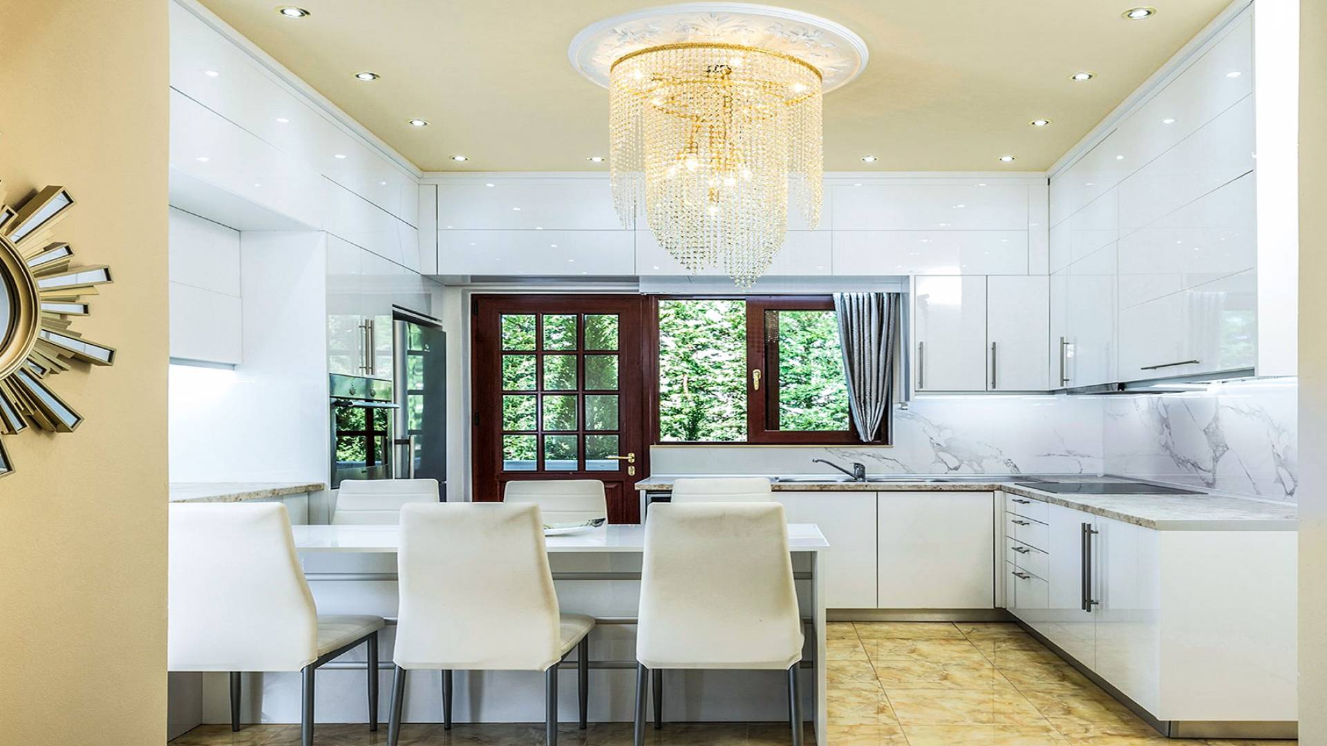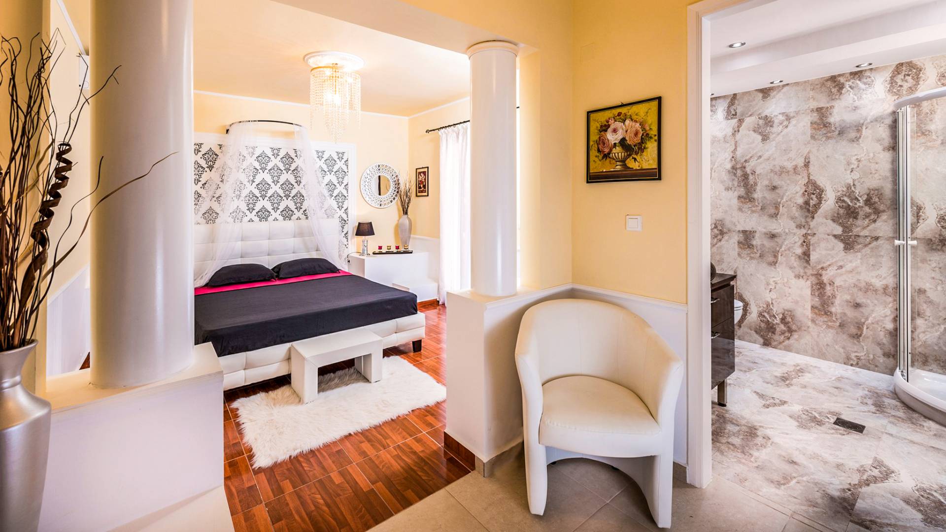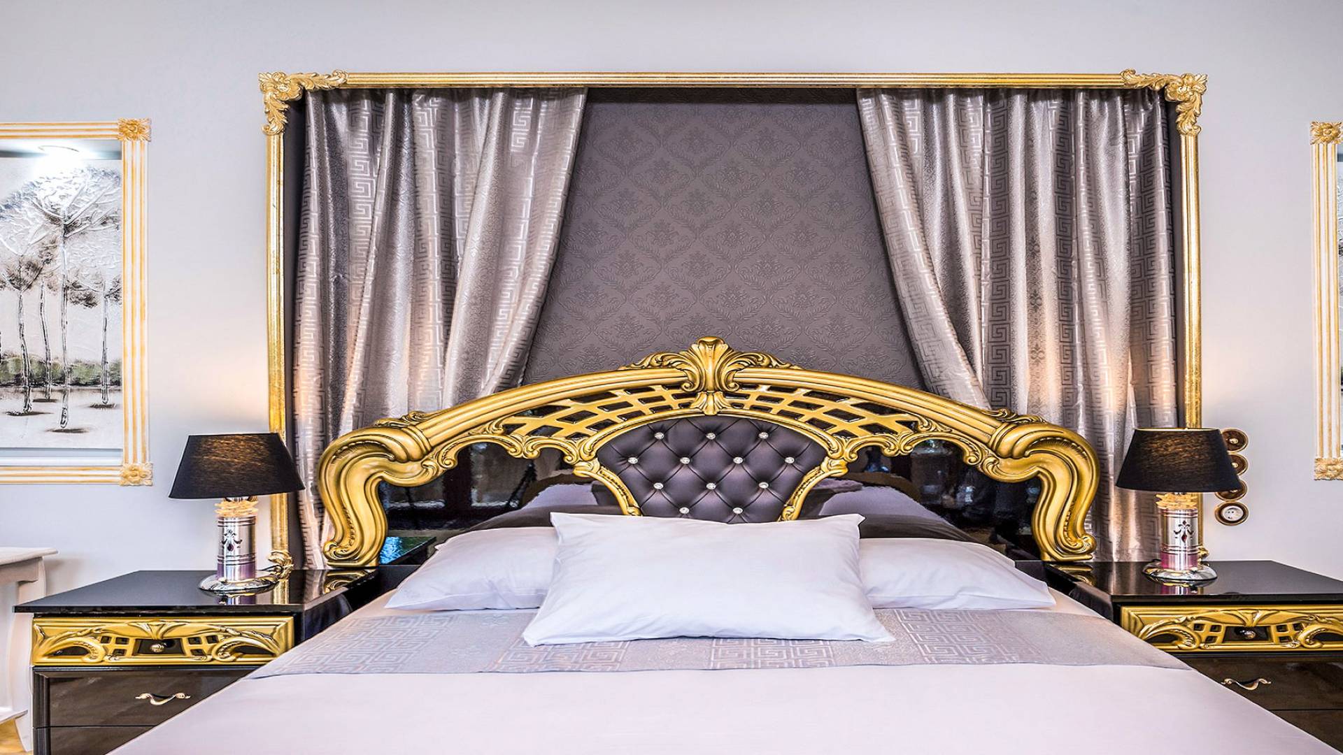 Μπείτε στο Villa Crown Chania, τα 3 μεγάλα σαλόνια με τις αρχαιοελληνικές κολώνες και τις χρυσές διακοσμήσεις, το σκαλισμένο τζάκι, η πρόσβαση στη μεγάλη βεράντα με τα λευκά μάρμαρα «Διονύσου» και τους τρεις επιχρυσωμένους πολυελαίους Swarovski θα σας εντυπωσιάσουν απόλυτα. Γιατί κάθε χρυσό πράγμα στη βίλα δεν είναι βαμμένο αλλά αληθινό φύλλο χρυσού 24 Κ. ή πλάκα χρυσού, σε συνδυασμό με τα γυαλιστερά δάπεδα, τον κρυφό φωτισμό, τα χρώματα, τα γύψινα σκαλίσματα και τους πίνακες, σου μεταφέρουν την αίσθηση της πολυτελούς κατασκευής και ακόμα και στους πιο ρομαντικούς ανθρώπους, την αίσθηση της Αρχαίας Ελλάδας. Αφού επιλέξετε να καθίσετε σε μερικές από τις πολυθρόνες ή τους άνετους καναπέδες που υπάρχουν στα σαλόνια και να ρυθμίσετε τον αυτόματο κλιματισμό, έχετε πρόσβαση στη μεγάλη τηλεόραση Smart led 55' με το home cinema, το DVD, τη δορυφορική τηλεόραση και το σύστημα Hi-Fi.