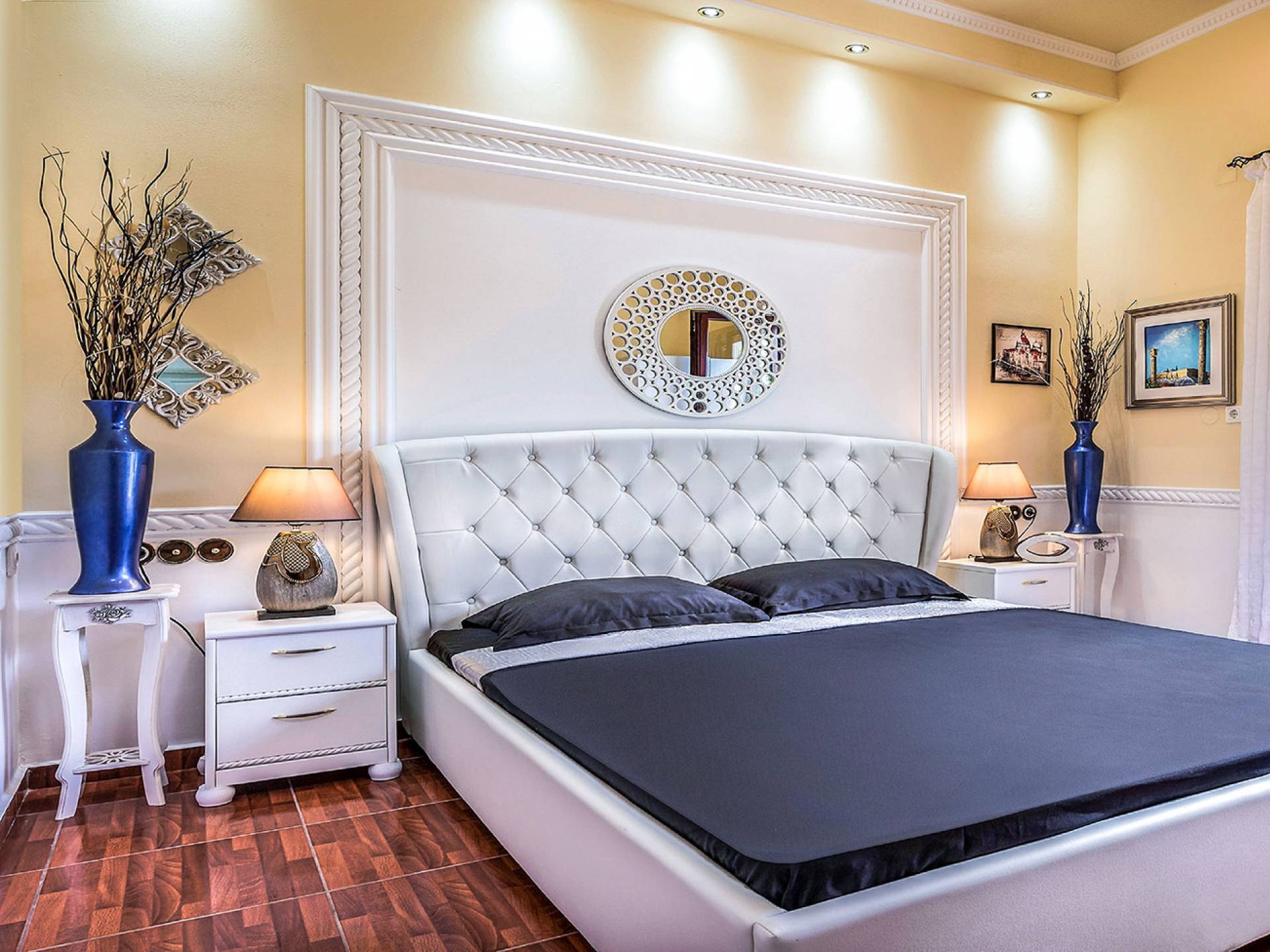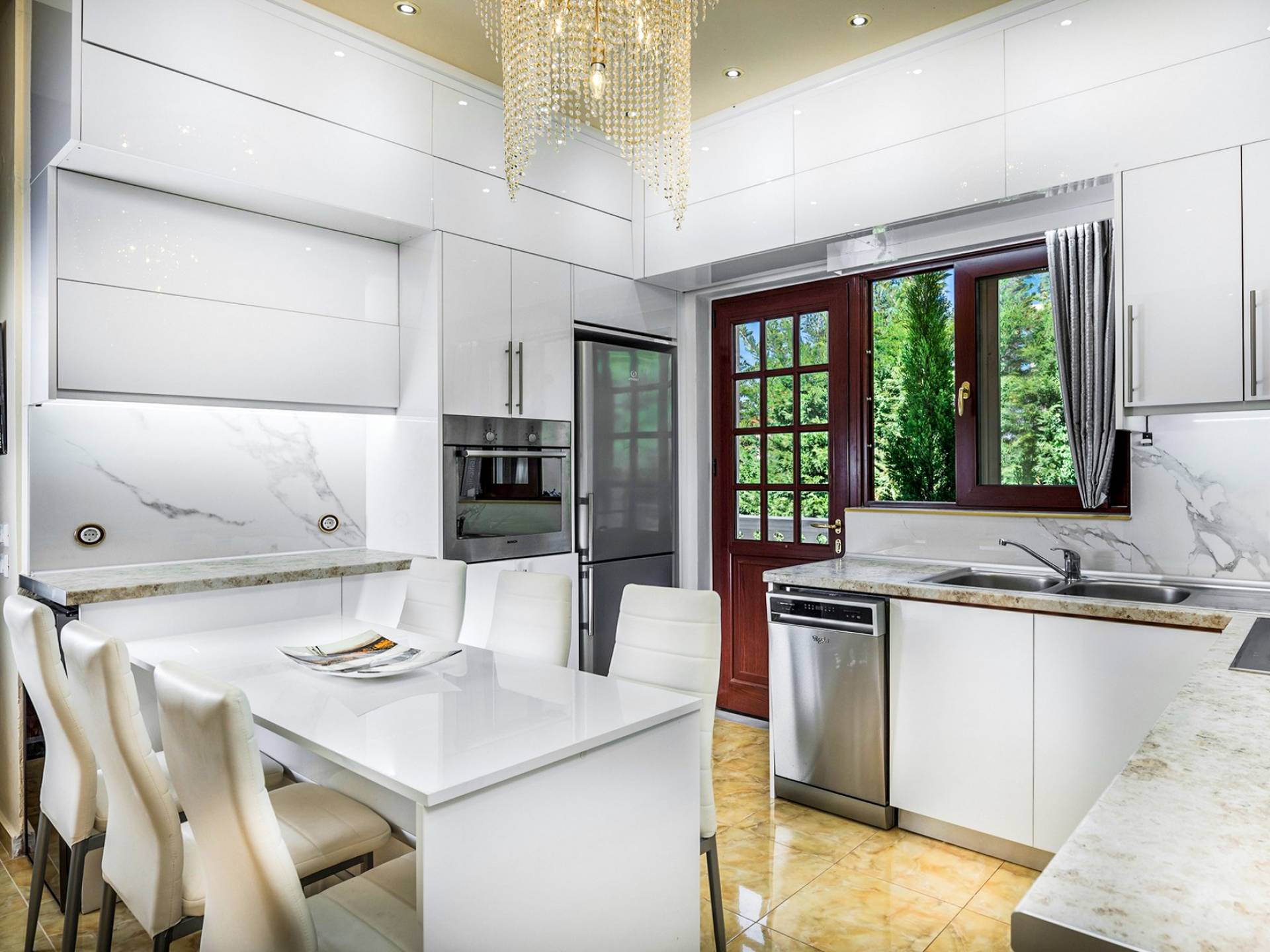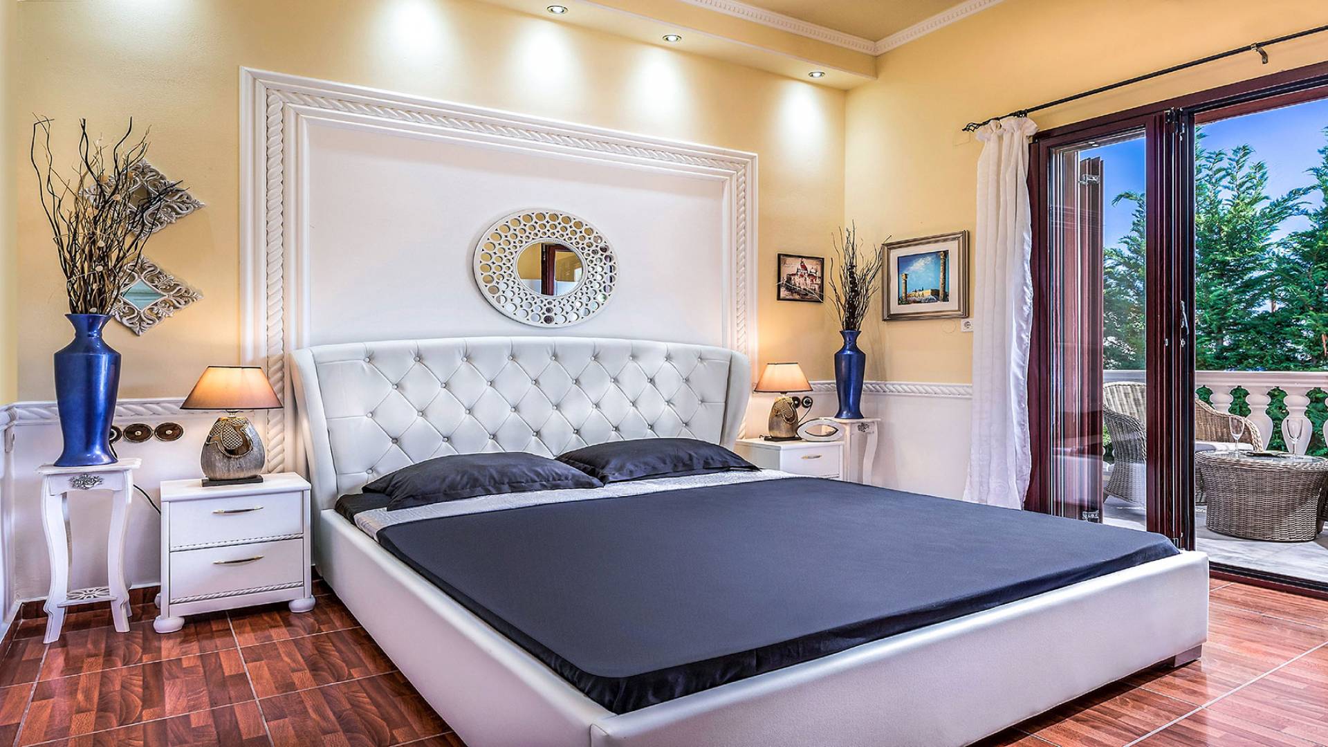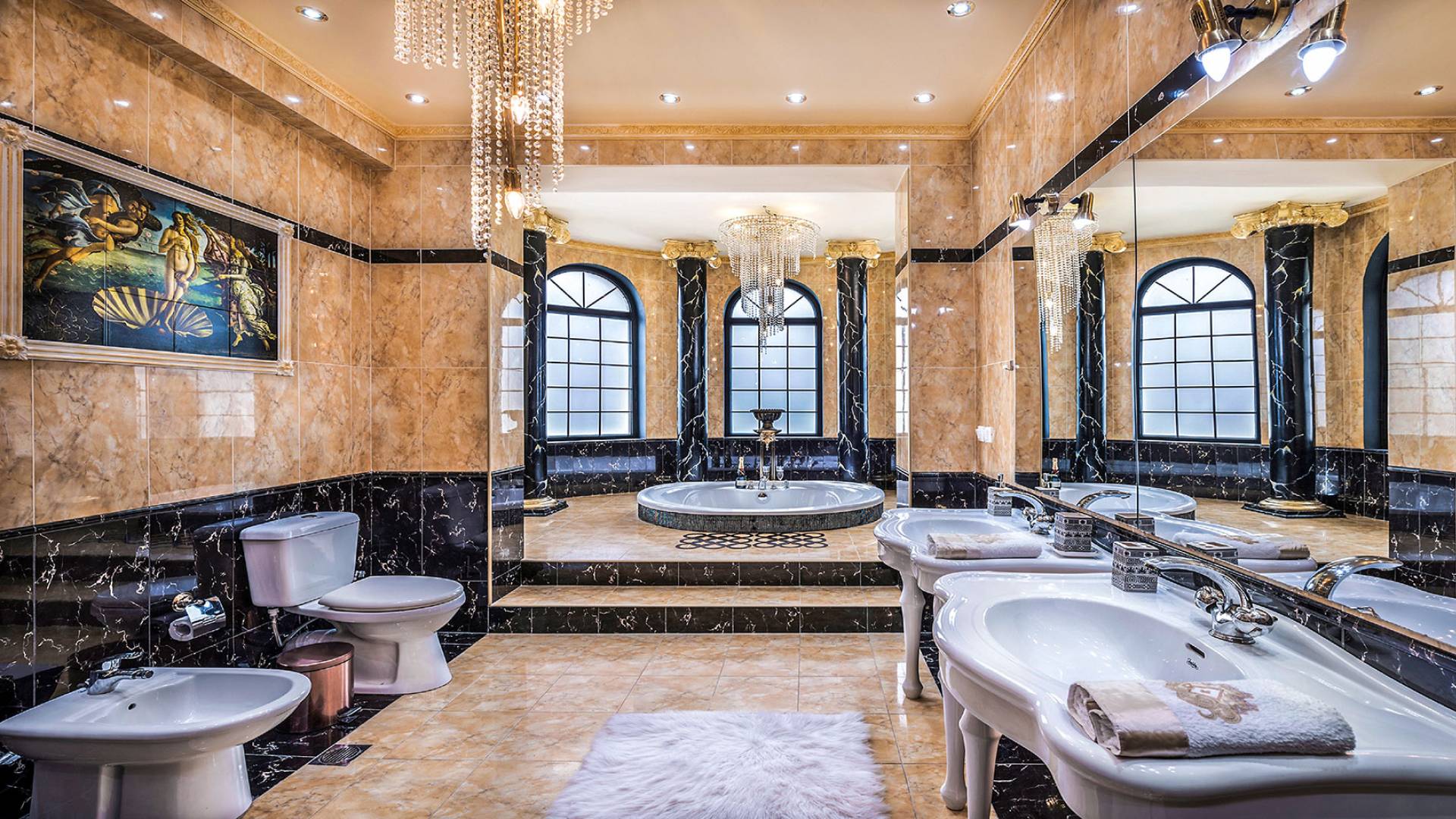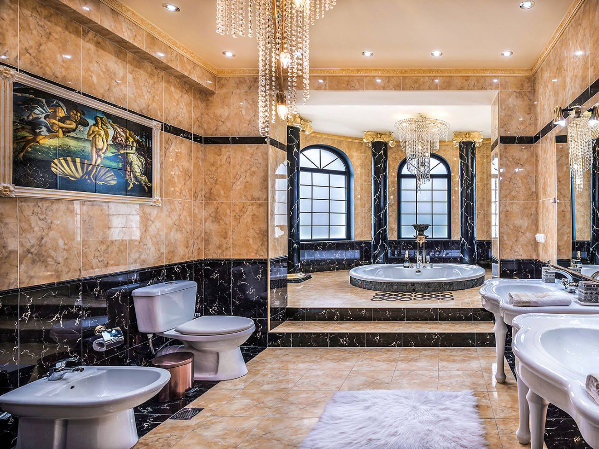Η τραπεζαρία είναι η συνέχεια του σαλονιού, με ημικυκλικά παράθυρα με όμορφη θέα, έναν πολύ μεγάλο πολυέλαιο Swarovski και πολυτελή σκαλιστά έπιπλα. Η είσοδος στην κουζίνα είναι ανάμεσα σε δύο πολύ ψηλές κολώνες. Είναι μεγάλο, πλήρως εξοπλισμένο, πολυτελές, και έχει θέα στη θάλασσα και στον κήπο. Σε αυτόν τον όροφο, υπάρχουν 4 όμορφα και εξαιρετικά εξοπλισμένα υπνοδωμάτια. Όλα έχουν το δικό τους μπάνιο (3 en suite) με στήλη υδρομασάζ και ιδιωτικό μπαλκόνι. Επιπλέον, διαθέτουν αυτόματο κλιματισμό, τηλεοράσεις και DVD. Θα πρέπει να είναι μια αναφορά στο βασιλικό μπάνιο των 28 τ.μ., με τη στρογγυλή μπανιέρα-υδρομασάζ δαπέδου που περιβάλλεται από 5 ημικύκλια παράθυρα και 4 αρχαιοελληνικές κολώνες ανάμεσά τους, τους διπλούς νεροχύτες και τους δύο πολύ μεγάλους χρυσούς πολυελαίους Swarovski, που δημιουργούν μια εκπληκτική αίσθηση πολυτέλειας και σε μεταφέρουν κατευθείαν στα αρχαία ελληνικά βασιλικά λουτρά. Αυτό το μπάνιο διαθέτει επίσης κρυφό φωτισμό, σύστημα Hi-Fi, καμπίνα ντους με υδρομασάζ και θέα στη θάλασσα. Ένας χρυσός πολυέλαιος Swarovski μήκους 2 μέτρων βρίσκεται πάνω από τις σκάλες που μας οδηγούν στο ισόγειο της βίλας, όπου μπορούμε να βρούμε δύο ακόμη μεγάλα πολυτελή υπνοδωμάτια-σουίτες πλήρως εξοπλισμένα με ιδιωτικό μπάνιο, πολυτελή έπιπλα, αυτόματο κλιματισμό, τηλεοράσεις led και DVD.