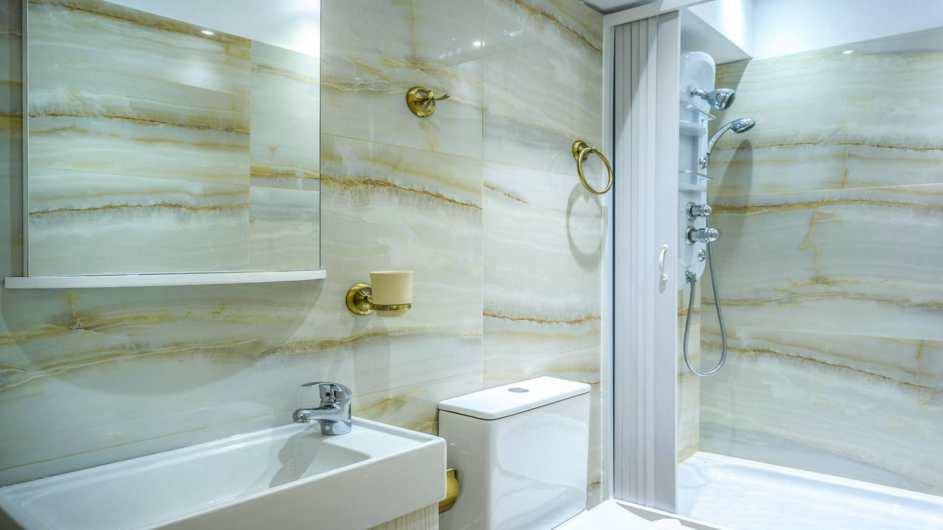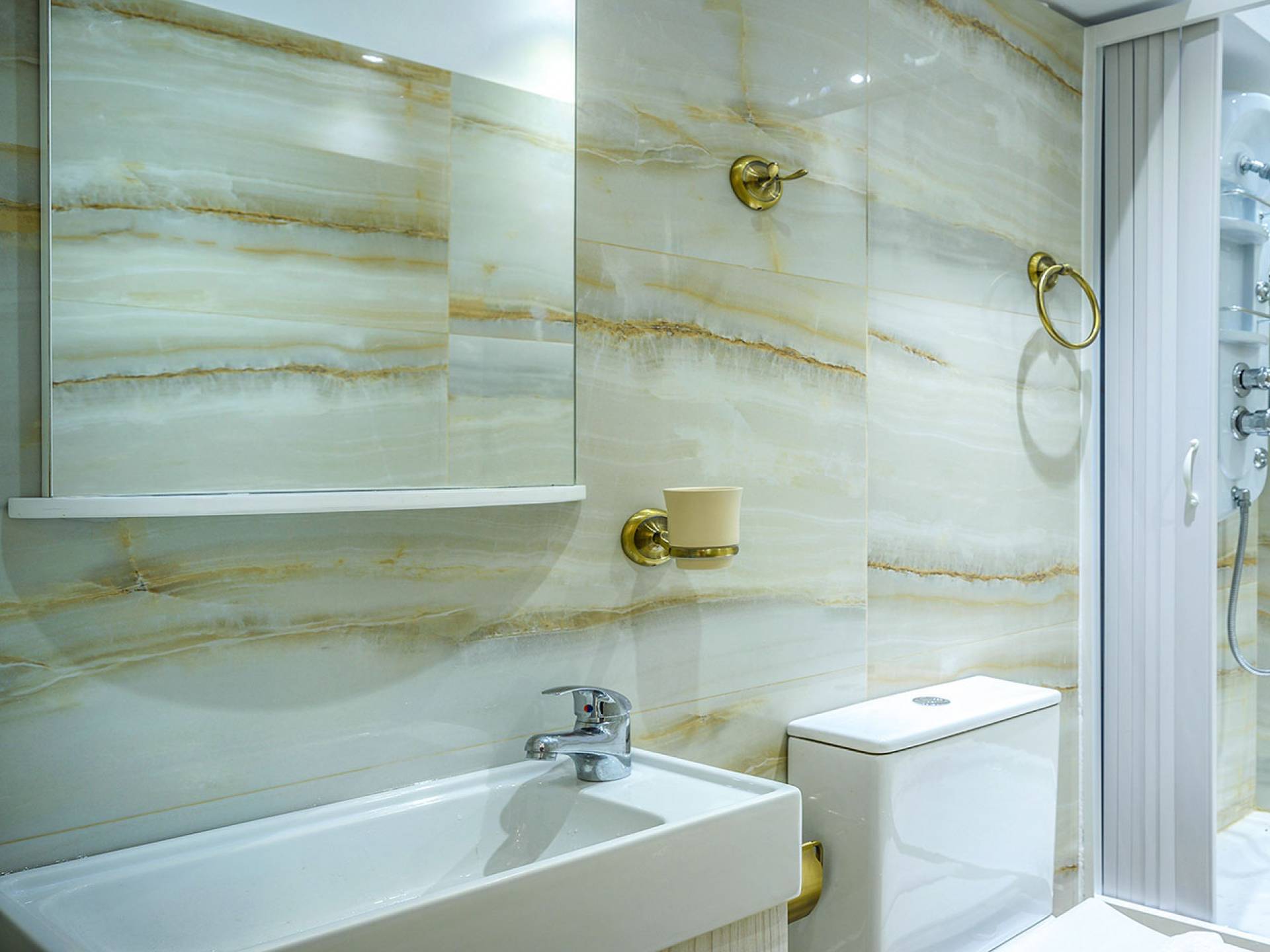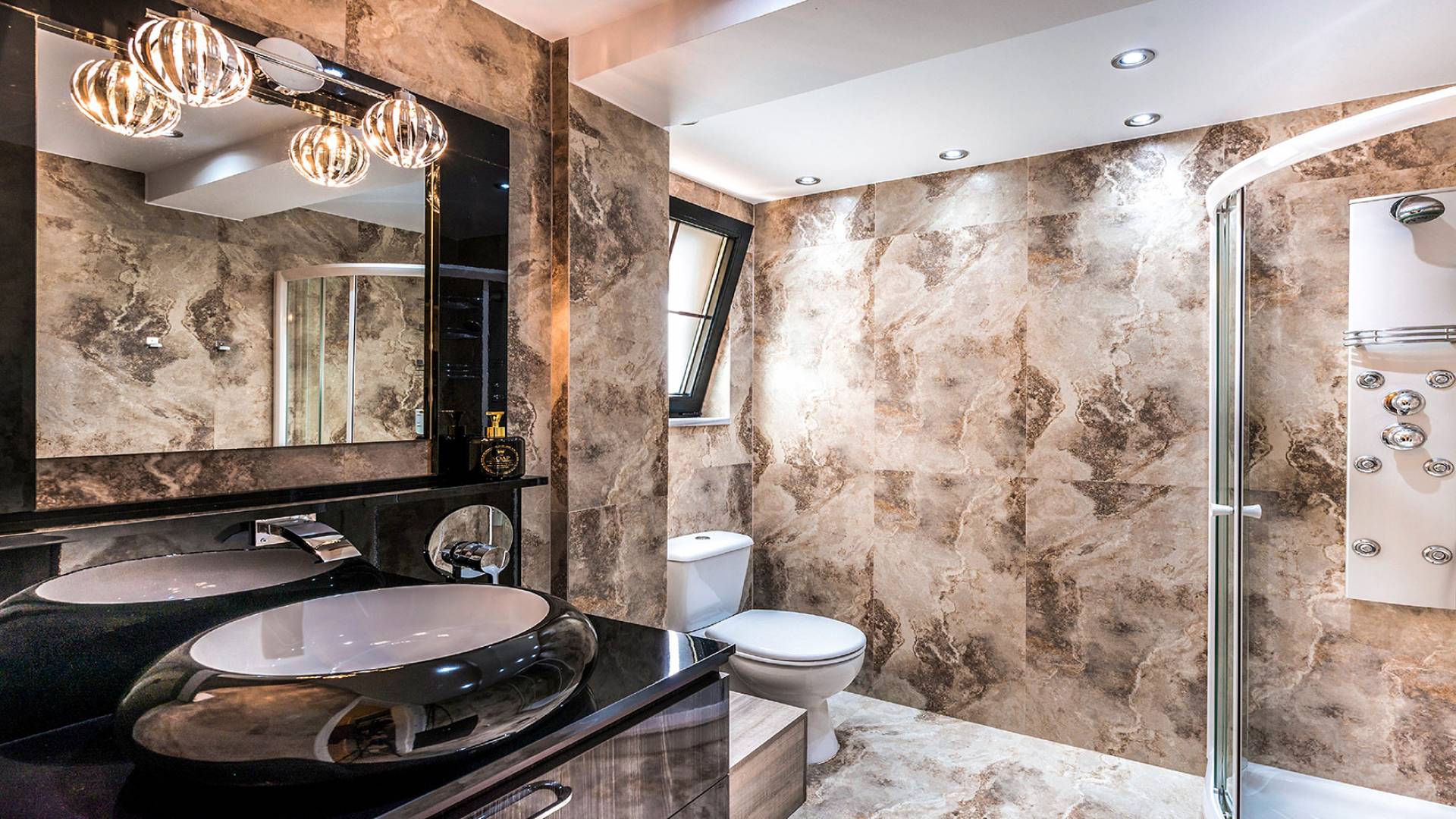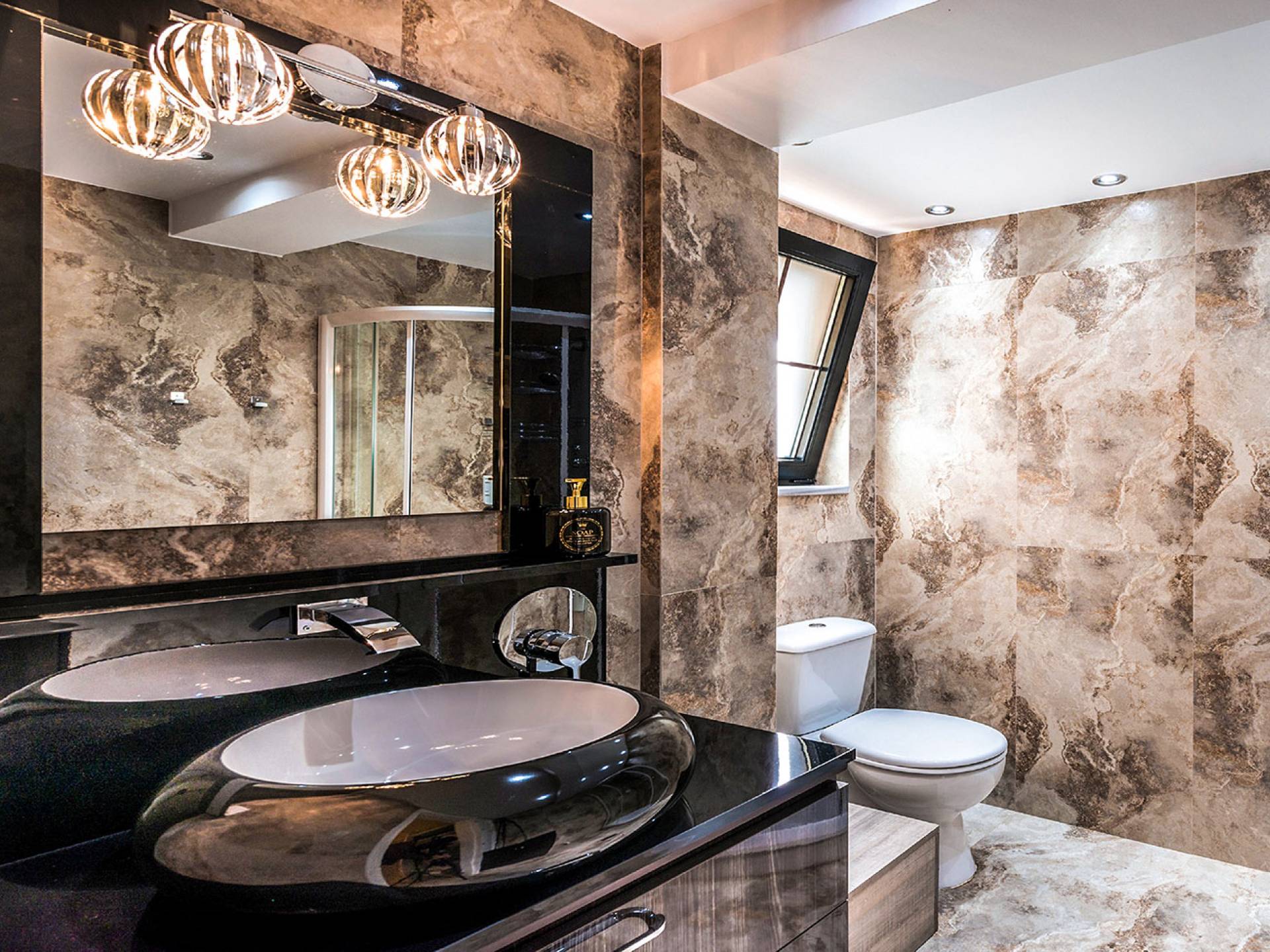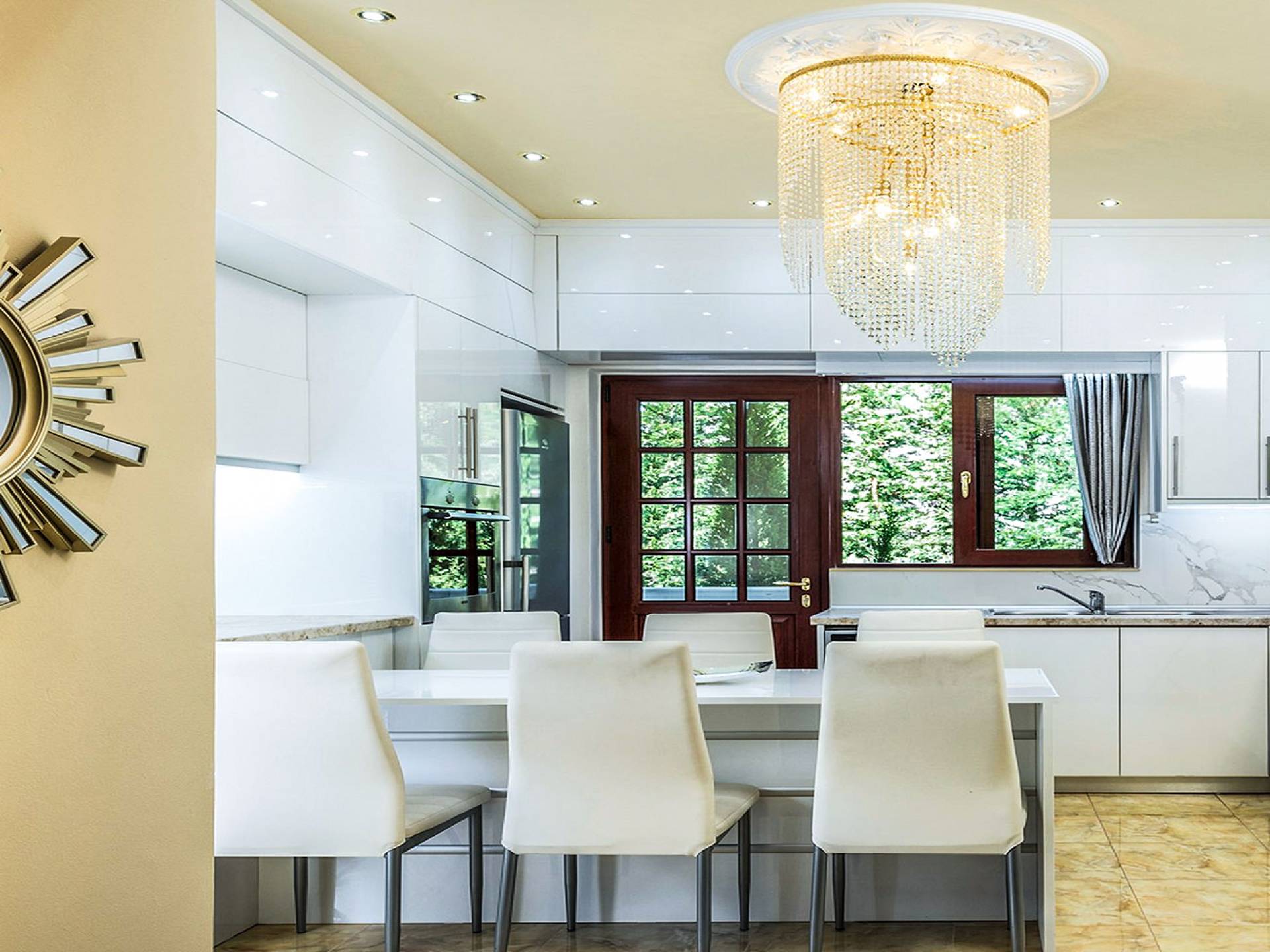 Η τραπεζαρία είναι η συνέχεια του σαλονιού, με ημικυκλικά παράθυρα με όμορφη θέα, έναν πολύ μεγάλο πολυέλαιο Swarovski και πολυτελή σκαλιστά έπιπλα. Η είσοδος στην κουζίνα είναι ανάμεσα σε δύο πολύ ψηλές κολώνες. Είναι μεγάλο, πλήρως εξοπλισμένο, πολυτελές, και έχει θέα στη θάλασσα και στον κήπο. Σε αυτόν τον όροφο, υπάρχουν 4 όμορφα και εξαιρετικά εξοπλισμένα υπνοδωμάτια. Όλα έχουν το δικό τους μπάνιο (3 en suite) με στήλη υδρομασάζ και ιδιωτικό μπαλκόνι. Επιπλέον, διαθέτουν αυτόματο κλιματισμό, τηλεοράσεις και DVD. Θα πρέπει να είναι μια αναφορά στο βασιλικό μπάνιο των 28 τ.μ., με τη στρογγυλή μπανιέρα-υδρομασάζ δαπέδου που περιβάλλεται από 5 ημικύκλια παράθυρα και 4 αρχαιοελληνικές κολώνες ανάμεσά τους, τους διπλούς νεροχύτες και τους δύο πολύ μεγάλους χρυσούς πολυελαίους Swarovski, που δημιουργούν μια εκπληκτική αίσθηση πολυτέλειας και σε μεταφέρουν κατευθείαν στα αρχαία ελληνικά βασιλικά λουτρά. Αυτό το μπάνιο διαθέτει επίσης κρυφό φωτισμό, σύστημα Hi-Fi, καμπίνα ντους με υδρομασάζ και θέα στη θάλασσα. Ένας χρυσός πολυέλαιος Swarovski μήκους 2 μέτρων βρίσκεται πάνω από τις σκάλες που μας οδηγούν στο ισόγειο της βίλας, όπου μπορούμε να βρούμε δύο ακόμη μεγάλα πολυτελή υπνοδωμάτια-σουίτες πλήρως εξοπλισμένα με ιδιωτικό μπάνιο, πολυτελή έπιπλα, αυτόματο κλιματισμό, τηλεοράσεις led και DVD.