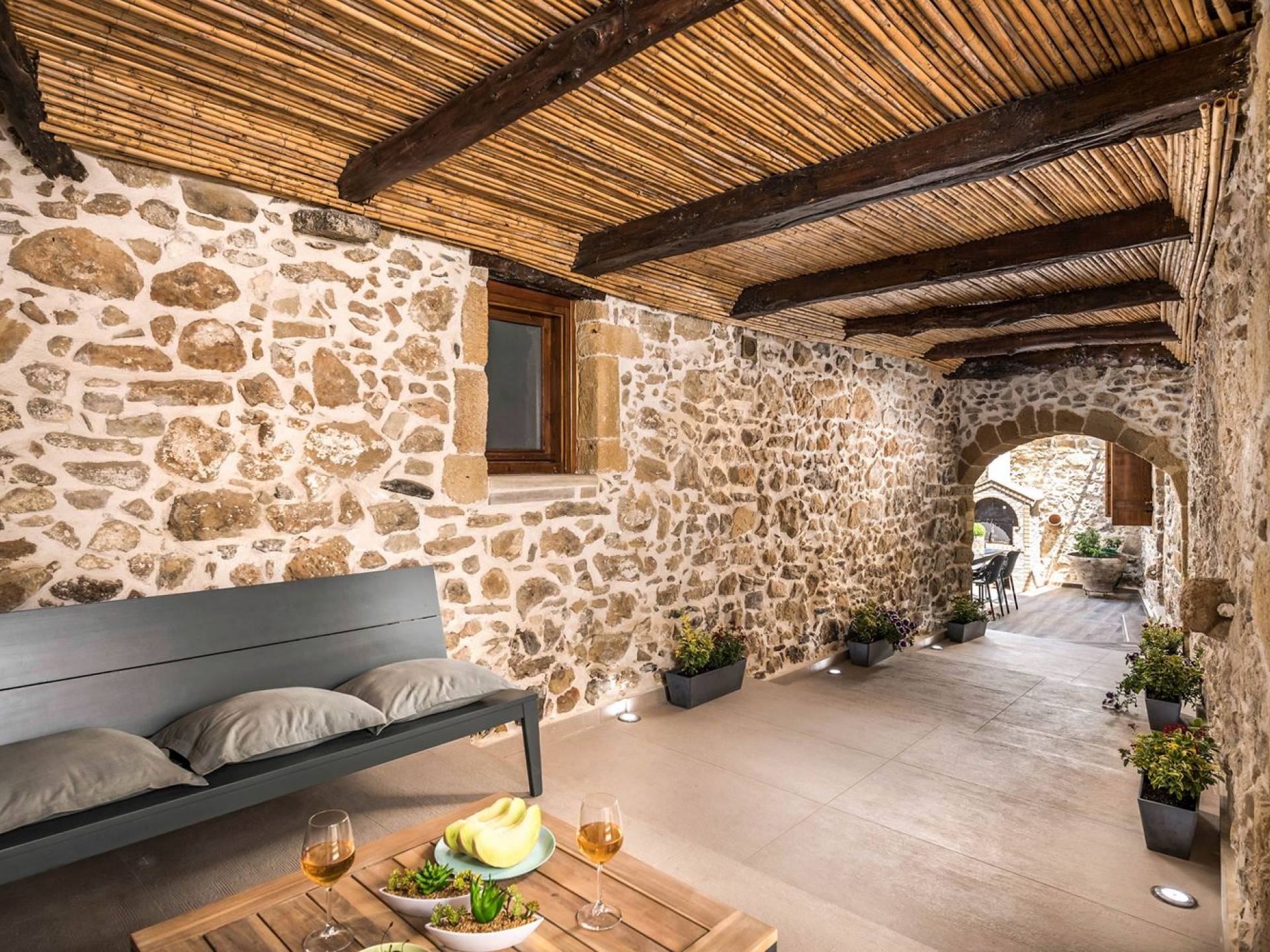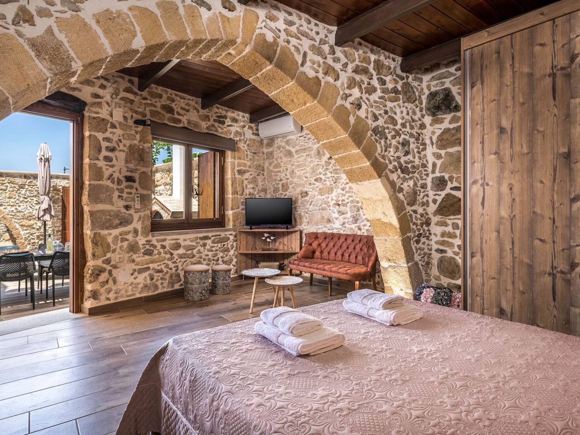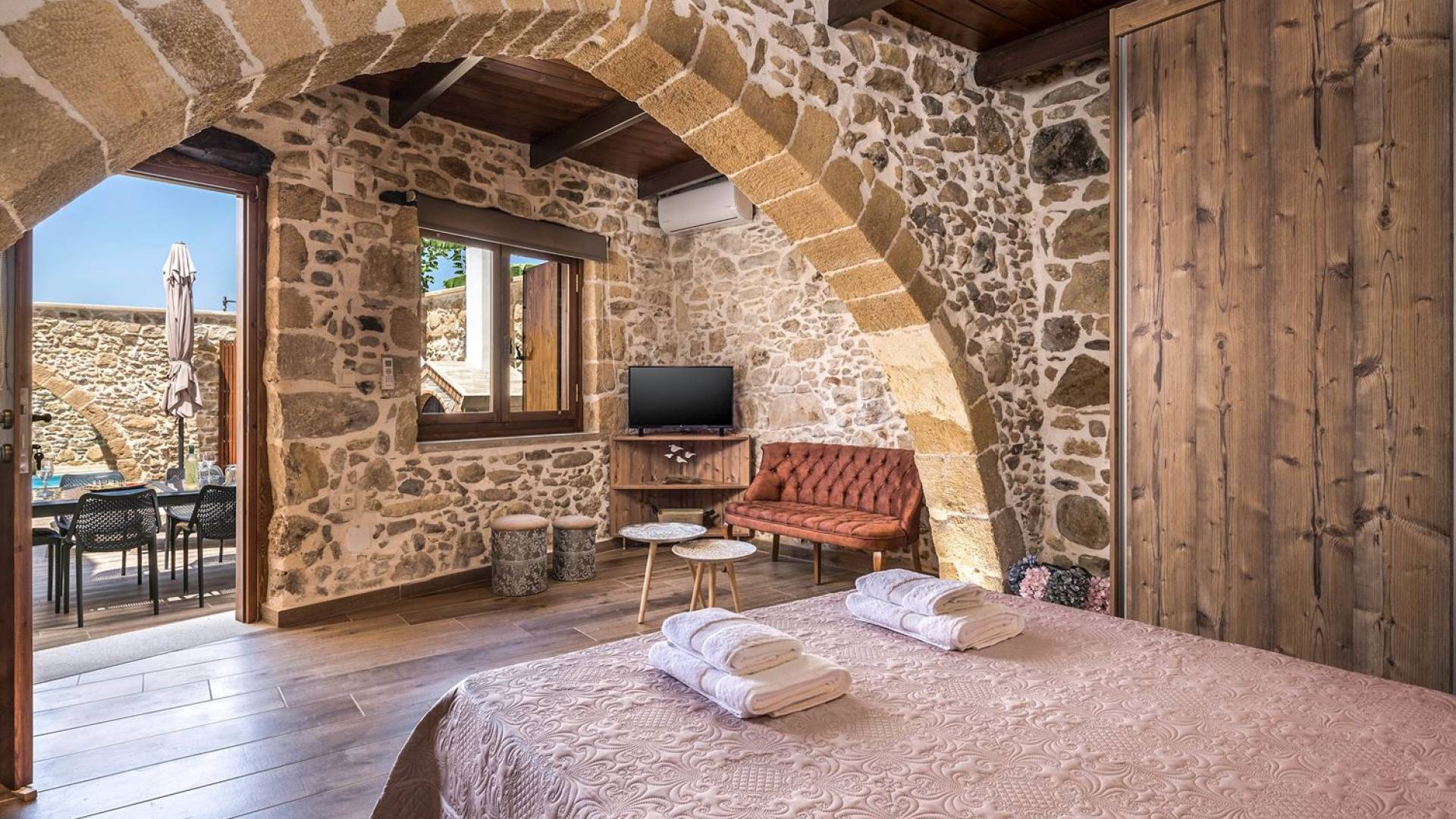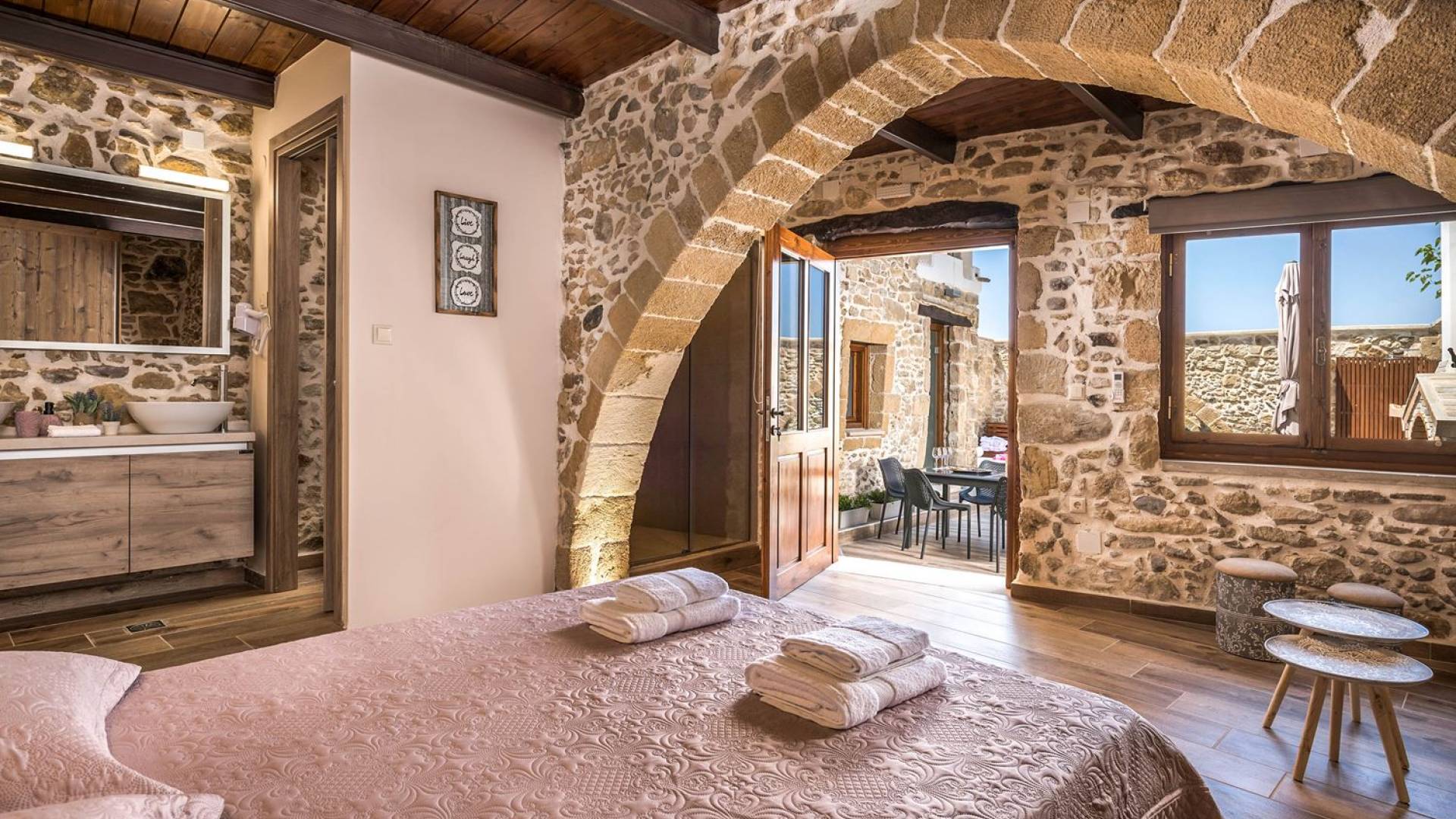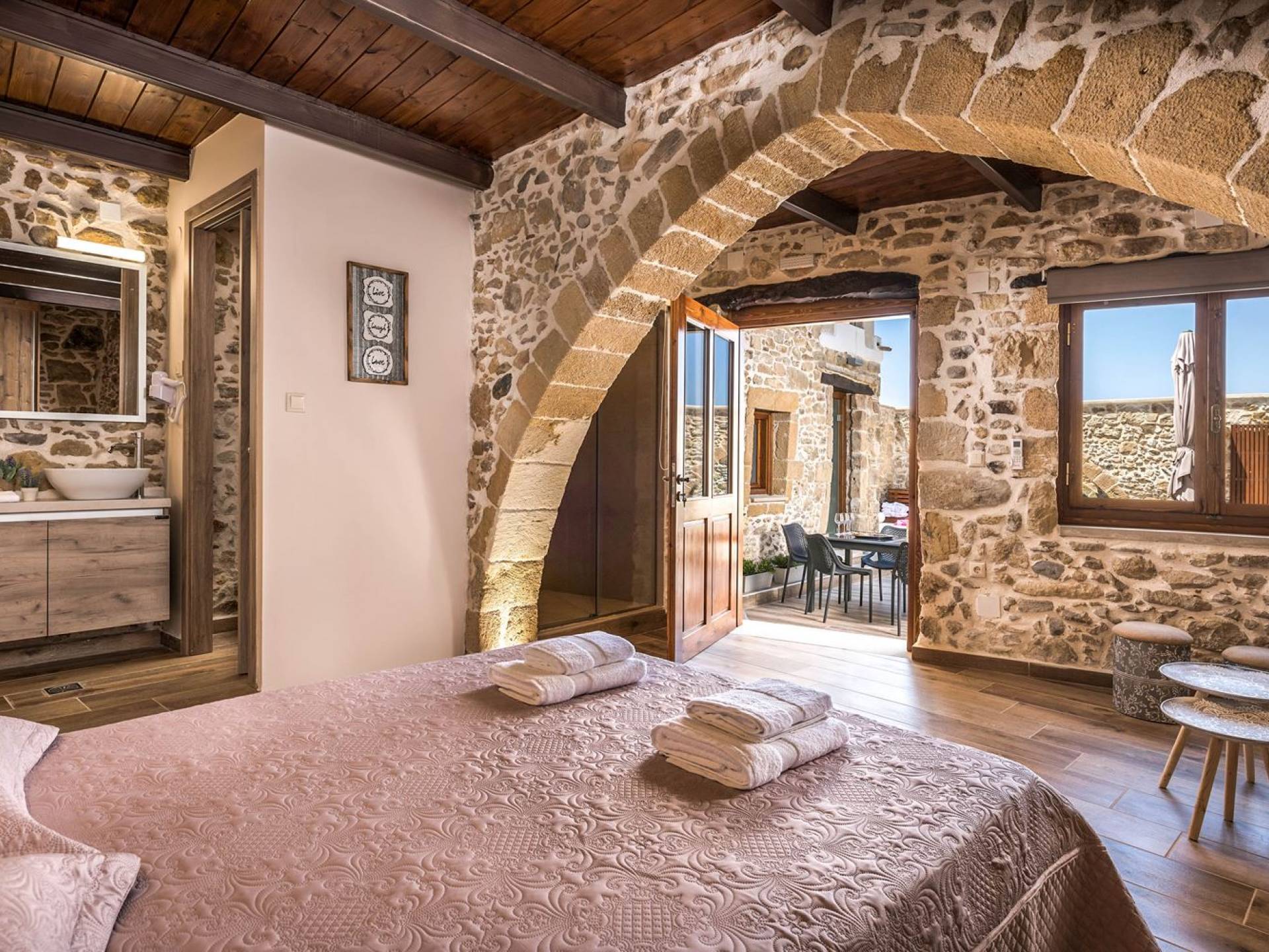 Φεύγοντας από τον μαγευτικό υπαίθριο χώρο στολισμένο με μια πέτρινη καμάρα και μια ζωηρή μπουκαμβίλιες, θα βρεθείτε σε ένα όμορφο αρχιτεκτονικό πάντρεμα από γήινες αποχρώσεις πέτρινων τοίχων και καμάρων σε συνδυασμό με ξύλο και λιτές διακοσμητικές γραμμές που εξασφαλίζουν άνεση και κομψότητα. Η κουζίνα είναι πλήρως εξοπλισμένη με ηλεκτρικές συσκευές τελευταίας τεχνολογίας, όλα τα υπνοδωμάτια έχουν ιδιωτικό μπάνιο για μέγιστη άνεση και ιδιωτικότητα και οι χώροι είναι κλιματιζόμενοι. Οι διακοσμητικές πινελιές δημιουργούν μια γαλήνια, ατμόσφαιρα που θα σας χαρίσει μια παραδεισένια εμπειρία. Ο μοντέρνος σχεδιασμός με λεπτομέρειες παραδοσιακής αρχιτεκτονικής στην τοιχοποιία του δίνει μια μοναδική αίσθηση θαλπωρής και φιλοξενίας.