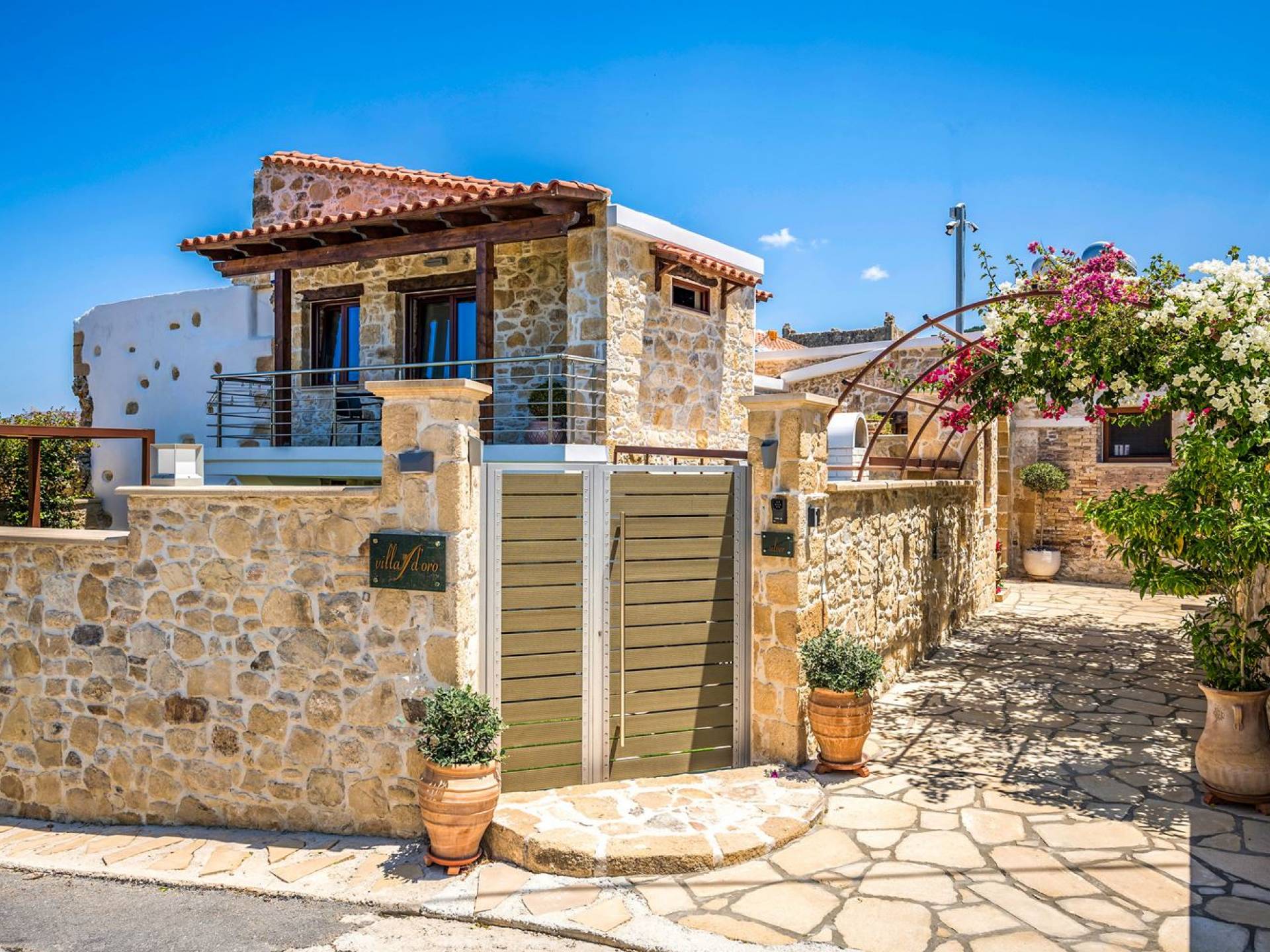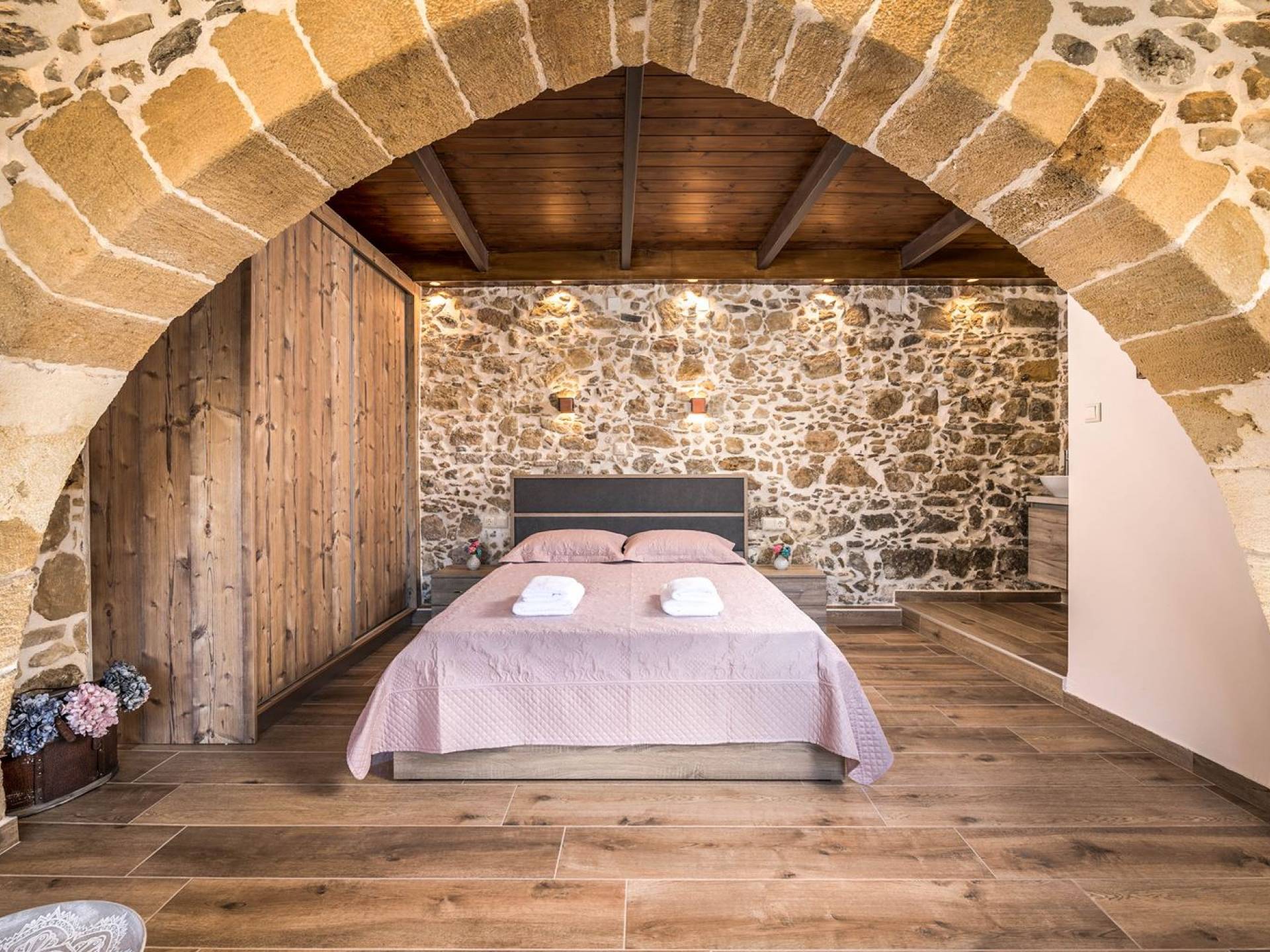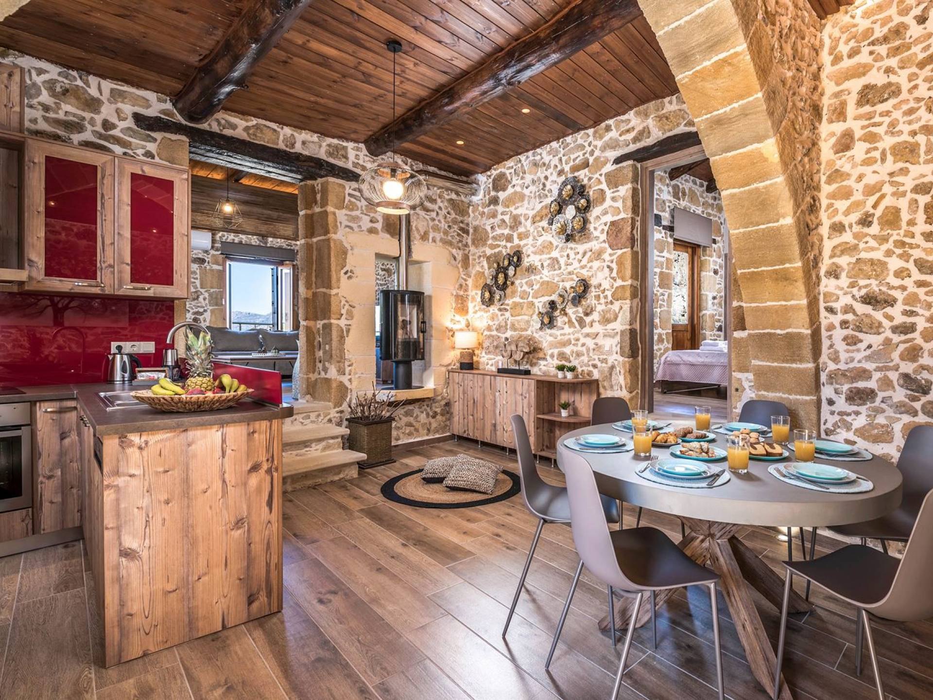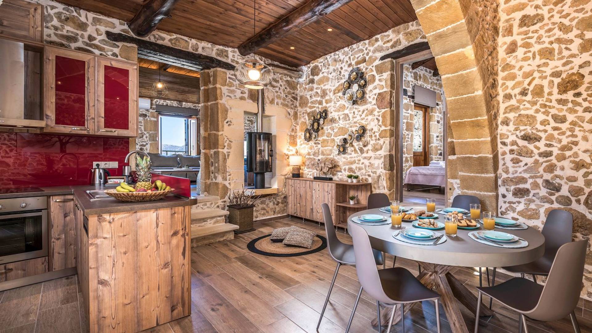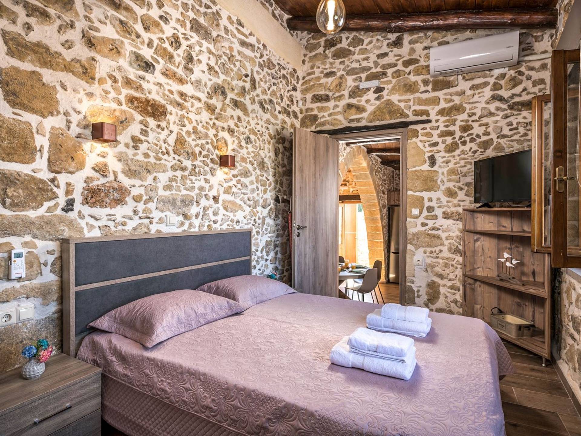 Φεύγοντας από τον μαγευτικό υπαίθριο χώρο στολισμένο με μια πέτρινη καμάρα και μια ζωηρή μπουκαμβίλιες, θα βρεθείτε σε ένα όμορφο αρχιτεκτονικό πάντρεμα από γήινες αποχρώσεις πέτρινων τοίχων και καμάρων σε συνδυασμό με ξύλο και λιτές διακοσμητικές γραμμές που εξασφαλίζουν άνεση και κομψότητα. Η κουζίνα είναι πλήρως εξοπλισμένη με ηλεκτρικές συσκευές τελευταίας τεχνολογίας, όλα τα υπνοδωμάτια έχουν ιδιωτικό μπάνιο για μέγιστη άνεση και ιδιωτικότητα και οι χώροι είναι κλιματιζόμενοι. Οι διακοσμητικές πινελιές δημιουργούν μια γαλήνια, ατμόσφαιρα που θα σας χαρίσει μια παραδεισένια εμπειρία. Ο μοντέρνος σχεδιασμός με λεπτομέρειες παραδοσιακής αρχιτεκτονικής στην τοιχοποιία του δίνει μια μοναδική αίσθηση θαλπωρής και φιλοξενίας.