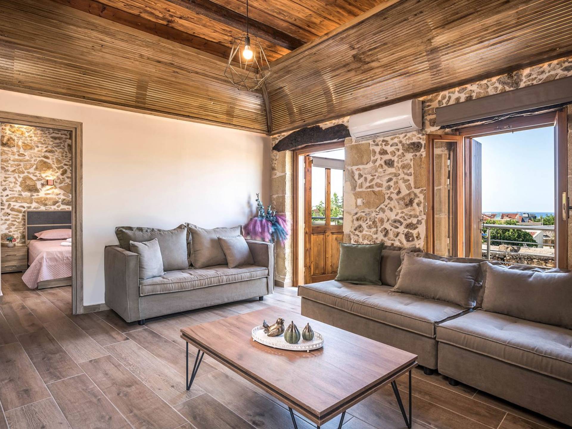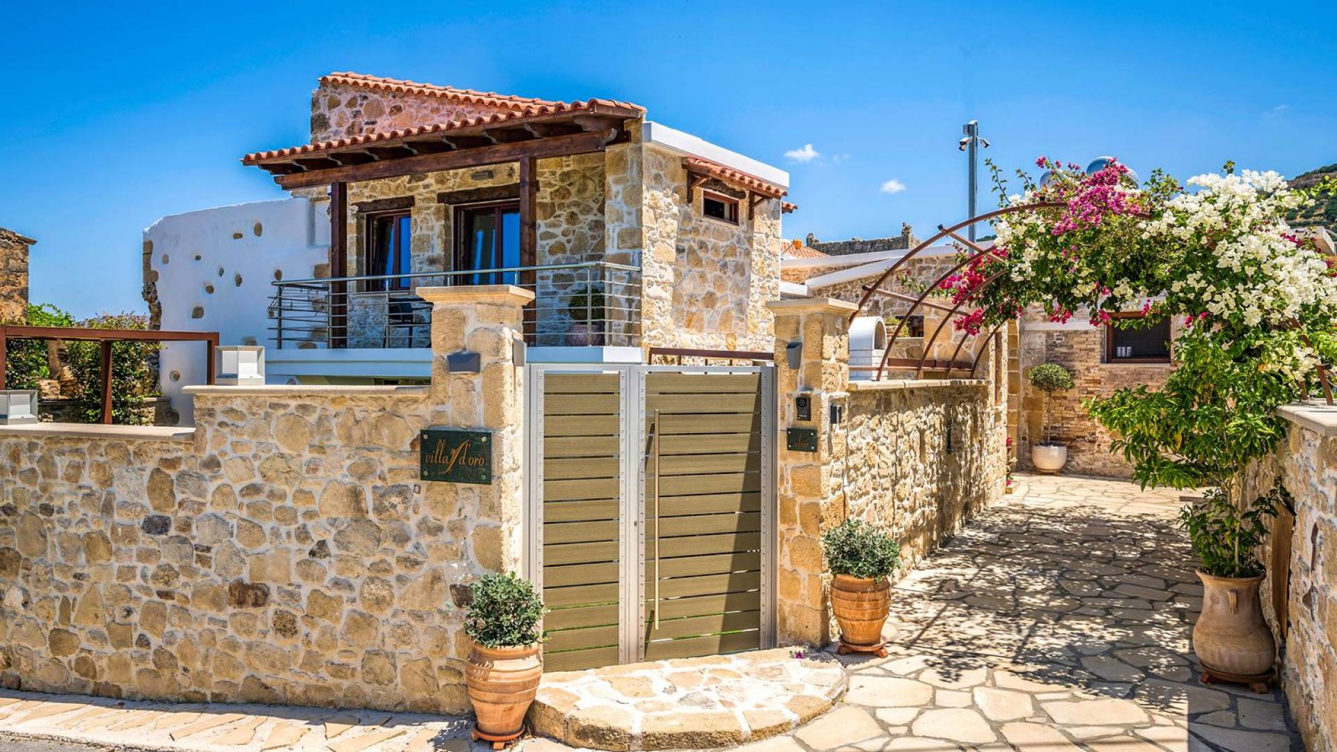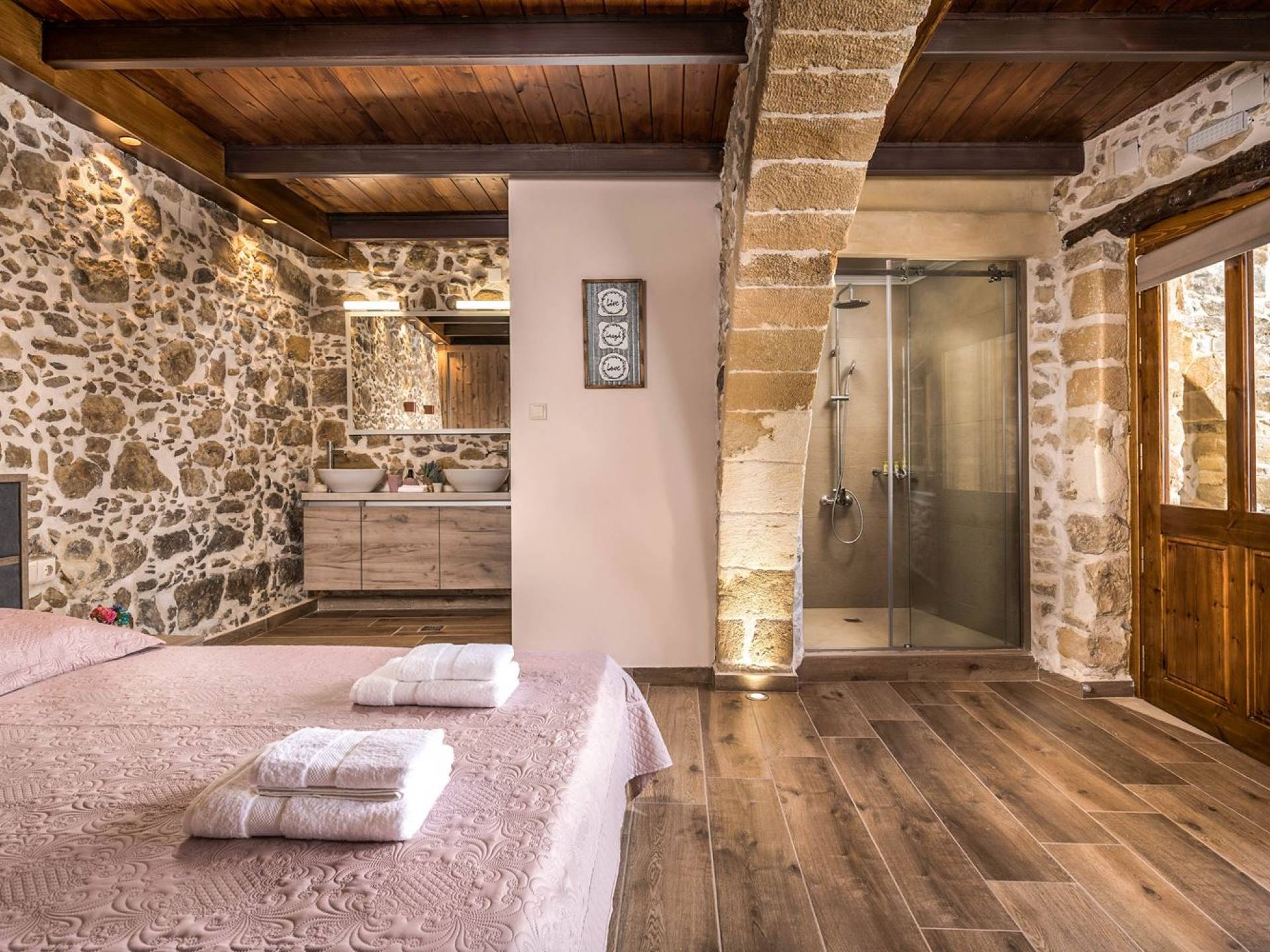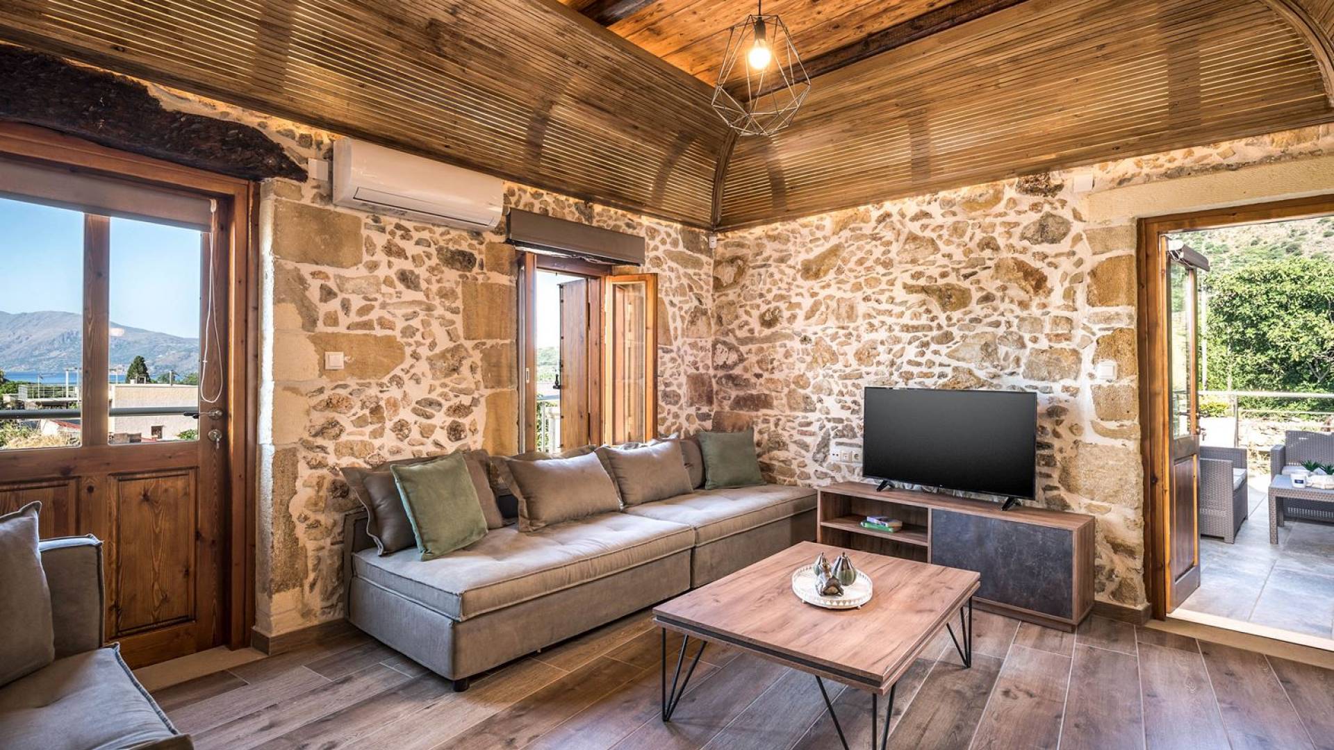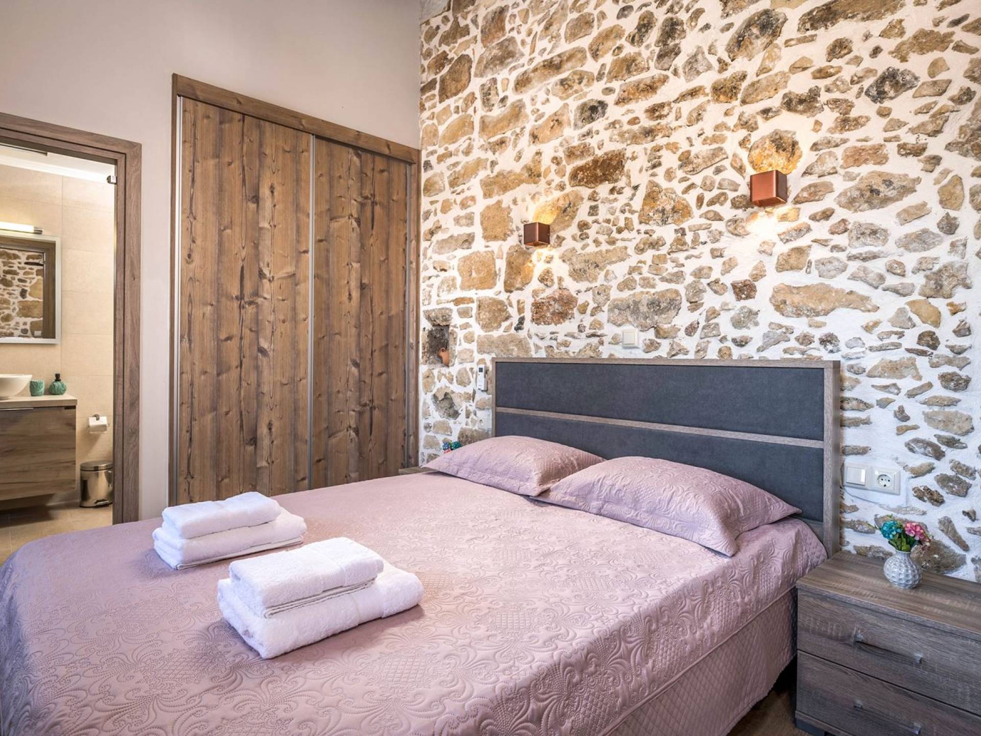 Φεύγοντας από τον μαγευτικό υπαίθριο χώρο στολισμένο με μια πέτρινη καμάρα και μια ζωηρή μπουκαμβίλιες, θα βρεθείτε σε ένα όμορφο αρχιτεκτονικό πάντρεμα από γήινες αποχρώσεις πέτρινων τοίχων και καμάρων σε συνδυασμό με ξύλο και λιτές διακοσμητικές γραμμές που εξασφαλίζουν άνεση και κομψότητα. Η κουζίνα είναι πλήρως εξοπλισμένη με ηλεκτρικές συσκευές τελευταίας τεχνολογίας, όλα τα υπνοδωμάτια έχουν ιδιωτικό μπάνιο για μέγιστη άνεση και ιδιωτικότητα και οι χώροι είναι κλιματιζόμενοι. Οι διακοσμητικές πινελιές δημιουργούν μια γαλήνια, ατμόσφαιρα που θα σας χαρίσει μια παραδεισένια εμπειρία. Ο μοντέρνος σχεδιασμός με λεπτομέρειες παραδοσιακής αρχιτεκτονικής στην τοιχοποιία του δίνει μια μοναδική αίσθηση θαλπωρής και φιλοξενίας.