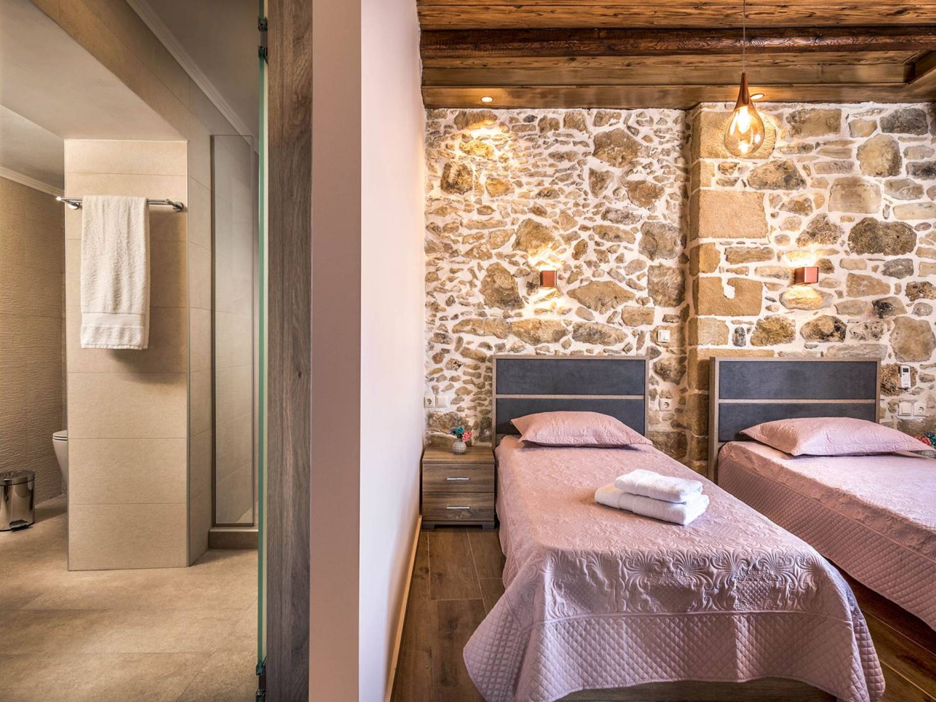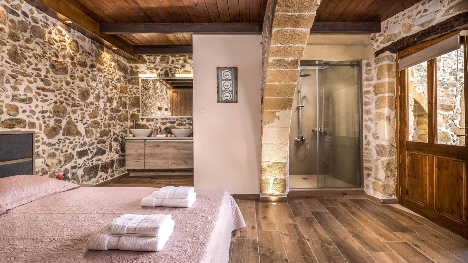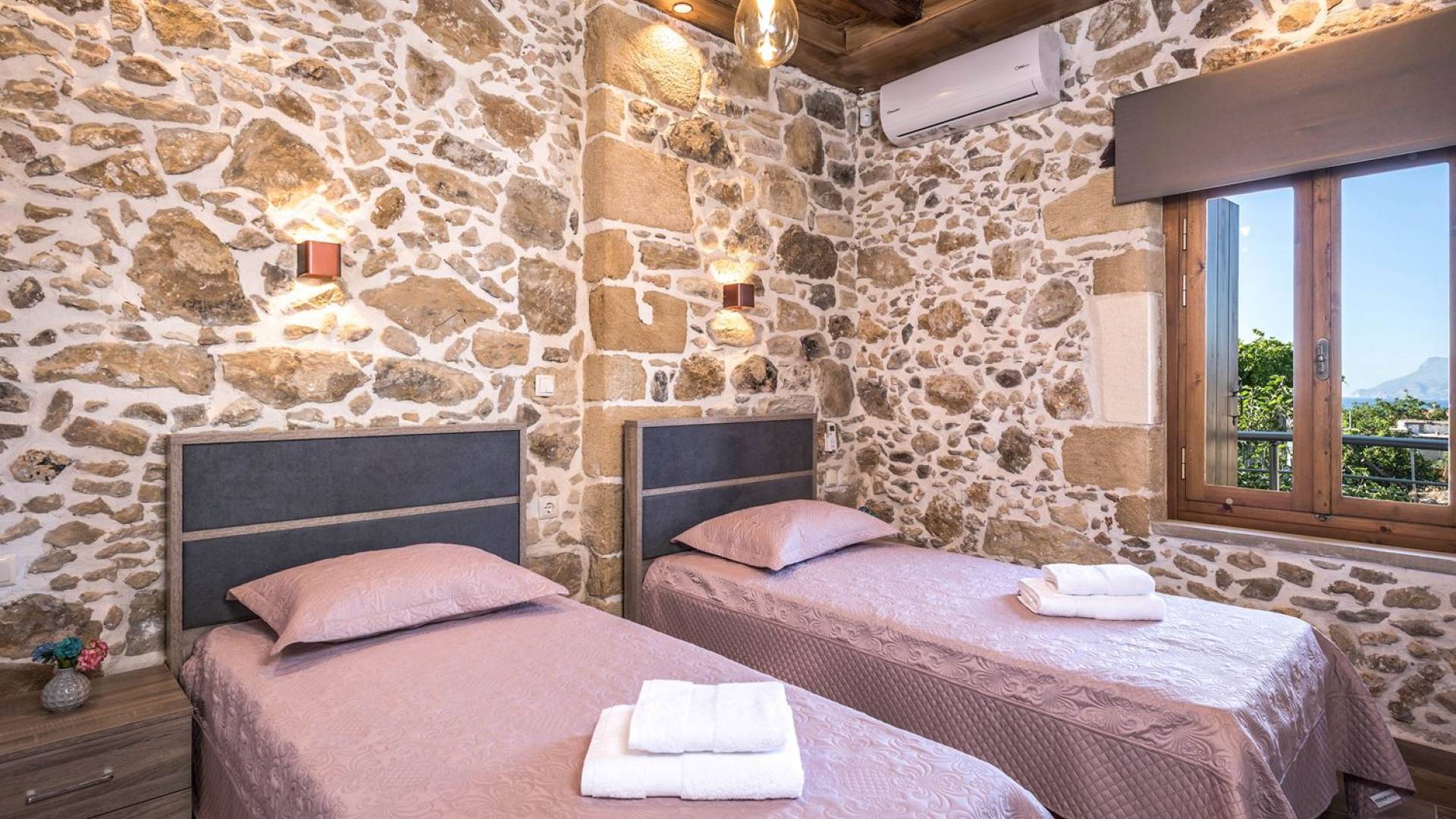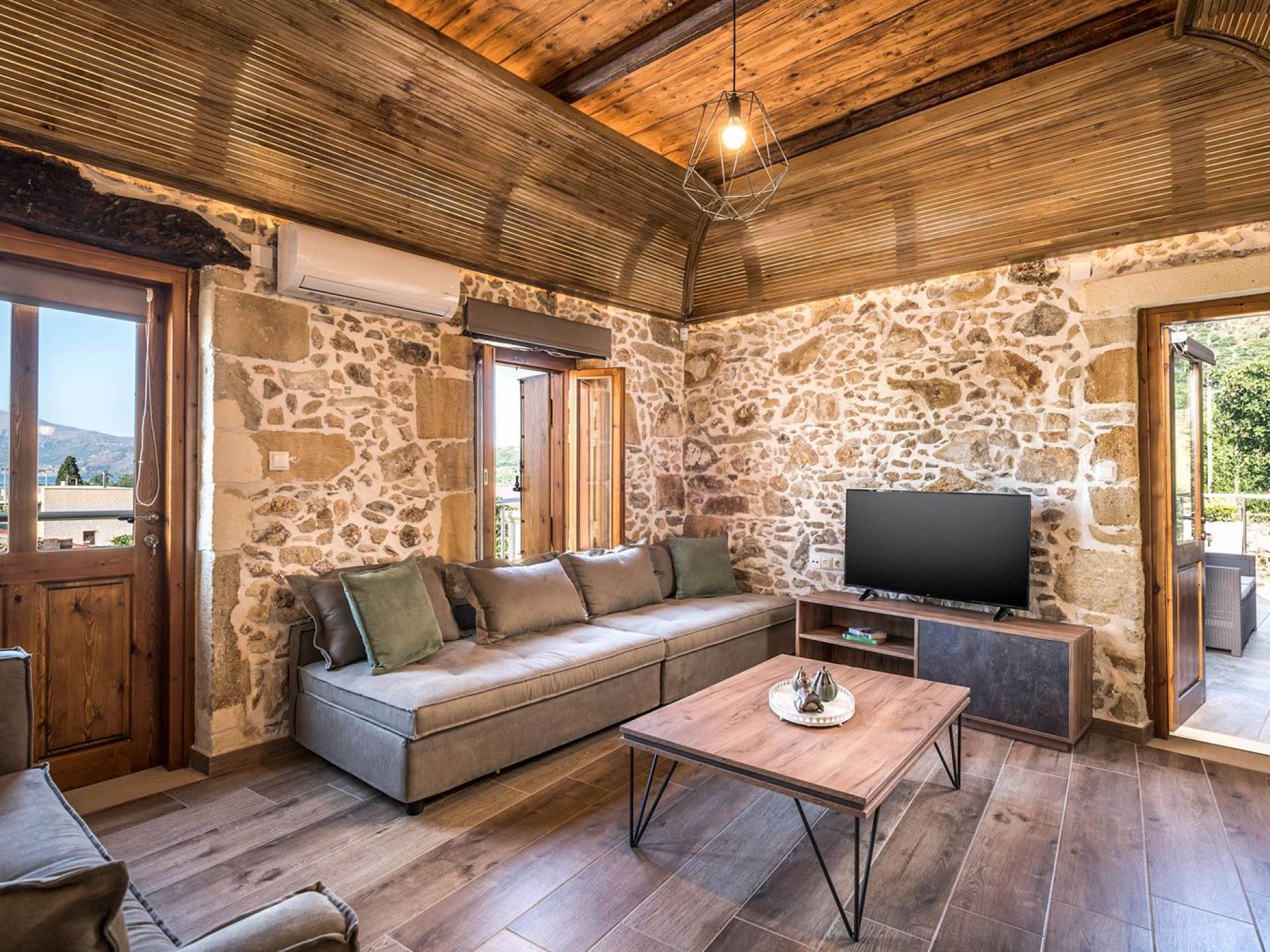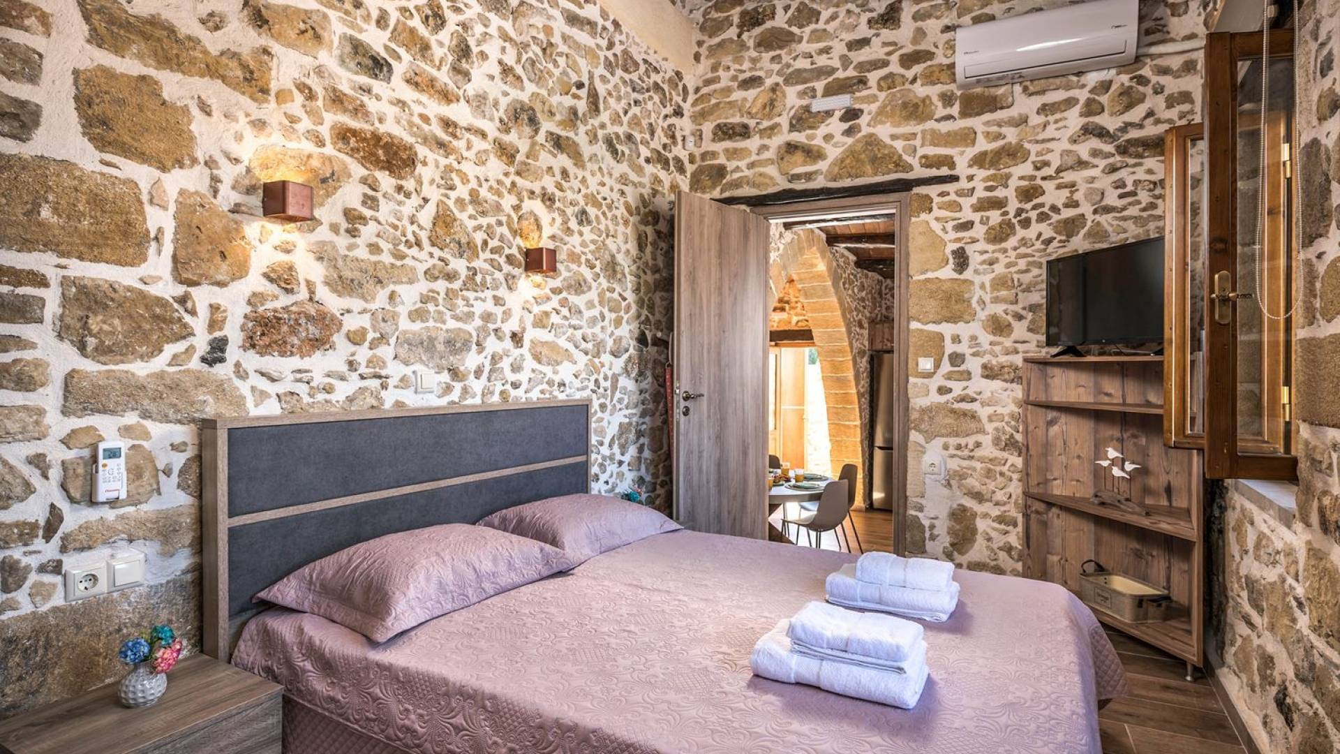 Φεύγοντας από τον μαγευτικό υπαίθριο χώρο στολισμένο με μια πέτρινη καμάρα και μια ζωηρή μπουκαμβίλιες, θα βρεθείτε σε ένα όμορφο αρχιτεκτονικό πάντρεμα από γήινες αποχρώσεις πέτρινων τοίχων και καμάρων σε συνδυασμό με ξύλο και λιτές διακοσμητικές γραμμές που εξασφαλίζουν άνεση και κομψότητα. Η κουζίνα είναι πλήρως εξοπλισμένη με ηλεκτρικές συσκευές τελευταίας τεχνολογίας, όλα τα υπνοδωμάτια έχουν ιδιωτικό μπάνιο για μέγιστη άνεση και ιδιωτικότητα και οι χώροι είναι κλιματιζόμενοι. Οι διακοσμητικές πινελιές δημιουργούν μια γαλήνια, ατμόσφαιρα που θα σας χαρίσει μια παραδεισένια εμπειρία. Ο μοντέρνος σχεδιασμός με λεπτομέρειες παραδοσιακής αρχιτεκτονικής στην τοιχοποιία του δίνει μια μοναδική αίσθηση θαλπωρής και φιλοξενίας.