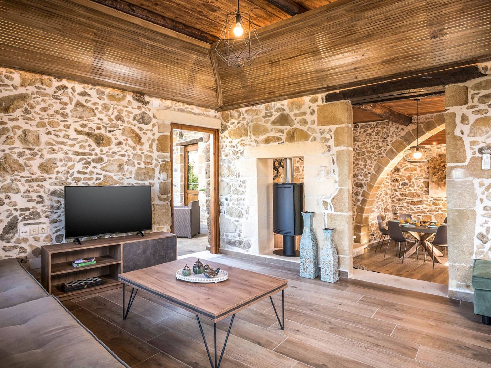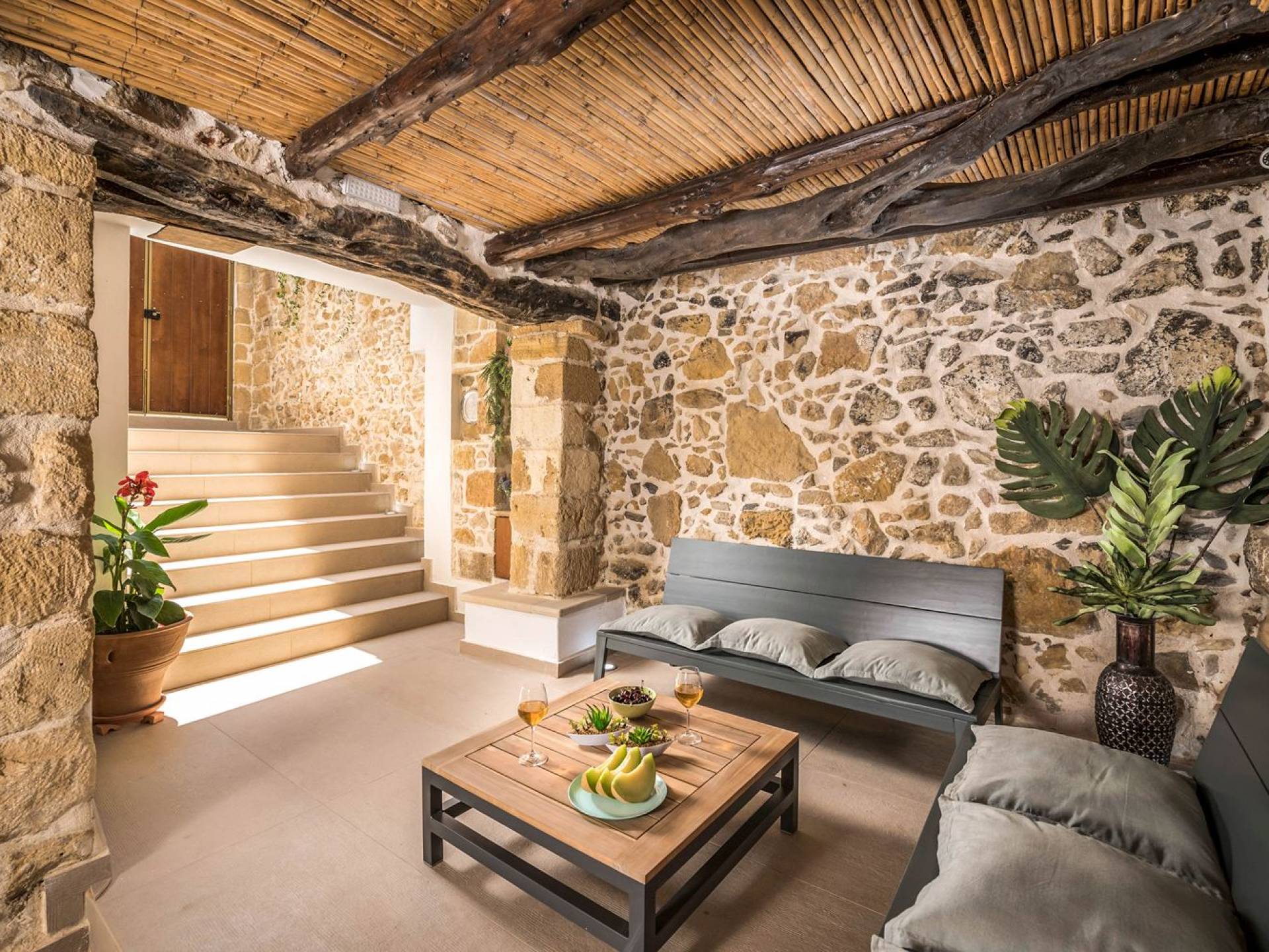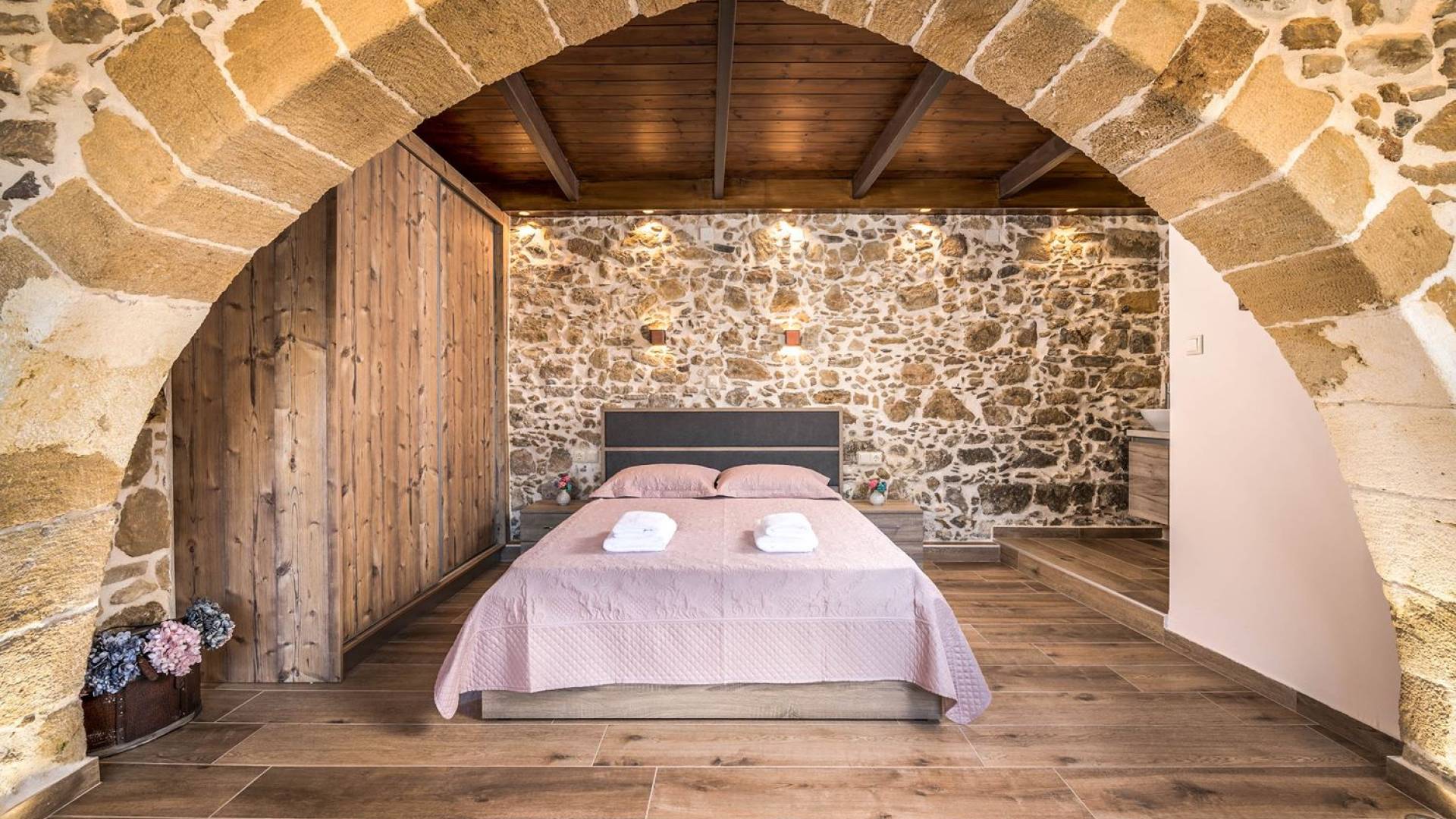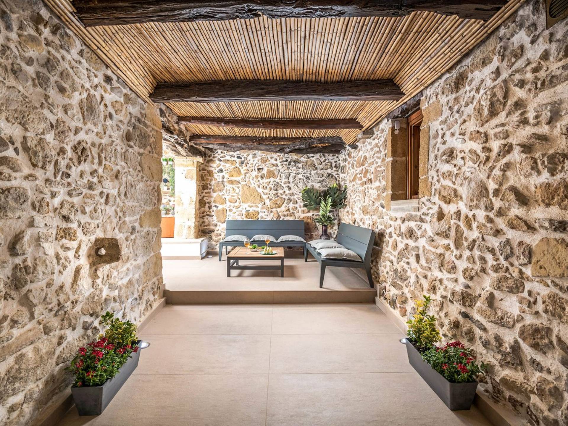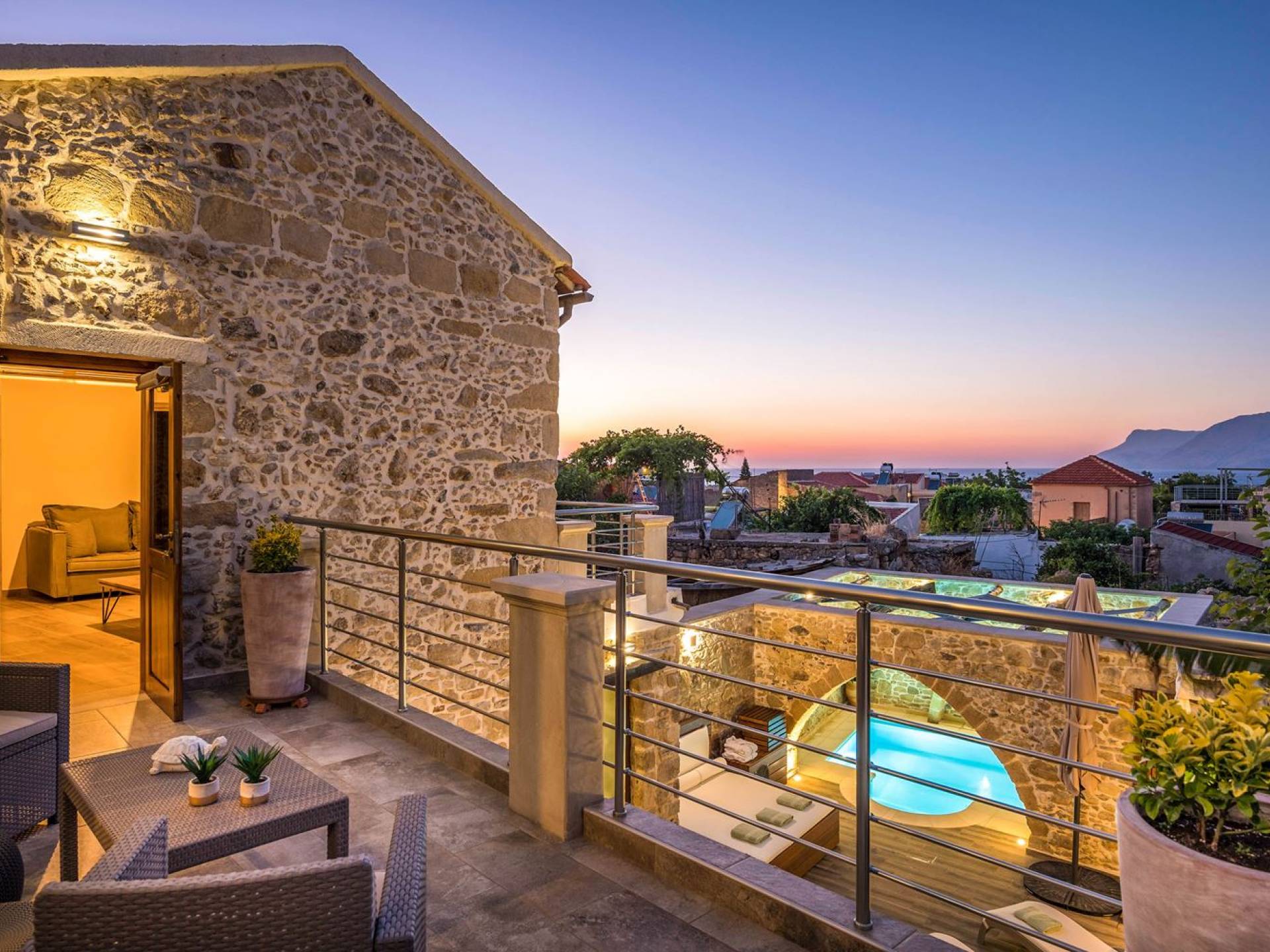 Φεύγοντας από τον μαγευτικό υπαίθριο χώρο στολισμένο με μια πέτρινη καμάρα και μια ζωηρή μπουκαμβίλιες, θα βρεθείτε σε ένα όμορφο αρχιτεκτονικό πάντρεμα από γήινες αποχρώσεις πέτρινων τοίχων και καμάρων σε συνδυασμό με ξύλο και λιτές διακοσμητικές γραμμές που εξασφαλίζουν άνεση και κομψότητα. Η κουζίνα είναι πλήρως εξοπλισμένη με ηλεκτρικές συσκευές τελευταίας τεχνολογίας, όλα τα υπνοδωμάτια έχουν ιδιωτικό μπάνιο για μέγιστη άνεση και ιδιωτικότητα και οι χώροι είναι κλιματιζόμενοι. Οι διακοσμητικές πινελιές δημιουργούν μια γαλήνια, ατμόσφαιρα που θα σας χαρίσει μια παραδεισένια εμπειρία. Ο μοντέρνος σχεδιασμός με λεπτομέρειες παραδοσιακής αρχιτεκτονικής στην τοιχοποιία του δίνει μια μοναδική αίσθηση θαλπωρής και φιλοξενίας.