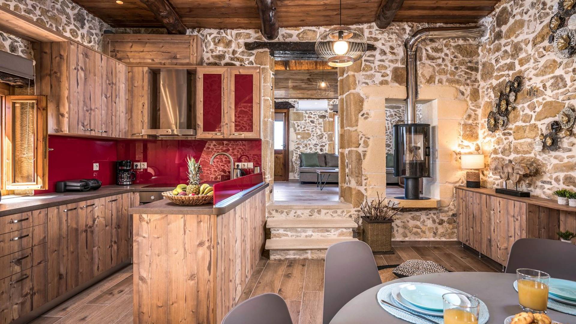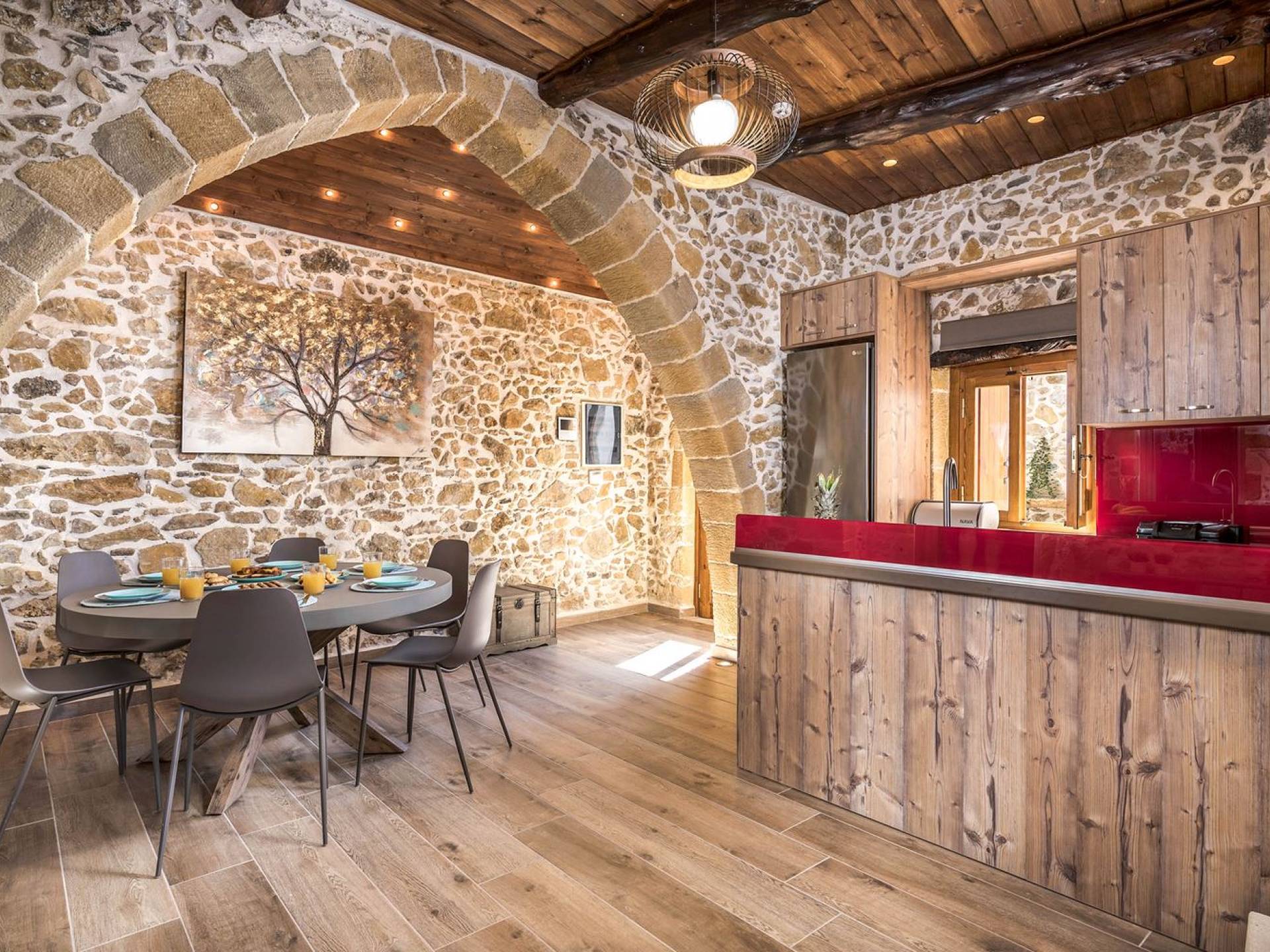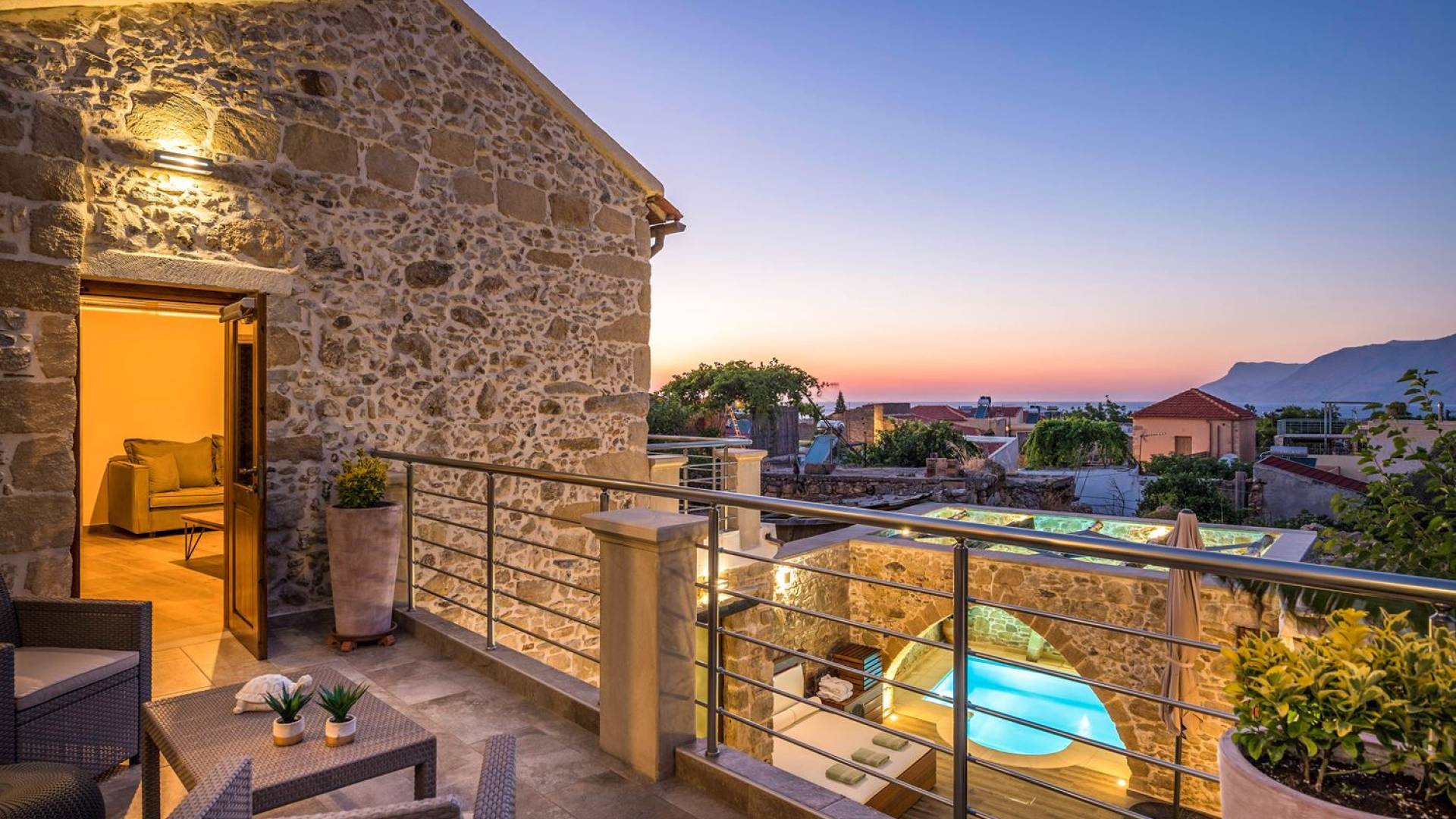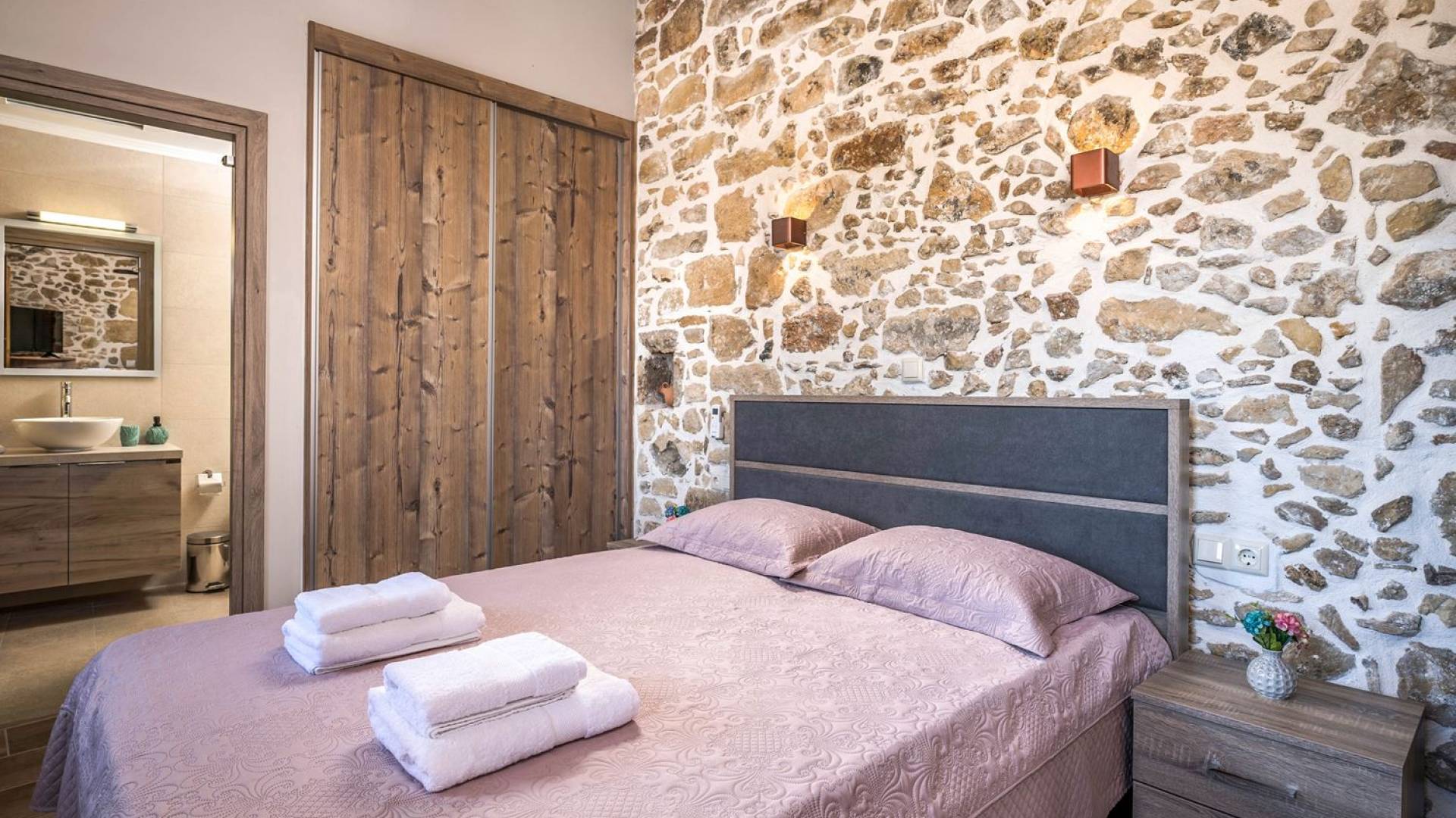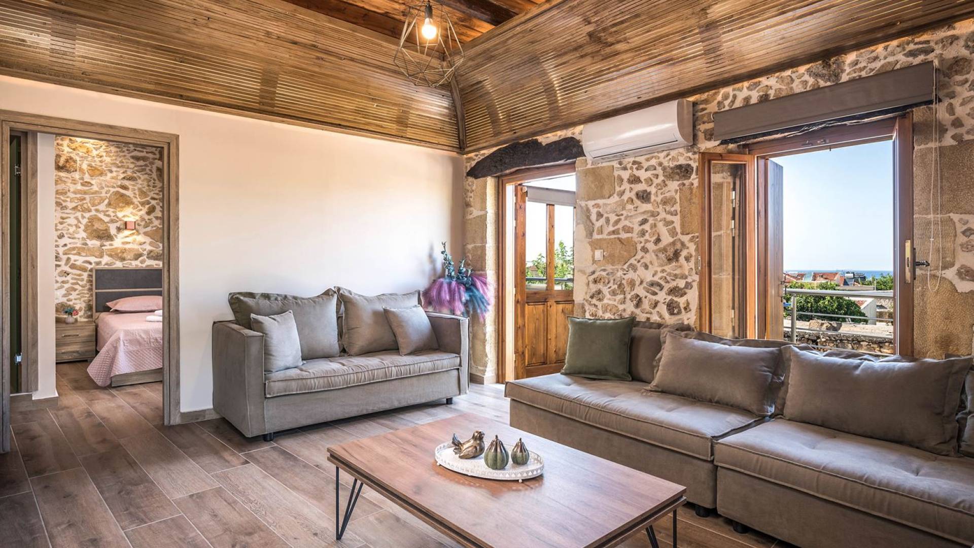Φεύγοντας από τον μαγευτικό υπαίθριο χώρο στολισμένο με μια πέτρινη καμάρα και μια ζωηρή μπουκαμβίλιες, θα βρεθείτε σε ένα όμορφο αρχιτεκτονικό πάντρεμα από γήινες αποχρώσεις πέτρινων τοίχων και καμάρων σε συνδυασμό με ξύλο και λιτές διακοσμητικές γραμμές που εξασφαλίζουν άνεση και κομψότητα. Η κουζίνα είναι πλήρως εξοπλισμένη με ηλεκτρικές συσκευές τελευταίας τεχνολογίας, όλα τα υπνοδωμάτια έχουν ιδιωτικό μπάνιο για μέγιστη άνεση και ιδιωτικότητα και οι χώροι είναι κλιματιζόμενοι. Οι διακοσμητικές πινελιές δημιουργούν μια γαλήνια, ατμόσφαιρα που θα σας χαρίσει μια παραδεισένια εμπειρία. Ο μοντέρνος σχεδιασμός με λεπτομέρειες παραδοσιακής αρχιτεκτονικής στην τοιχοποιία του δίνει μια μοναδική αίσθηση θαλπωρής και φιλοξενίας.