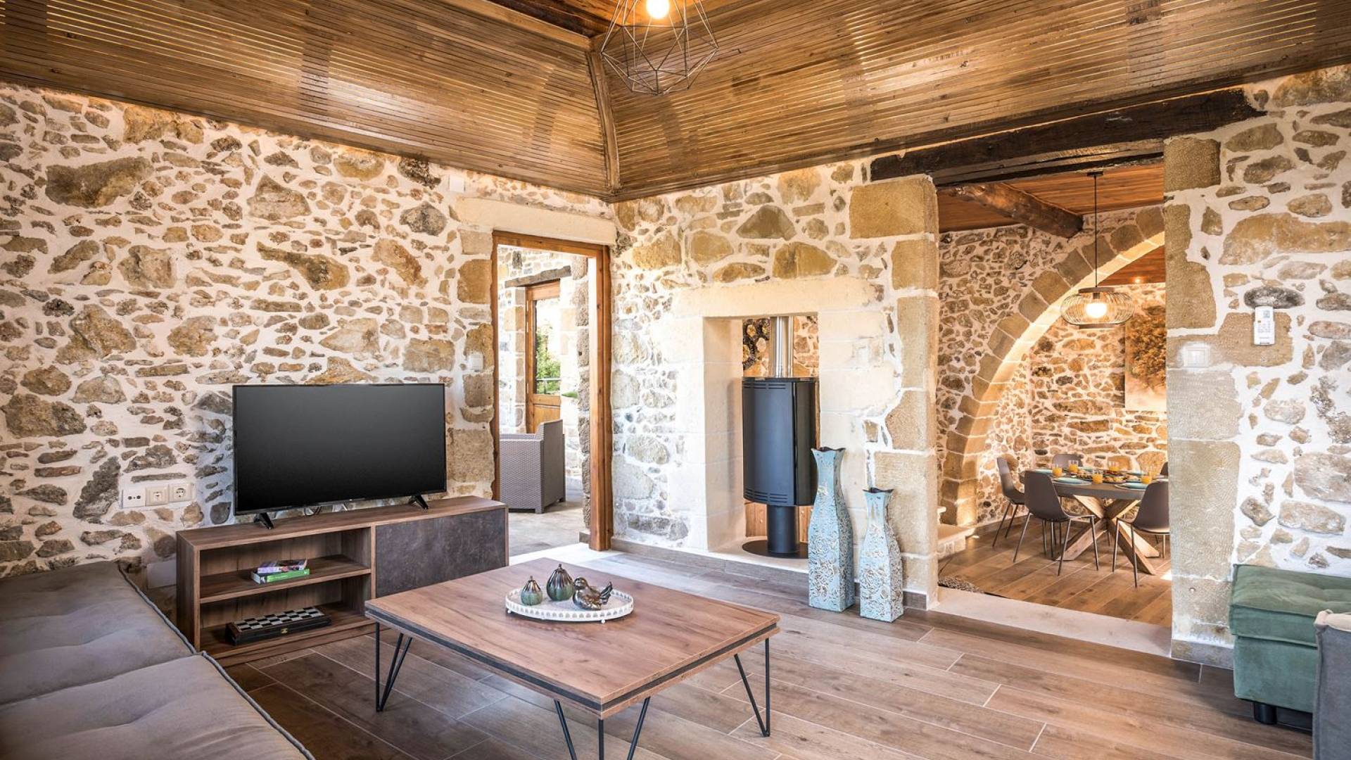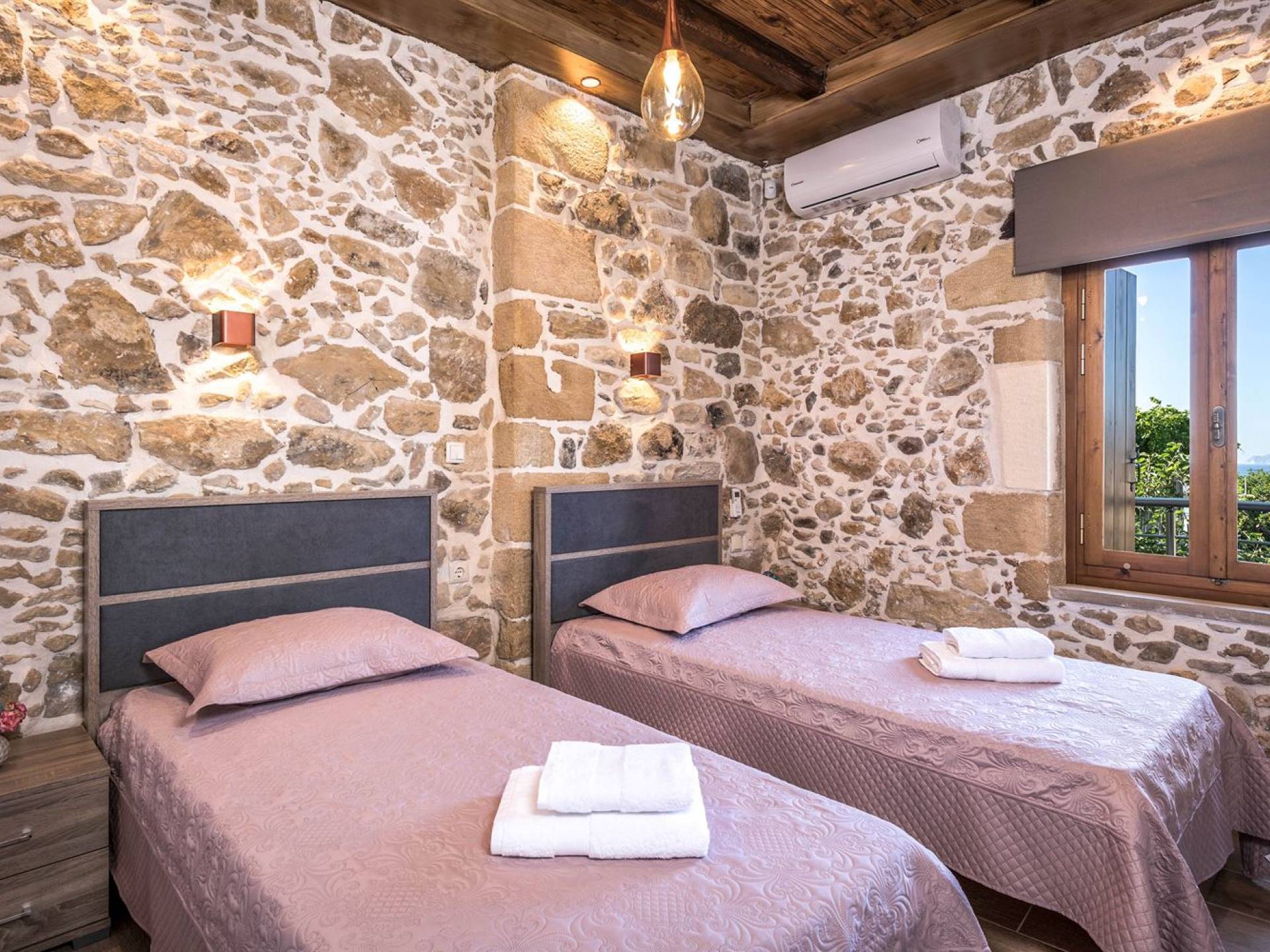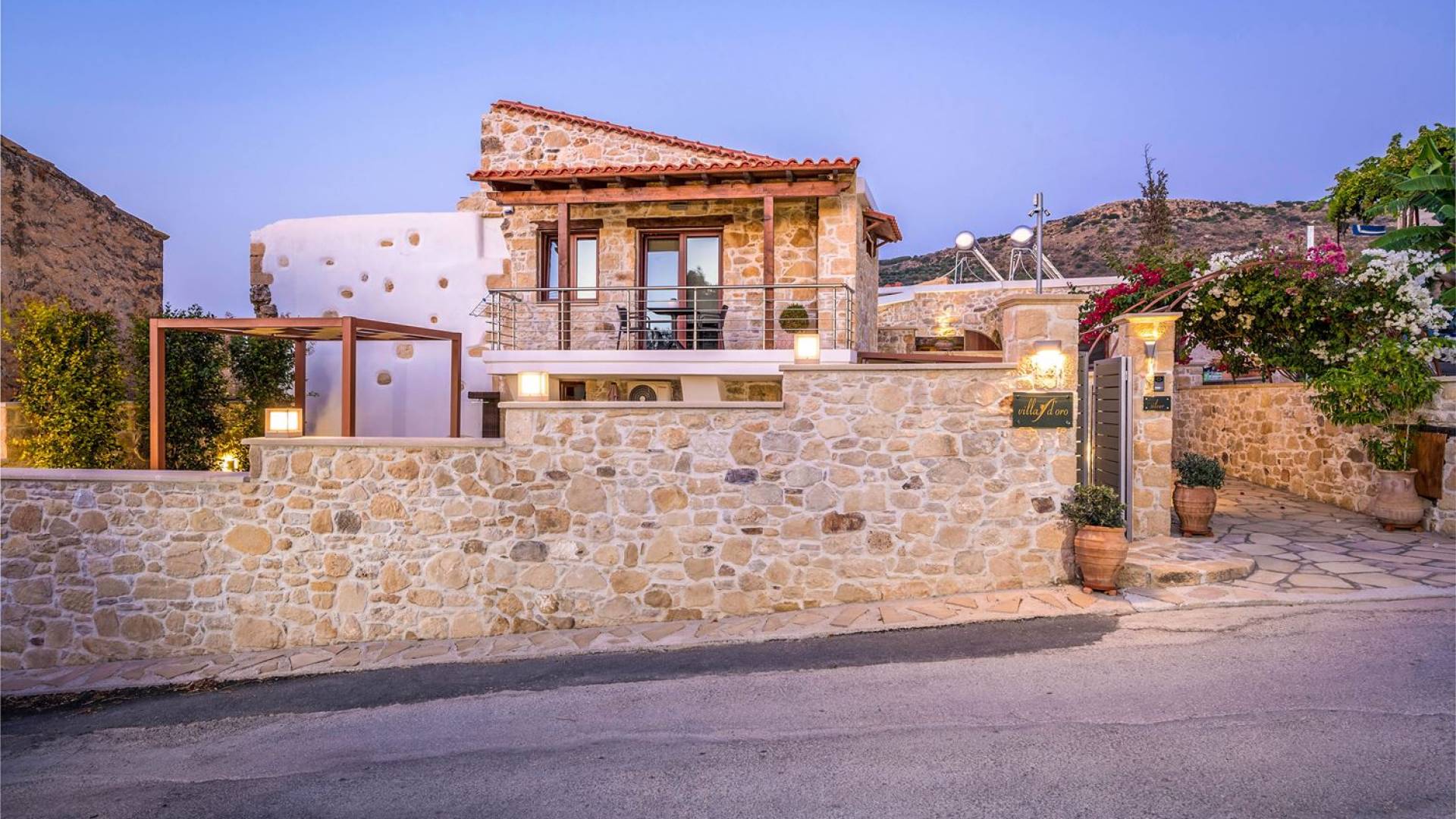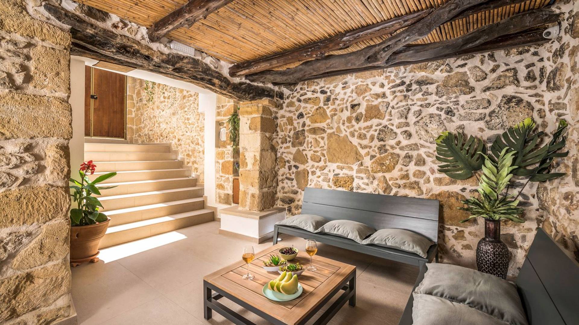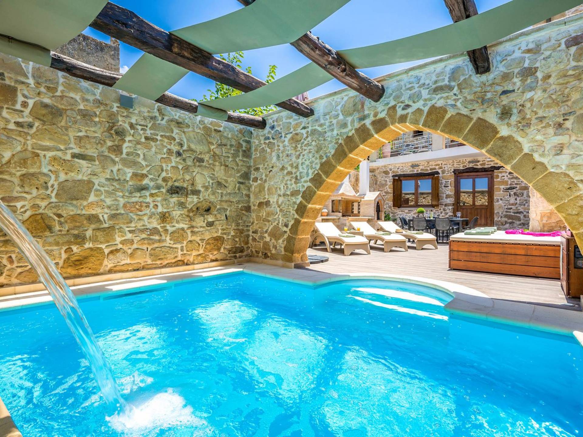 Φεύγοντας από τον μαγευτικό υπαίθριο χώρο στολισμένο με μια πέτρινη καμάρα και μια ζωηρή μπουκαμβίλιες, θα βρεθείτε σε ένα όμορφο αρχιτεκτονικό πάντρεμα από γήινες αποχρώσεις πέτρινων τοίχων και καμάρων σε συνδυασμό με ξύλο και λιτές διακοσμητικές γραμμές που εξασφαλίζουν άνεση και κομψότητα. Η κουζίνα είναι πλήρως εξοπλισμένη με ηλεκτρικές συσκευές τελευταίας τεχνολογίας, όλα τα υπνοδωμάτια έχουν ιδιωτικό μπάνιο για μέγιστη άνεση και ιδιωτικότητα και οι χώροι είναι κλιματιζόμενοι. Οι διακοσμητικές πινελιές δημιουργούν μια γαλήνια, ατμόσφαιρα που θα σας χαρίσει μια παραδεισένια εμπειρία. Ο μοντέρνος σχεδιασμός με λεπτομέρειες παραδοσιακής αρχιτεκτονικής στην τοιχοποιία του δίνει μια μοναδική αίσθηση θαλπωρής και φιλοξενίας.