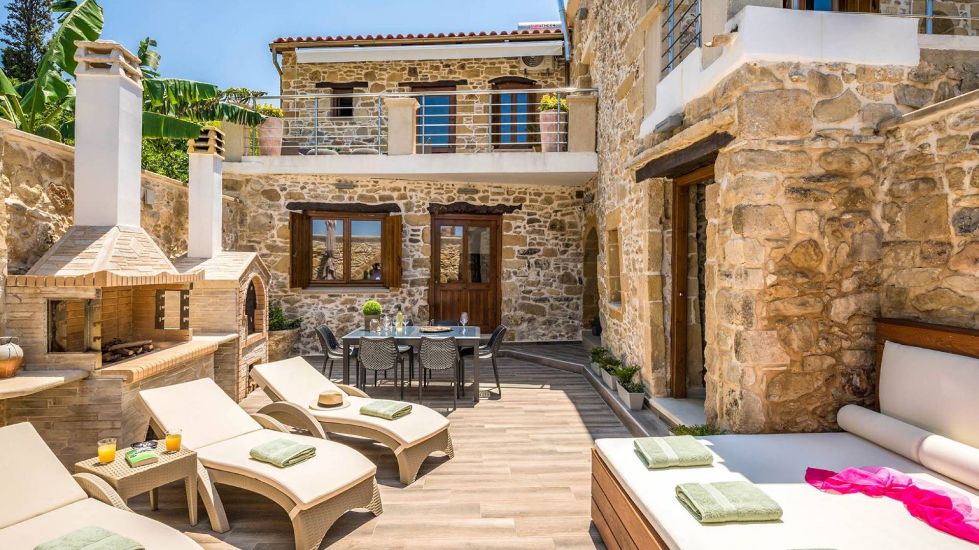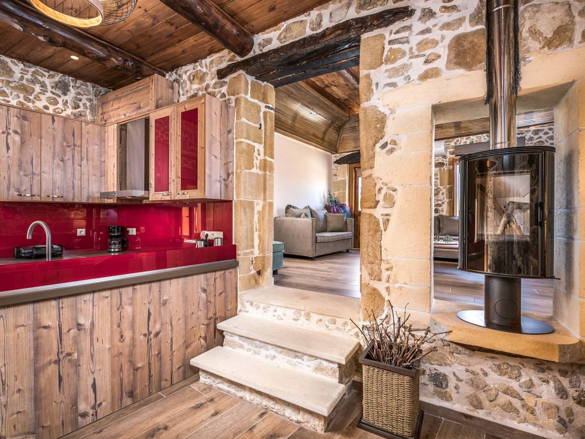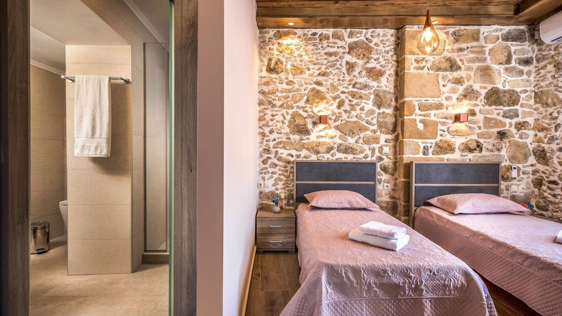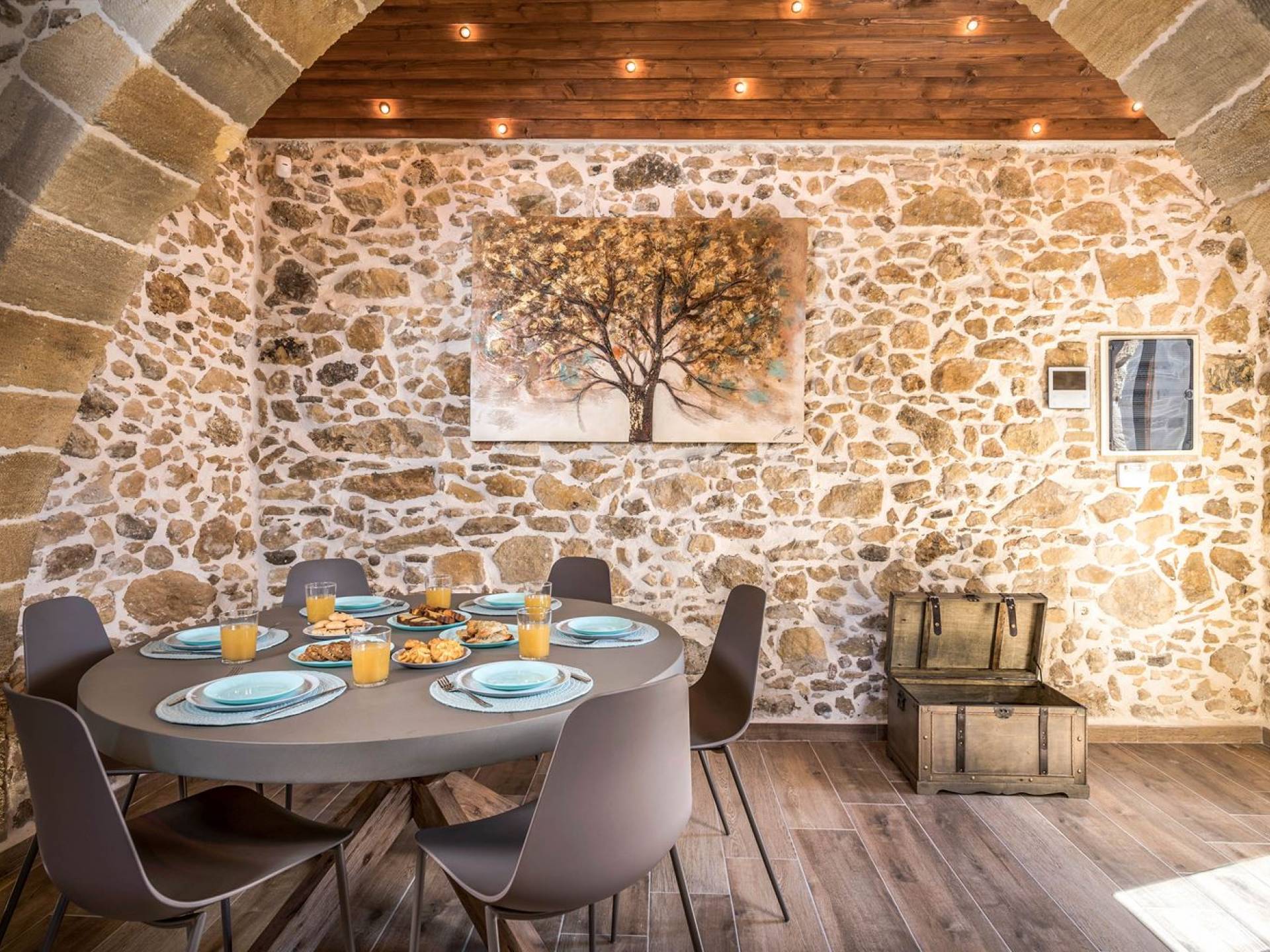 Φεύγοντας από τον μαγευτικό υπαίθριο χώρο στολισμένο με μια πέτρινη καμάρα και μια ζωηρή μπουκαμβίλιες, θα βρεθείτε σε ένα όμορφο αρχιτεκτονικό πάντρεμα από γήινες αποχρώσεις πέτρινων τοίχων και καμάρων σε συνδυασμό με ξύλο και λιτές διακοσμητικές γραμμές που εξασφαλίζουν άνεση και κομψότητα. Η κουζίνα είναι πλήρως εξοπλισμένη με ηλεκτρικές συσκευές τελευταίας τεχνολογίας, όλα τα υπνοδωμάτια έχουν ιδιωτικό μπάνιο για μέγιστη άνεση και ιδιωτικότητα και οι χώροι είναι κλιματιζόμενοι. Οι διακοσμητικές πινελιές δημιουργούν μια γαλήνια, ατμόσφαιρα που θα σας χαρίσει μια παραδεισένια εμπειρία. Ο μοντέρνος σχεδιασμός με λεπτομέρειες παραδοσιακής αρχιτεκτονικής στην τοιχοποιία του δίνει μια μοναδική αίσθηση θαλπωρής και φιλοξενίας.