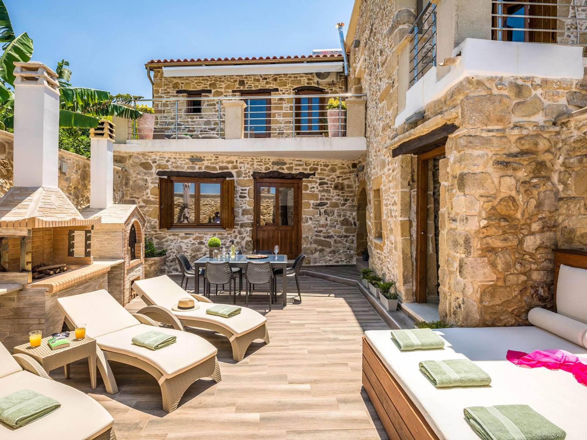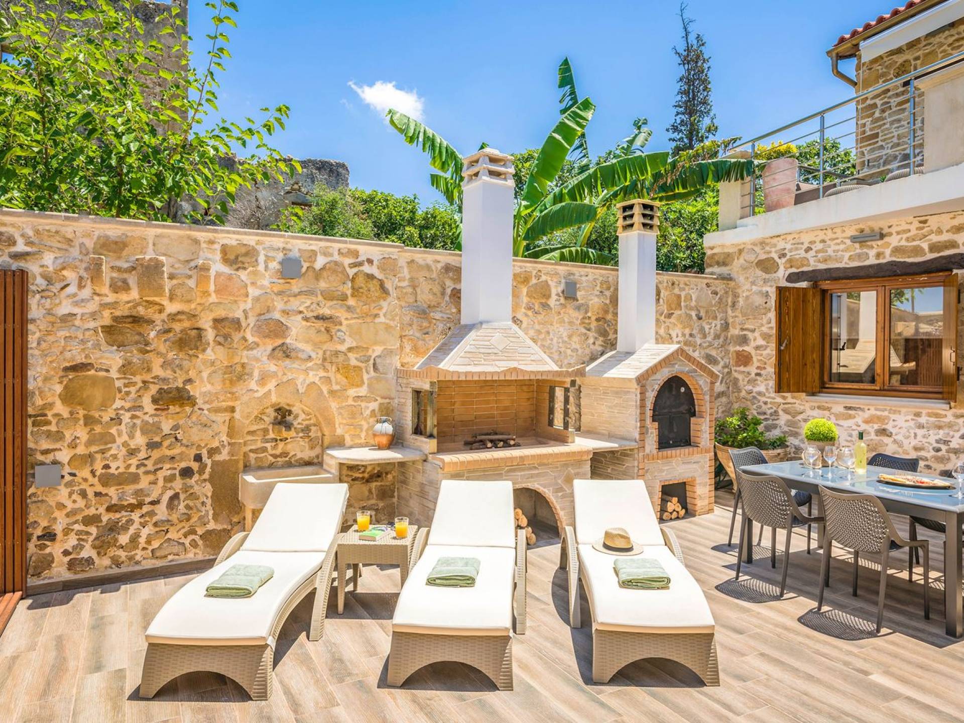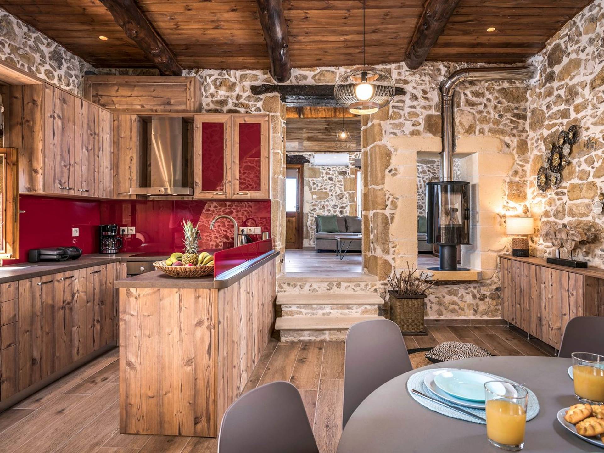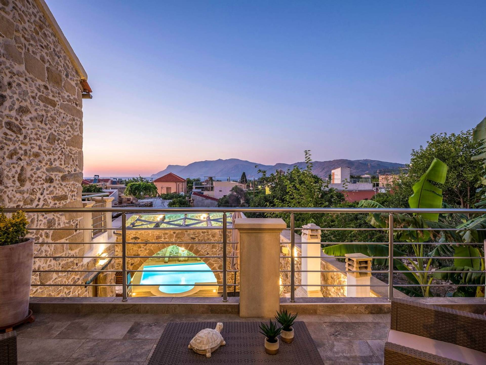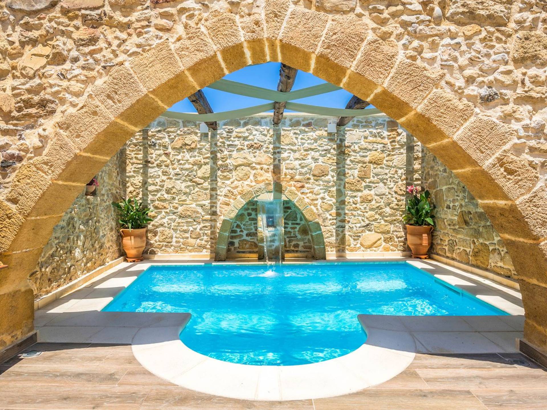 Φεύγοντας από τον μαγευτικό υπαίθριο χώρο στολισμένο με μια πέτρινη καμάρα και μια ζωηρή μπουκαμβίλιες, θα βρεθείτε σε ένα όμορφο αρχιτεκτονικό πάντρεμα από γήινες αποχρώσεις πέτρινων τοίχων και καμάρων σε συνδυασμό με ξύλο και λιτές διακοσμητικές γραμμές που εξασφαλίζουν άνεση και κομψότητα. Η κουζίνα είναι πλήρως εξοπλισμένη με ηλεκτρικές συσκευές τελευταίας τεχνολογίας, όλα τα υπνοδωμάτια έχουν ιδιωτικό μπάνιο για μέγιστη άνεση και ιδιωτικότητα και οι χώροι είναι κλιματιζόμενοι. Οι διακοσμητικές πινελιές δημιουργούν μια γαλήνια, ατμόσφαιρα που θα σας χαρίσει μια παραδεισένια εμπειρία. Ο μοντέρνος σχεδιασμός με λεπτομέρειες παραδοσιακής αρχιτεκτονικής στην τοιχοποιία του δίνει μια μοναδική αίσθηση θαλπωρής και φιλοξενίας.