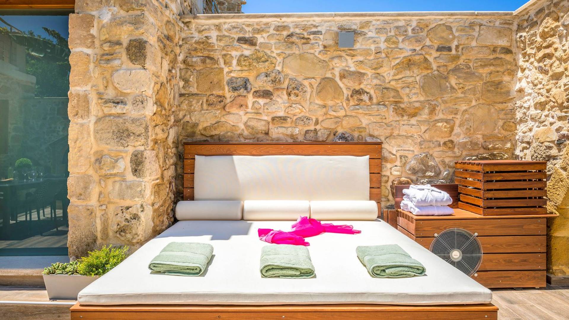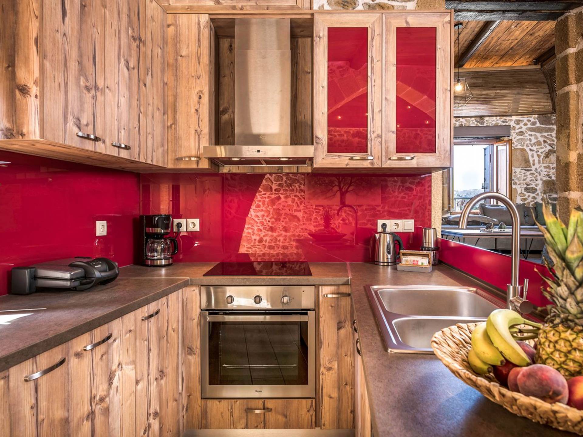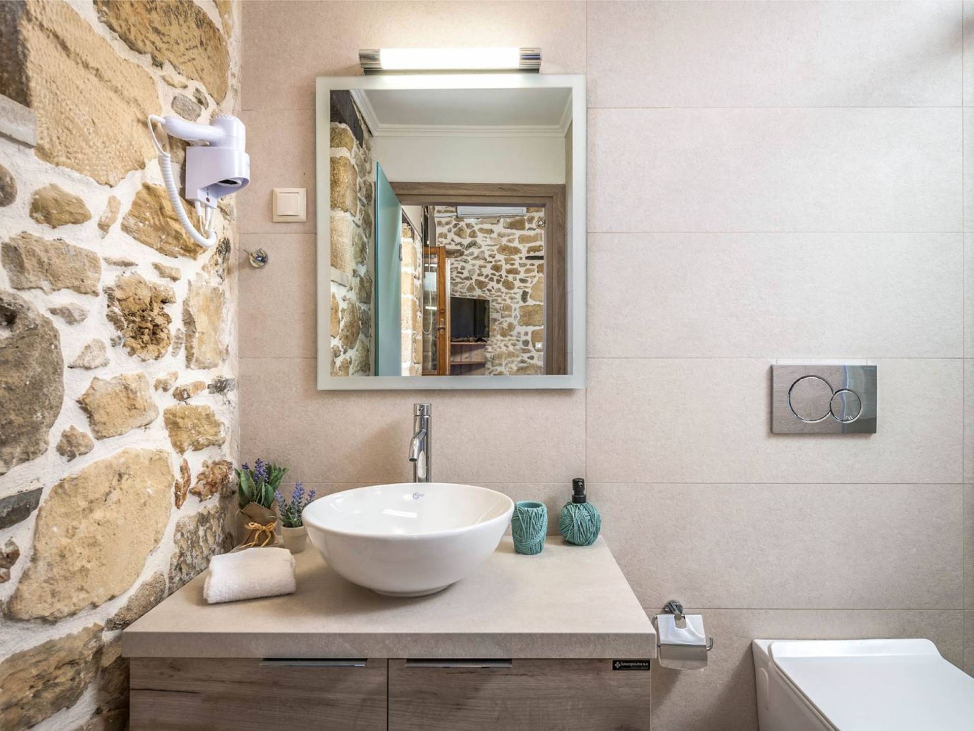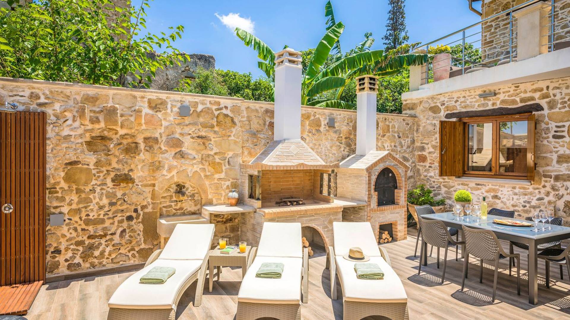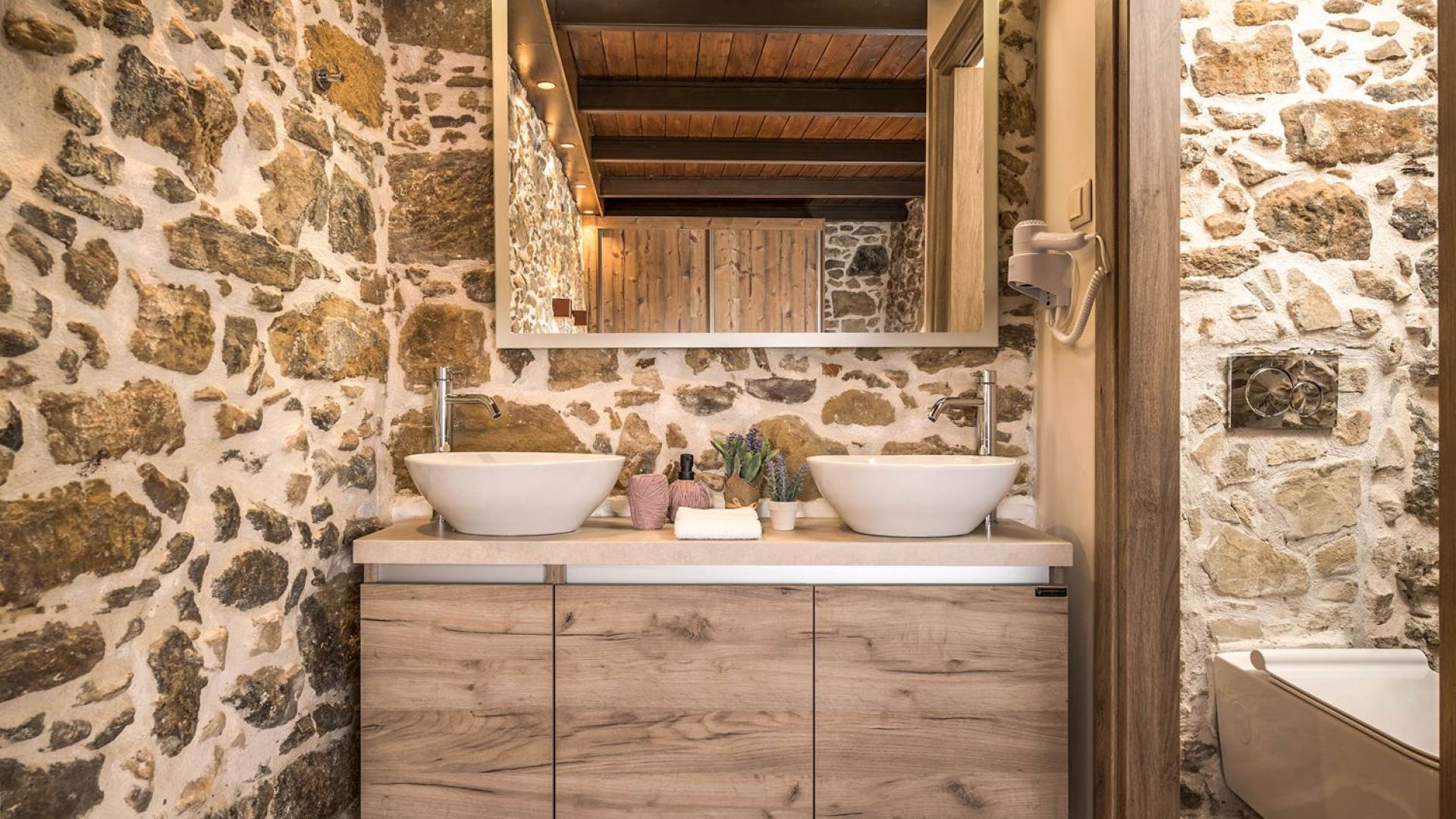 Φεύγοντας από τον μαγευτικό υπαίθριο χώρο στολισμένο με μια πέτρινη καμάρα και μια ζωηρή μπουκαμβίλιες, θα βρεθείτε σε ένα όμορφο αρχιτεκτονικό πάντρεμα από γήινες αποχρώσεις πέτρινων τοίχων και καμάρων σε συνδυασμό με ξύλο και λιτές διακοσμητικές γραμμές που εξασφαλίζουν άνεση και κομψότητα. Η κουζίνα είναι πλήρως εξοπλισμένη με ηλεκτρικές συσκευές τελευταίας τεχνολογίας, όλα τα υπνοδωμάτια έχουν ιδιωτικό μπάνιο για μέγιστη άνεση και ιδιωτικότητα και οι χώροι είναι κλιματιζόμενοι. Οι διακοσμητικές πινελιές δημιουργούν μια γαλήνια, ατμόσφαιρα που θα σας χαρίσει μια παραδεισένια εμπειρία. Ο μοντέρνος σχεδιασμός με λεπτομέρειες παραδοσιακής αρχιτεκτονικής στην τοιχοποιία του δίνει μια μοναδική αίσθηση θαλπωρής και φιλοξενίας.