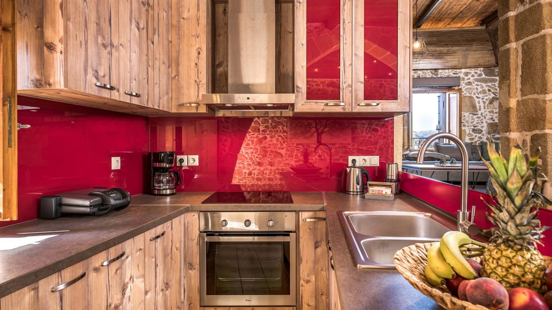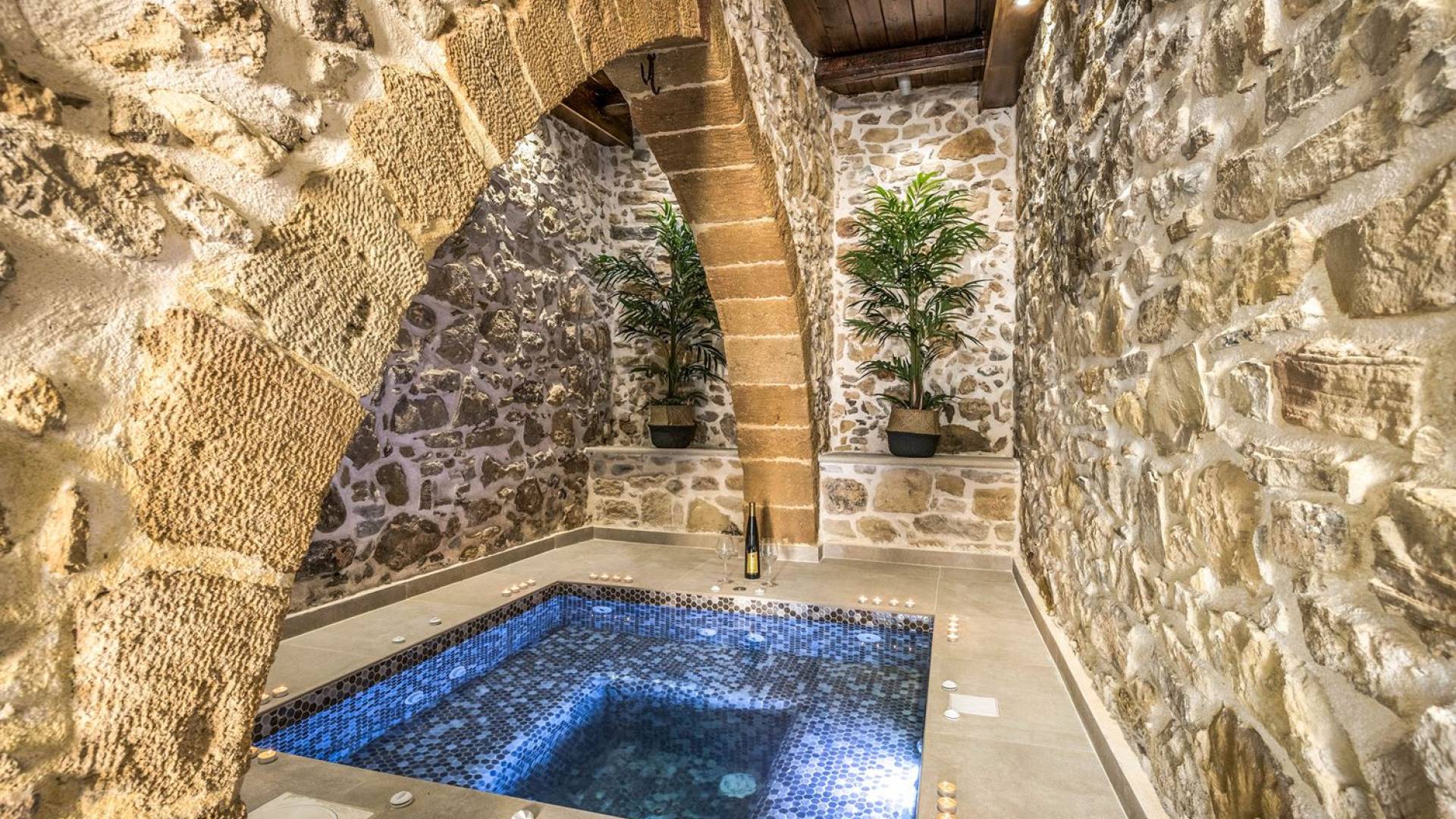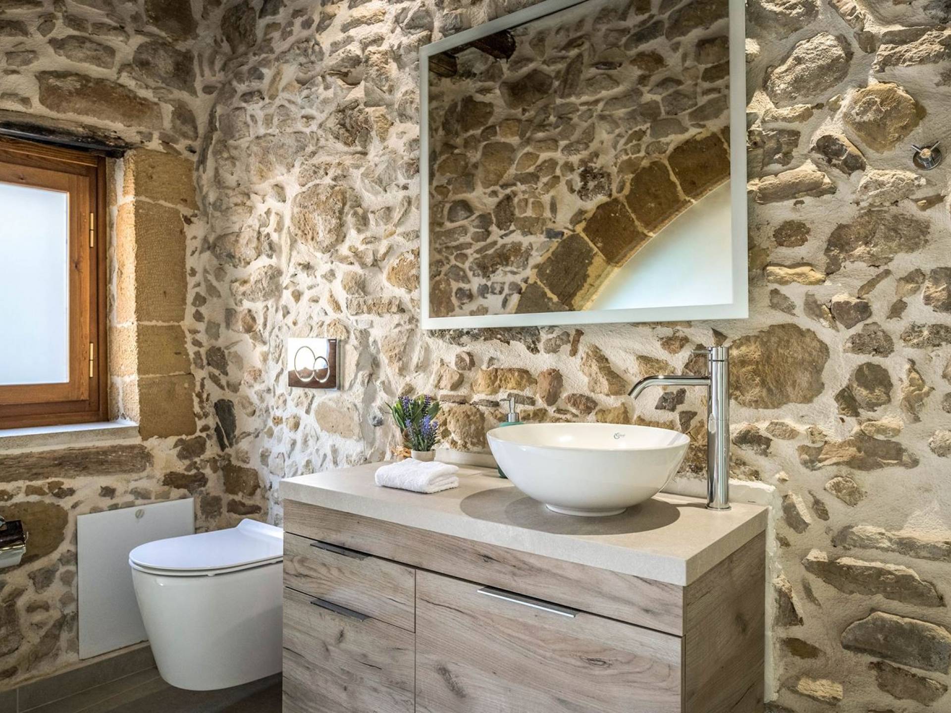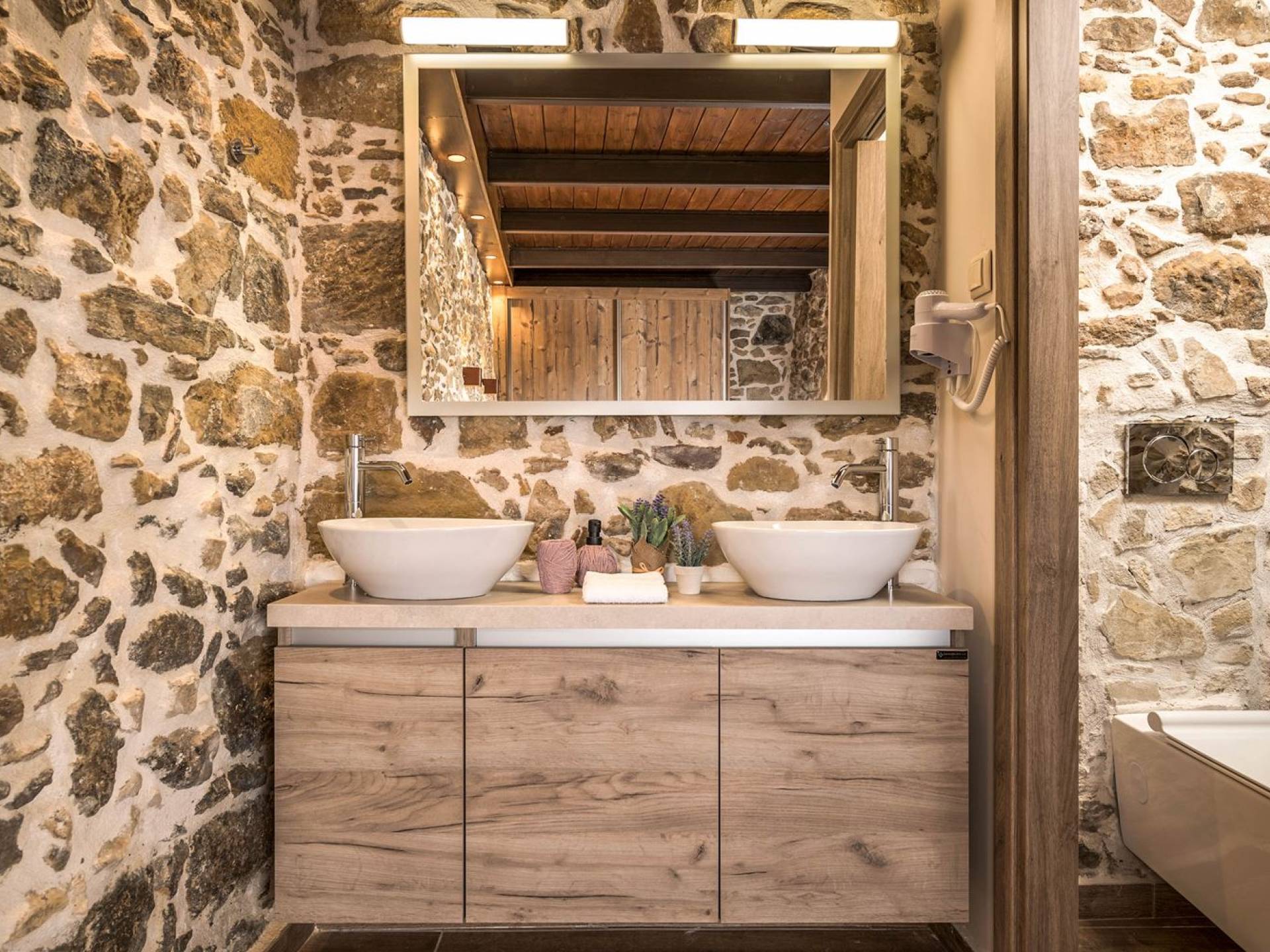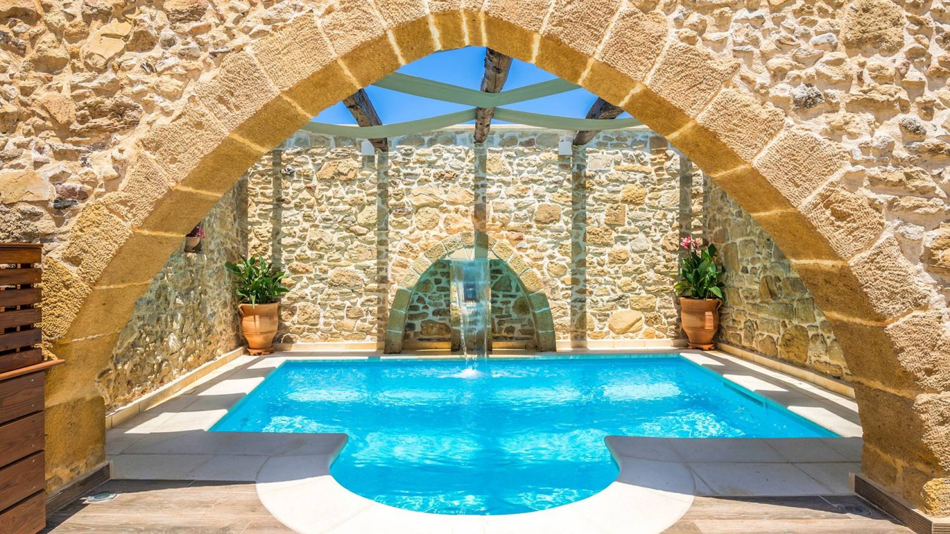 Φεύγοντας από τον μαγευτικό υπαίθριο χώρο στολισμένο με μια πέτρινη καμάρα και μια ζωηρή μπουκαμβίλιες, θα βρεθείτε σε ένα όμορφο αρχιτεκτονικό πάντρεμα από γήινες αποχρώσεις πέτρινων τοίχων και καμάρων σε συνδυασμό με ξύλο και λιτές διακοσμητικές γραμμές που εξασφαλίζουν άνεση και κομψότητα. Η κουζίνα είναι πλήρως εξοπλισμένη με ηλεκτρικές συσκευές τελευταίας τεχνολογίας, όλα τα υπνοδωμάτια έχουν ιδιωτικό μπάνιο για μέγιστη άνεση και ιδιωτικότητα και οι χώροι είναι κλιματιζόμενοι. Οι διακοσμητικές πινελιές δημιουργούν μια γαλήνια, ατμόσφαιρα που θα σας χαρίσει μια παραδεισένια εμπειρία. Ο μοντέρνος σχεδιασμός με λεπτομέρειες παραδοσιακής αρχιτεκτονικής στην τοιχοποιία του δίνει μια μοναδική αίσθηση θαλπωρής και φιλοξενίας.