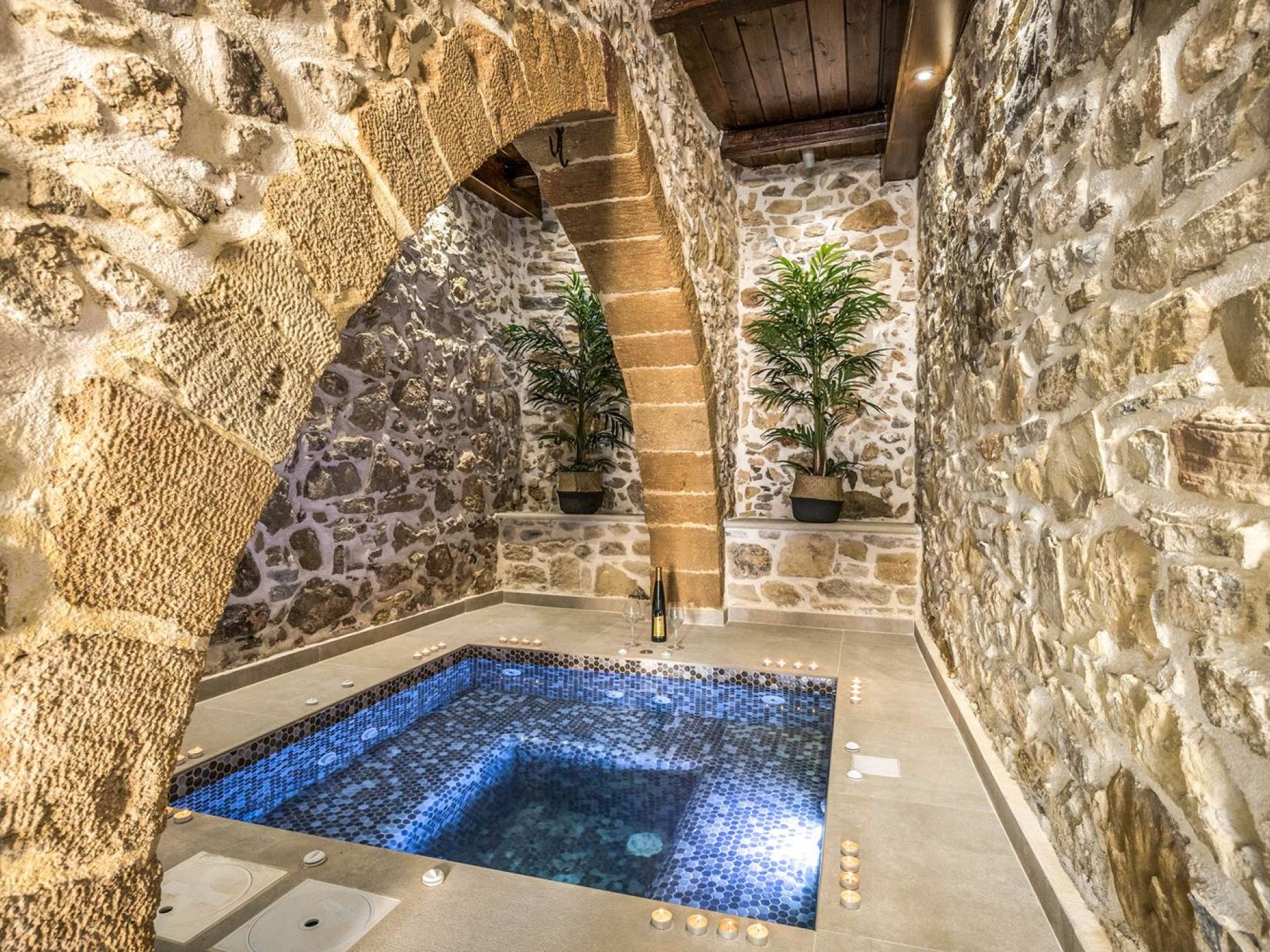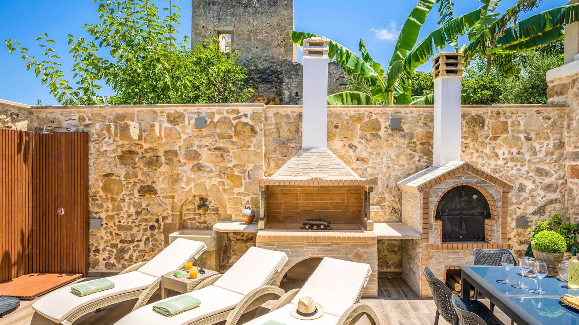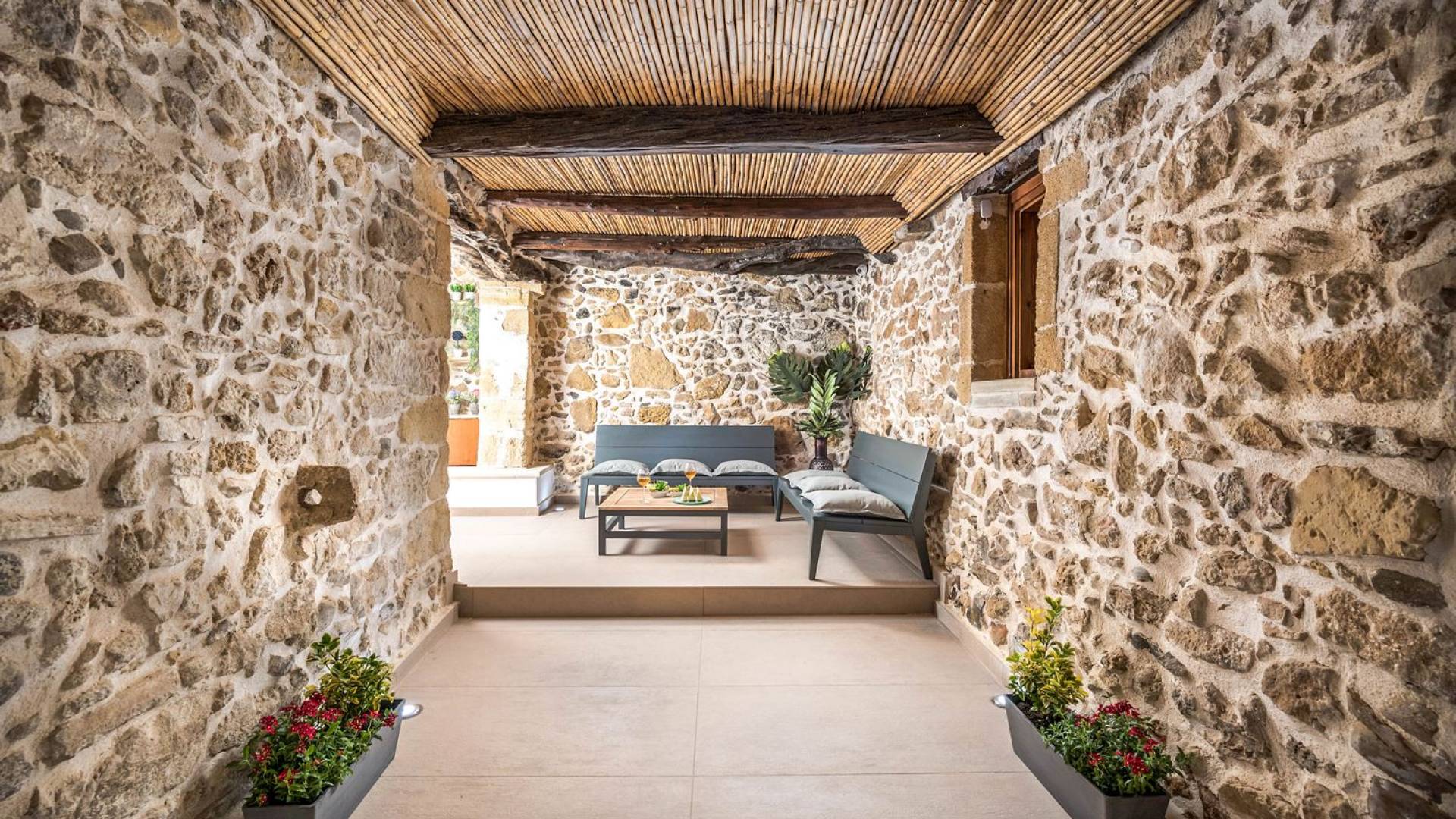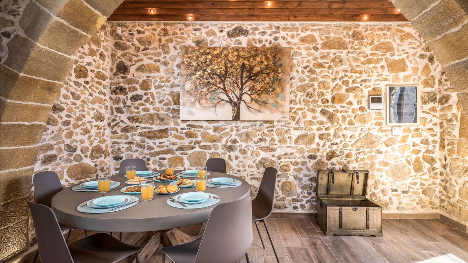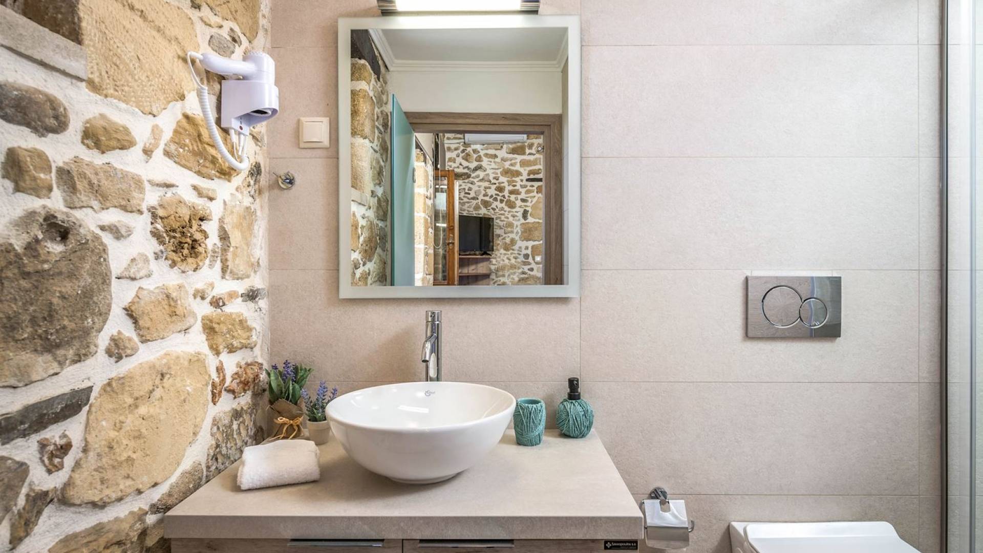 Φεύγοντας από τον μαγευτικό υπαίθριο χώρο στολισμένο με μια πέτρινη καμάρα και μια ζωηρή μπουκαμβίλιες, θα βρεθείτε σε ένα όμορφο αρχιτεκτονικό πάντρεμα από γήινες αποχρώσεις πέτρινων τοίχων και καμάρων σε συνδυασμό με ξύλο και λιτές διακοσμητικές γραμμές που εξασφαλίζουν άνεση και κομψότητα. Η κουζίνα είναι πλήρως εξοπλισμένη με ηλεκτρικές συσκευές τελευταίας τεχνολογίας, όλα τα υπνοδωμάτια έχουν ιδιωτικό μπάνιο για μέγιστη άνεση και ιδιωτικότητα και οι χώροι είναι κλιματιζόμενοι. Οι διακοσμητικές πινελιές δημιουργούν μια γαλήνια, ατμόσφαιρα που θα σας χαρίσει μια παραδεισένια εμπειρία. Ο μοντέρνος σχεδιασμός με λεπτομέρειες παραδοσιακής αρχιτεκτονικής στην τοιχοποιία του δίνει μια μοναδική αίσθηση θαλπωρής και φιλοξενίας.