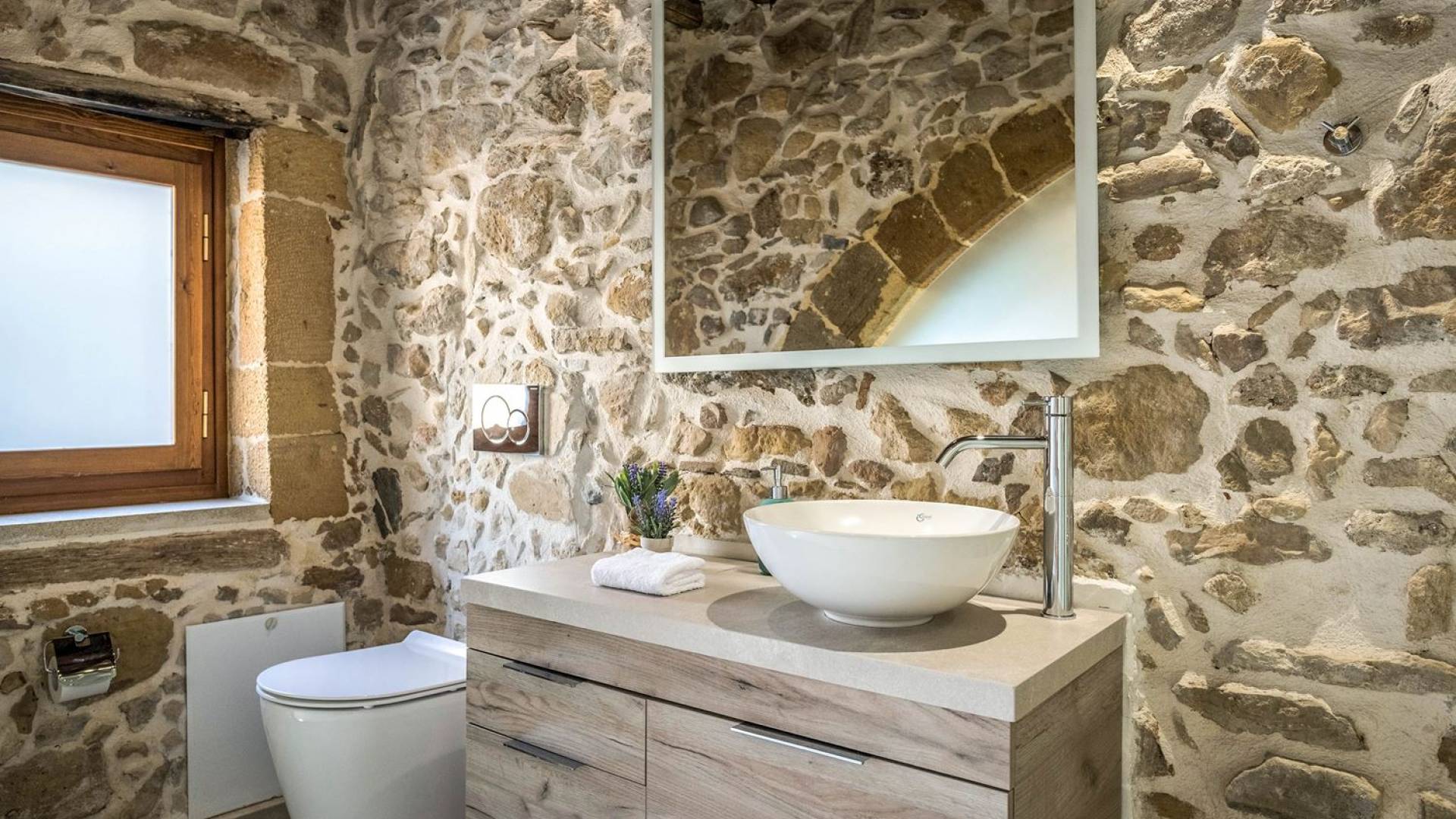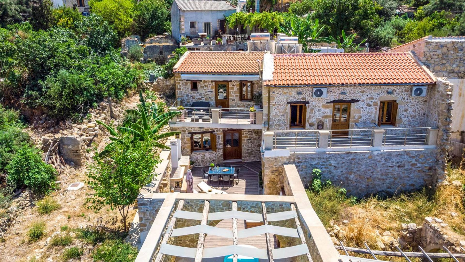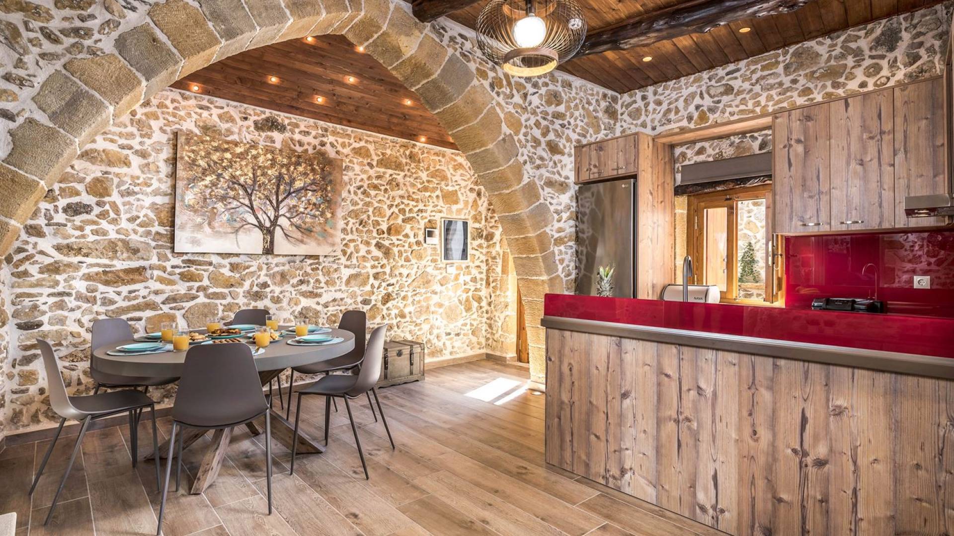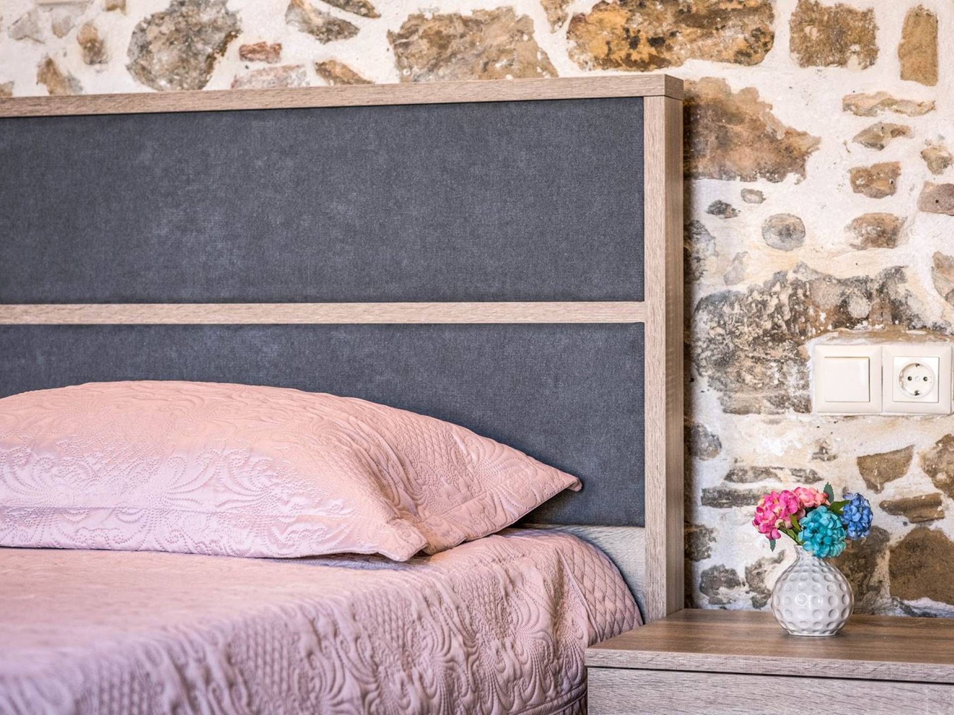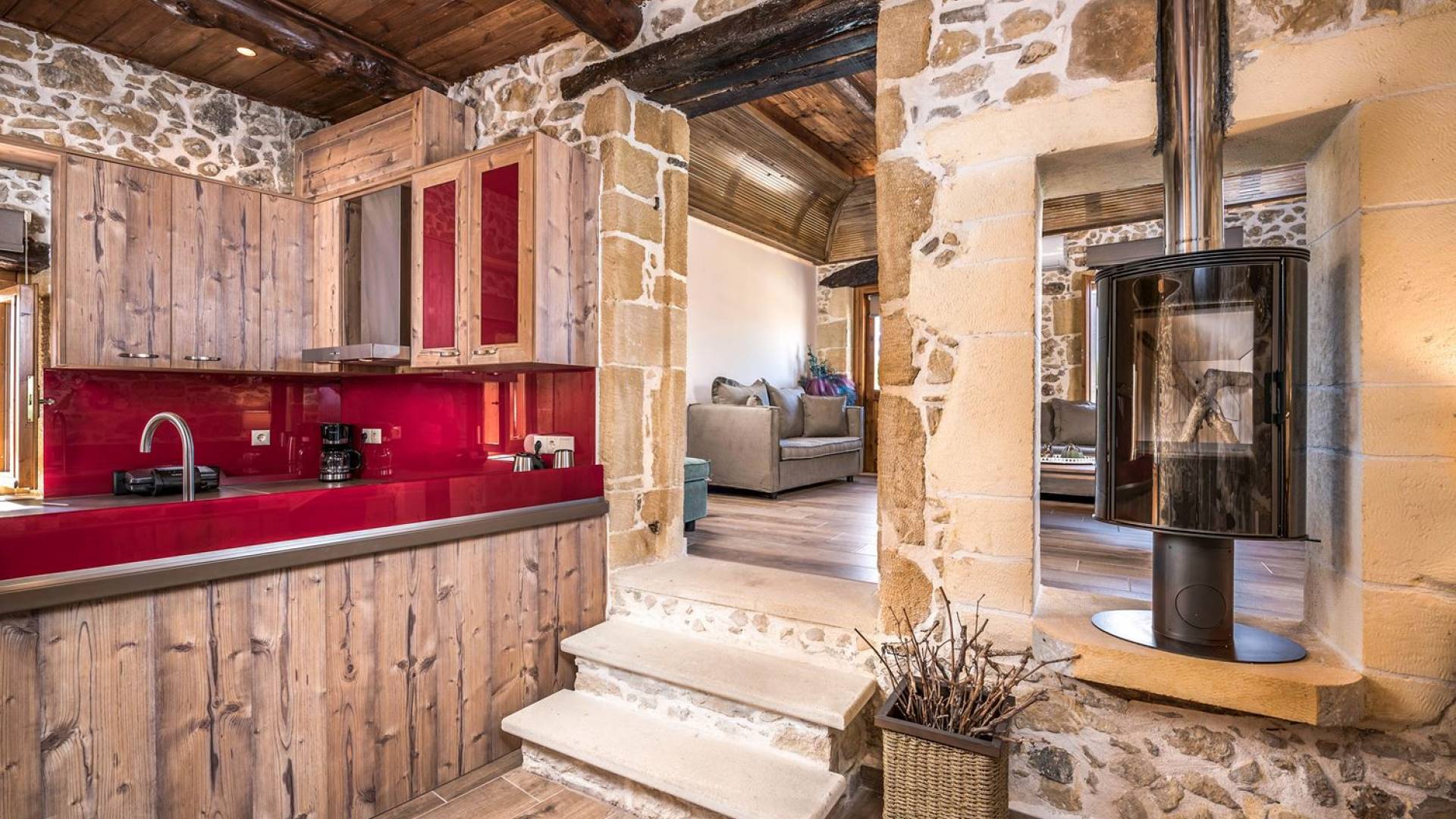 Φεύγοντας από τον μαγευτικό υπαίθριο χώρο στολισμένο με μια πέτρινη καμάρα και μια ζωηρή μπουκαμβίλιες, θα βρεθείτε σε ένα όμορφο αρχιτεκτονικό πάντρεμα από γήινες αποχρώσεις πέτρινων τοίχων και καμάρων σε συνδυασμό με ξύλο και λιτές διακοσμητικές γραμμές που εξασφαλίζουν άνεση και κομψότητα. Η κουζίνα είναι πλήρως εξοπλισμένη με ηλεκτρικές συσκευές τελευταίας τεχνολογίας, όλα τα υπνοδωμάτια έχουν ιδιωτικό μπάνιο για μέγιστη άνεση και ιδιωτικότητα και οι χώροι είναι κλιματιζόμενοι. Οι διακοσμητικές πινελιές δημιουργούν μια γαλήνια, ατμόσφαιρα που θα σας χαρίσει μια παραδεισένια εμπειρία. Ο μοντέρνος σχεδιασμός με λεπτομέρειες παραδοσιακής αρχιτεκτονικής στην τοιχοποιία του δίνει μια μοναδική αίσθηση θαλπωρής και φιλοξενίας.