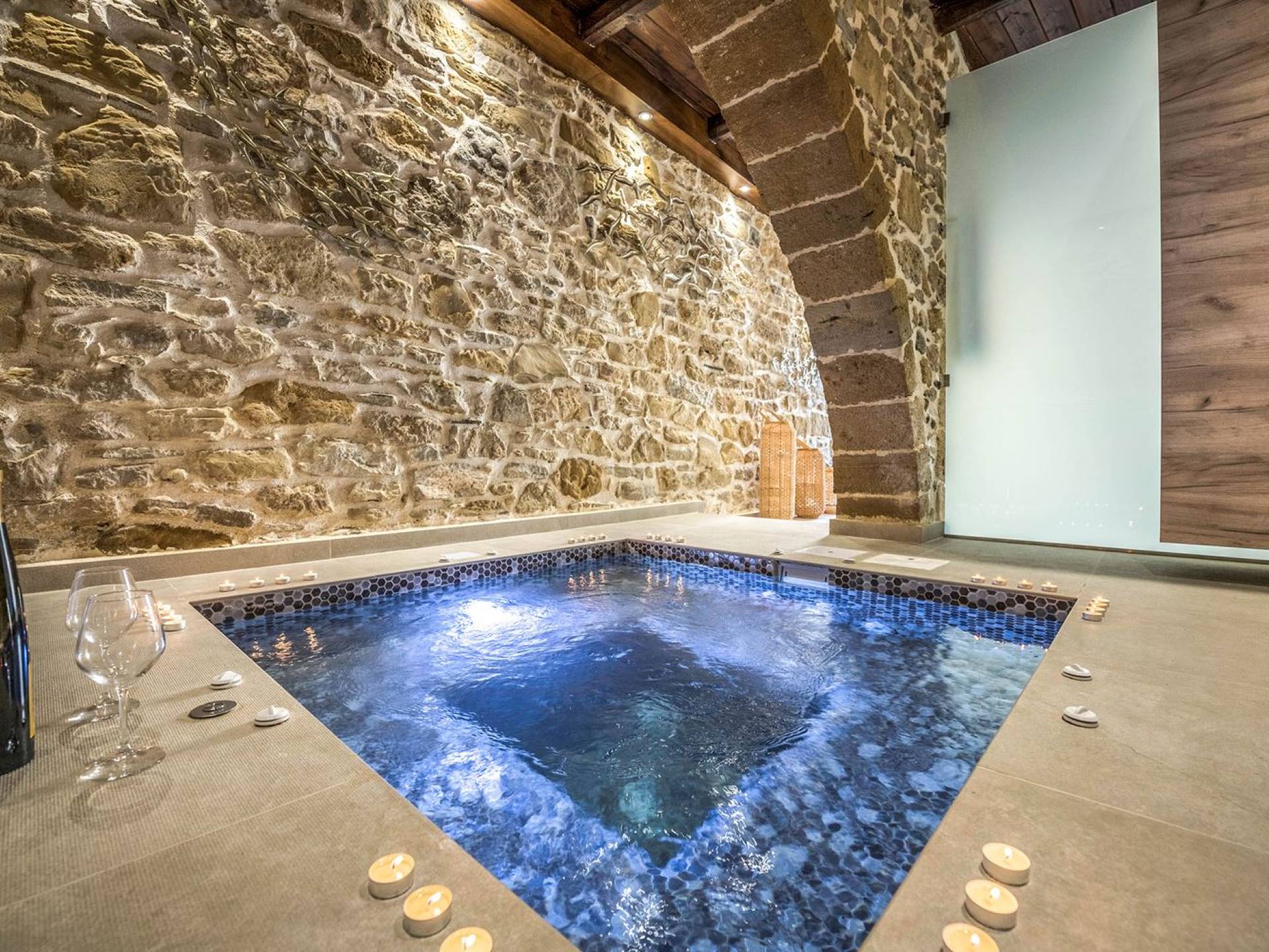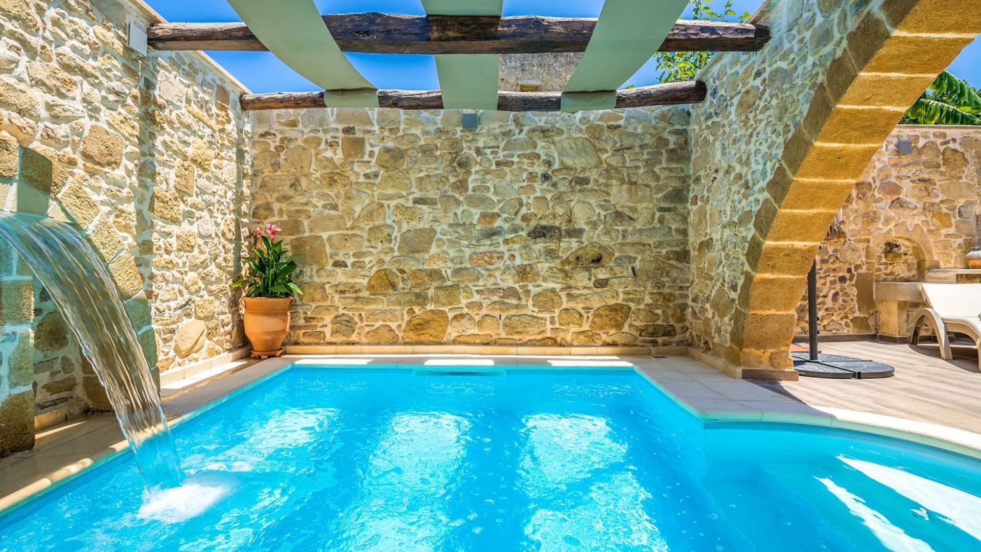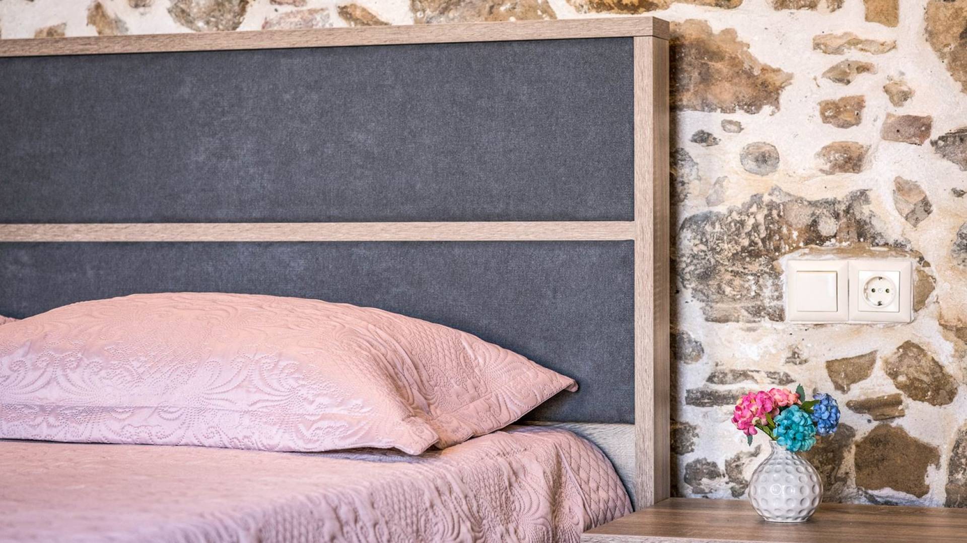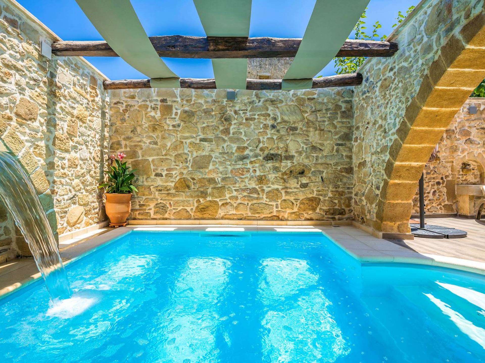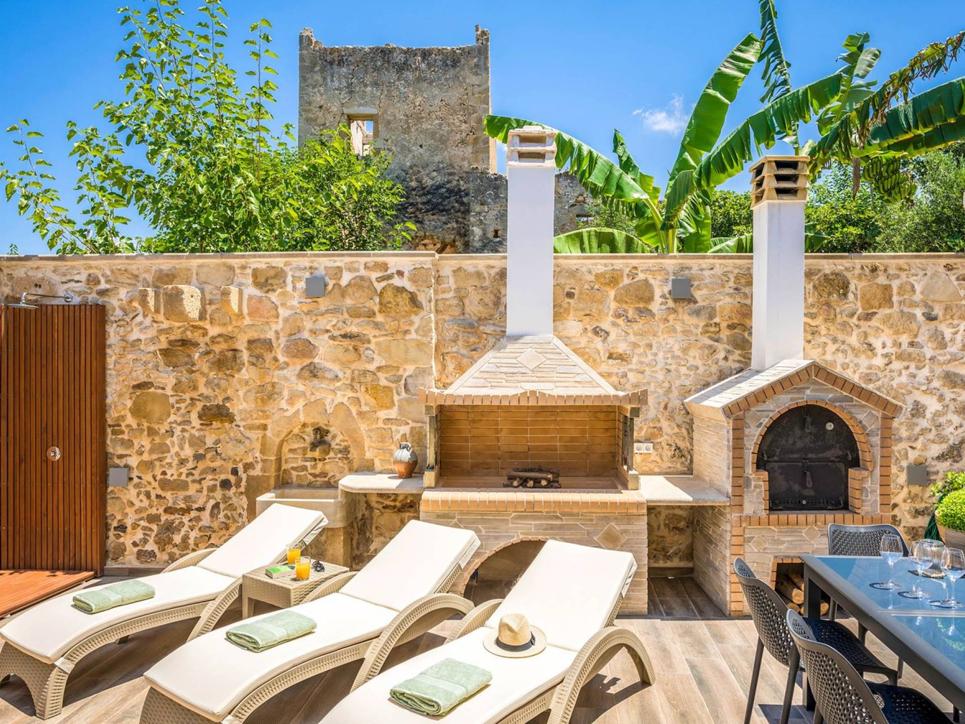 Φεύγοντας από τον μαγευτικό υπαίθριο χώρο στολισμένο με μια πέτρινη καμάρα και μια ζωηρή μπουκαμβίλιες, θα βρεθείτε σε ένα όμορφο αρχιτεκτονικό πάντρεμα από γήινες αποχρώσεις πέτρινων τοίχων και καμάρων σε συνδυασμό με ξύλο και λιτές διακοσμητικές γραμμές που εξασφαλίζουν άνεση και κομψότητα. Η κουζίνα είναι πλήρως εξοπλισμένη με ηλεκτρικές συσκευές τελευταίας τεχνολογίας, όλα τα υπνοδωμάτια έχουν ιδιωτικό μπάνιο για μέγιστη άνεση και ιδιωτικότητα και οι χώροι είναι κλιματιζόμενοι. Οι διακοσμητικές πινελιές δημιουργούν μια γαλήνια, ατμόσφαιρα που θα σας χαρίσει μια παραδεισένια εμπειρία. Ο μοντέρνος σχεδιασμός με λεπτομέρειες παραδοσιακής αρχιτεκτονικής στην τοιχοποιία του δίνει μια μοναδική αίσθηση θαλπωρής και φιλοξενίας.