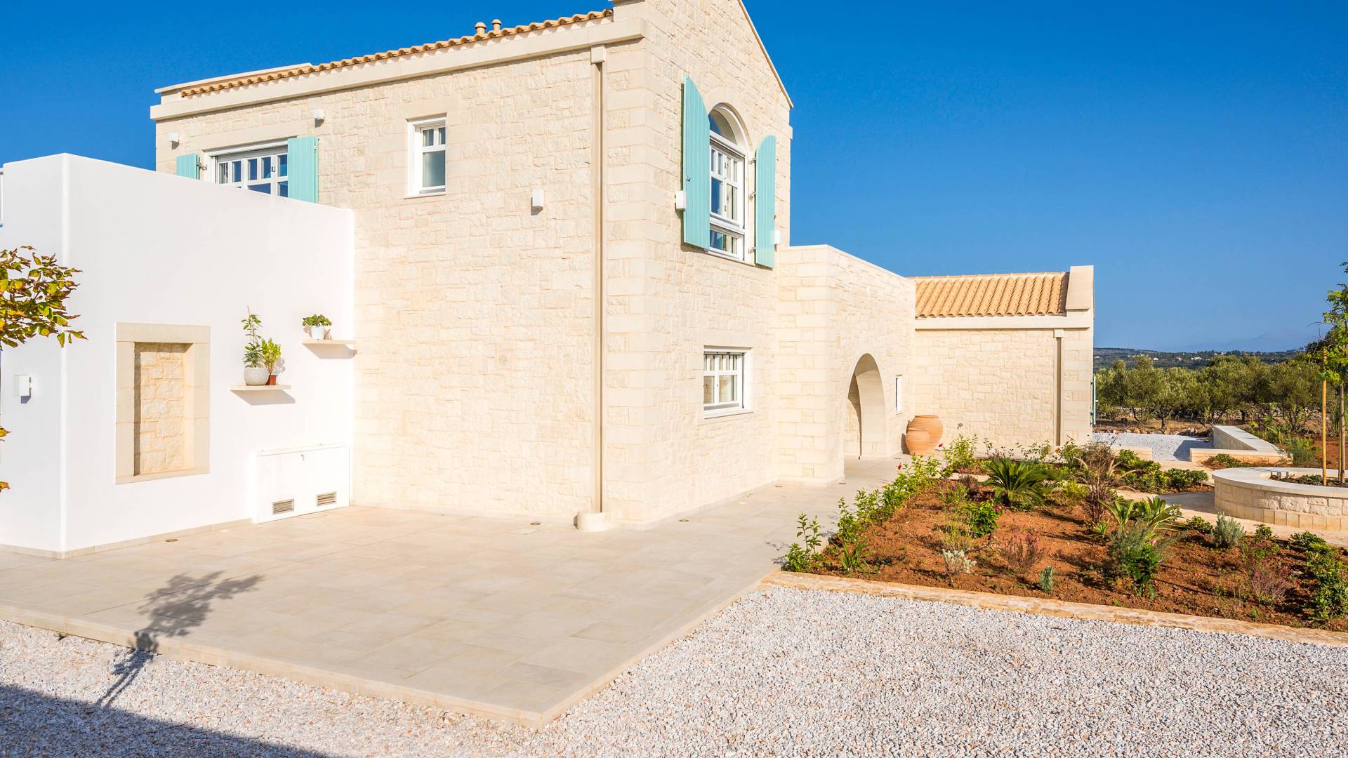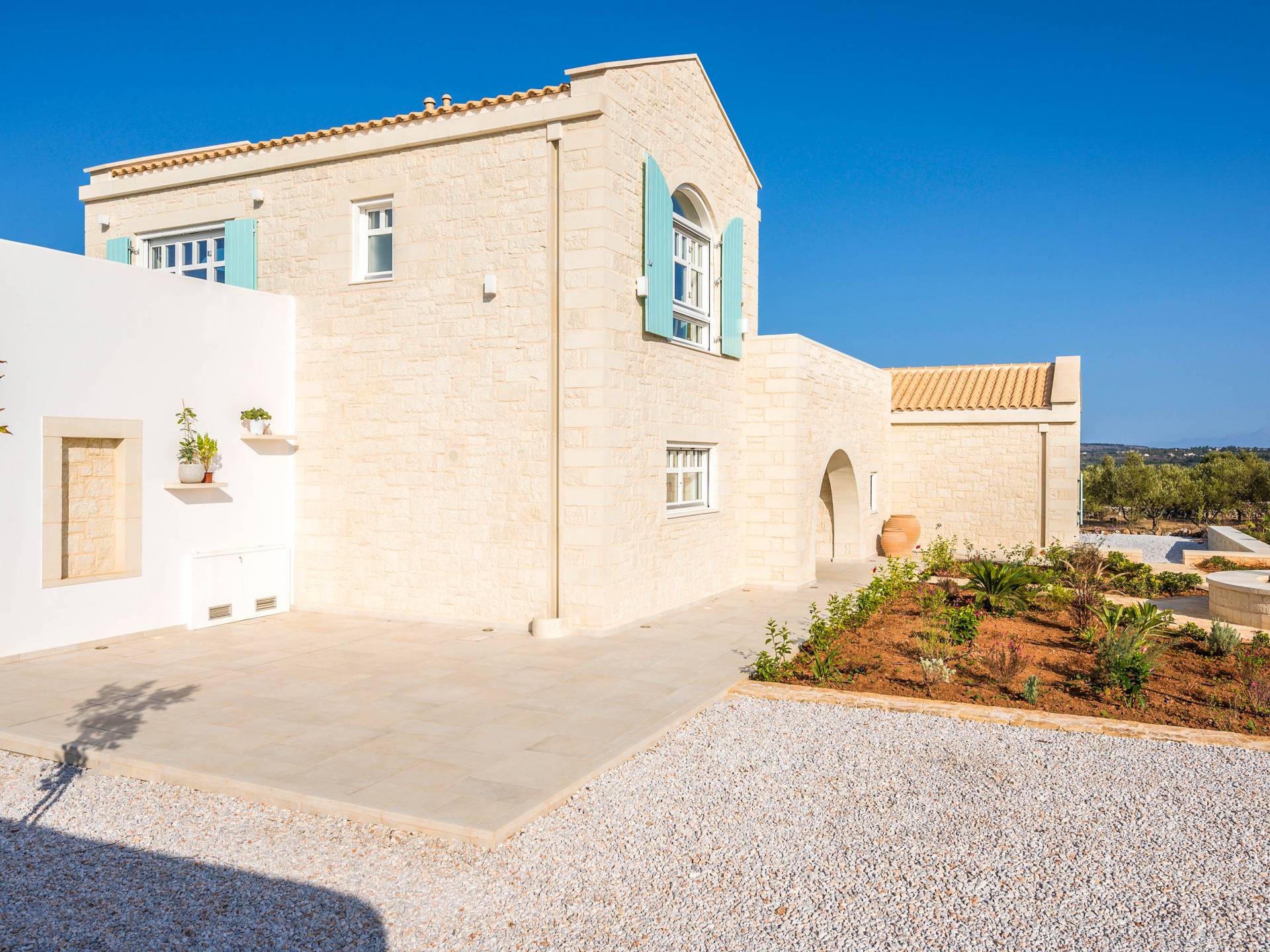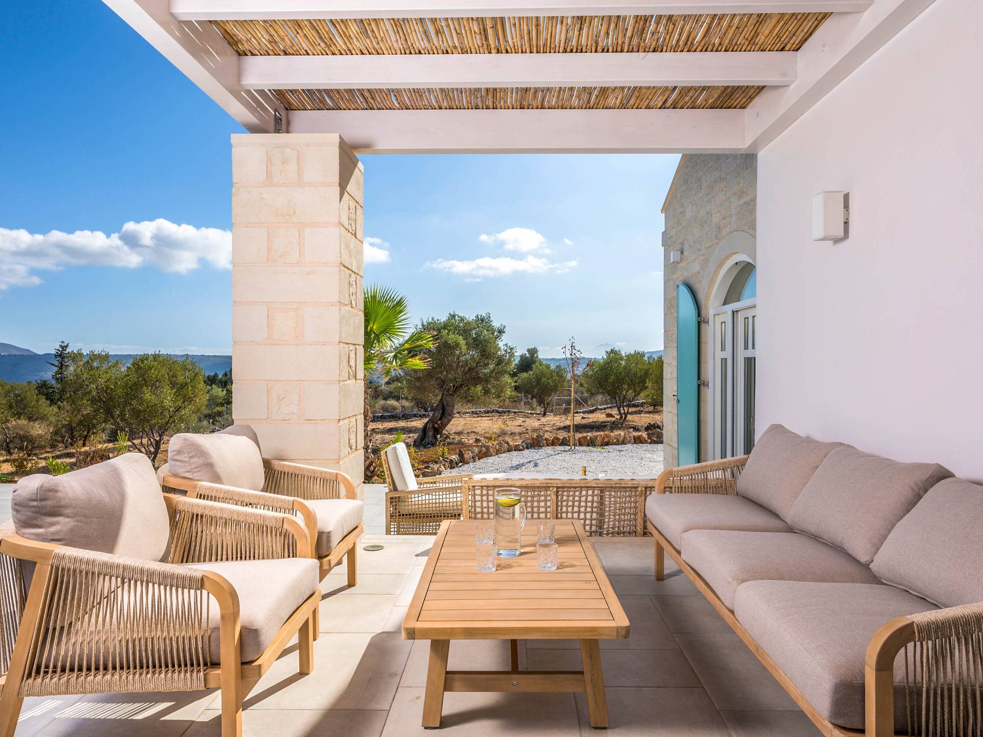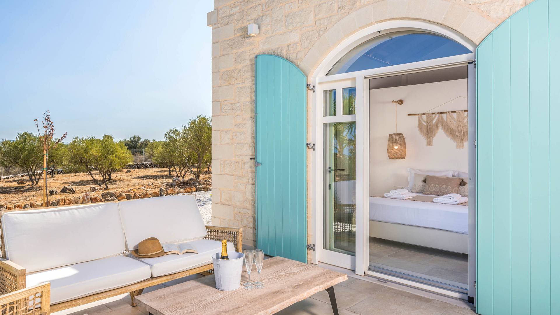 Villa Forever Crete - Everlong is a beautifully crafted, completely private luxury villa with three bedrooms, set within a 4,000 m² olive grove and offering breathtaking panoramic sea views. This radiant, airy retreat seamlessly blends traditional Cretan stone walls with elegant Cycladic influences.