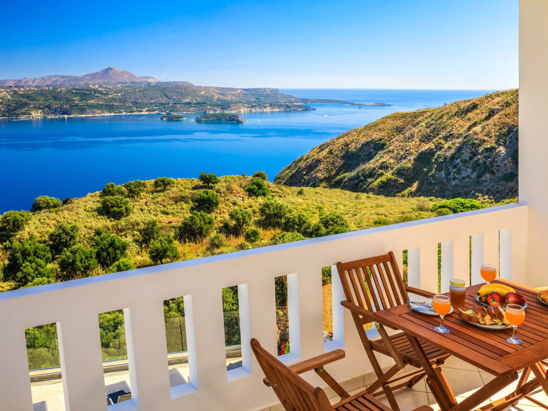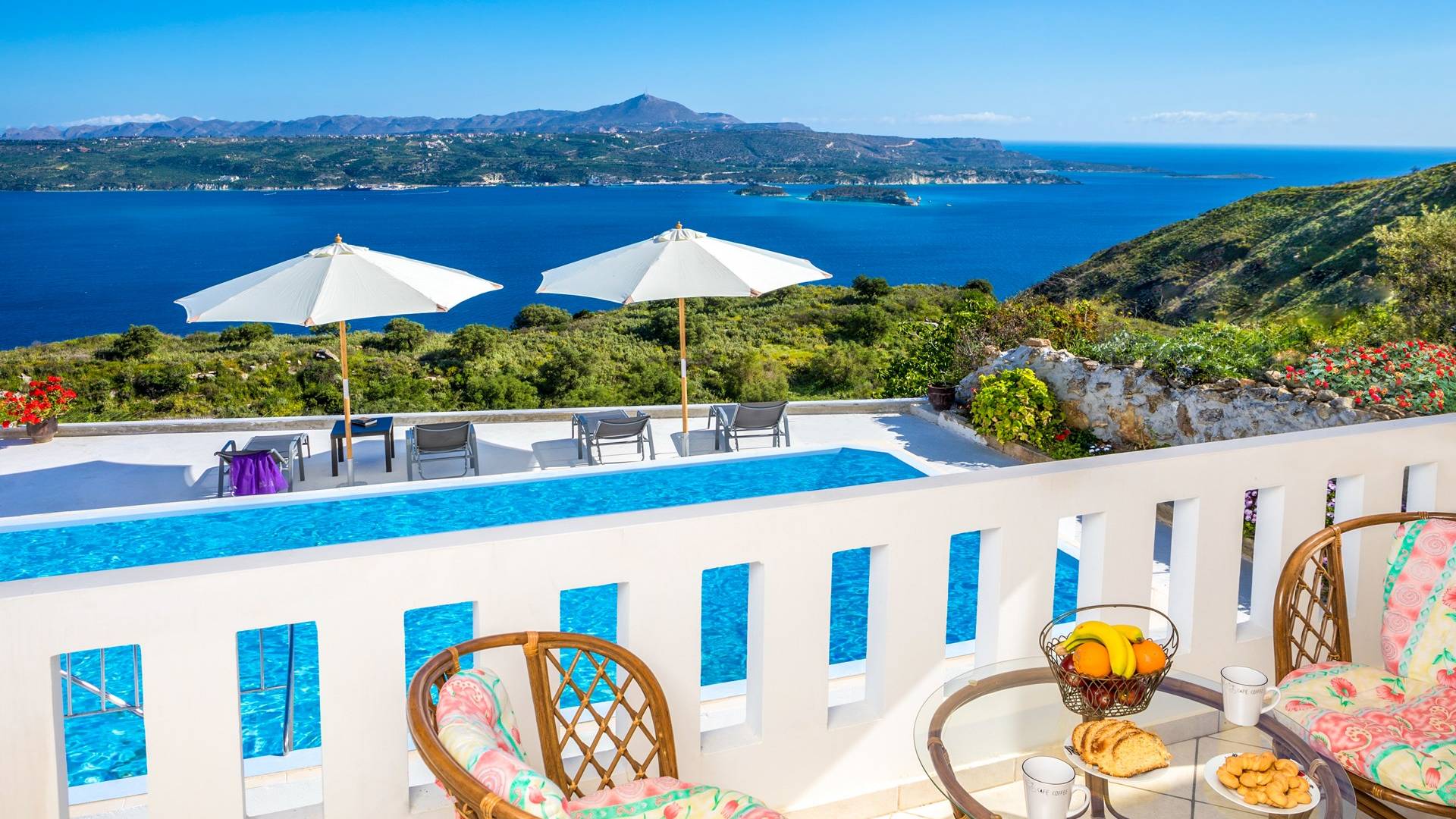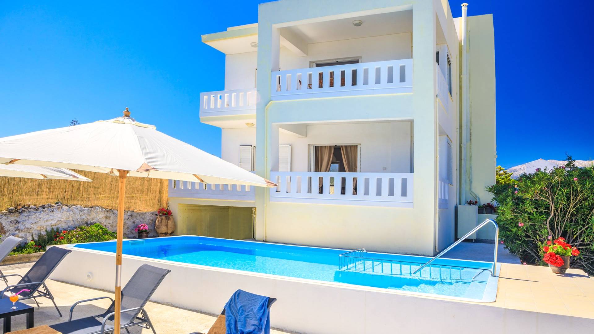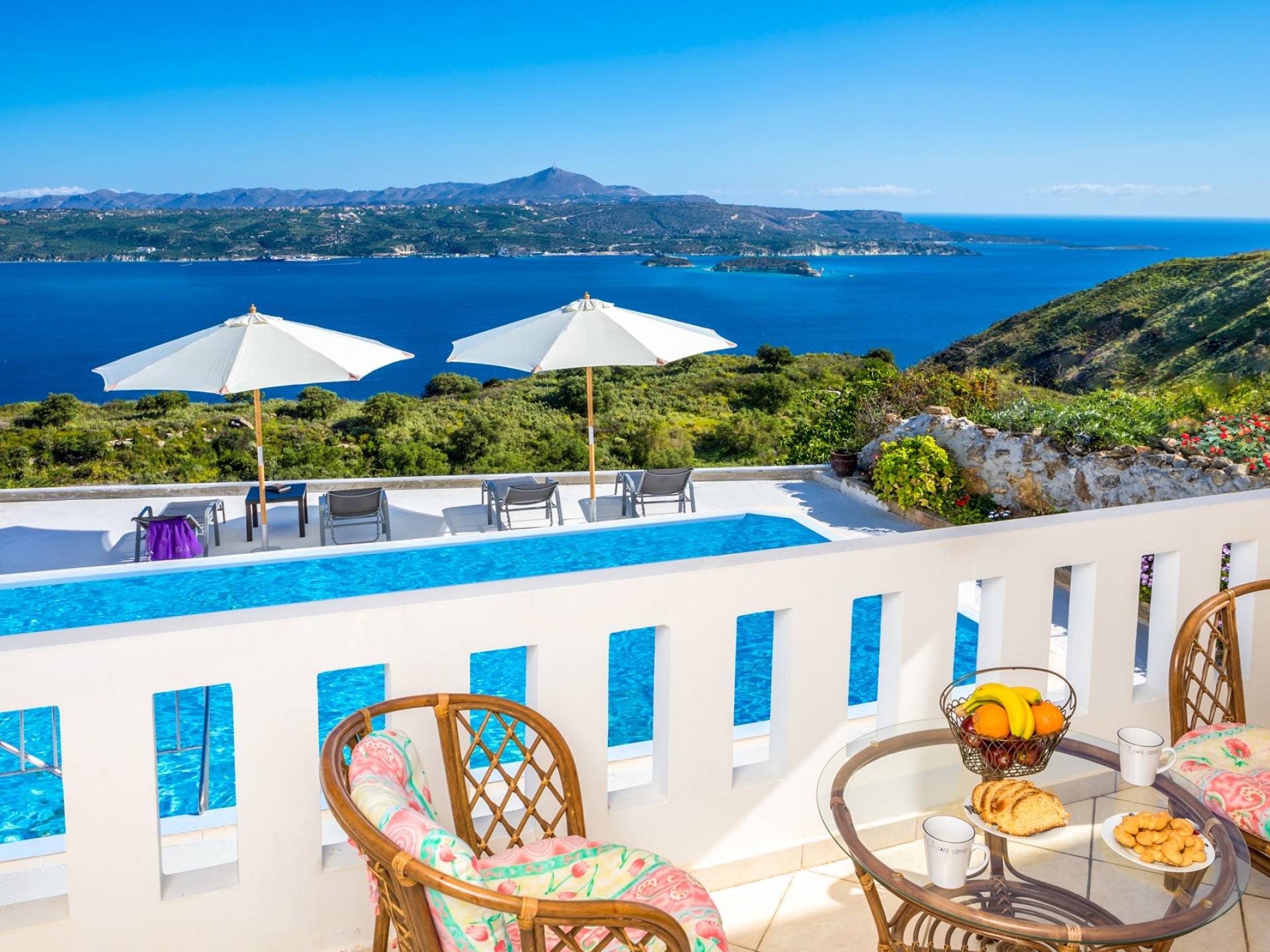 Η κουζίνα είναι πλήρως εξοπλισμένη με ψυγείο-καταψύκτη, ηλεκτρική κουζίνα πλήρους μεγέθους με εστίες φούρνου και απαραίτητα σκεύη. Σε κάθε διαμέρισμα, υπάρχουν δύο υπνοδωμάτια και ένα ευρύχωρο μπάνιο. Όλα τα υπνοδωμάτια είναι κλιματιζόμενα και έχουν πρόσβαση σε μπαλκόνια ή βεράντες. Η ιδιωτική πισίνα και η γύρω περιοχή απολαμβάνουν ιδιωτικότητα και εκπληκτική θέα στον κόλπο της Σούδας και στα βουνά.