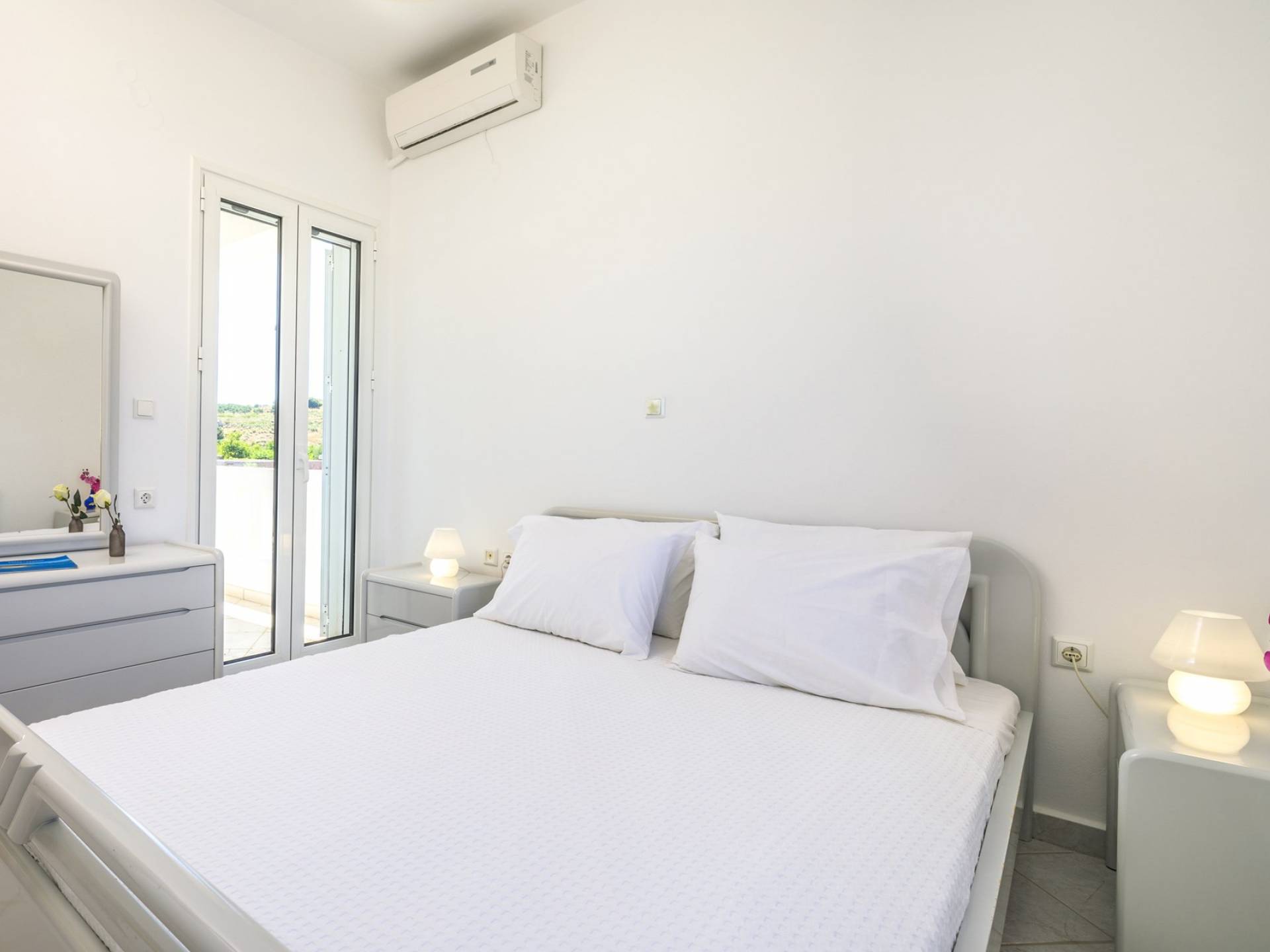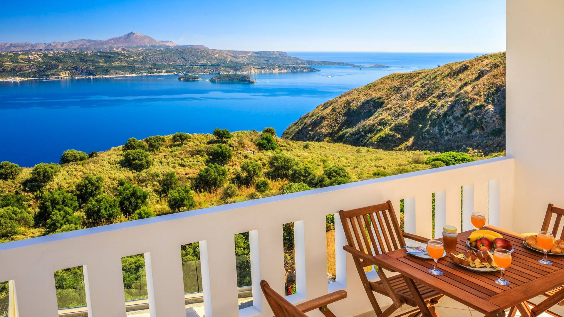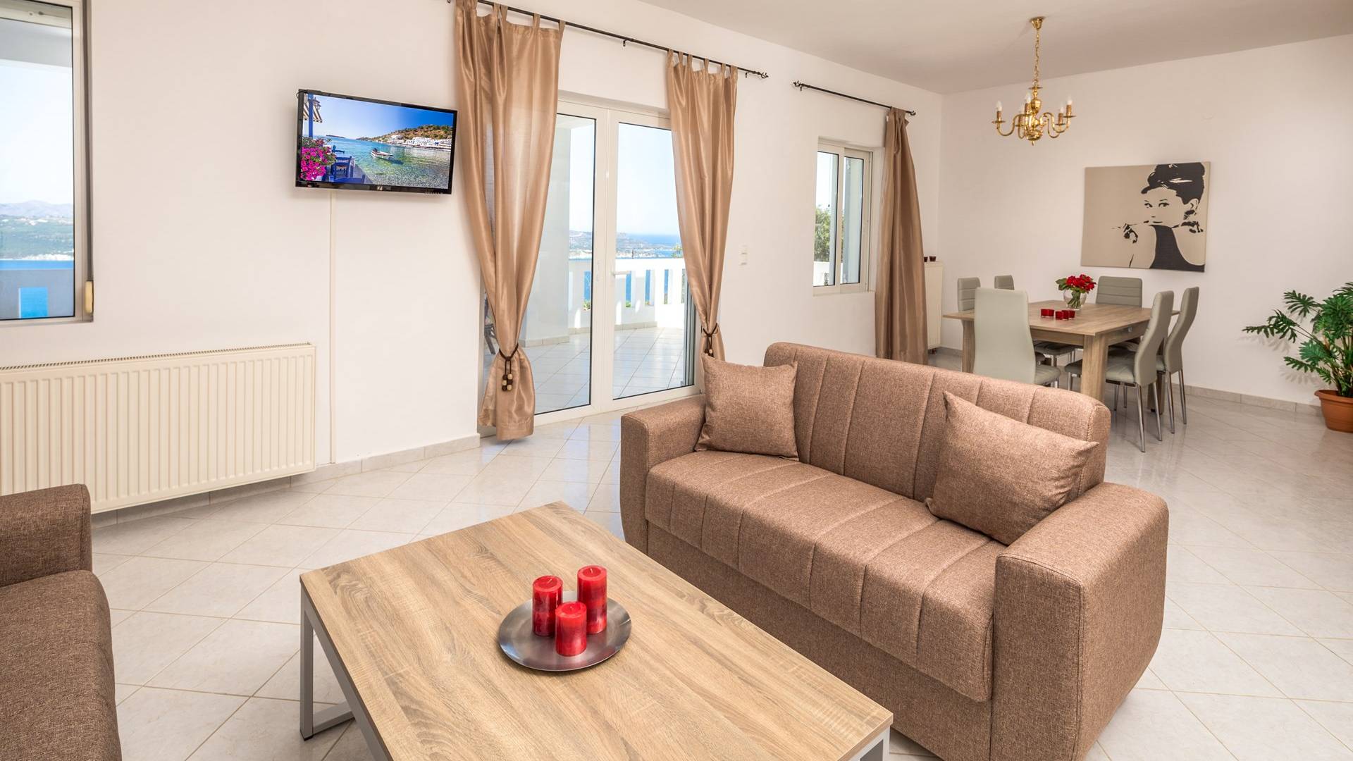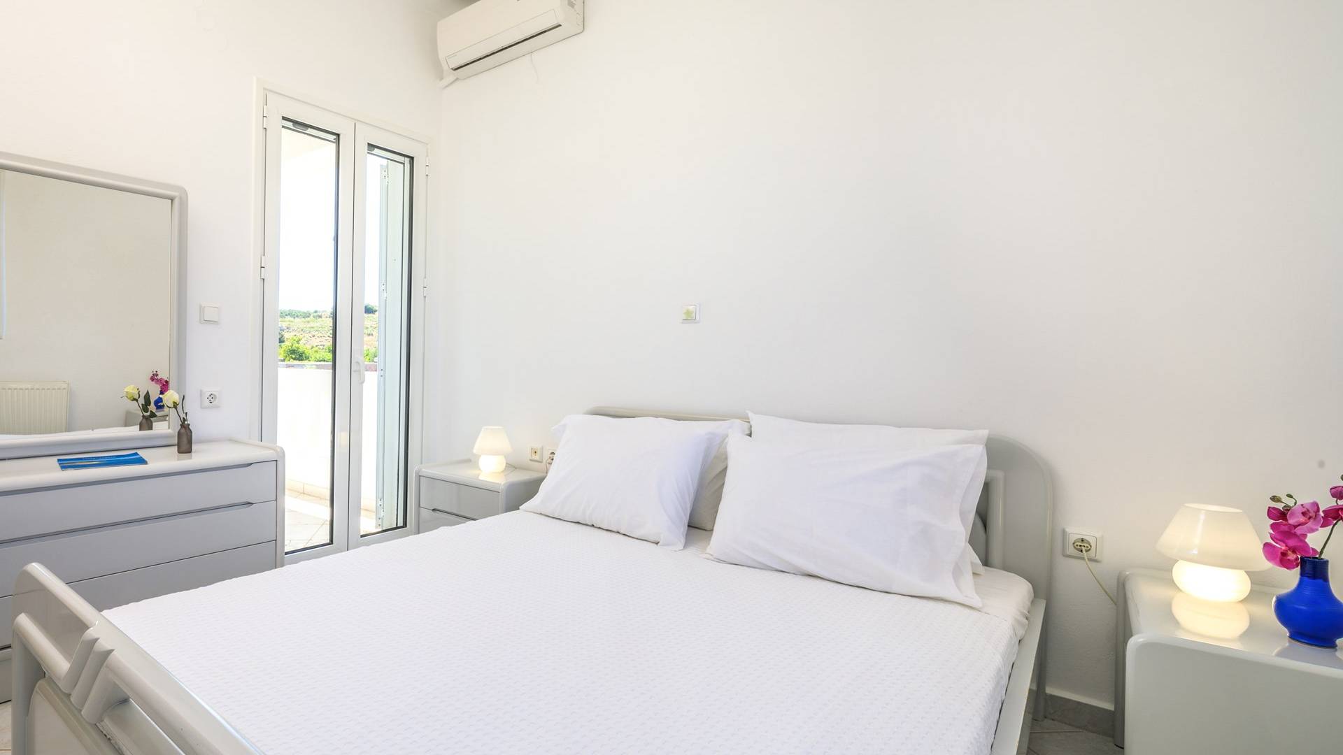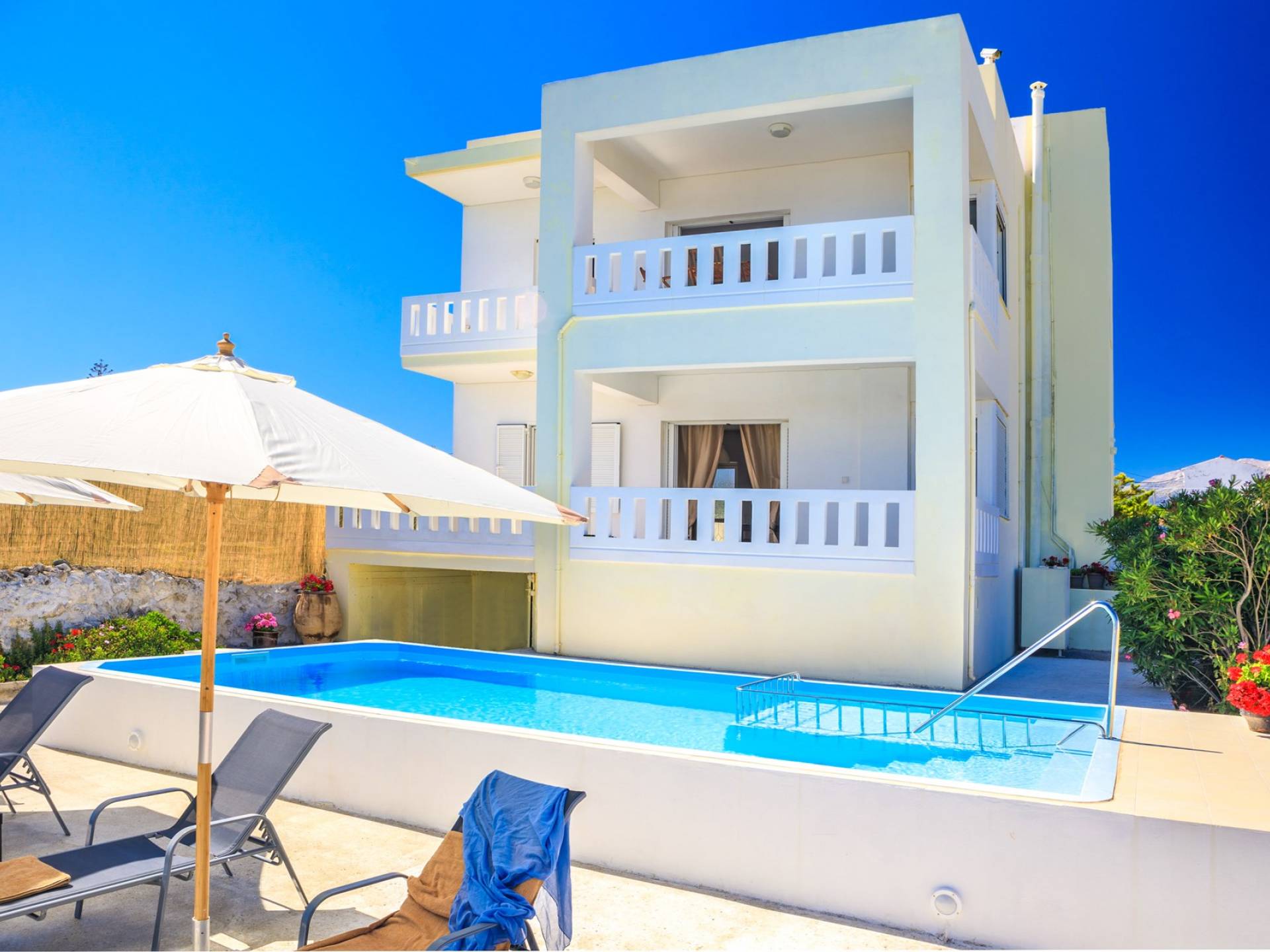 Η κουζίνα είναι πλήρως εξοπλισμένη με ψυγείο-καταψύκτη, ηλεκτρική κουζίνα πλήρους μεγέθους με εστίες φούρνου και απαραίτητα σκεύη. Σε κάθε διαμέρισμα, υπάρχουν δύο υπνοδωμάτια και ένα ευρύχωρο μπάνιο. Όλα τα υπνοδωμάτια είναι κλιματιζόμενα και έχουν πρόσβαση σε μπαλκόνια ή βεράντες. Η ιδιωτική πισίνα και η γύρω περιοχή απολαμβάνουν ιδιωτικότητα και εκπληκτική θέα στον κόλπο της Σούδας και στα βουνά.