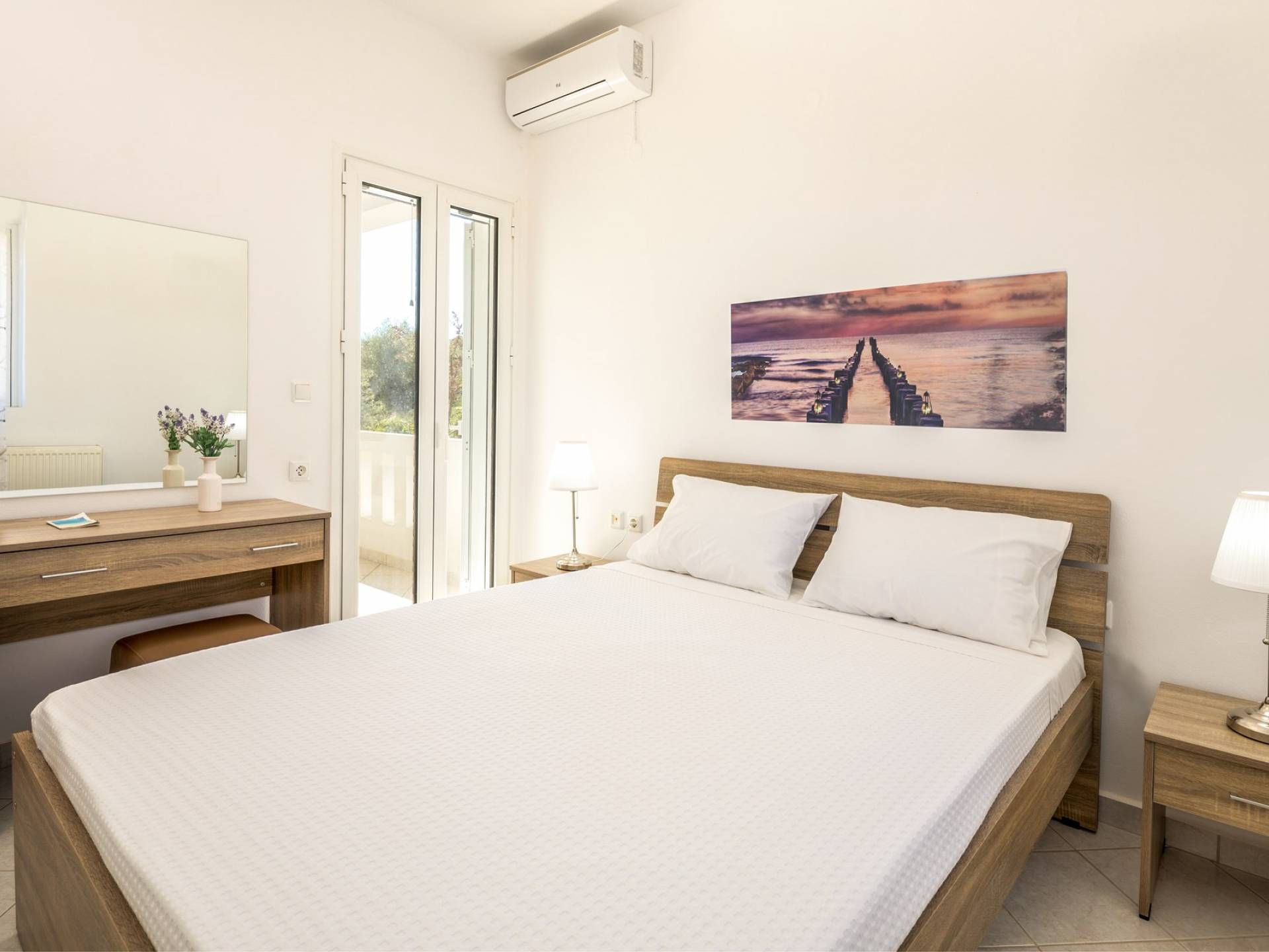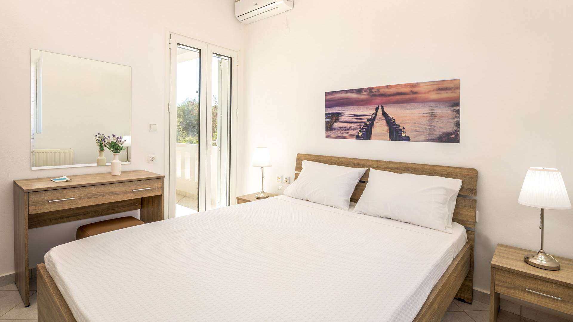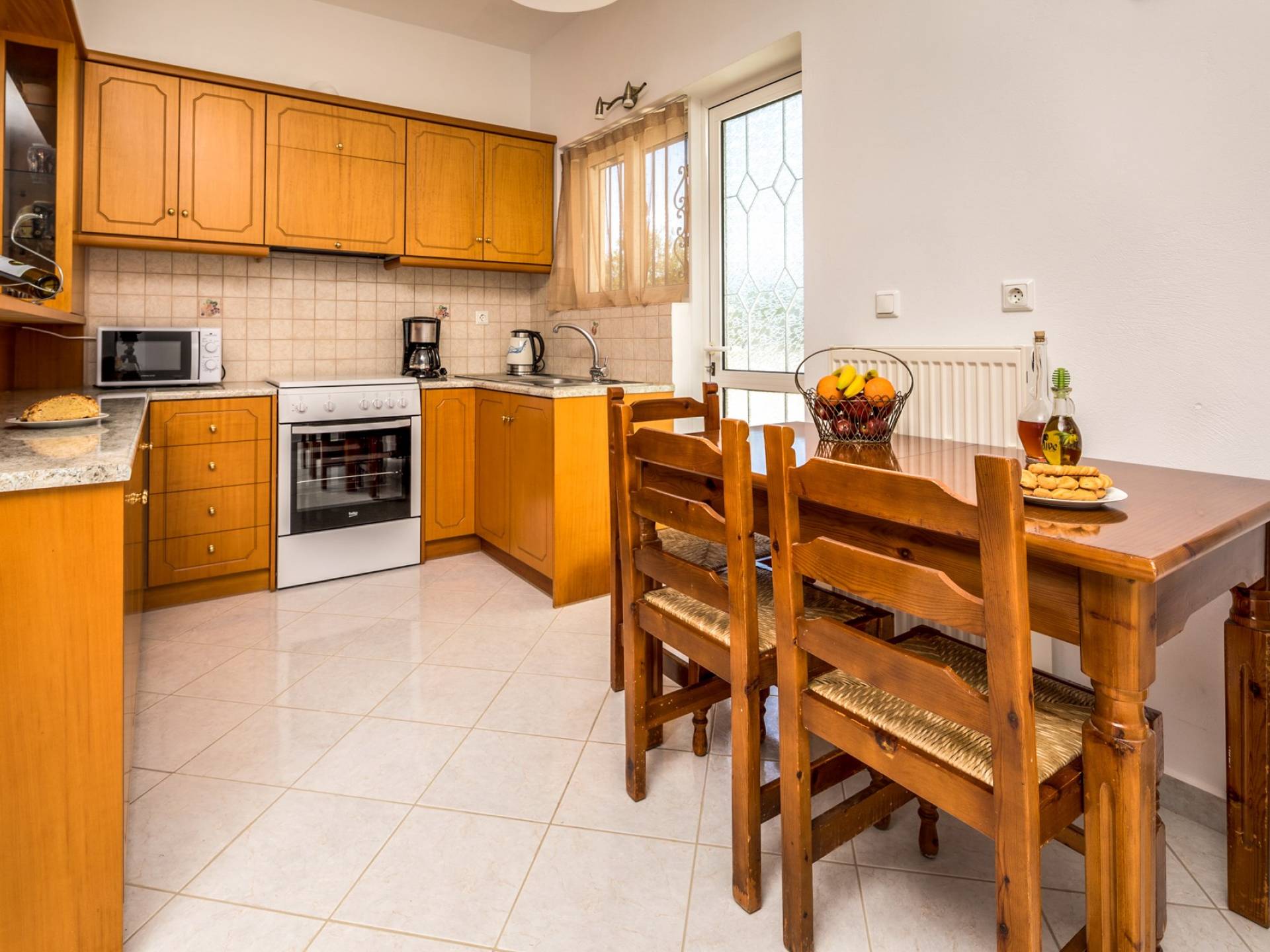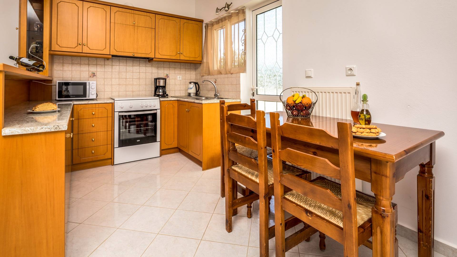 Η κουζίνα είναι πλήρως εξοπλισμένη με ψυγείο-καταψύκτη, ηλεκτρική κουζίνα πλήρους μεγέθους με εστίες φούρνου και απαραίτητα σκεύη. Σε κάθε διαμέρισμα, υπάρχουν δύο υπνοδωμάτια και ένα ευρύχωρο μπάνιο. Όλα τα υπνοδωμάτια είναι κλιματιζόμενα και έχουν πρόσβαση σε μπαλκόνια ή βεράντες. Η ιδιωτική πισίνα και η γύρω περιοχή απολαμβάνουν ιδιωτικότητα και εκπληκτική θέα στον κόλπο της Σούδας και στα βουνά.