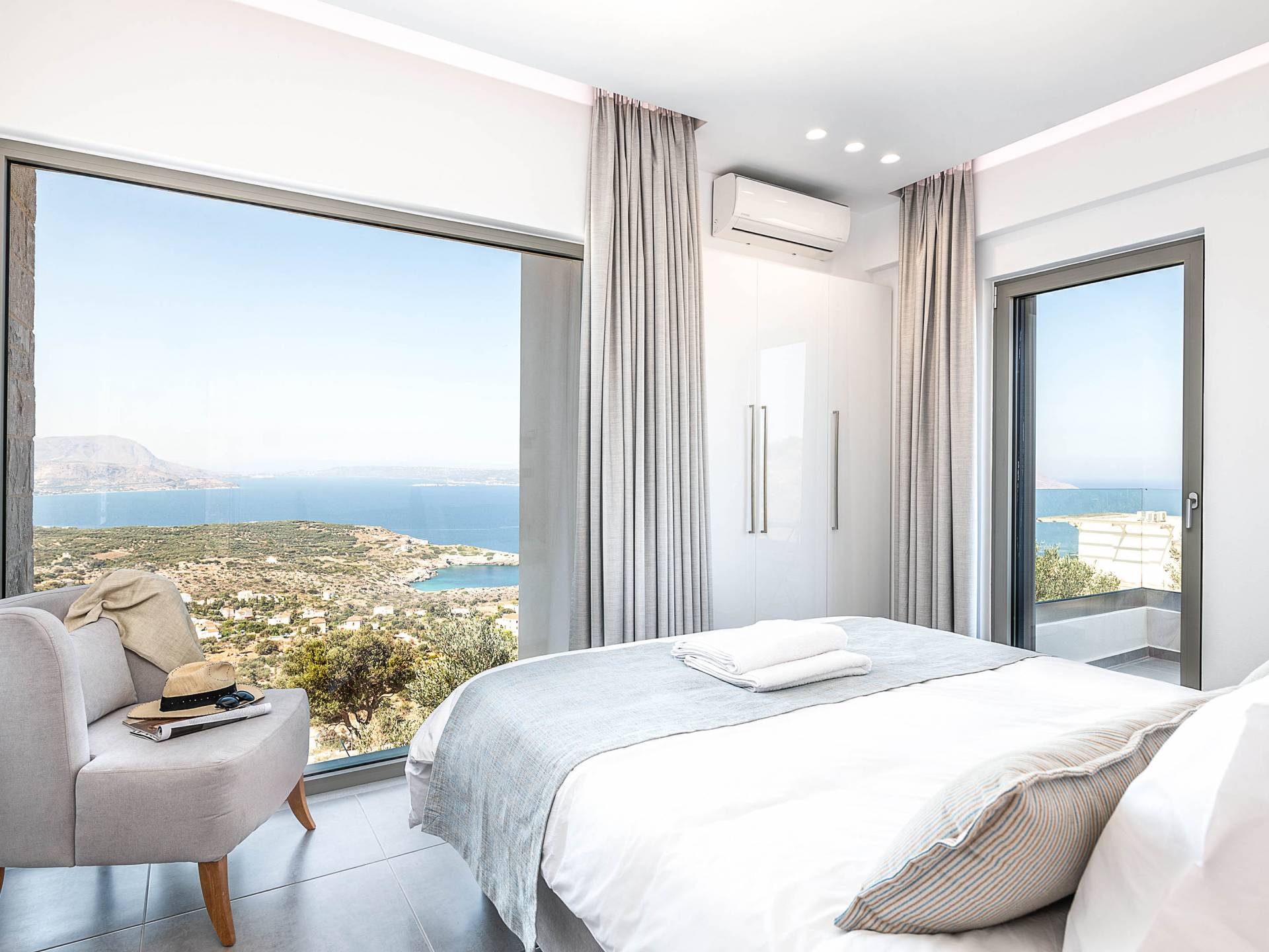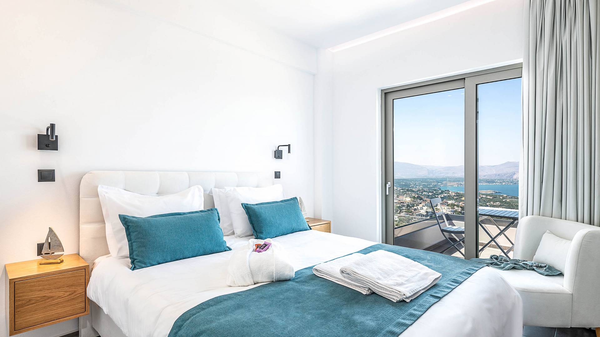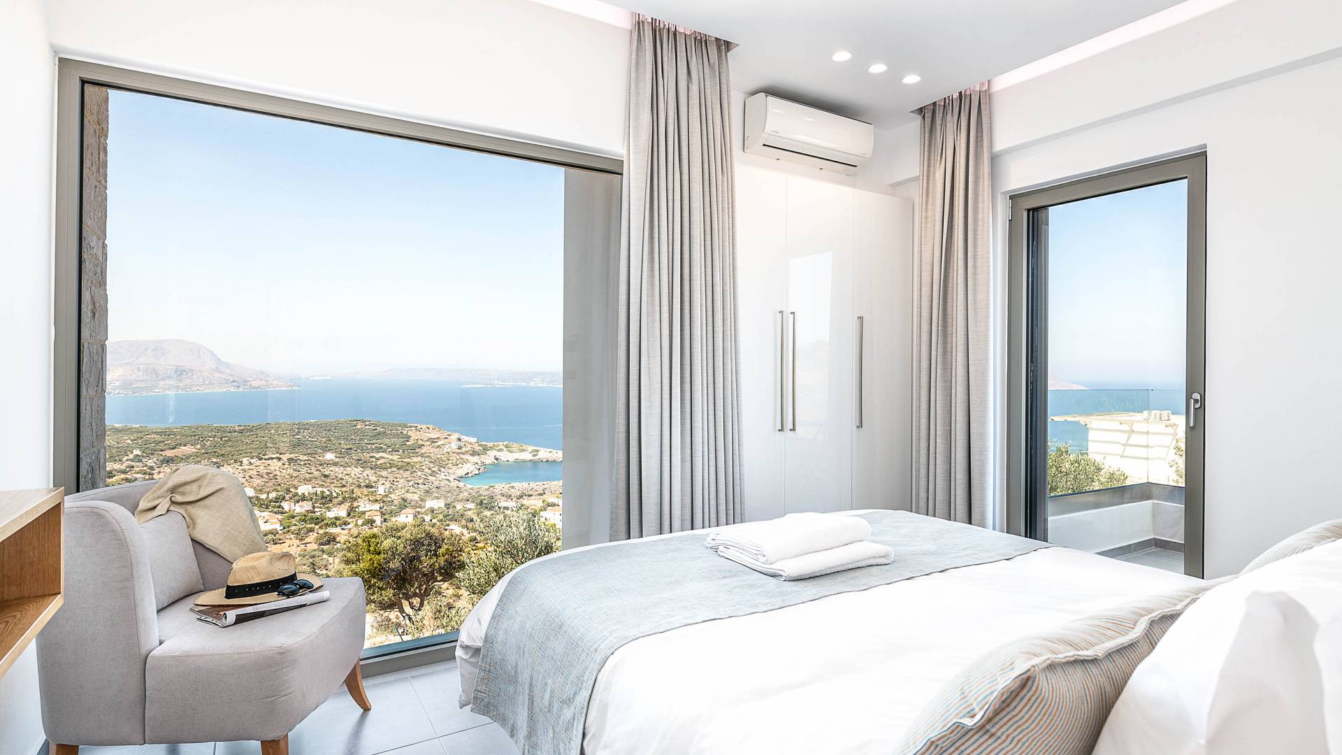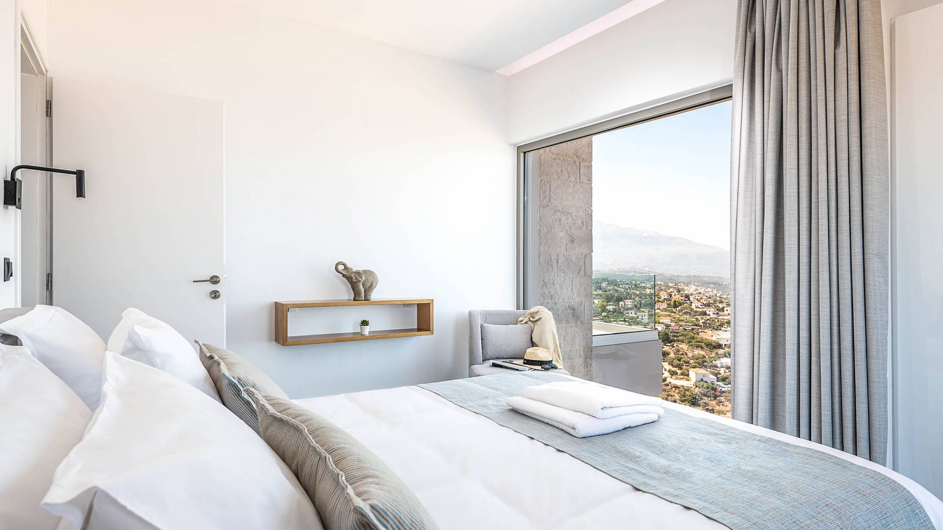 Designed to evoke a sense of comfort and luxury, Villa Ore Crete features 122 square meters of beautifully appointed living space. The villa boasts three elegant bedrooms, each furnished with a double bed and accompanied by an individual en-suite bathroom, ensuring privacy and comfort for all guests. From each bedroom, enjoy breathtaking panoramic views of Souda Bay, the charming Apokoronas villages, and the majestic White Mountains – a perfect blend of sea, village life, and nature.