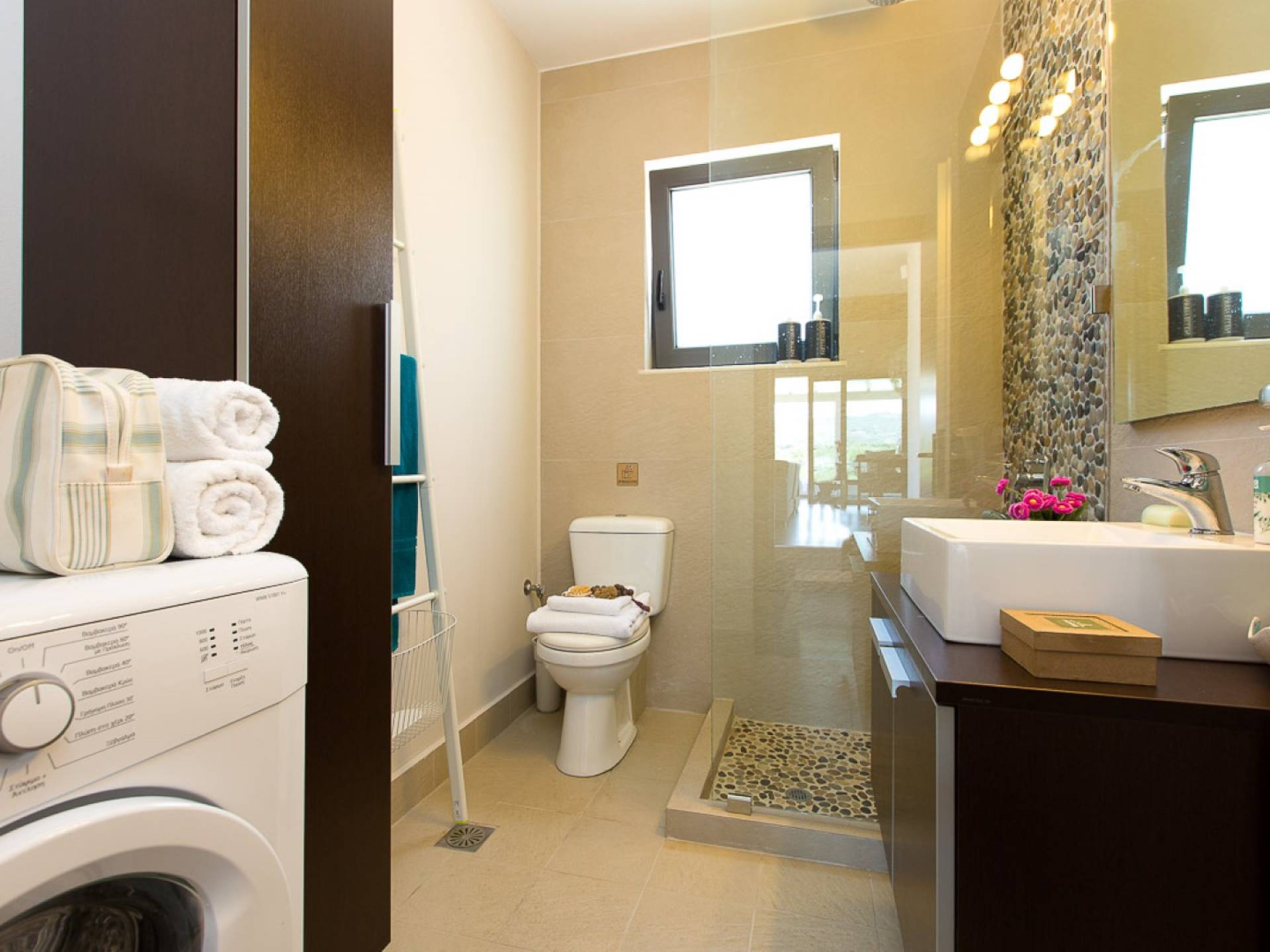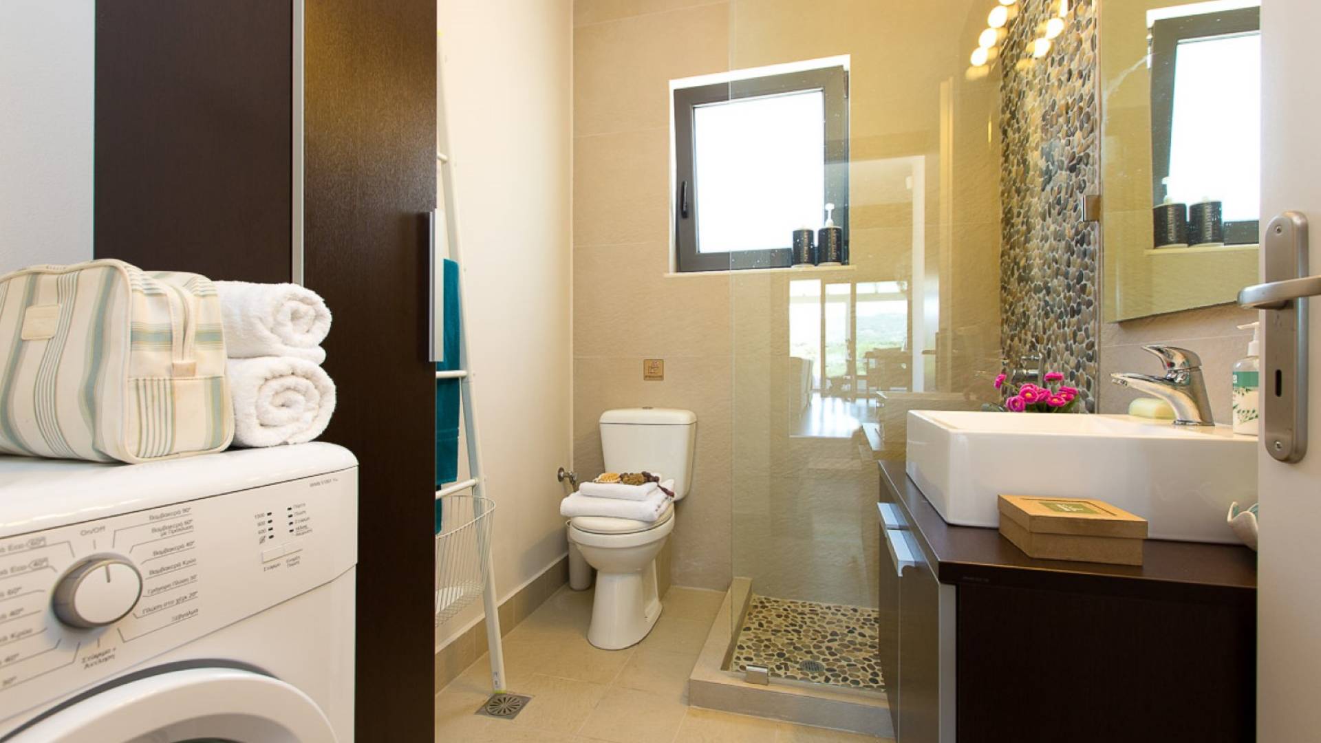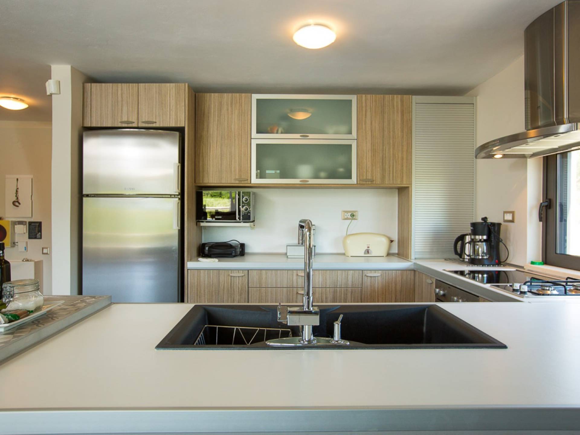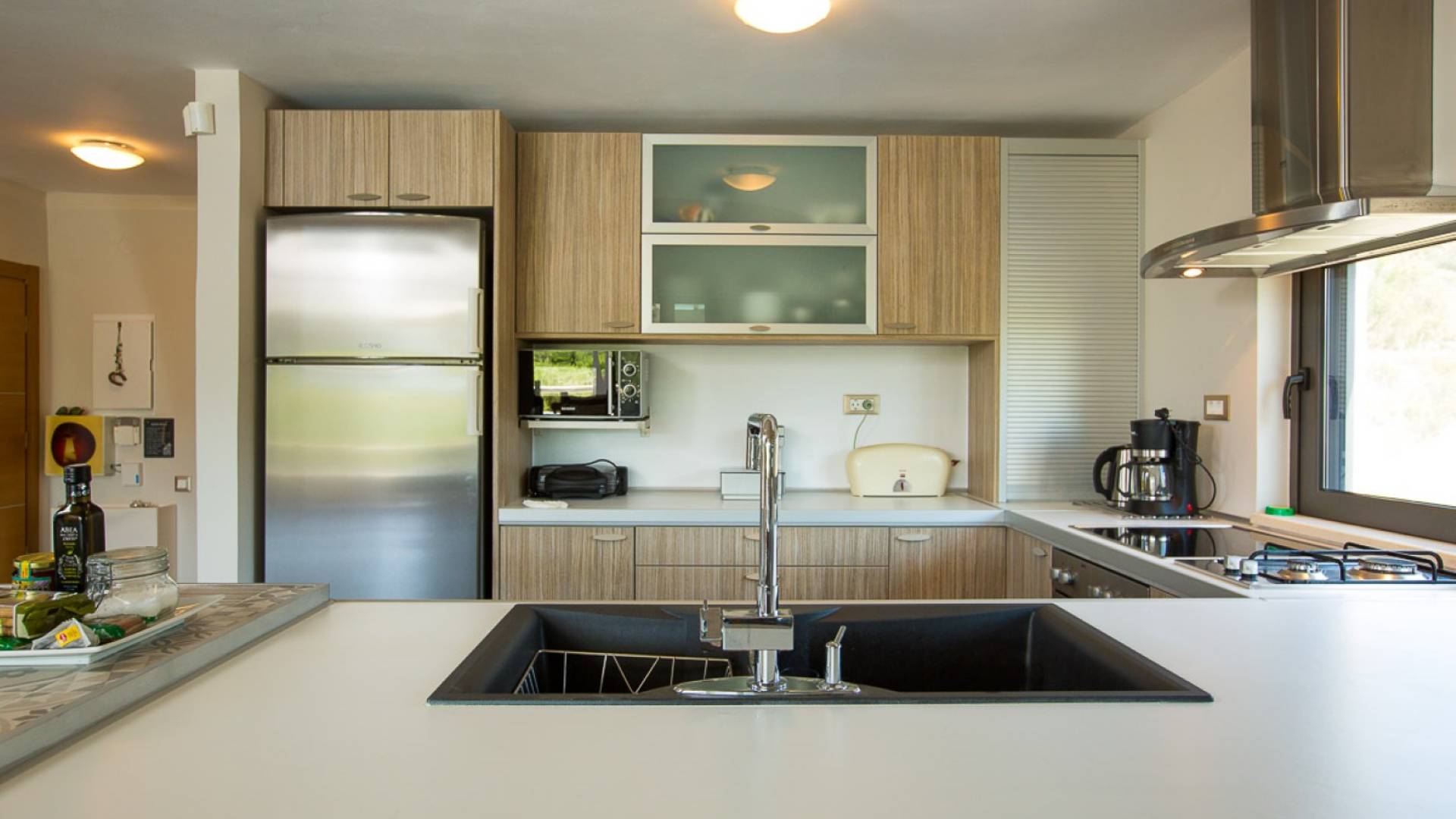 Μπαίνοντας στη βίλα στο ισόγειο υπάρχει ένας ευρύχωρος χώρος ενιαίας διαρρύθμισης που αποτελείται από σαλόνι με τζάκι και δορυφορική τηλεόραση HDTV με το Nintendo Wii, την εσωτερική τραπεζαρία και μια πλήρως εξοπλισμένη κουζίνα εξοπλισμού και συσκευών κορυφαίας ποιότητας. Από το σαλόνι υπάρχει άμεση πρόσβαση στην κεντρική βεράντα, στην πισίνα και στον κήπο. Στο ισόγειο υπάρχει ένα υπνοδωμάτιο με δύο μονά κρεβάτια που μπορούν επίσης να διαμορφωθούν ως ένα διπλό και ένα μπάνιο με ντους και πλυντήριο.