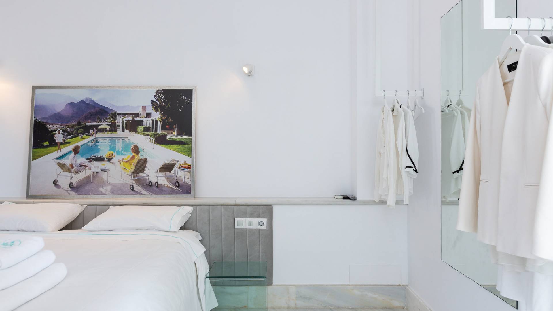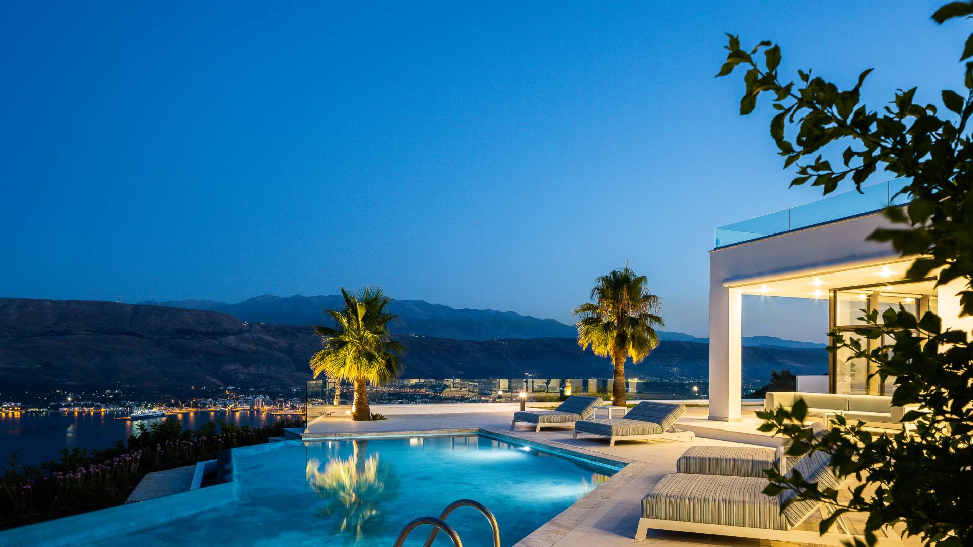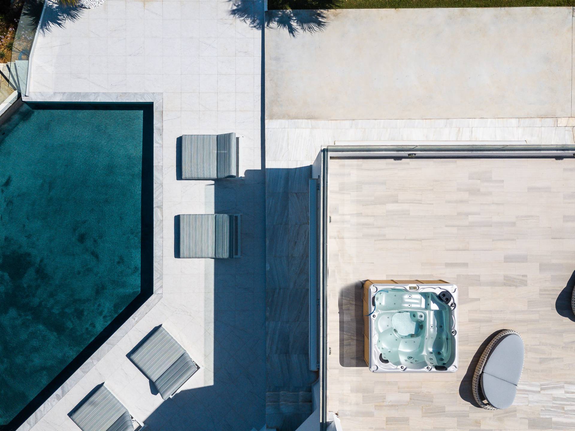 Floor-to-ceiling windows opening to the pool terrace, with blackout rollers for shade