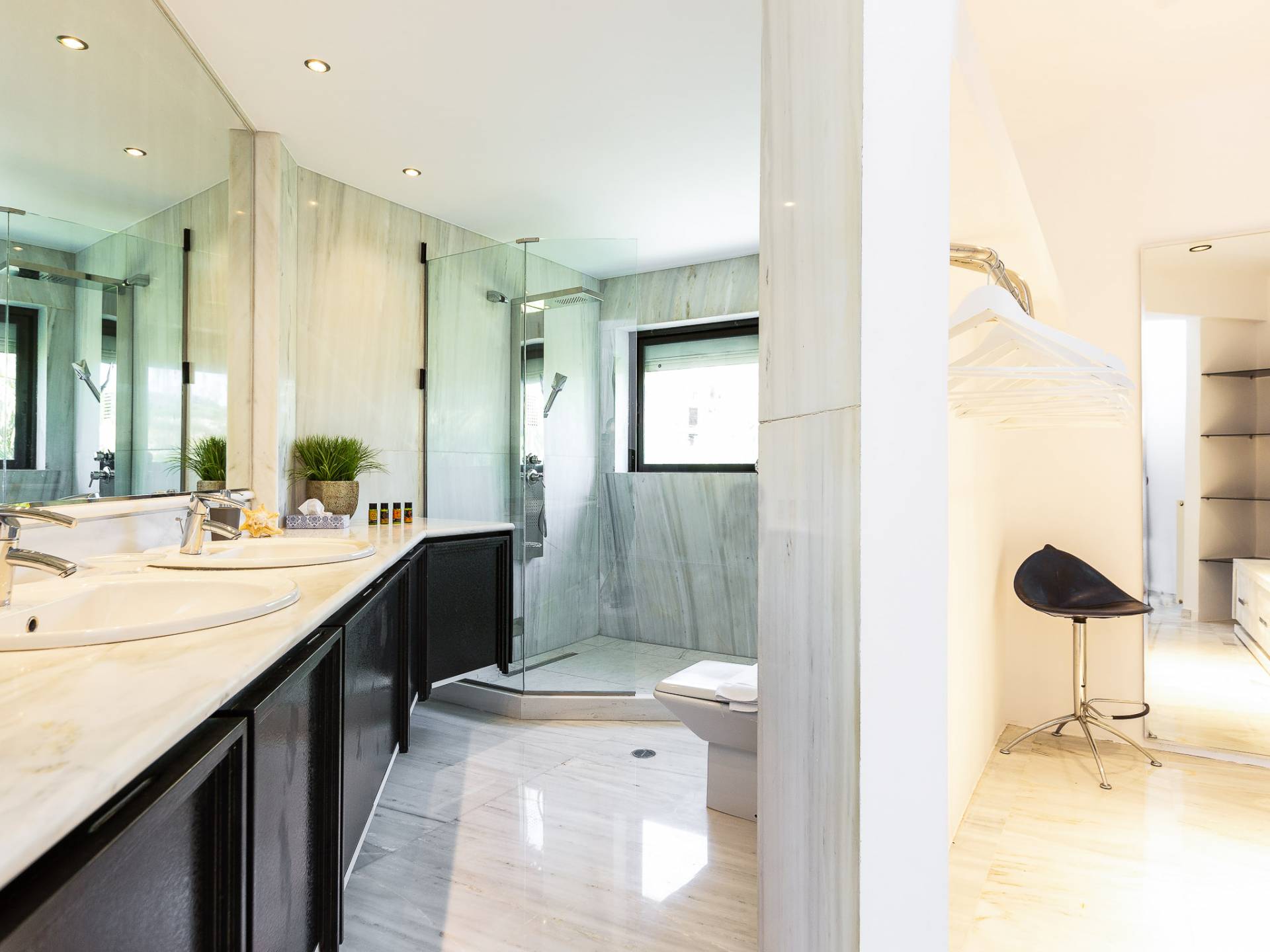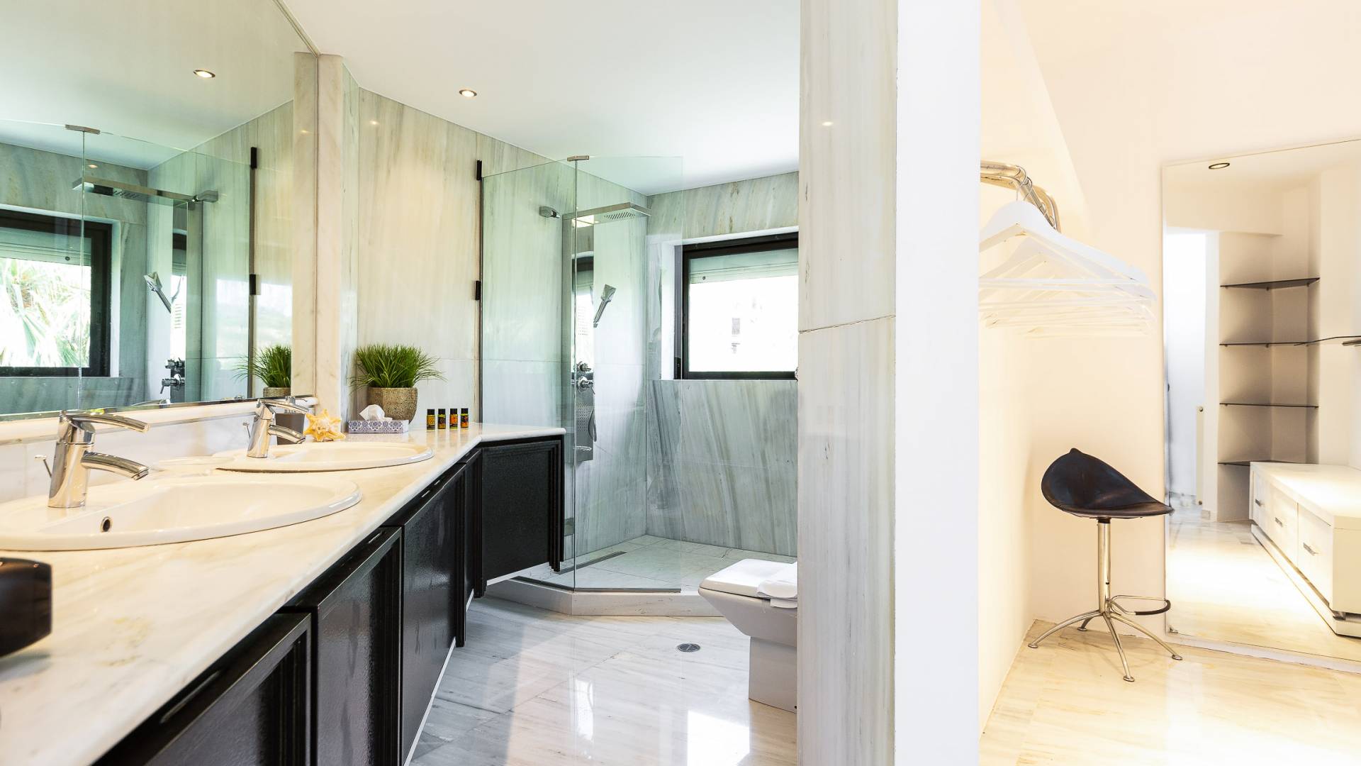 Master suite (30 m²) with walk-in closet, sofa, 50” HDTV, and luxurious bathroom with double sinks and hydromassage shower