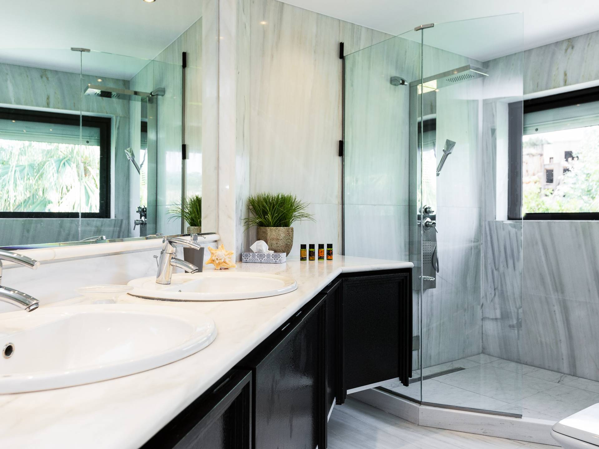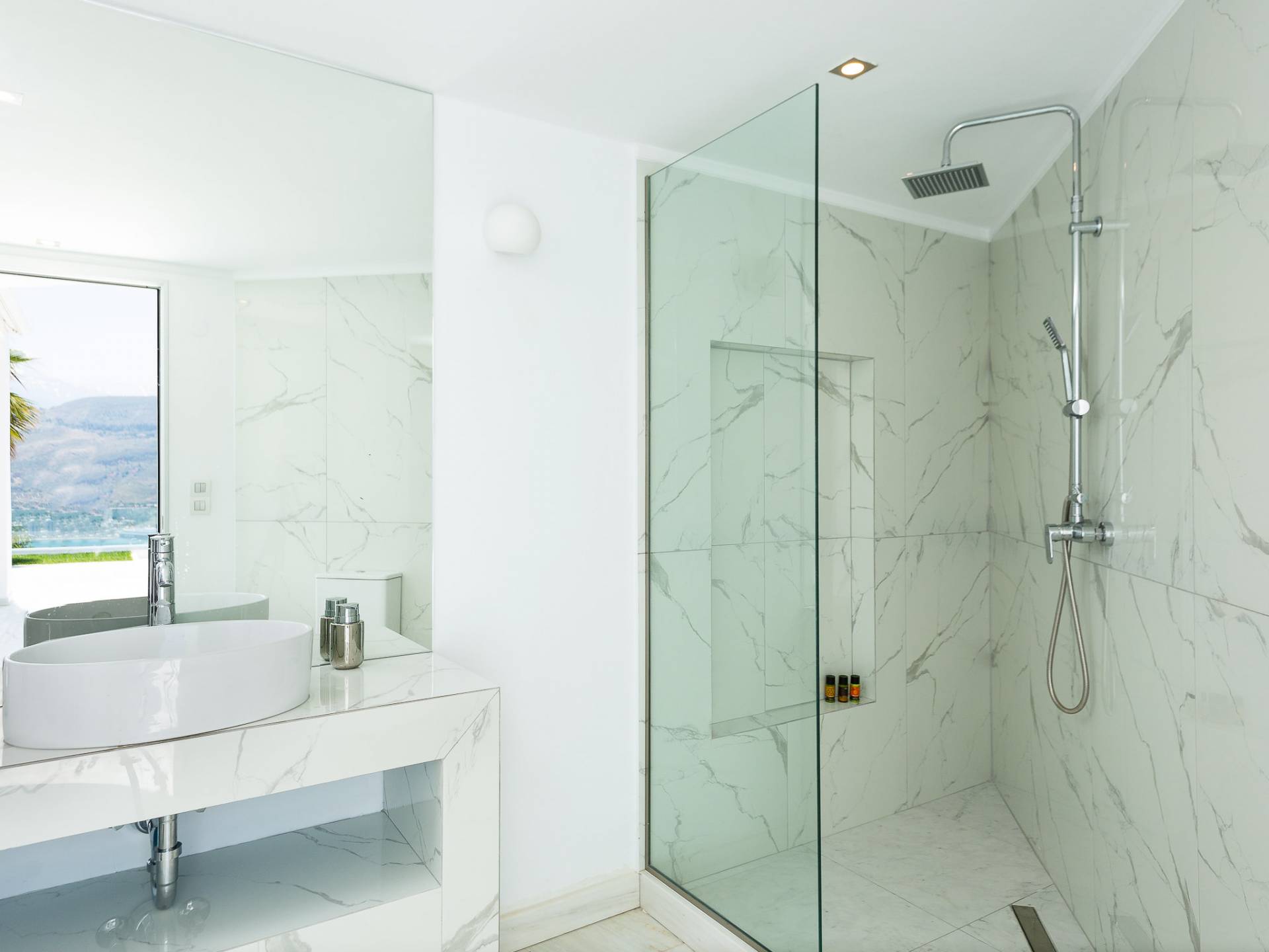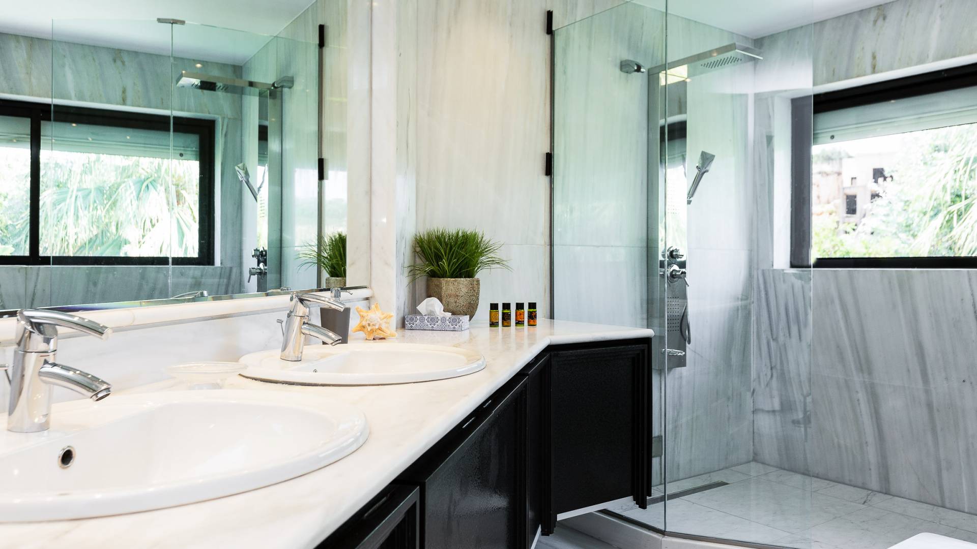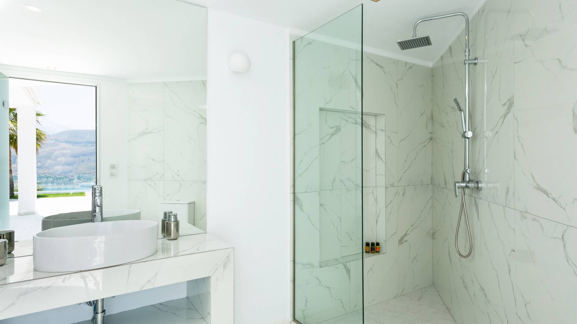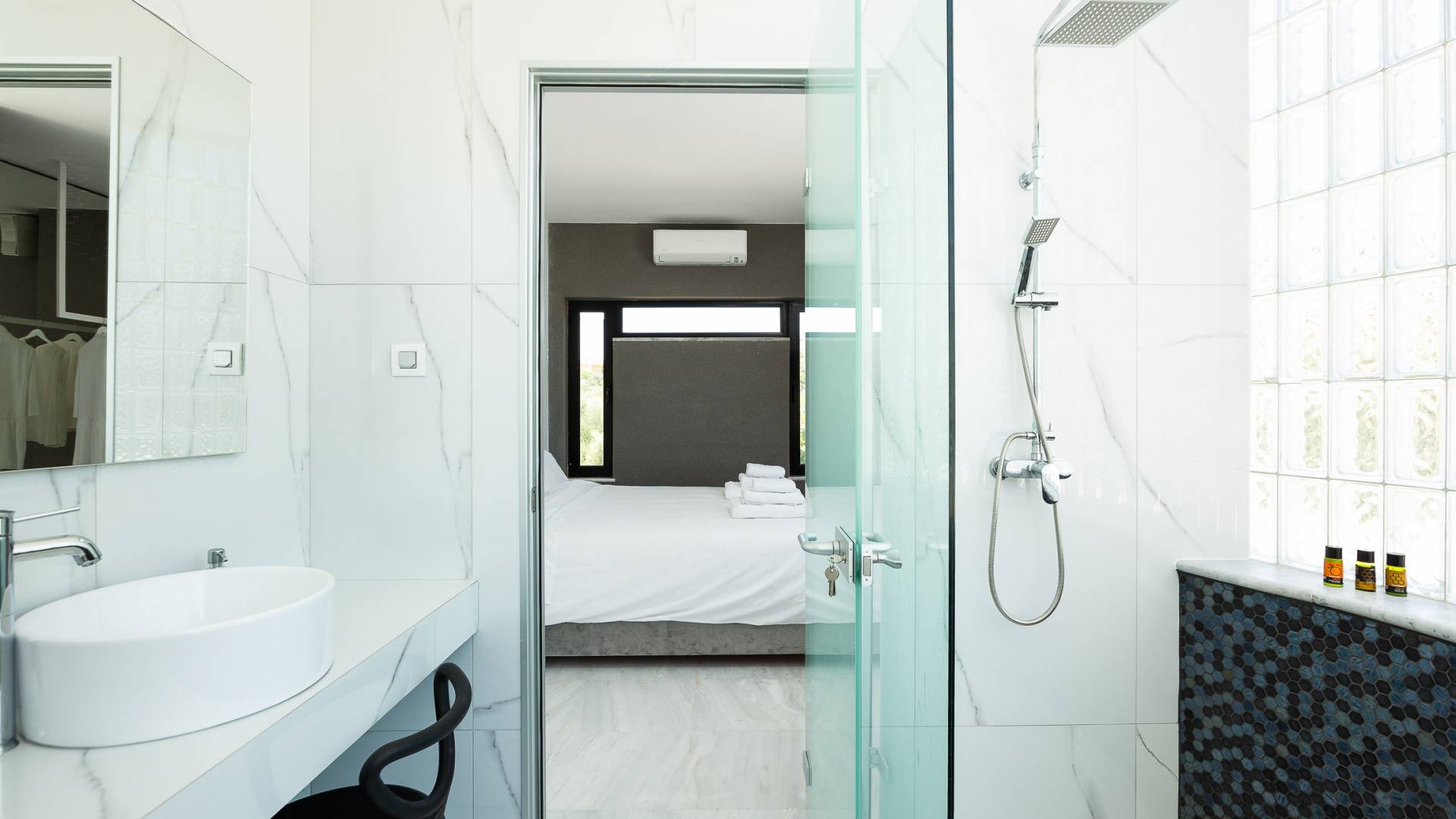 En-suite bathroom with shower, plus 2 additional bathrooms (one with pool access)