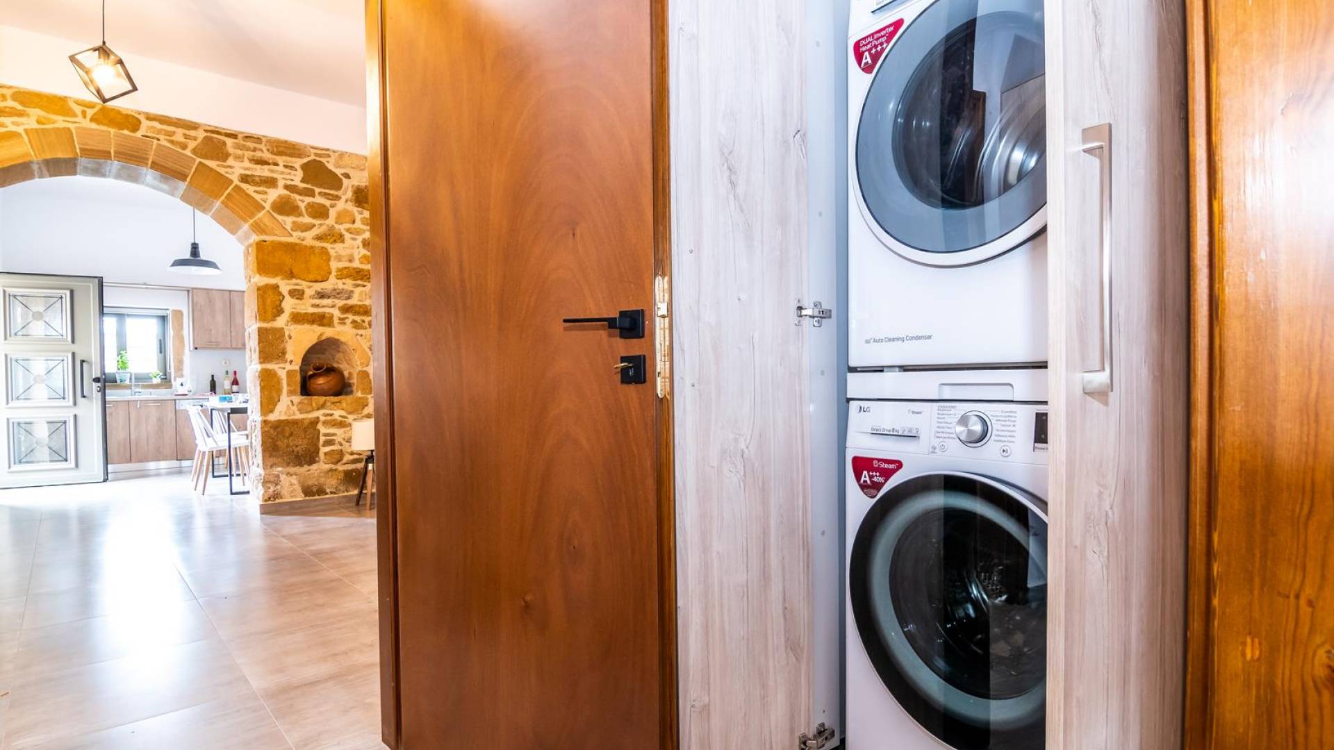 Το ένα μπάνιο έχει ντους και το άλλο μπανιέρα. Και τα δύο, εκτός από τα απαραίτητα, διαθέτουν επίσης θερμάστρες μπάνιου, ντους μπιντέ, μεγεθυντικούς καθρέφτες και πιστολάκι μαλλιών. Το σαλόνι είναι ευρύχωρο με έναν άνετο μεγάλο καναπέ σε σχήμα L που μπορεί να μετατραπεί σε δύο μονά κρεβάτια, μια επίπεδη τηλεόραση smart 55 ιντσών με πρόσβαση στο internet και τρεις δορυφορικές επιλογές και μια ανεξάρτητη μονάδα κλιματισμού. Η κουζίνα είναι επιπλωμένη με εξαθέσιο τραπέζι και καλά εξοπλισμένη με διπλό νεροχύτη, φούρνο, τέσσερις εστίες φούρνου, φούρνο μικροκυμάτων, πλυντήριο πιάτων, διπλό ψυγείο με επιλογές νερού και παγοκύβων, καθώς και πολλές άλλες συσκευές . Επιπλέον, η κύρια κατασκευή προσφέρει έναν μικρό βοηθητικό χώρο με πλυντήριο ρούχων (8 κιλά) και στεγνωτήριο ρούχων (8 κιλά).