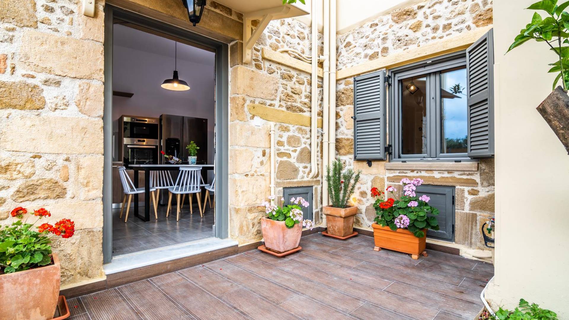 Έξω, στο χώρο μεταξύ των δύο κατασκευών, υπάρχει χώρος μπάρμπεκιου με παροχή νερού και νεροχύτη, ένα μεγάλο ξύλινο τραπέζι με 8 θέσεις, μια θερμαινόμενη πισίνα 30 τμ (η χρήση της θερμαινόμενης λειτουργίας παρέχεται με με επιπλέον χρέωση), τζακούζι, ομπρέλες και ξαπλώστρες. Στην είσοδο υπάρχουν επίσης 2 θέσεις στάθμευσης.