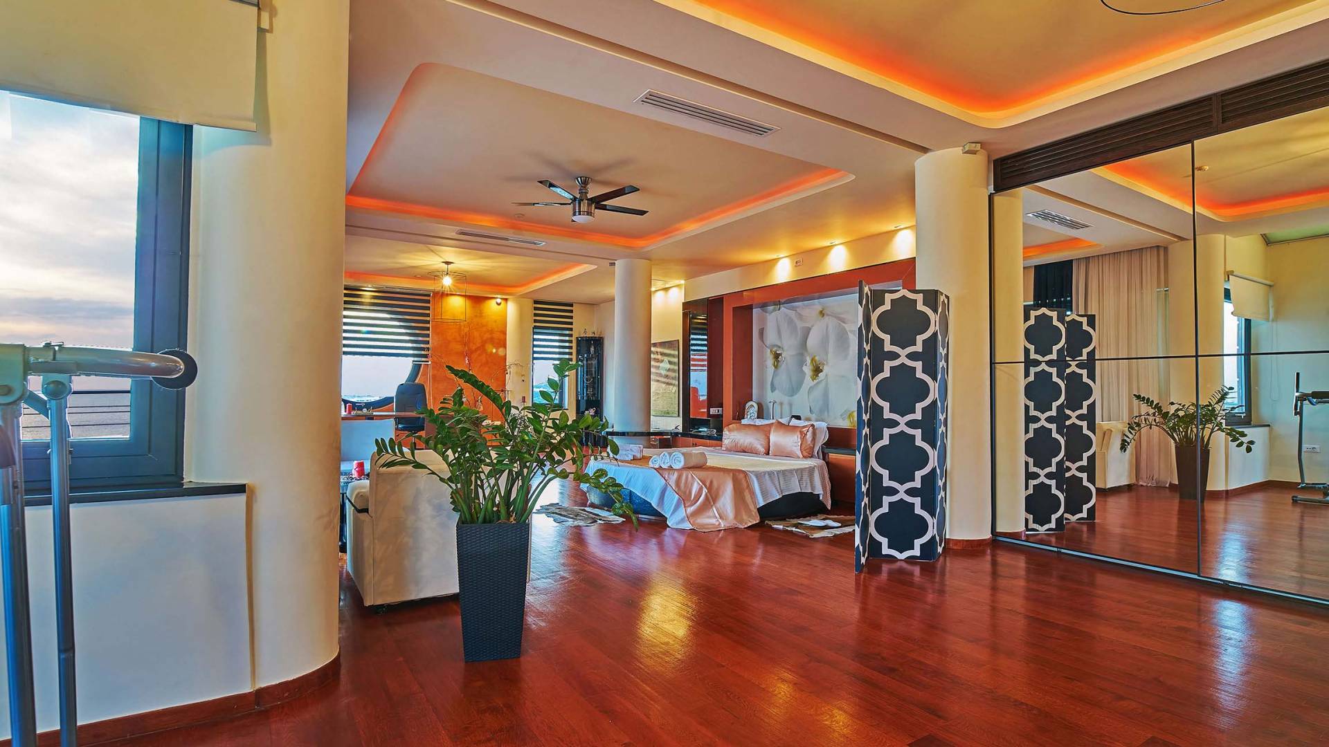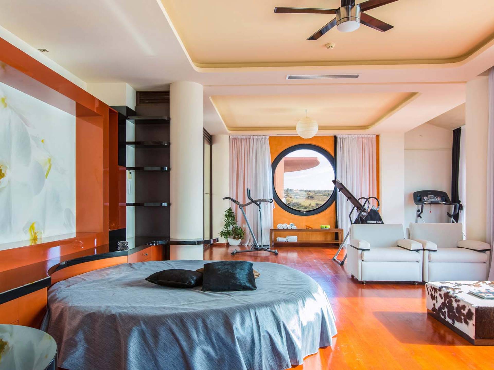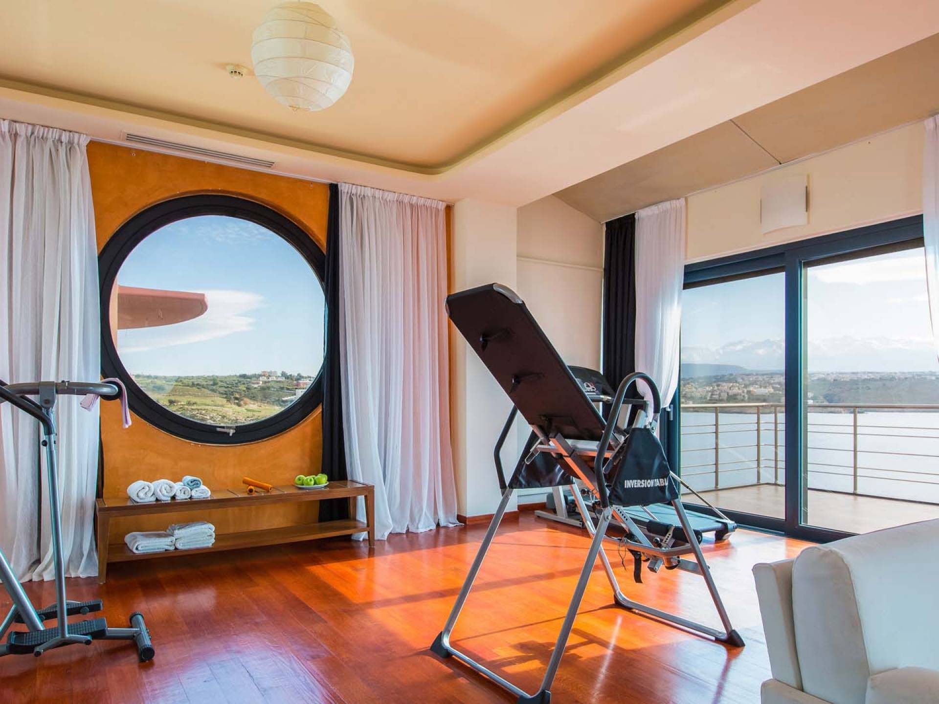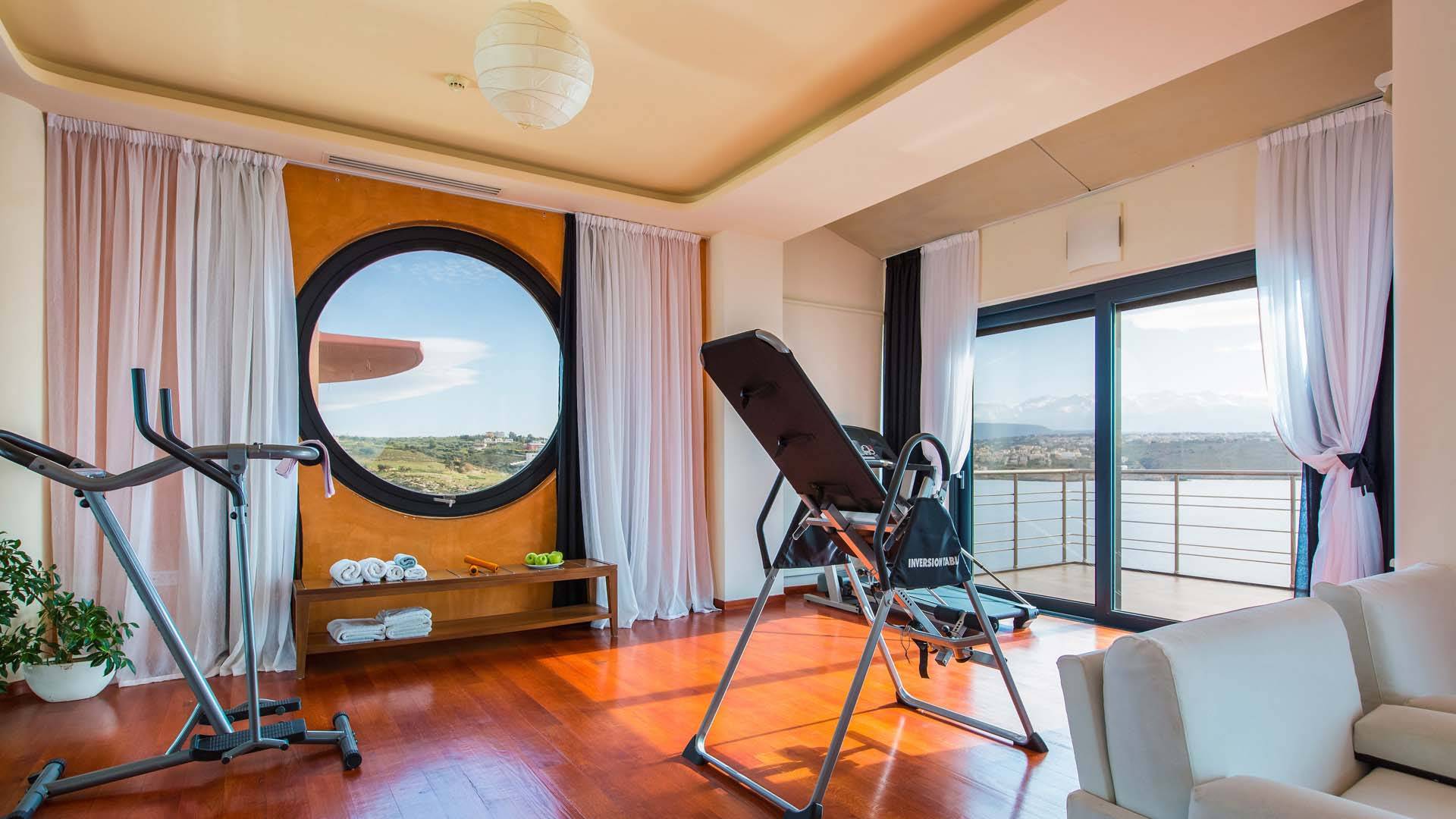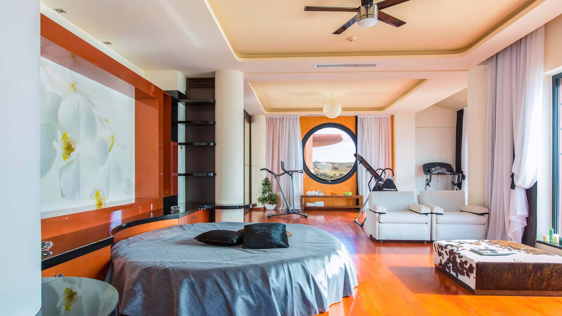 Δύο υπνοδωμάτια βρίσκονται στον πρώτο όροφο. Το ένα είναι το κύριο υπνοδωμάτιο 70 τ.μ. με διπλό κρεβάτι king-size, ενιαίο χώρο γυμναστηρίου με διάδρομο, ελλειπτικό μηχάνημα και εξοπλισμό κοιλιακών και ένα μικρό σαλόνι με καναπέ. Η κύρια κρεβατοκάμαρα έχει επίσης ένα τεράστιο ιδιωτικό μπάνιο 50 τ.μ. που περιλαμβάνει τζακούζι για 3 άτομα και καμπίνα ντους. Το τζακούζι προσφέρει μια μαγευτική πανοραμική θέα στη θάλασσα και είναι το τέλειο σημείο για να χαλαρώσετε το σώμα και το μυαλό. Αυτό το υπνοδωμάτιο έχει επίσης έξοδο στην τεράστια επιπλωμένη βεράντα και η θέα στο ηλιοβασίλεμα από εκεί είναι πραγματικά πέρα από κάθε περιγραφή. Το άλλο υπνοδωμάτιο σε αυτόν τον όροφο έχει 2 μονά κρεβάτια (τα μονά κρεβάτια σε αυτό το υπνοδωμάτιο μπορούν επίσης να διαμορφωθούν ως διπλά) με ιδιωτικό μπάνιο και ντους.