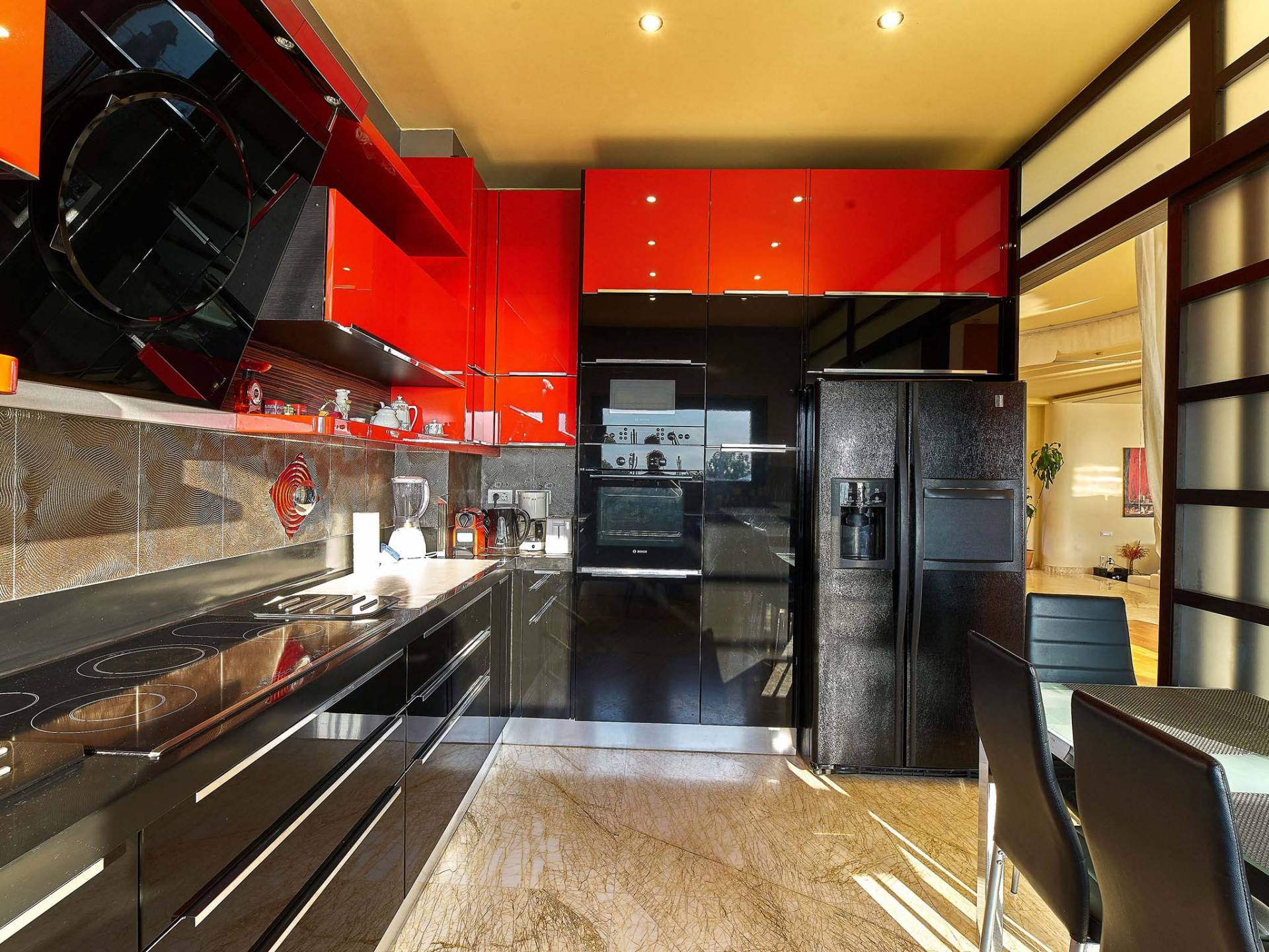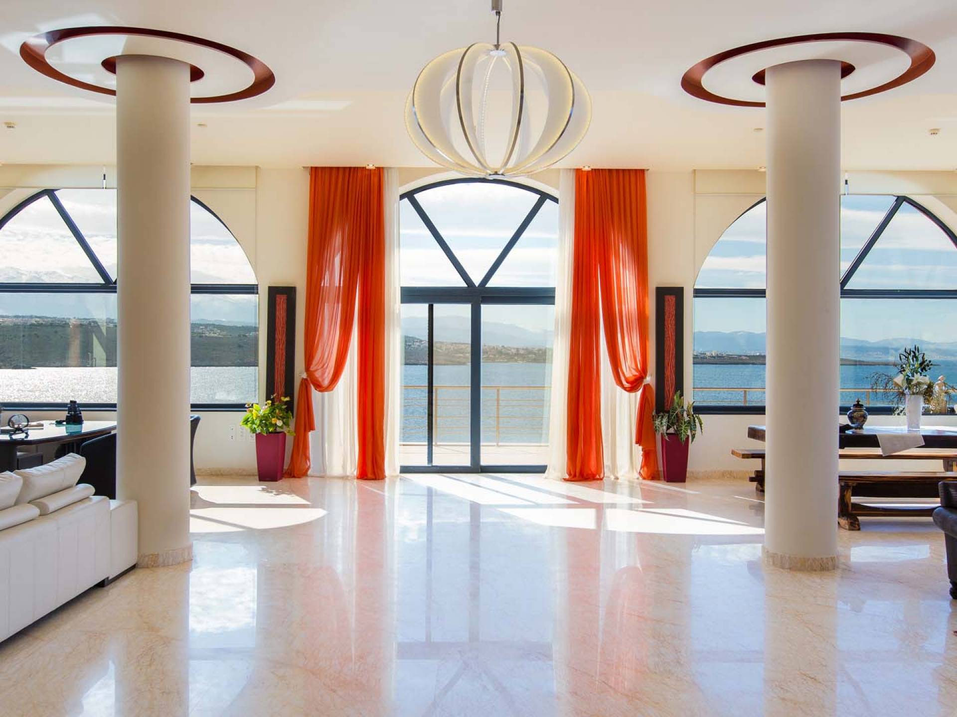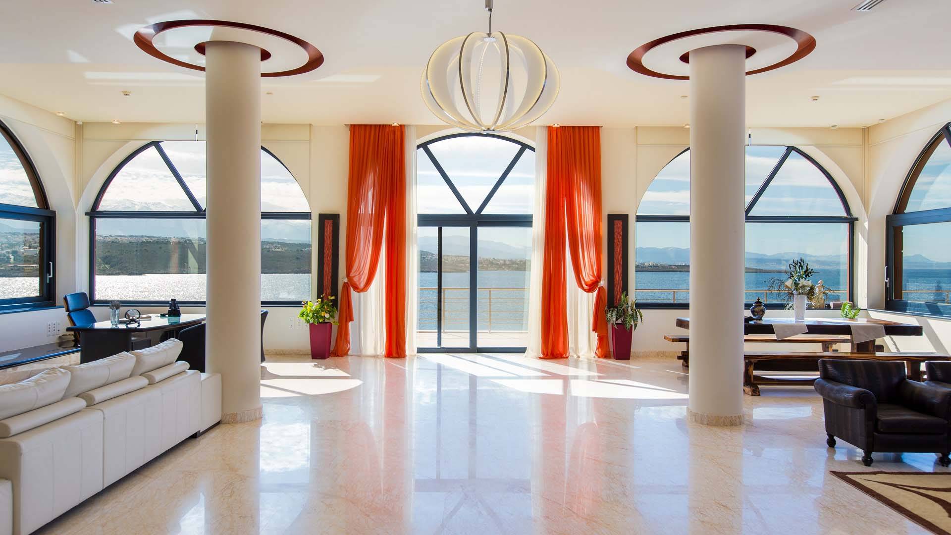 Μπαίνοντας στη βίλα στο ισόγειο υπάρχει ένας ενιαίος χώρος 200 τετραγωνικών μέτρων που αποτελείται από σαλόνι με τζάκι, δορυφορική τηλεόραση HD 50 ιντσών, χώρο γραφείου με εκτυπωτή, εσωτερική τραπεζαρία και πλήρως εξοπλισμένη κουζίνα κορυφαίας ποιότητας εξαρτήματα και συσκευές. Ο χώρος του σαλονιού έχει άμεση πρόσβαση στην κύρια βεράντα, τον χώρο της πισίνας και τον κήπο.