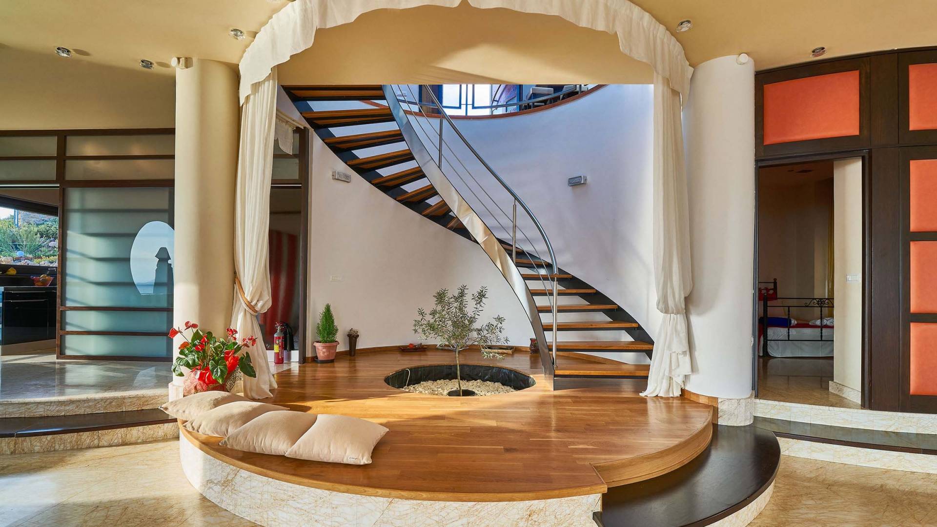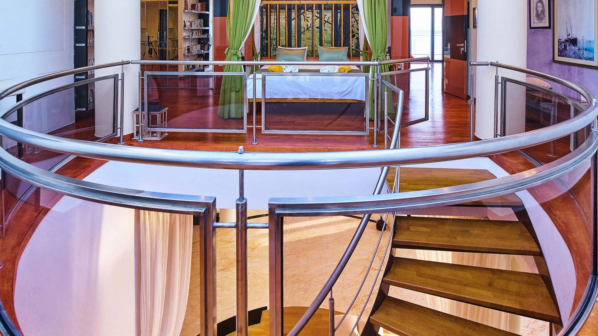 Στο ισόγειο υπάρχουν δύο δίκλινα υπνοδωμάτια. ένα από αυτά είναι ένα ενιαίο υπνοδωμάτιο δίπλα στο σαλόνι. Το άλλο υπνοδωμάτιο με διπλό κρεβάτι έχει ιδιωτικό μπάνιο με ντους. Μια εξωτερική σκάλα οδηγεί στην ανεξάρτητη είσοδο του πρώτου ορόφου και υπάρχει μια αίθουσα με χώρο γραφείου με υπολογιστή και βιβλιοθήκη. Δίπλα στο χολ, υπάρχει επίσης μια μικρή κουζίνα με ψυγείο και καφετιέρα.