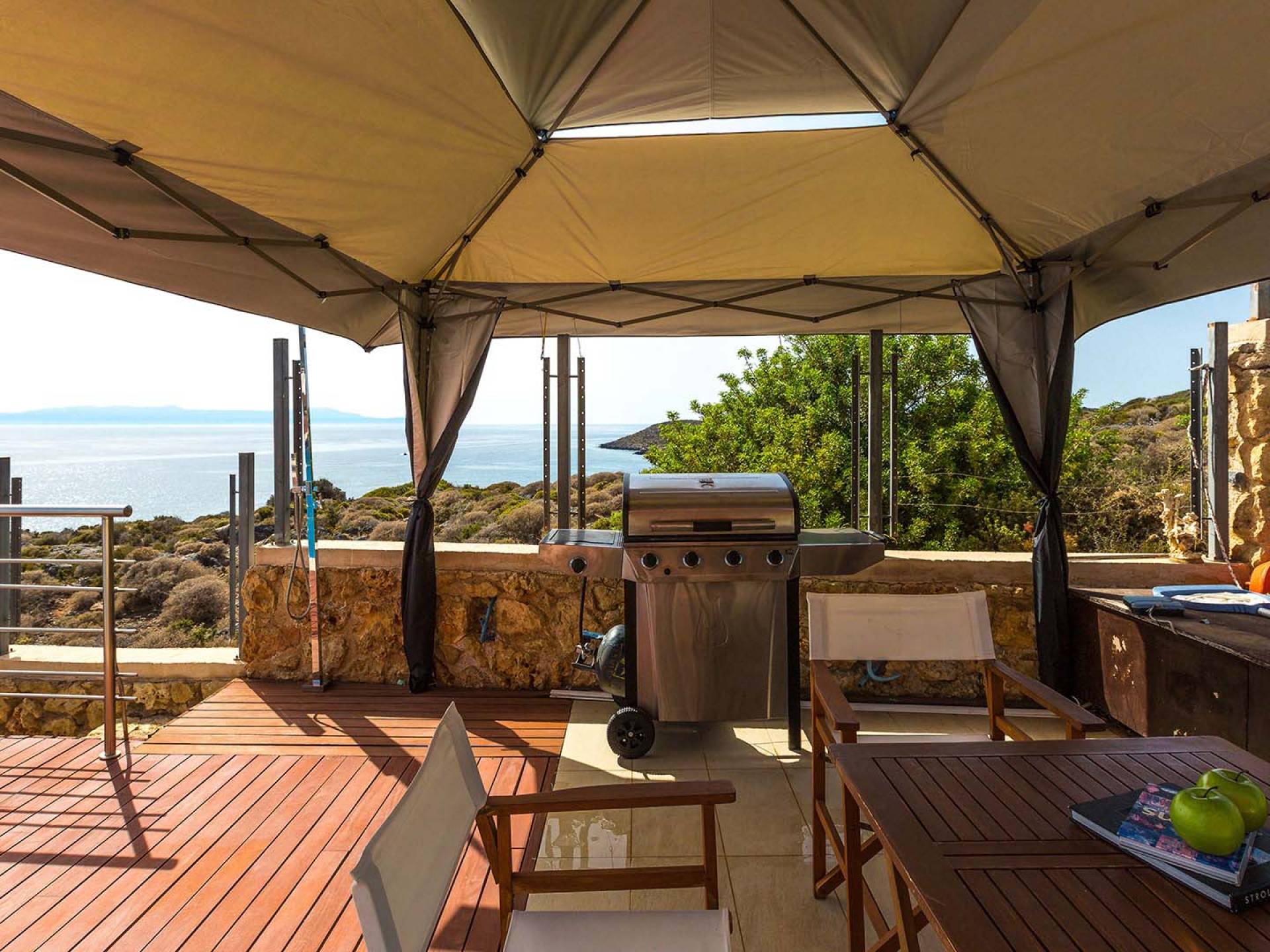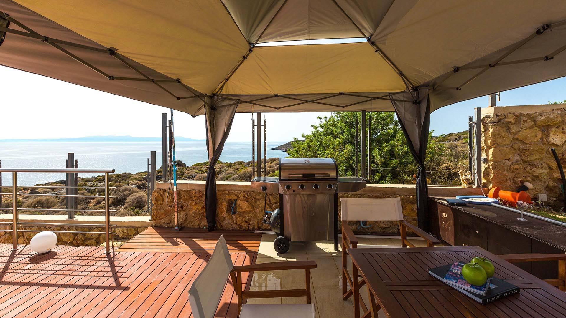 Ο διαμορφωμένος εξωτερικός χώρος μπροστά από το σπίτι είναι σχεδόν 900 τετραγωνικά μέτρα και προσφέρει μια ποικιλία από εγκαταστάσεις και σημεία για χαλάρωση. Πιο συγκεκριμένα οι εξωτερικές μας εγκαταστάσεις περιλαμβάνουν πισίνα 140 τμ, πλήρως εξοπλισμένο μπάρμπεκιου αερίου, εξωτερική τραπεζαρία με θέα στην πισίνα και το γύρω τοπίο, ποικιλία επιπλωμένων σημείων (με ξαπλώστρες, καναπέδες εξωτερικού χώρου και πολυθρόνες) για χαλάρωση στο μπαλκόνια, η βεράντα και οι κήποι γύρω από τη βίλα, ένα ξύλινο κατάστρωμα που βρίσκεται στο επίπεδο της θάλασσας όπου μπορείτε να φτάσετε μέσω της πλακόστρωτης σκάλας από τον εξωτερικό χώρο, θέση στάθμευσης για πολλά αυτοκίνητα.