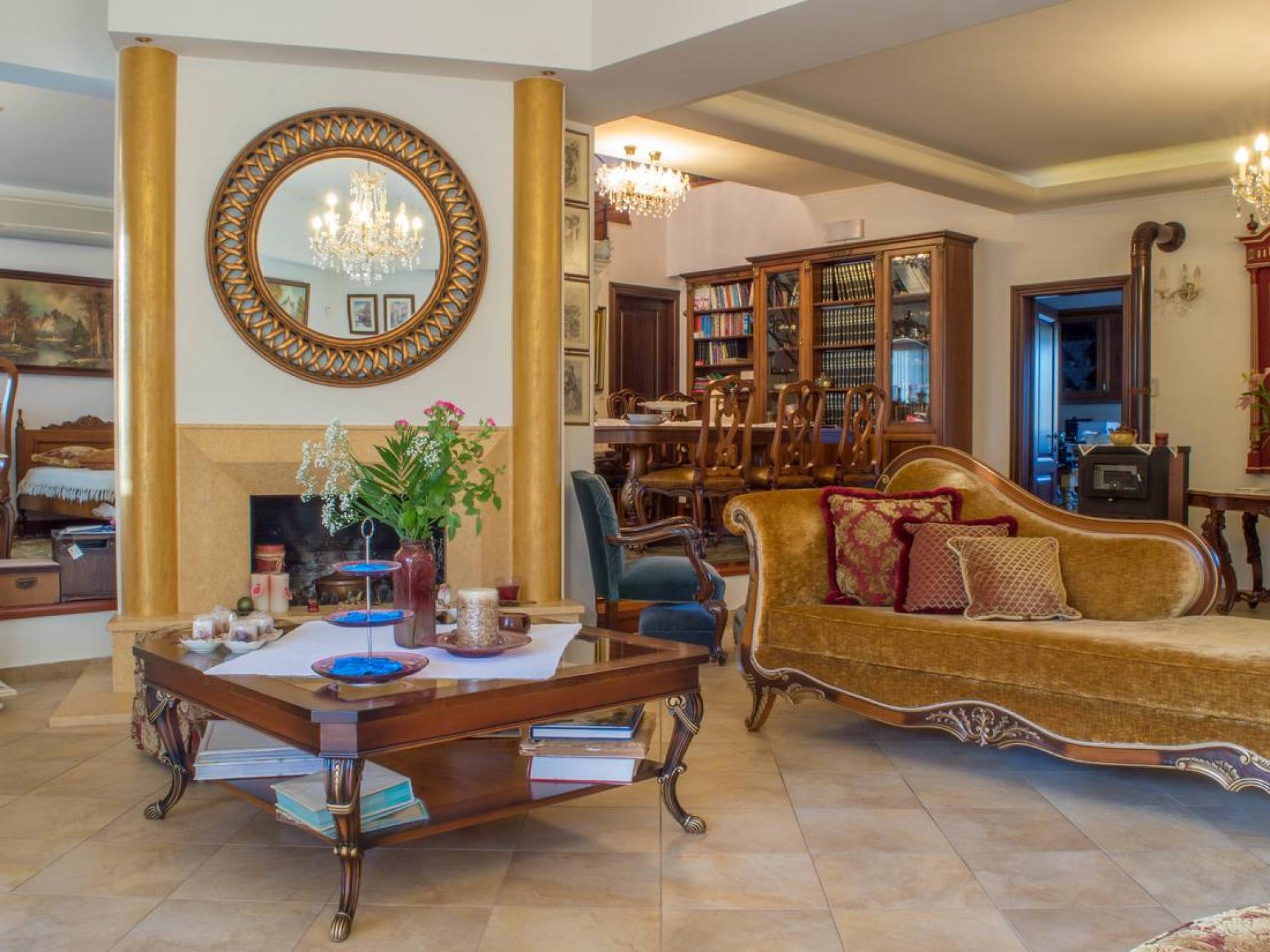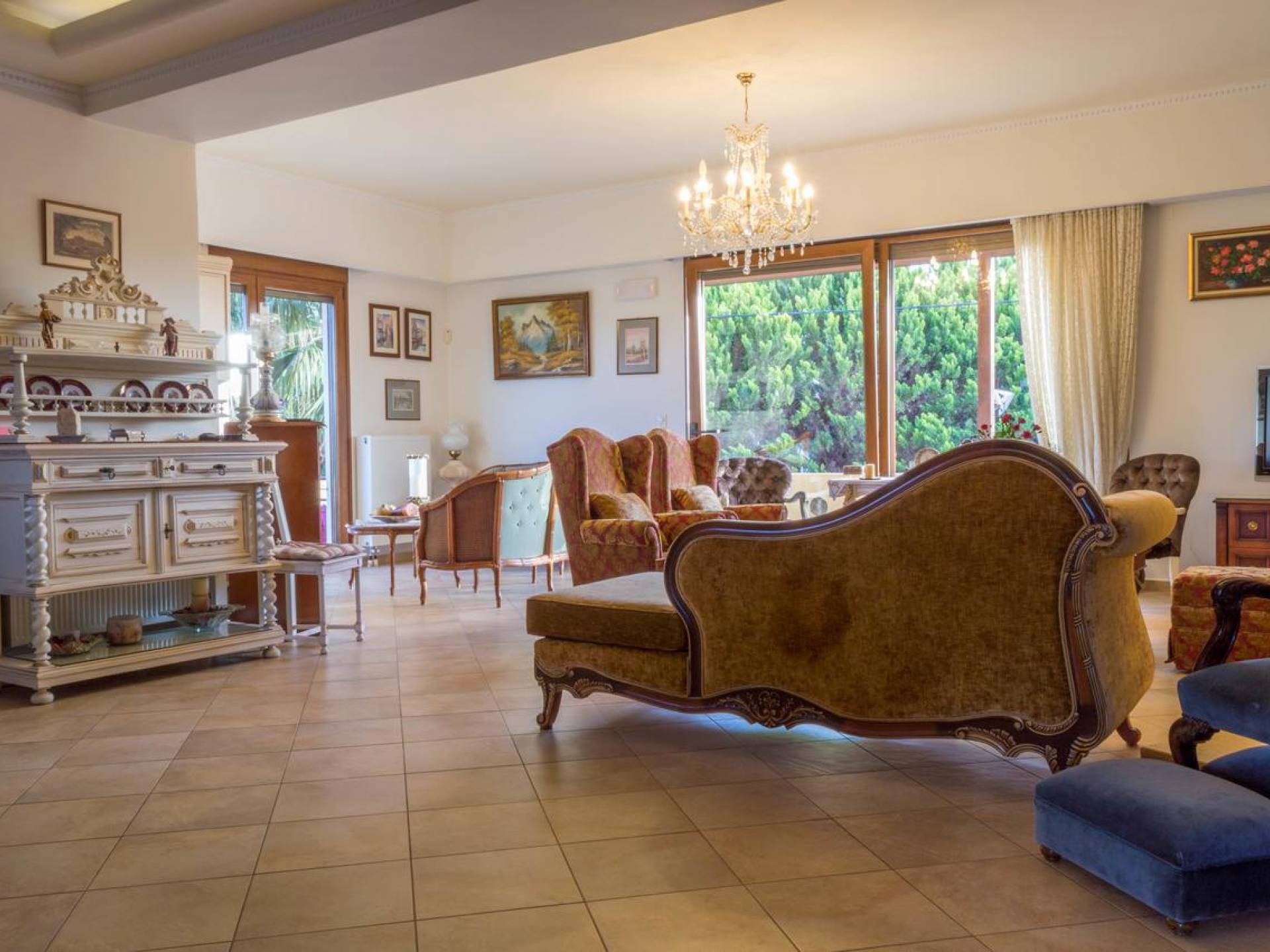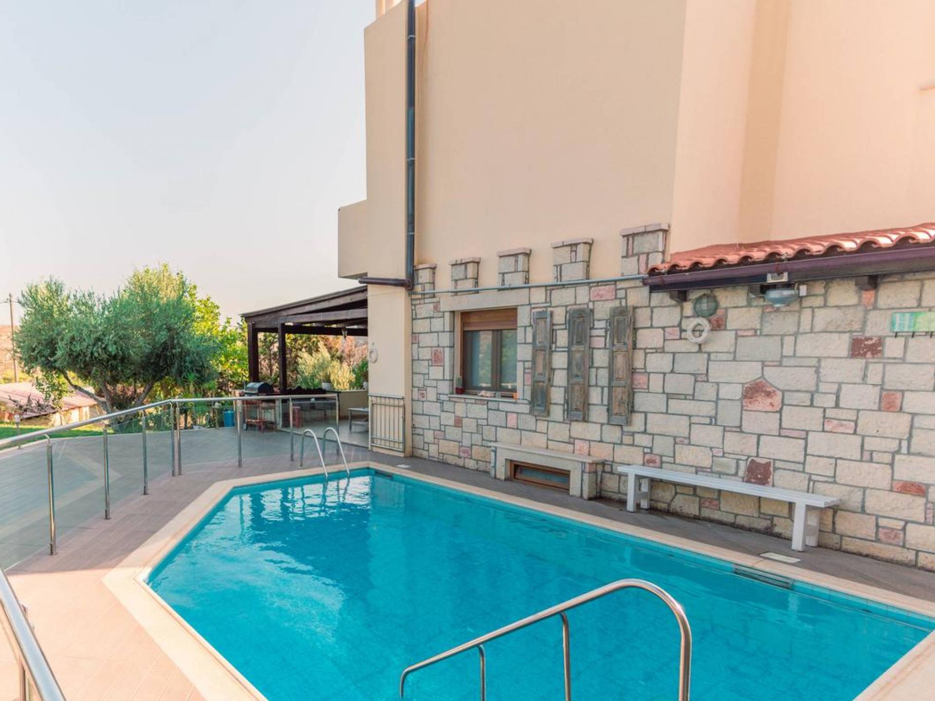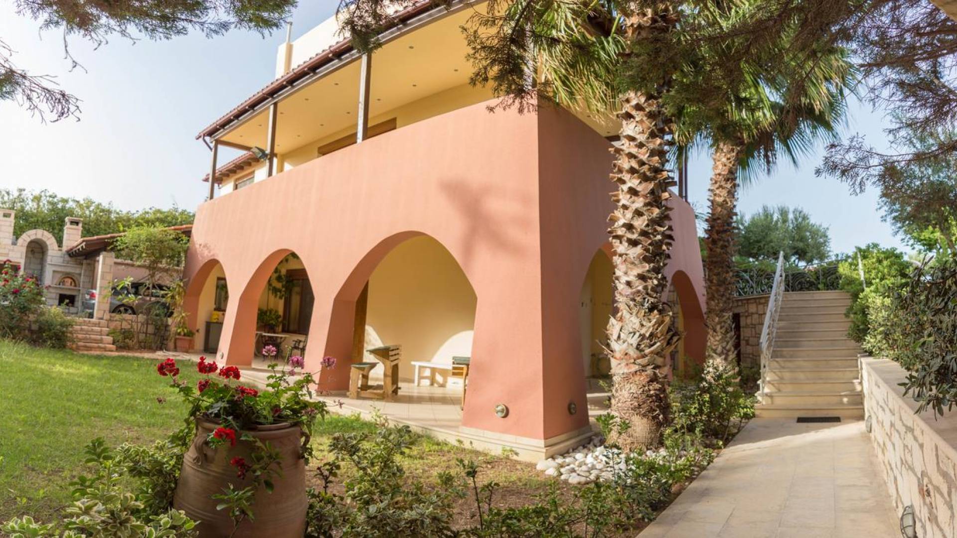 Χτισμένη στην κορυφή ενός ιδιωτικού λόφου, η πολυτελής βίλα μας προσφέρει υπέροχη πανοραμική θέα στο Αιγαίο πέλαγος και τα βουνά του Νότου και της Δύσης. Μπορείτε να απολαύσετε την όμορφη θέα στην παραλία, τον μεγάλο κήπο, την πισίνα και το υπέροχο περιβάλλον, από τις 2 μεγάλες βεράντες στον πρώτο όροφο και 2 μικρότερα μπαλκόνια στον δεύτερο όροφο. Το πλήρως εξοπλισμένο σπίτι βρίσκεται στον δεύτερο και τον τρίτο όροφο, που συνδέεται με ένα σετ ξύλινων σκαλοπατιών. Το μεγαλύτερο μέρος του δαπέδου είναι ξύλινο και περιλαμβάνει κλασικά έπιπλα υψηλής ποιότητας. Στον δεύτερο όροφο υπάρχουν 2 μεγάλα σαλόνια με τζάκι, τραπεζαρία, πλήρως εξοπλισμένη κουζίνα με όλες τις σύγχρονες ανέσεις, αίθουσα μελέτης με ένα μονό κρεβάτι και WC. Ο τρίτος όροφος διαθέτει 3 υπνοδωμάτια, δύο εκ των οποίων προσφέρουν μπαλκόνια με υπέροχη θέα. Υπάρχουν δύο μπάνια με μπανιέρες σε αυτόν τον όροφο, το ένα από αυτά είναι μέρος ενός ξεχωριστού διαμερίσματος (με το κυρίως υπνοδωμάτιο), που προσφέρει επίσης υδρομασάζ (τζακούζι).