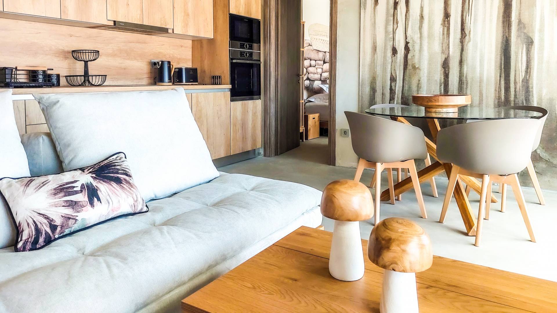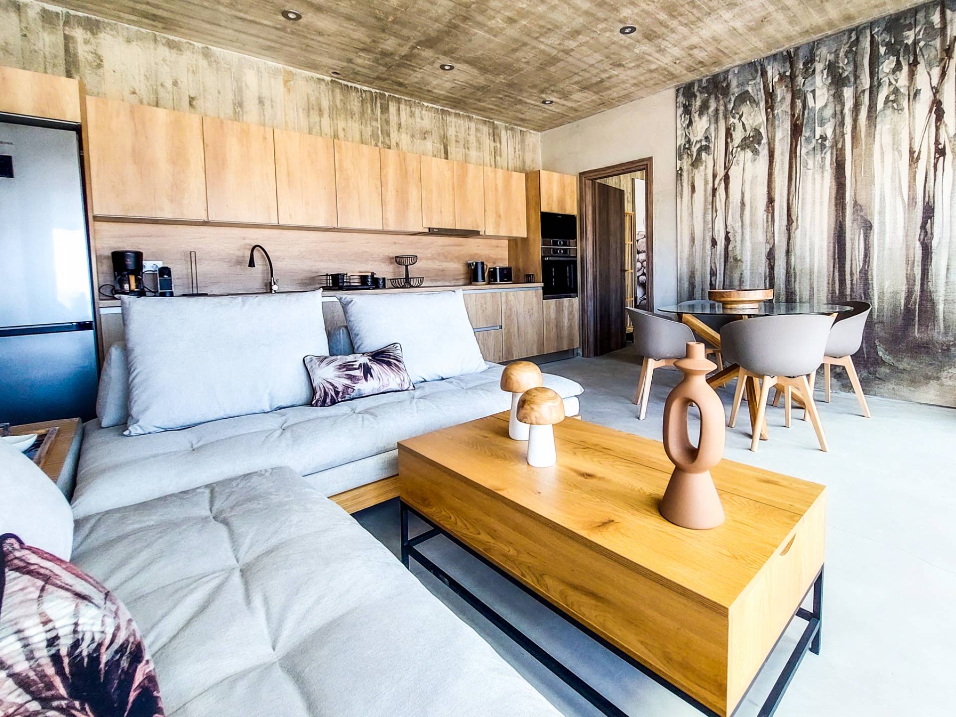 A stylish open-concept living space with a Smart Web - Multimedia TV, 55” (satellite channels, Netflix), perfect for relaxing after a day of adventure.