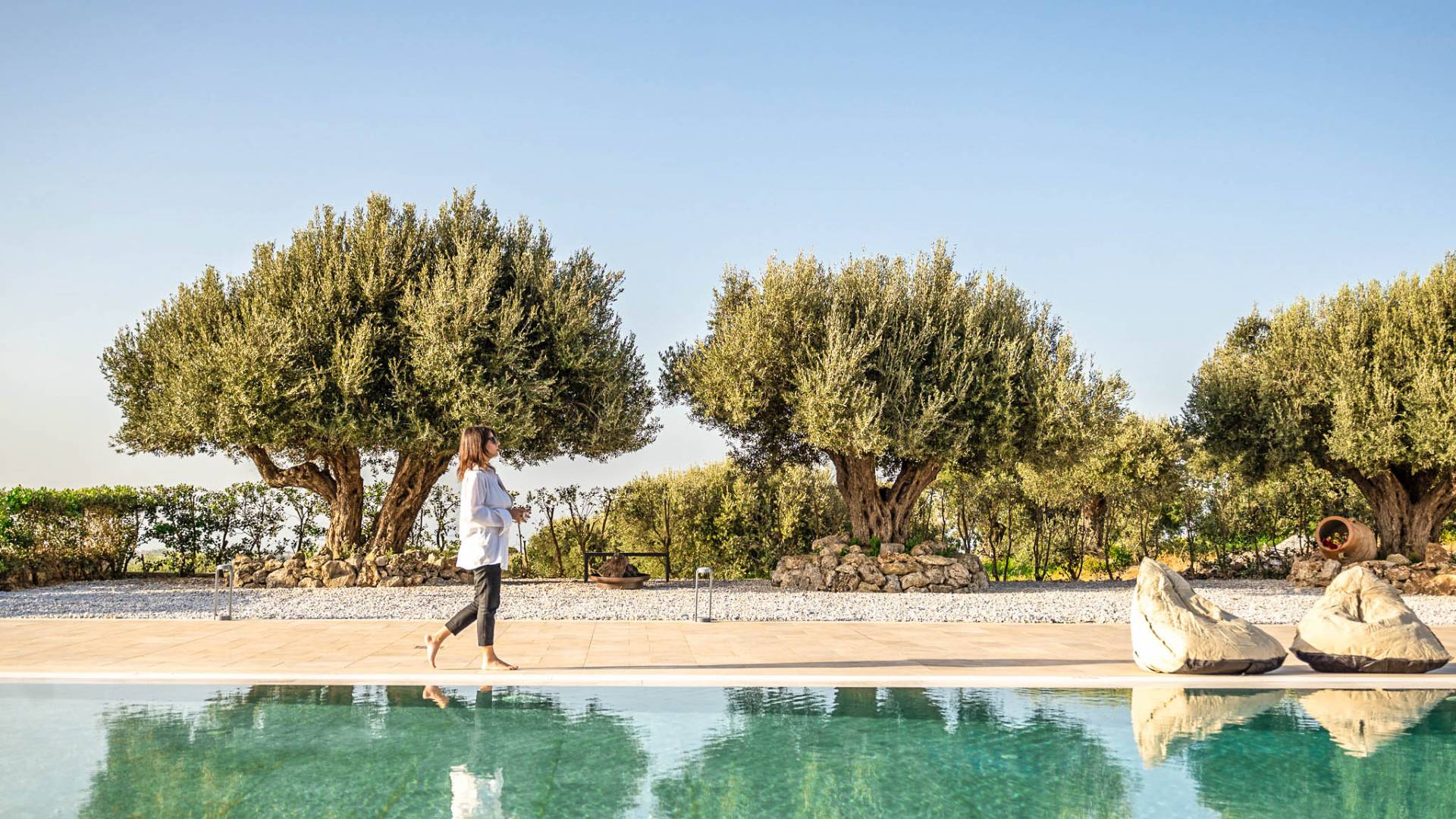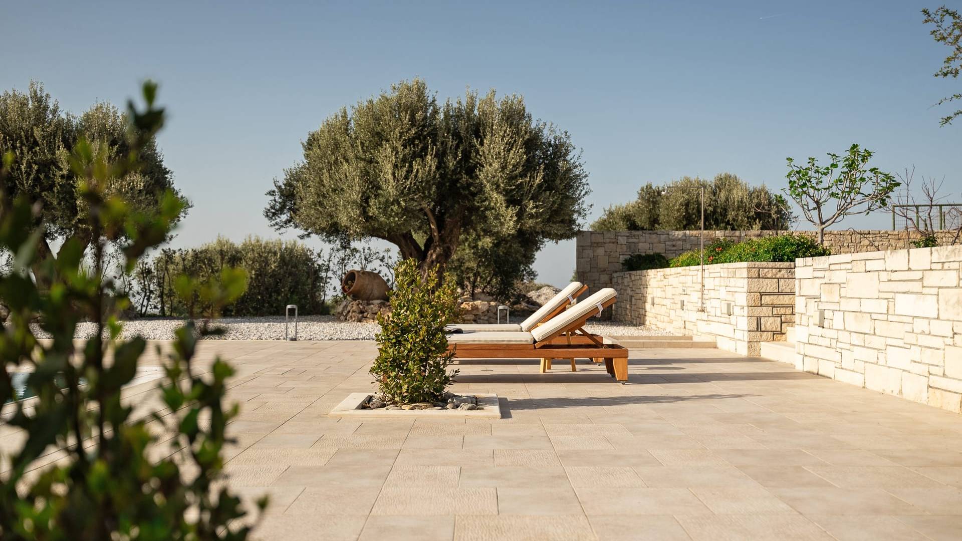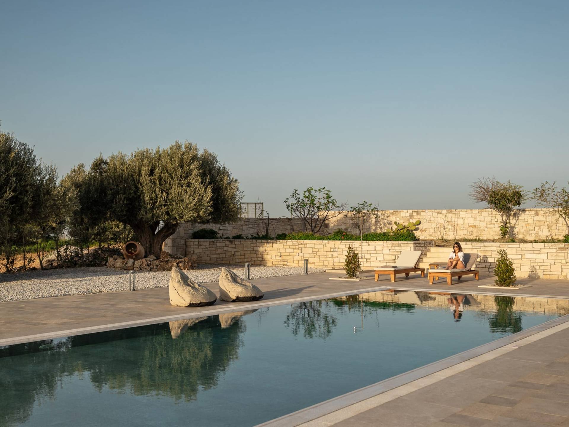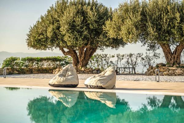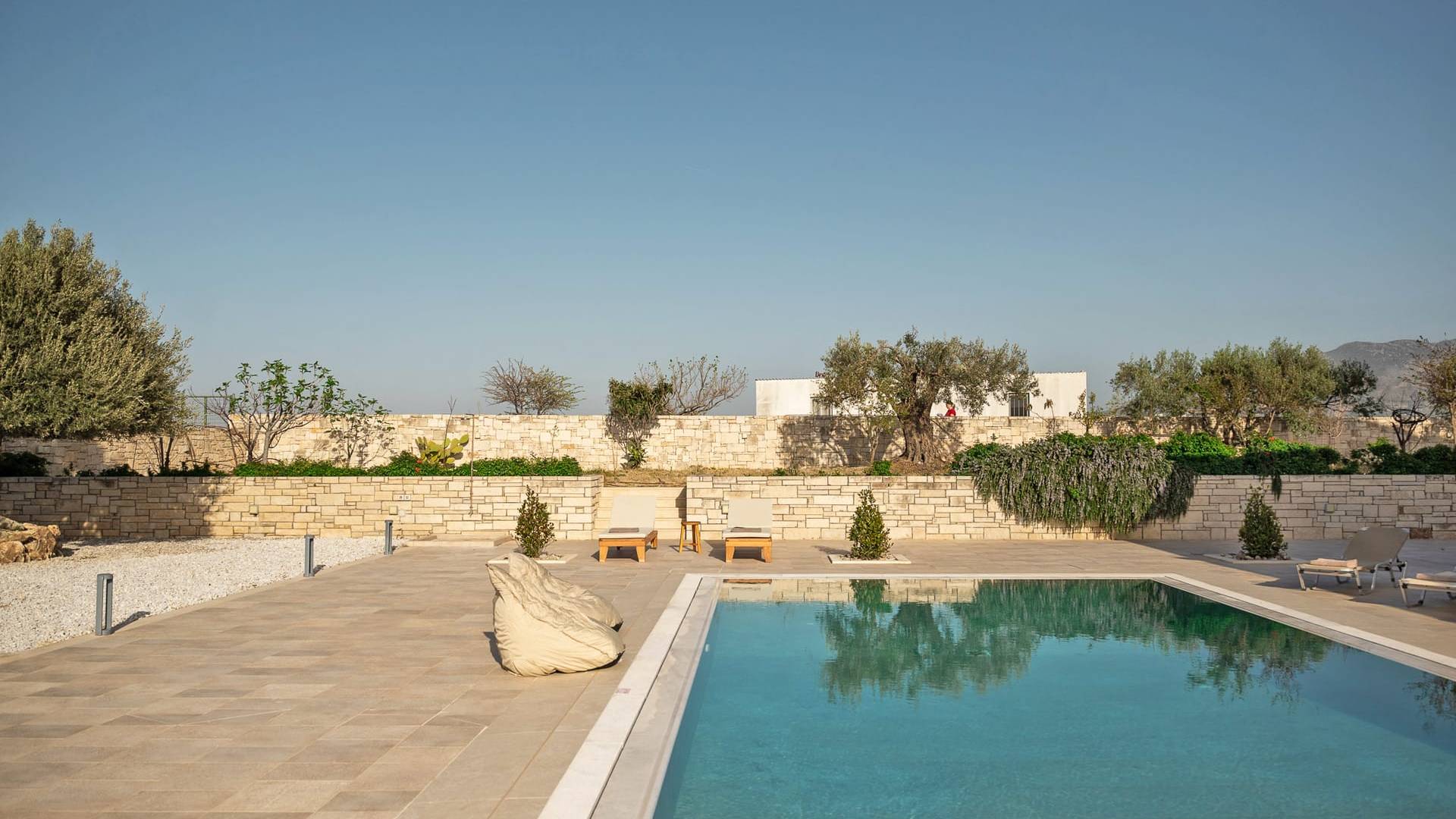 Μια αστραφτερή πισίνα, που περιβάλλεται από ξαπλώστρες και ελαιόδεντρα, σας προσκαλεί να απολαύσετε τον ήλιο και να απολαύσετε γαλήνιες στιγμές σε ένα ήρεμο περιβάλλον.