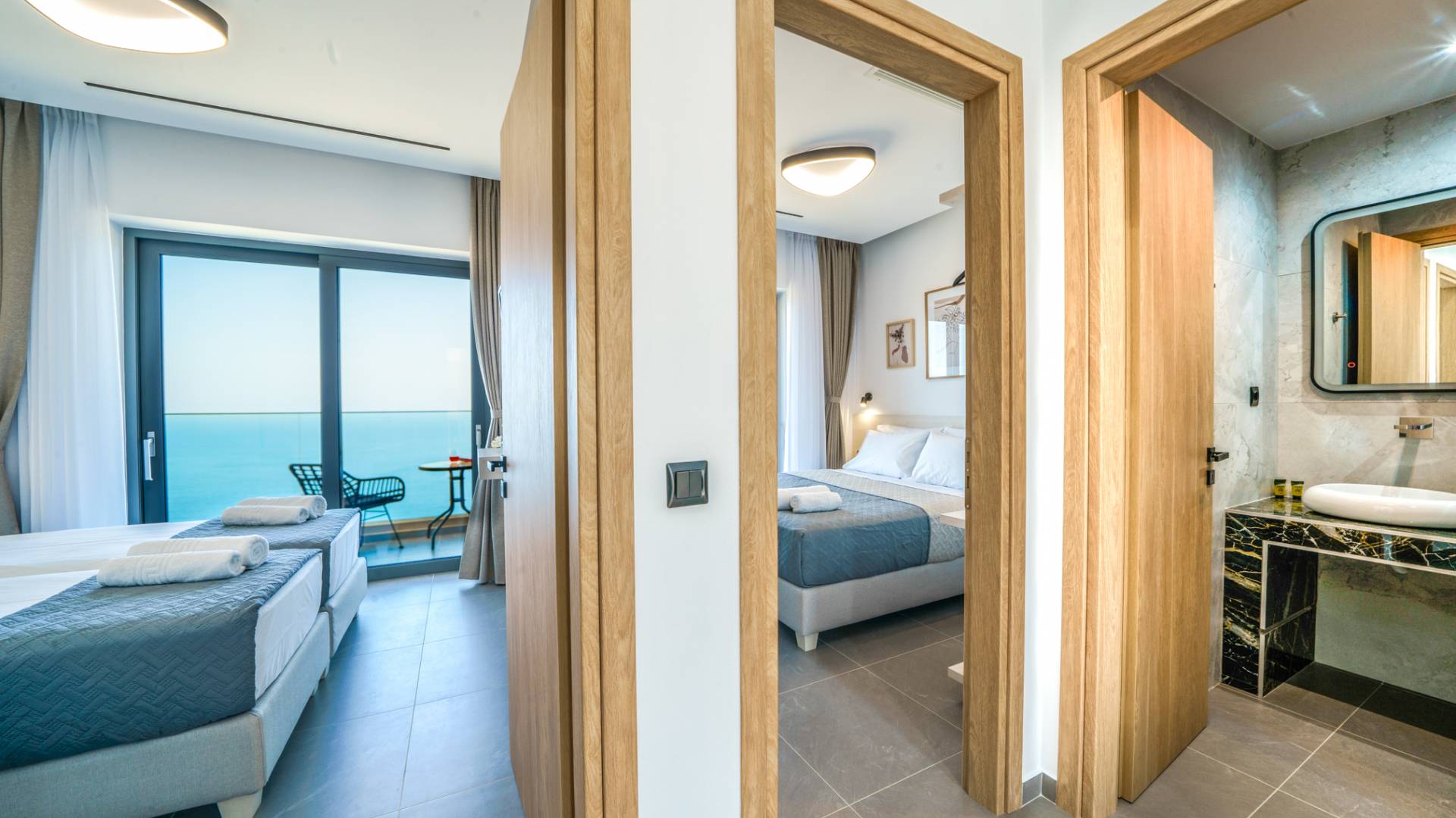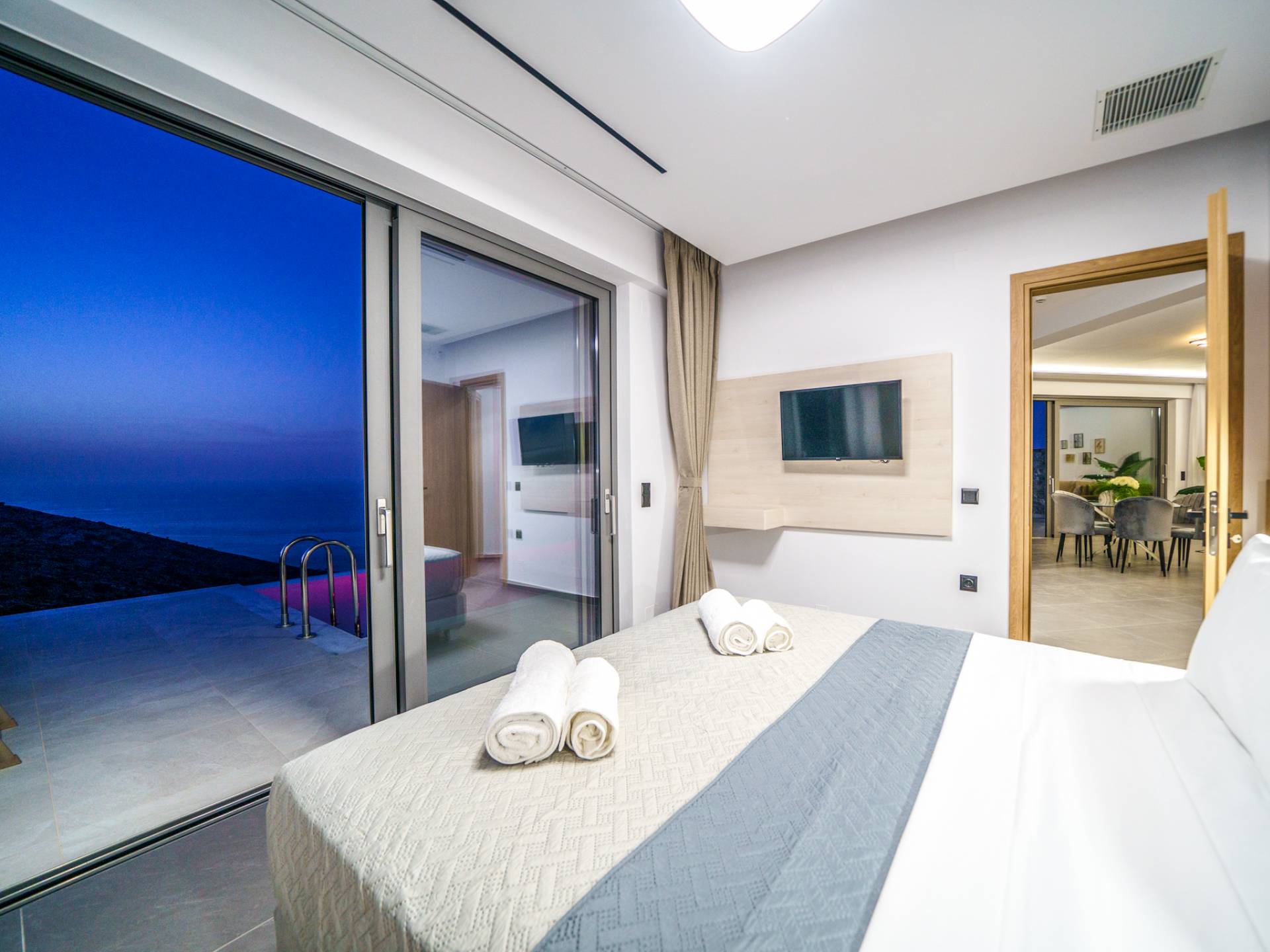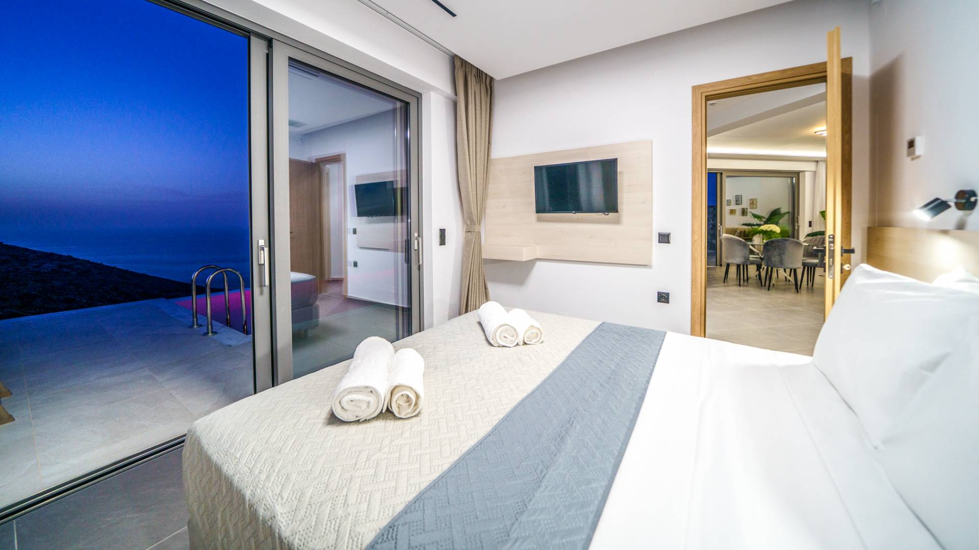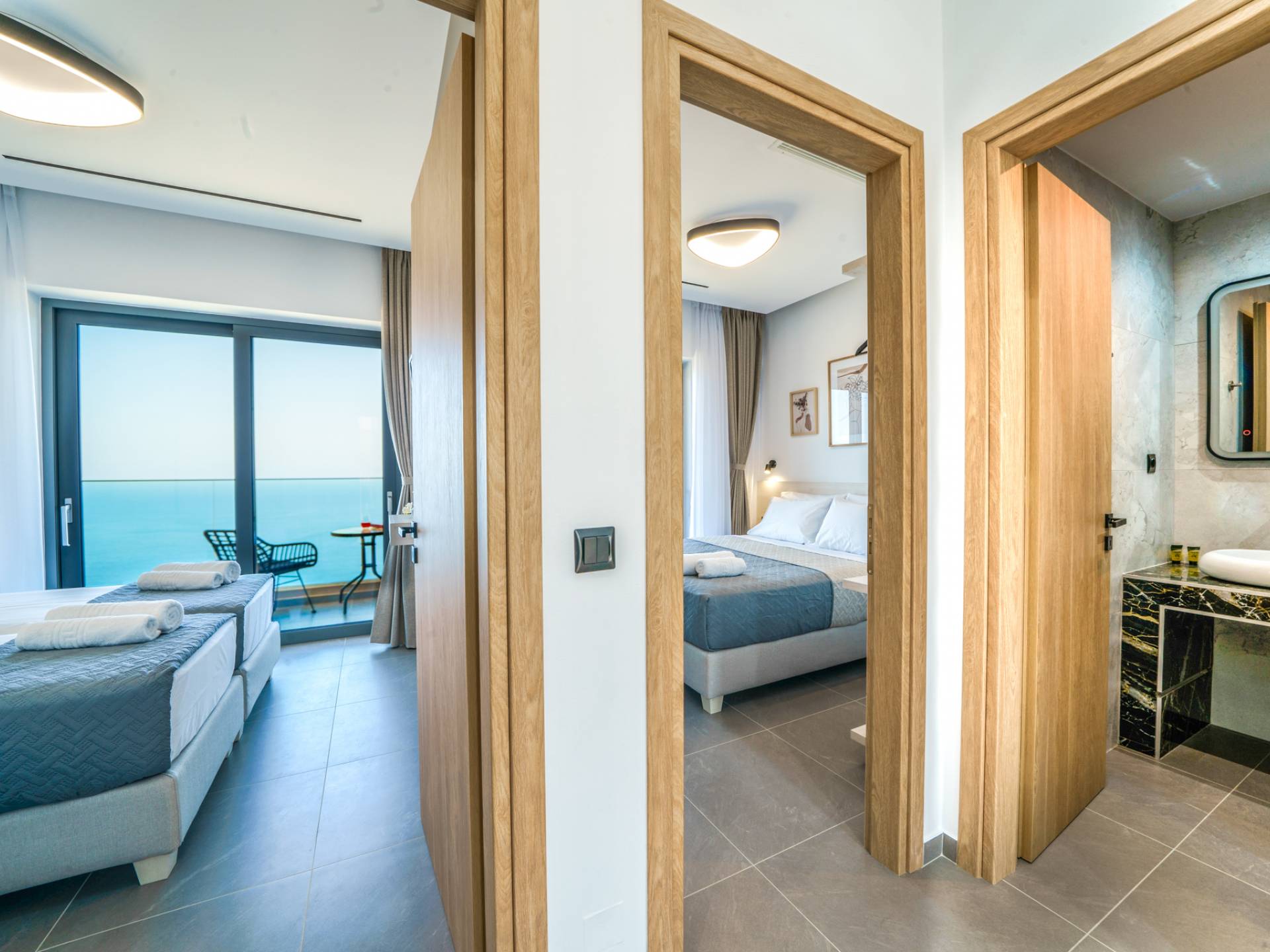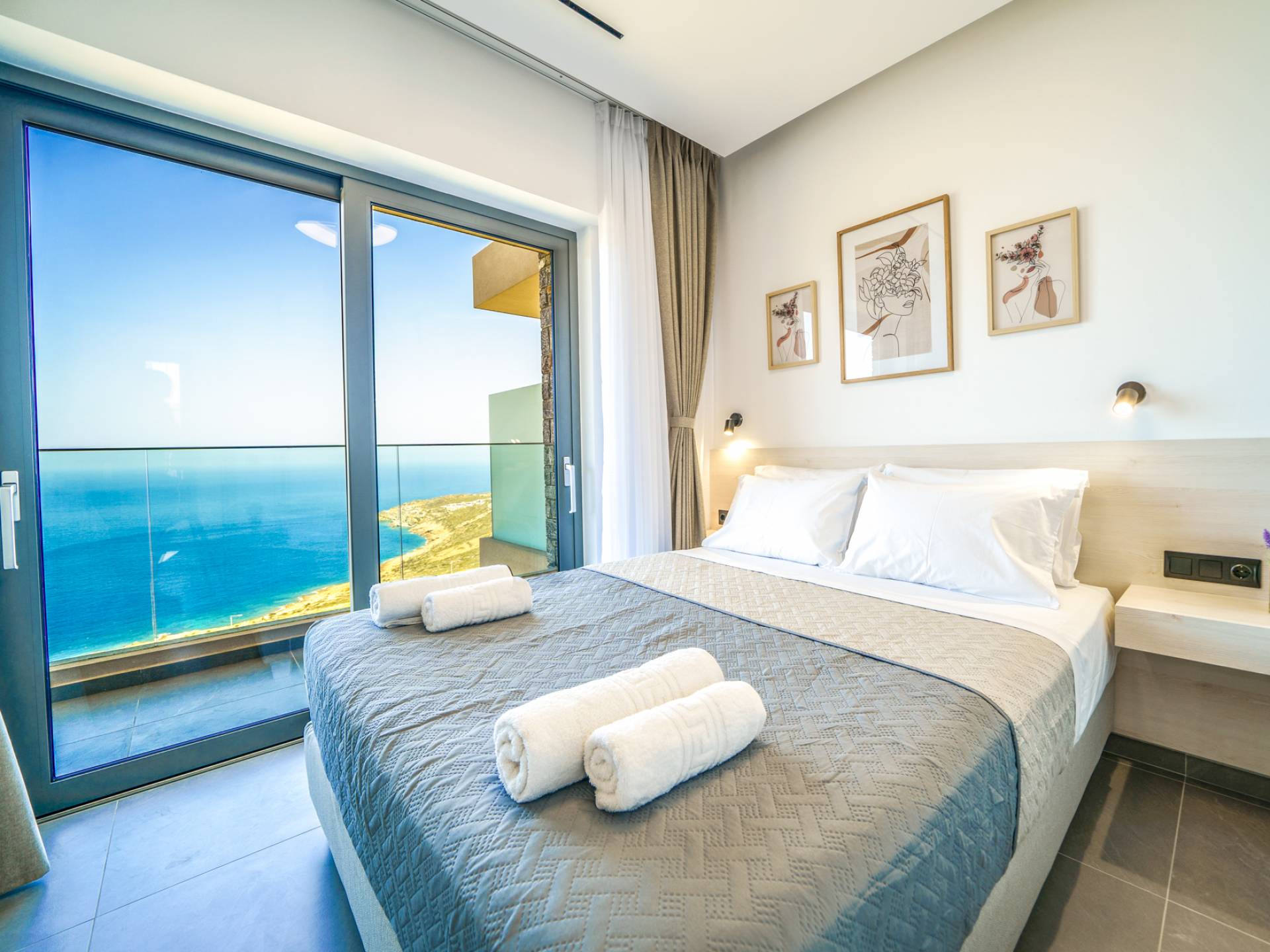 Όταν έρθει η ώρα να αποσυρθείτε για τη νύχτα, σας περιμένουν 3 σχεδιασμένα υπνοδωμάτια. Κάθε υπνοδωμάτιο διαθέτει κρεβάτι 1,60 Χ 2,00, που συμπληρώνεται από τηλεόραση 32 ιντσών, κλιματισμό και ντουλάπα για την άνεσή σας. Όλα τα υπνοδωμάτια παρέχουν πρόσβαση σε ένα μπαλκόνι και μια βεράντα εξοπλισμένη με άνετο καθιστικό, που σας προσκαλεί να ξυπνάτε με τη μαγευτική θέα στη θάλασσα κάθε πρωί.