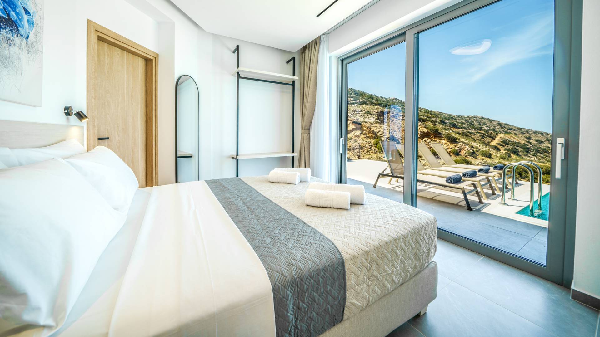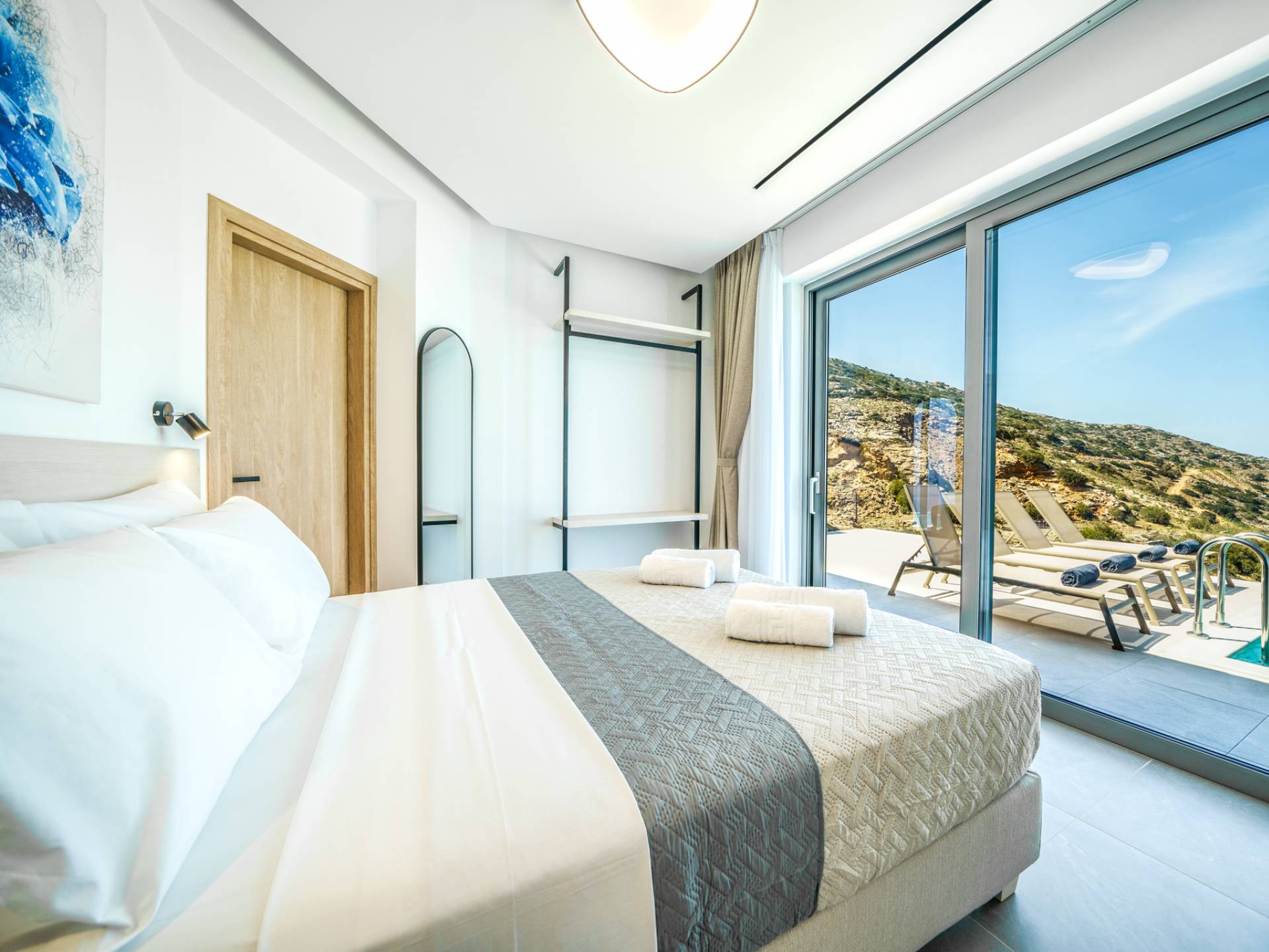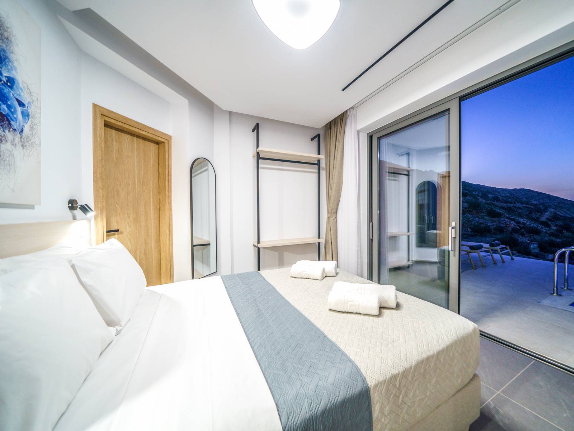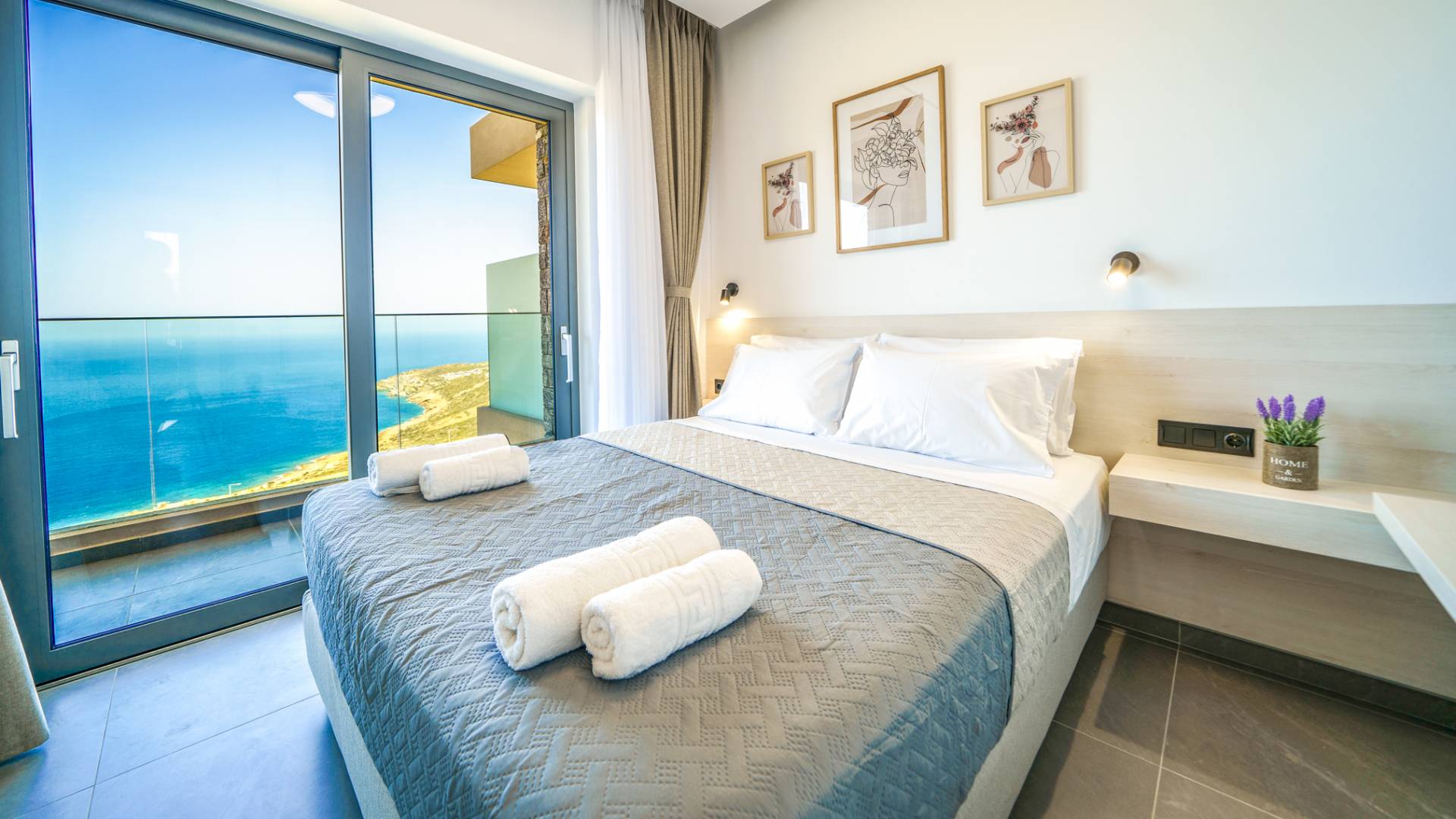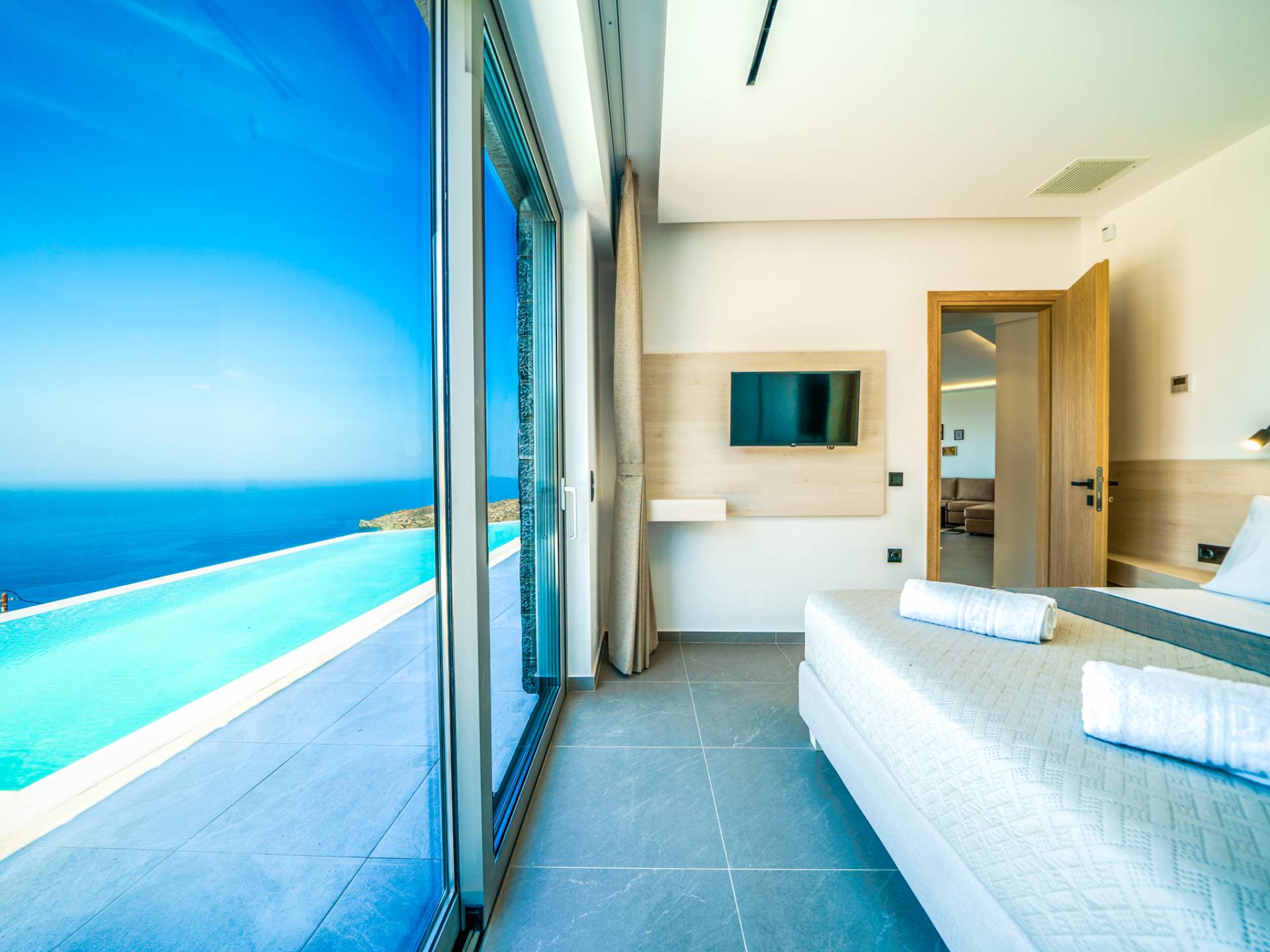 Όταν έρθει η ώρα να αποσυρθείτε για τη νύχτα, σας περιμένουν 3 σχεδιασμένα υπνοδωμάτια. Κάθε υπνοδωμάτιο διαθέτει κρεβάτι 1,60 Χ 2,00, που συμπληρώνεται από τηλεόραση 32 ιντσών, κλιματισμό και ντουλάπα για την άνεσή σας. Όλα τα υπνοδωμάτια παρέχουν πρόσβαση σε ένα μπαλκόνι και μια βεράντα εξοπλισμένη με άνετο καθιστικό, που σας προσκαλεί να ξυπνάτε με τη μαγευτική θέα στη θάλασσα κάθε πρωί.