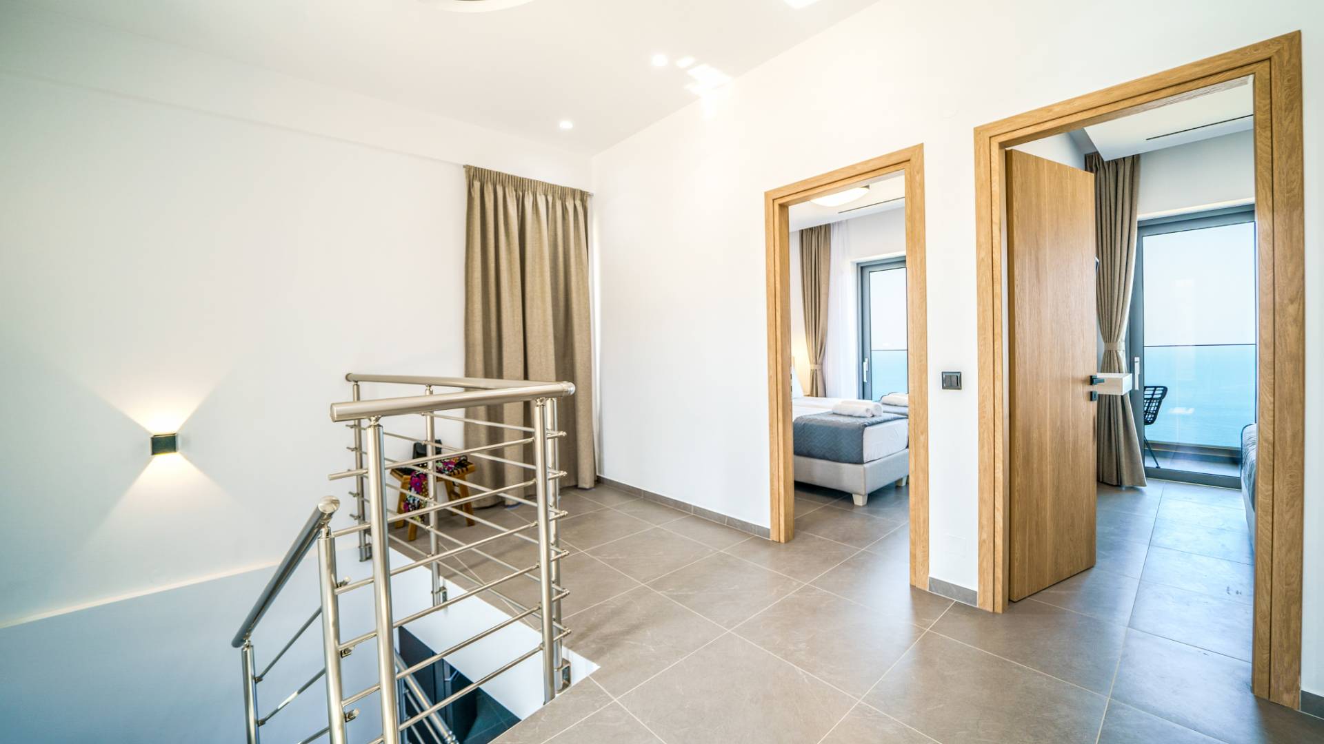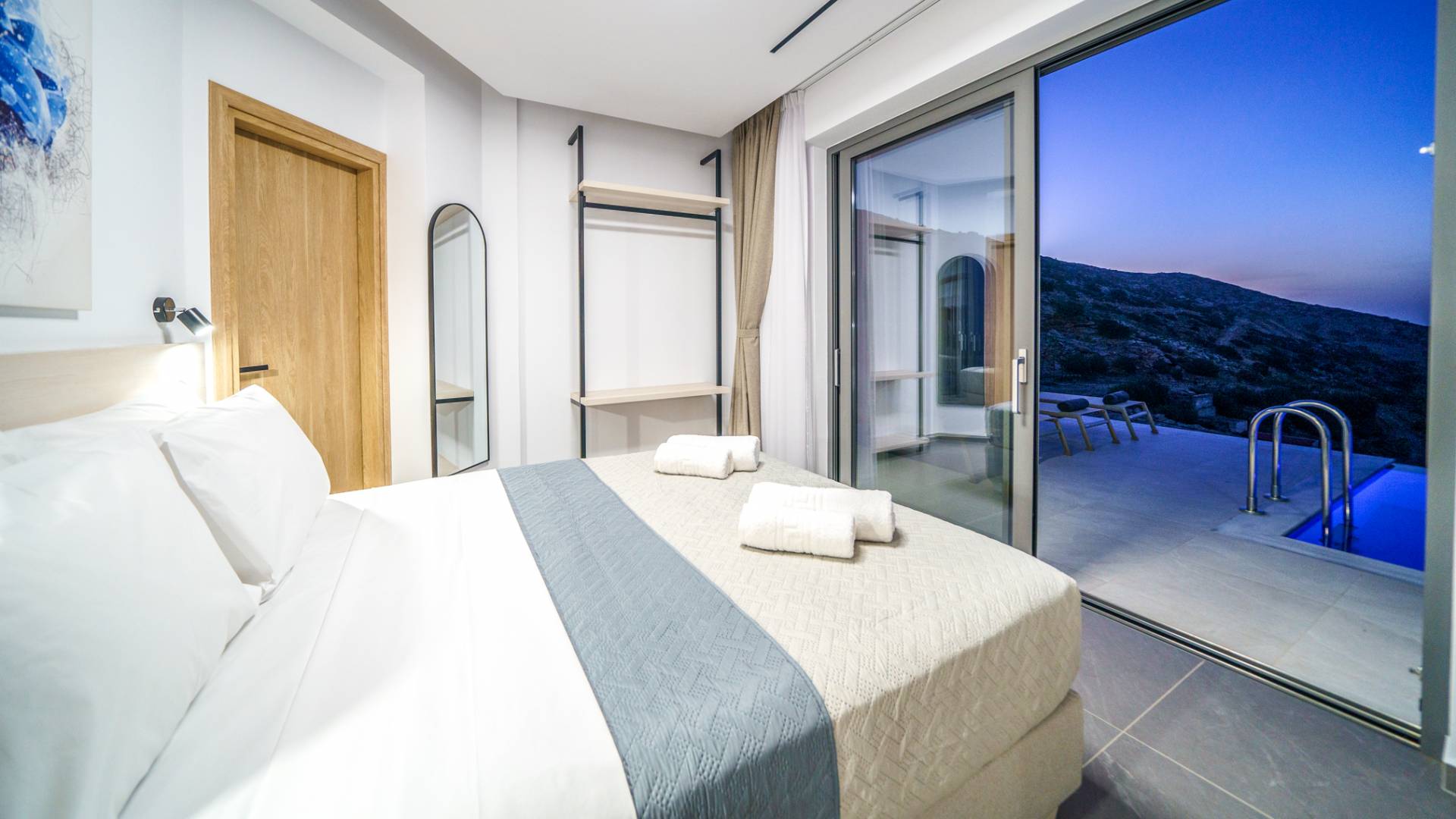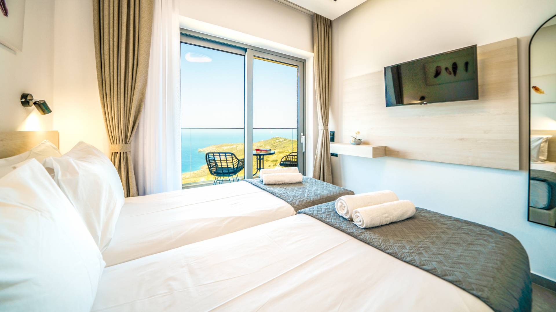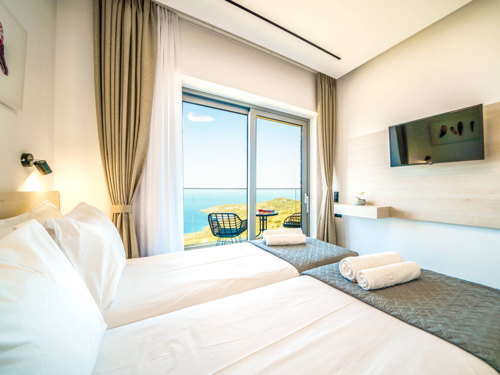 Όταν έρθει η ώρα να αποσυρθείτε για τη νύχτα, σας περιμένουν 3 σχεδιασμένα υπνοδωμάτια. Κάθε υπνοδωμάτιο διαθέτει κρεβάτι 1,60 Χ 2,00, που συμπληρώνεται από τηλεόραση 32 ιντσών, κλιματισμό και ντουλάπα για την άνεσή σας. Όλα τα υπνοδωμάτια παρέχουν πρόσβαση σε ένα μπαλκόνι και μια βεράντα εξοπλισμένη με άνετο καθιστικό, που σας προσκαλεί να ξυπνάτε με τη μαγευτική θέα στη θάλασσα κάθε πρωί.
