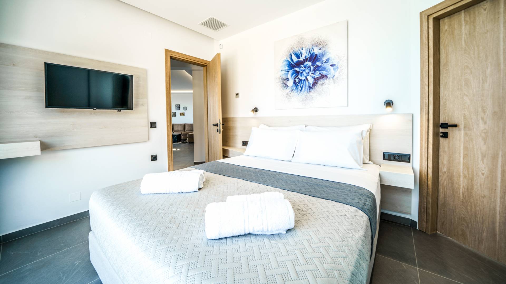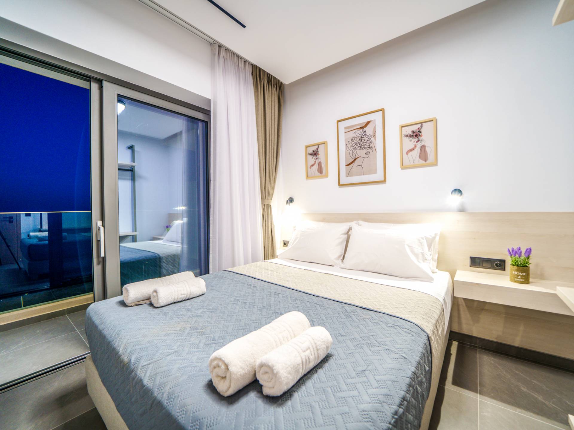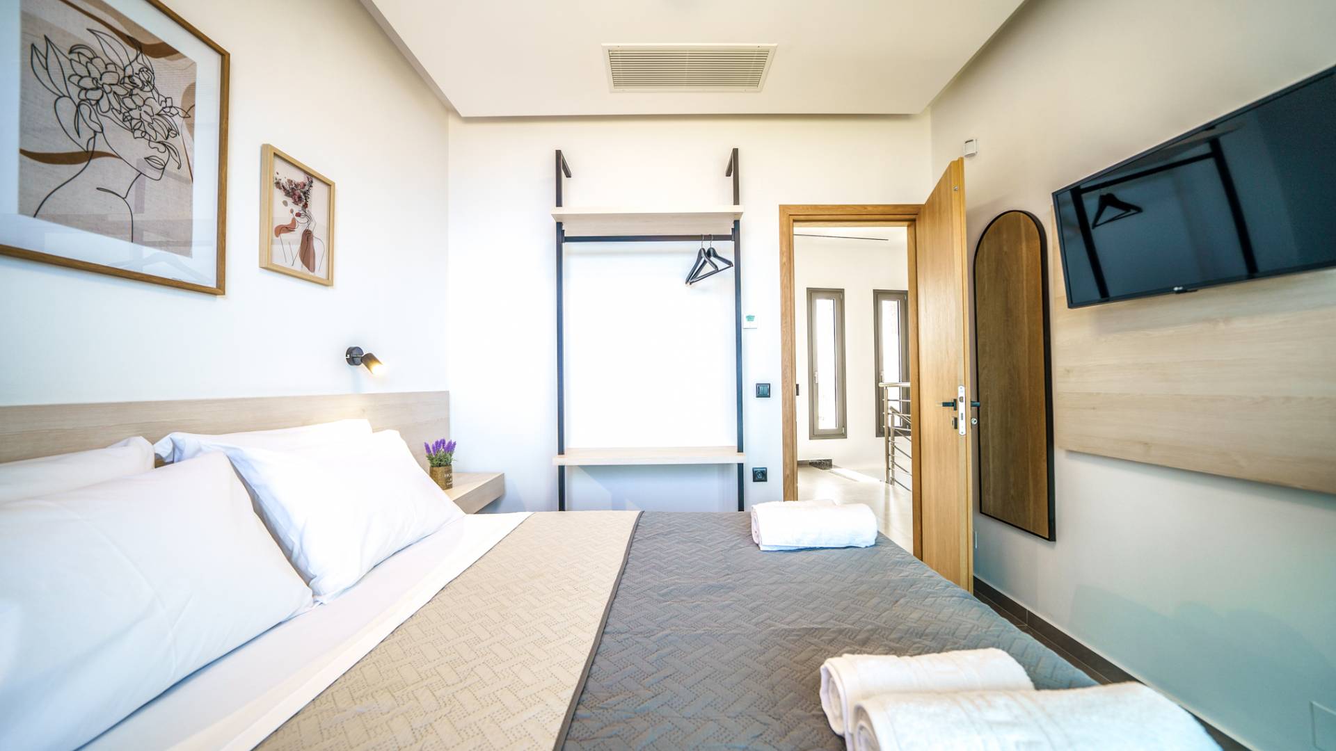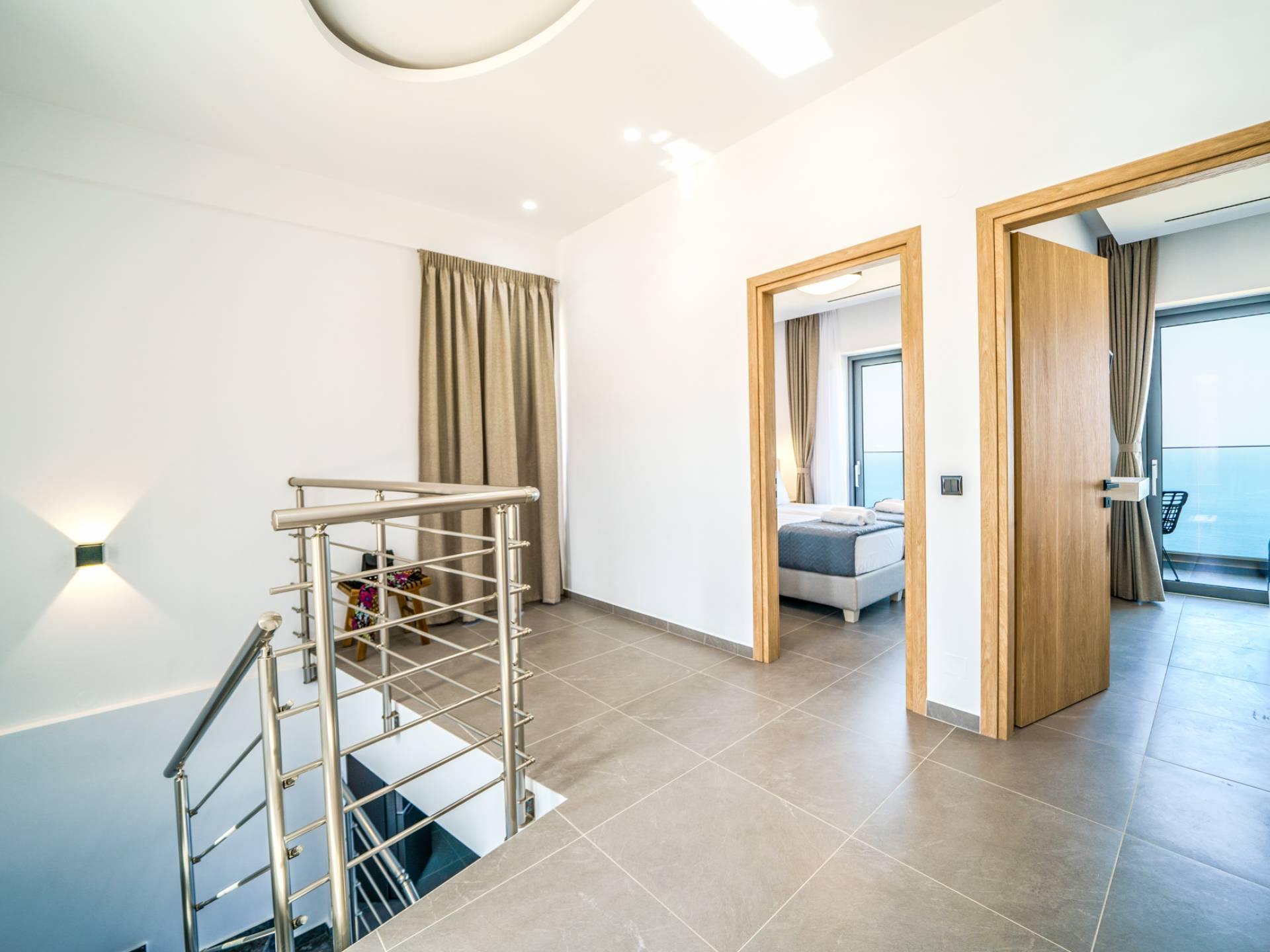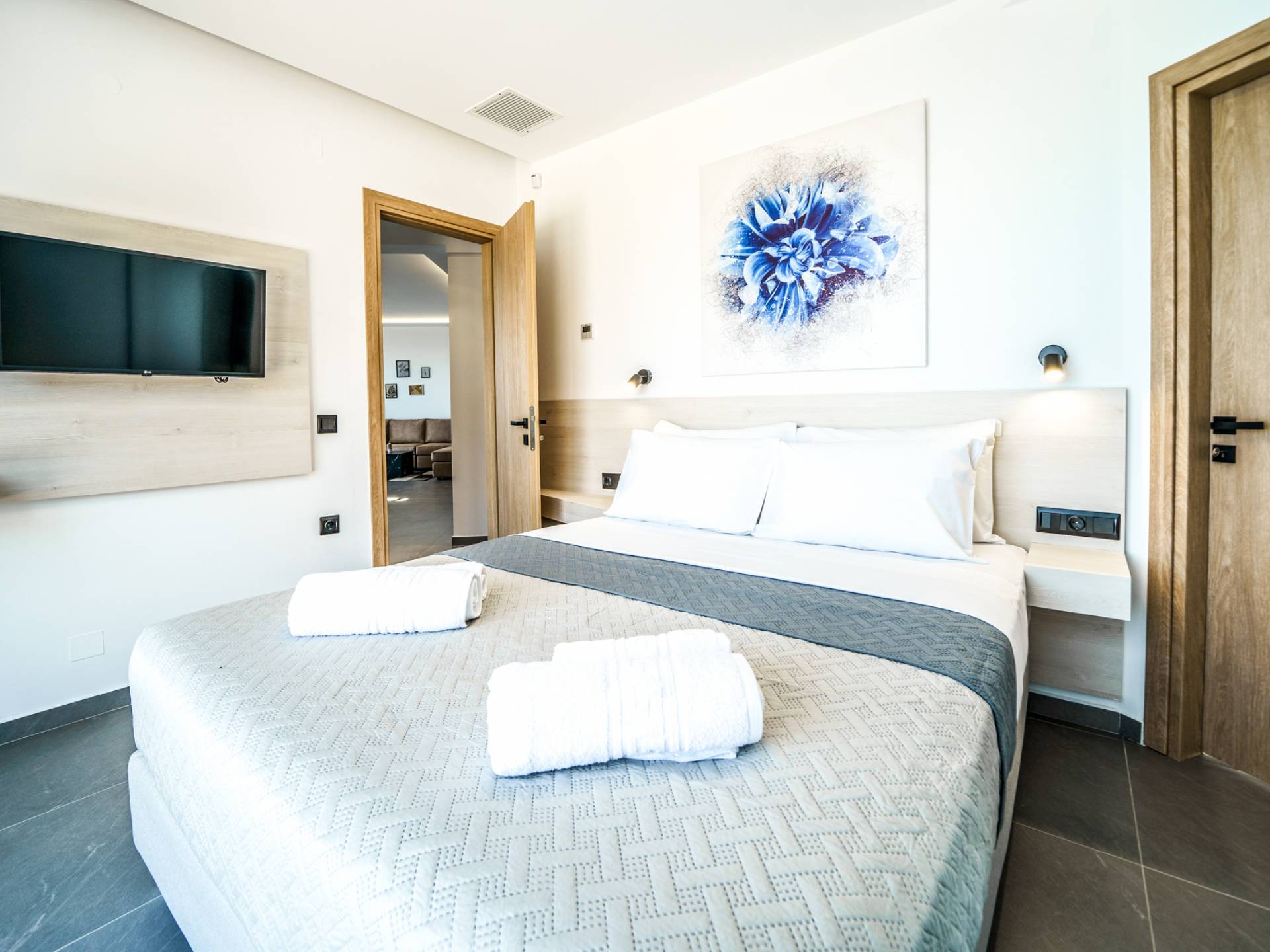 Όταν έρθει η ώρα να αποσυρθείτε για τη νύχτα, σας περιμένουν 3 σχεδιασμένα υπνοδωμάτια. Κάθε υπνοδωμάτιο διαθέτει κρεβάτι 1,60 Χ 2,00, που συμπληρώνεται από τηλεόραση 32 ιντσών, κλιματισμό και ντουλάπα για την άνεσή σας. Όλα τα υπνοδωμάτια παρέχουν πρόσβαση σε ένα μπαλκόνι και μια βεράντα εξοπλισμένη με άνετο καθιστικό, που σας προσκαλεί να ξυπνάτε με τη μαγευτική θέα στη θάλασσα κάθε πρωί.