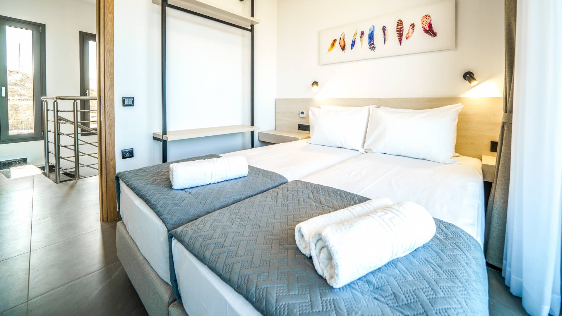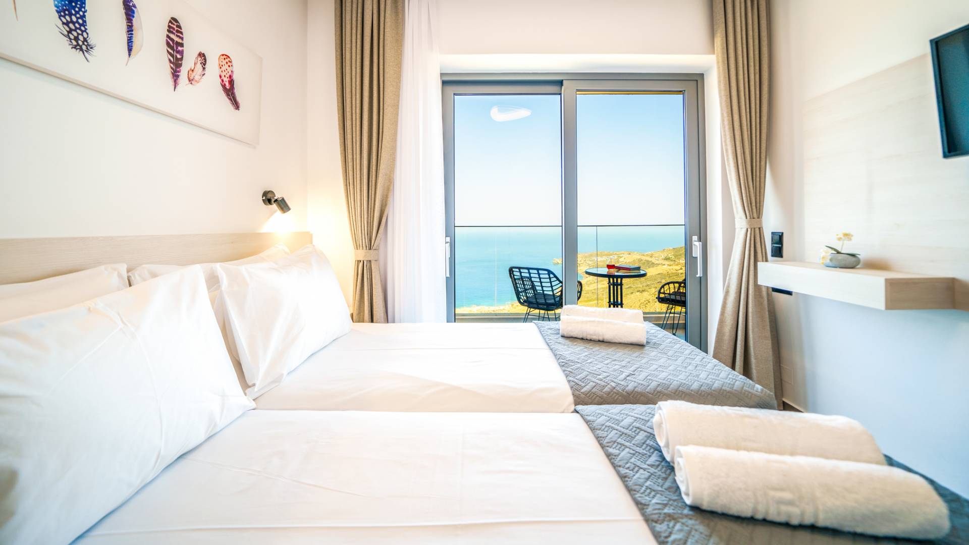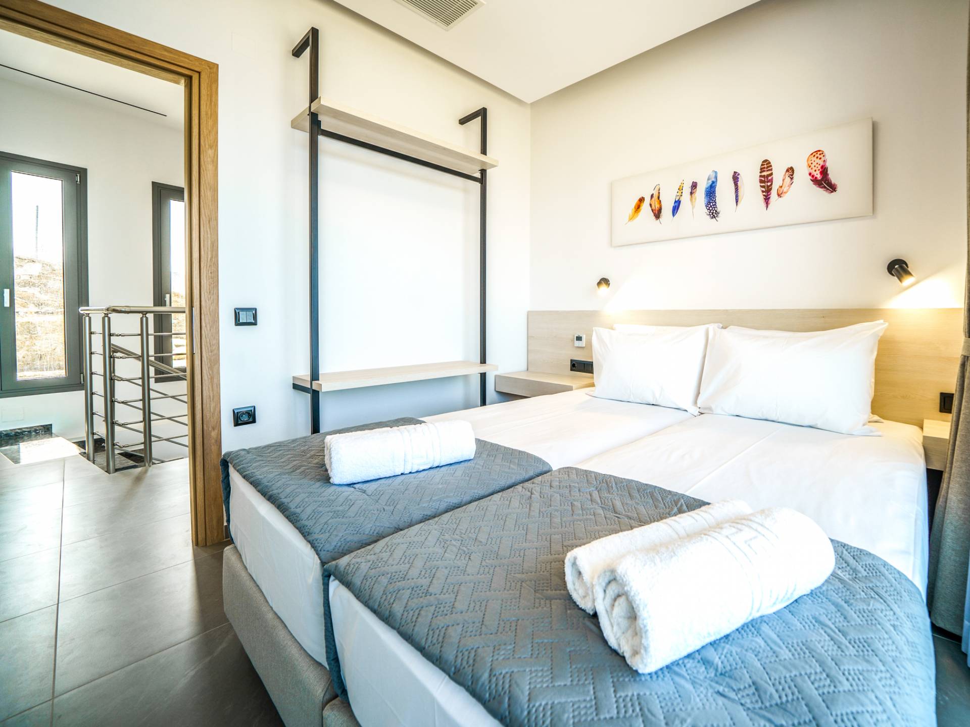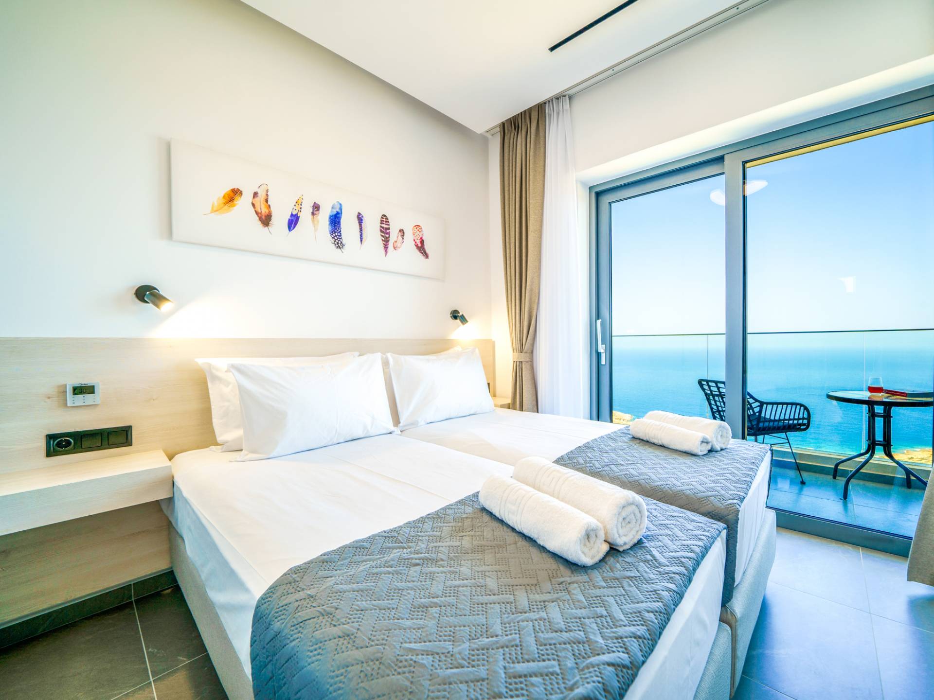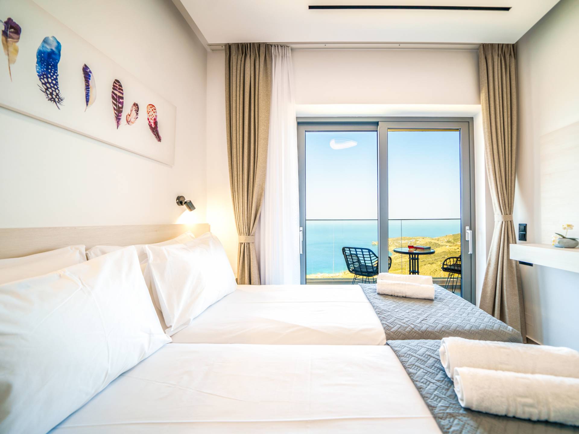 Όταν έρθει η ώρα να αποσυρθείτε για τη νύχτα, σας περιμένουν 3 σχεδιασμένα υπνοδωμάτια. Κάθε υπνοδωμάτιο διαθέτει κρεβάτι 1,60 Χ 2,00, που συμπληρώνεται από τηλεόραση 32 ιντσών, κλιματισμό και ντουλάπα για την άνεσή σας. Όλα τα υπνοδωμάτια παρέχουν πρόσβαση σε ένα μπαλκόνι και μια βεράντα εξοπλισμένη με άνετο καθιστικό, που σας προσκαλεί να ξυπνάτε με τη μαγευτική θέα στη θάλασσα κάθε πρωί.