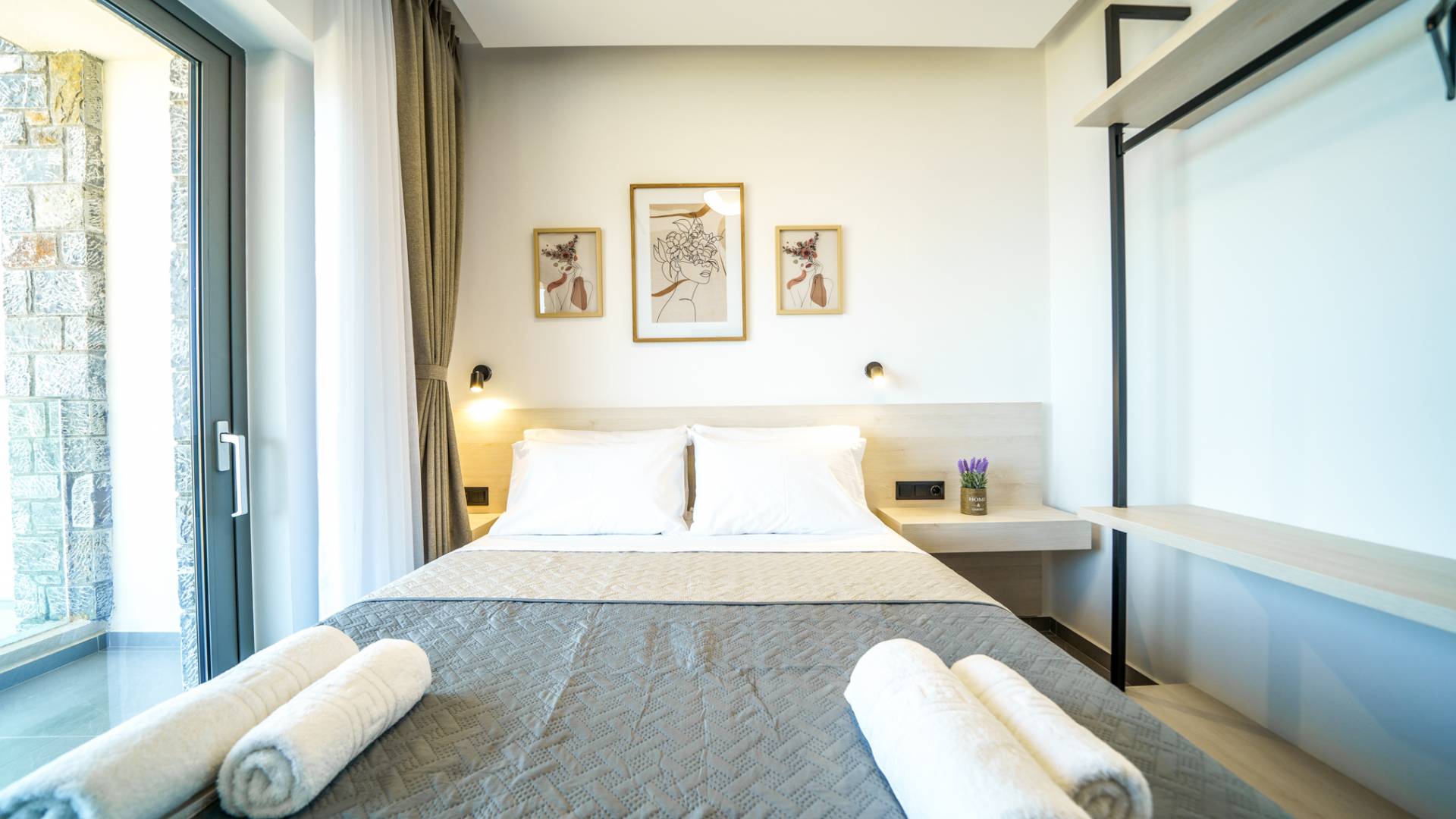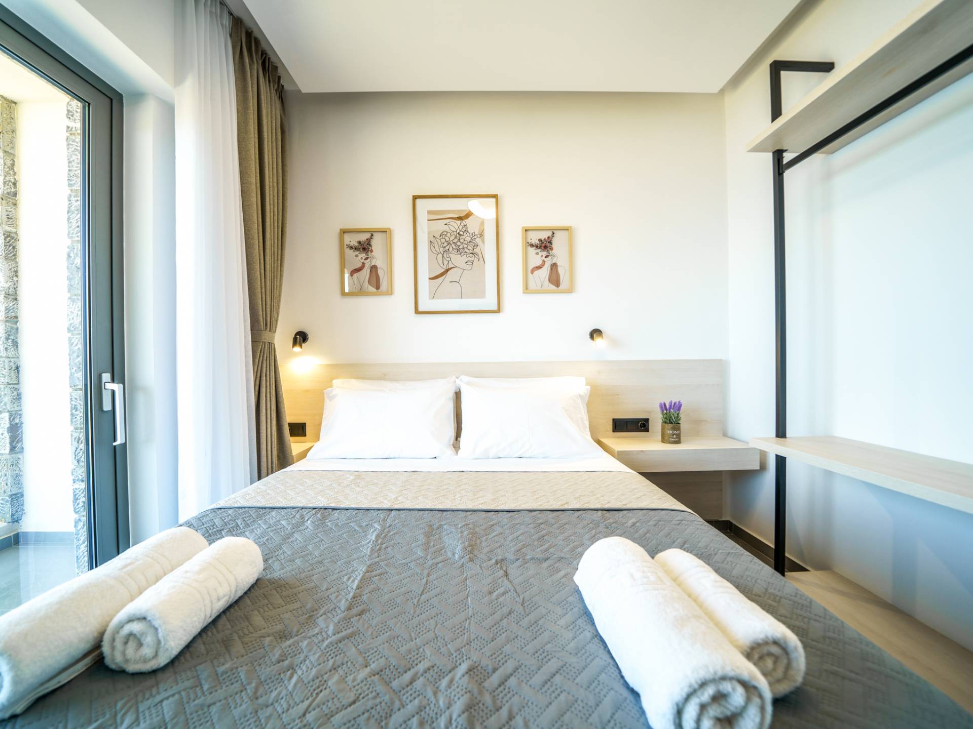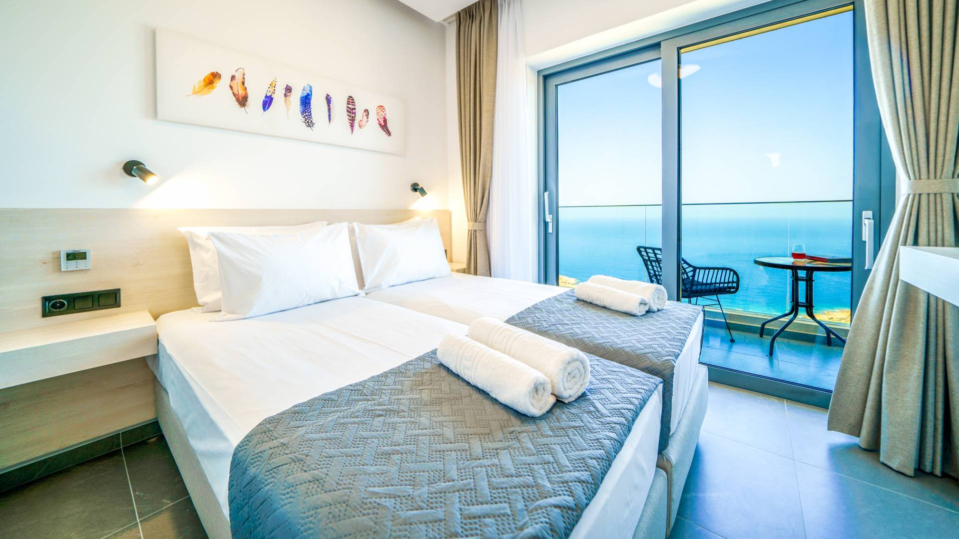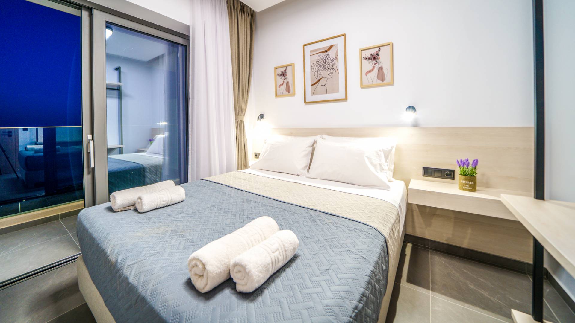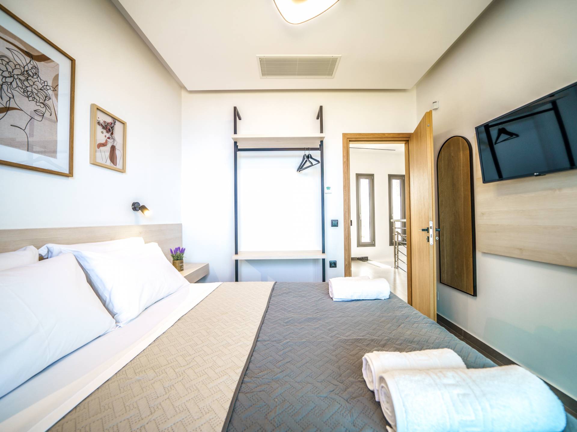 Όταν έρθει η ώρα να αποσυρθείτε για τη νύχτα, σας περιμένουν 3 σχεδιασμένα υπνοδωμάτια. Κάθε υπνοδωμάτιο διαθέτει κρεβάτι 1,60 Χ 2,00, που συμπληρώνεται από τηλεόραση 32 ιντσών, κλιματισμό και ντουλάπα για την άνεσή σας. Όλα τα υπνοδωμάτια παρέχουν πρόσβαση σε ένα μπαλκόνι και μια βεράντα εξοπλισμένη με άνετο καθιστικό, που σας προσκαλεί να ξυπνάτε με τη μαγευτική θέα στη θάλασσα κάθε πρωί.