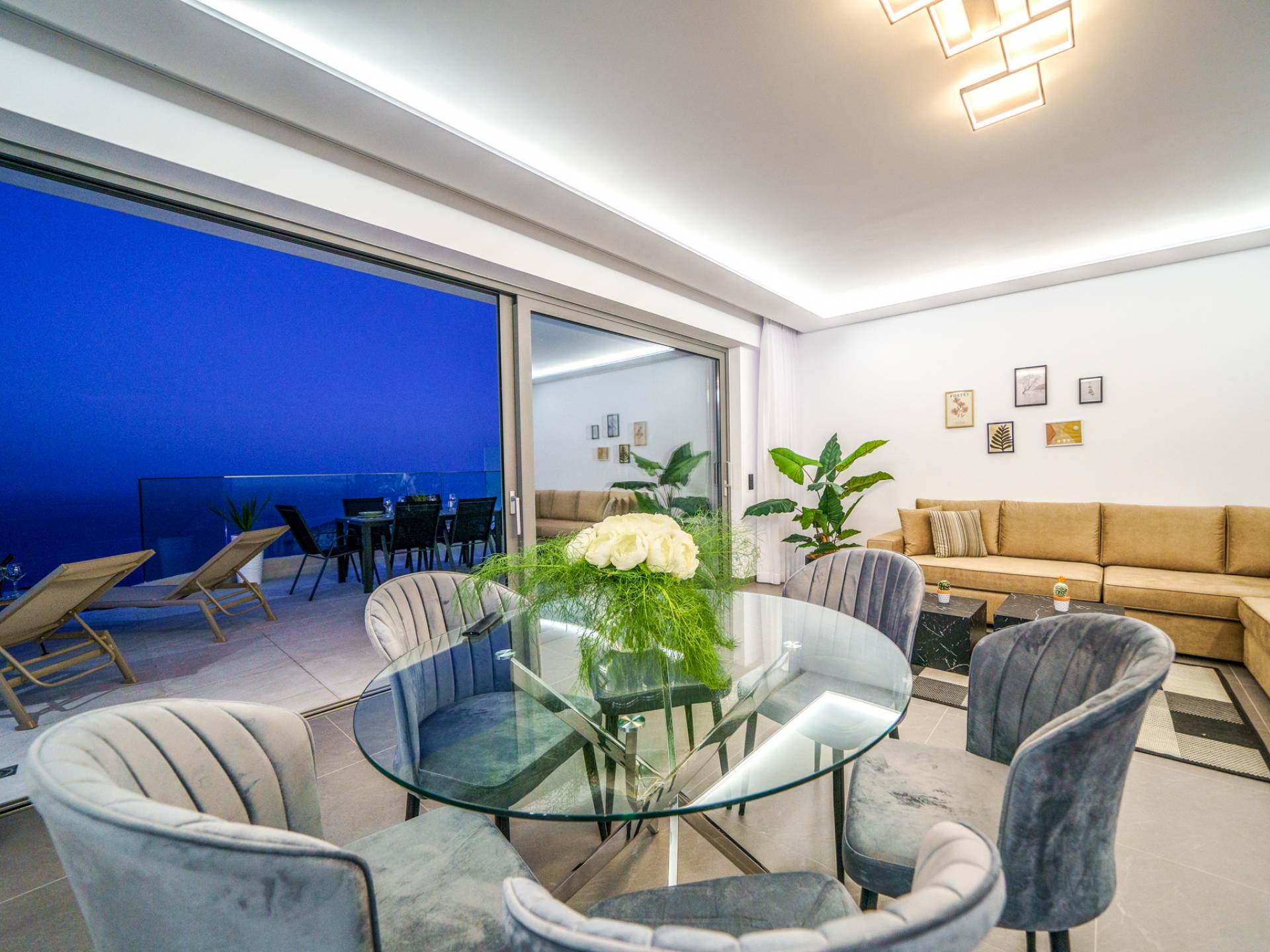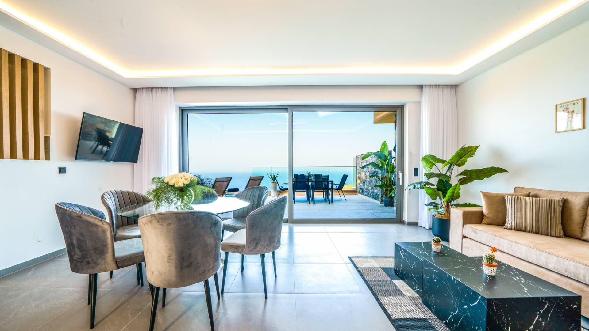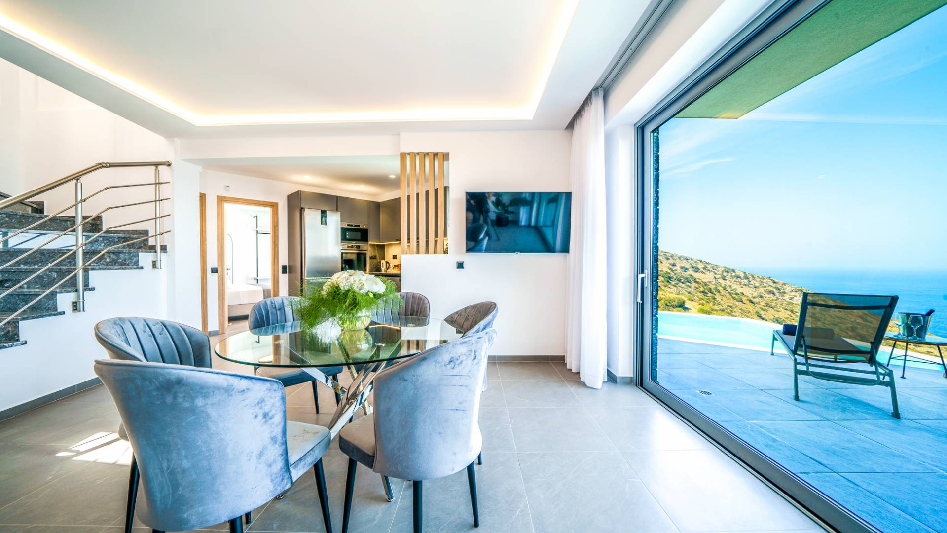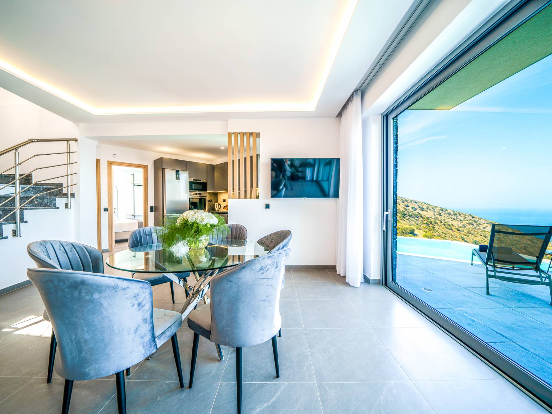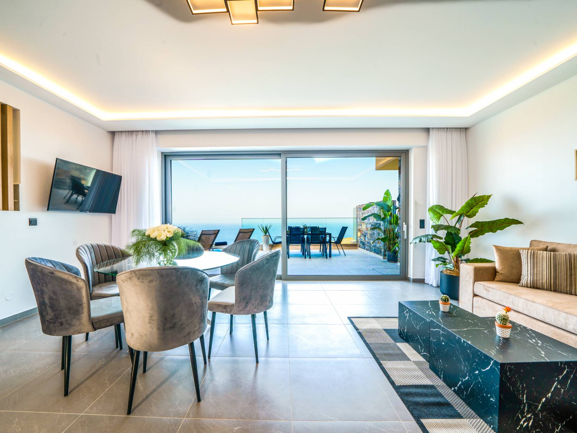 Το σαλόνι σας καλωσορίζει με ένα κομψό καθιστικό με τηλεόραση smart 50 ιντσών, ιδανικό για χαλαρωτικά βράδια καθώς εξερευνάτε περαιτέρω, θα μαγευτείτε από το κομβικό σημείο του καθιστικού: μια ευρύχωρη βεράντα με εκπληκτική θέα στη θάλασσα και σας προσκαλεί να απολαύσετε την ομορφιά της φύσης.