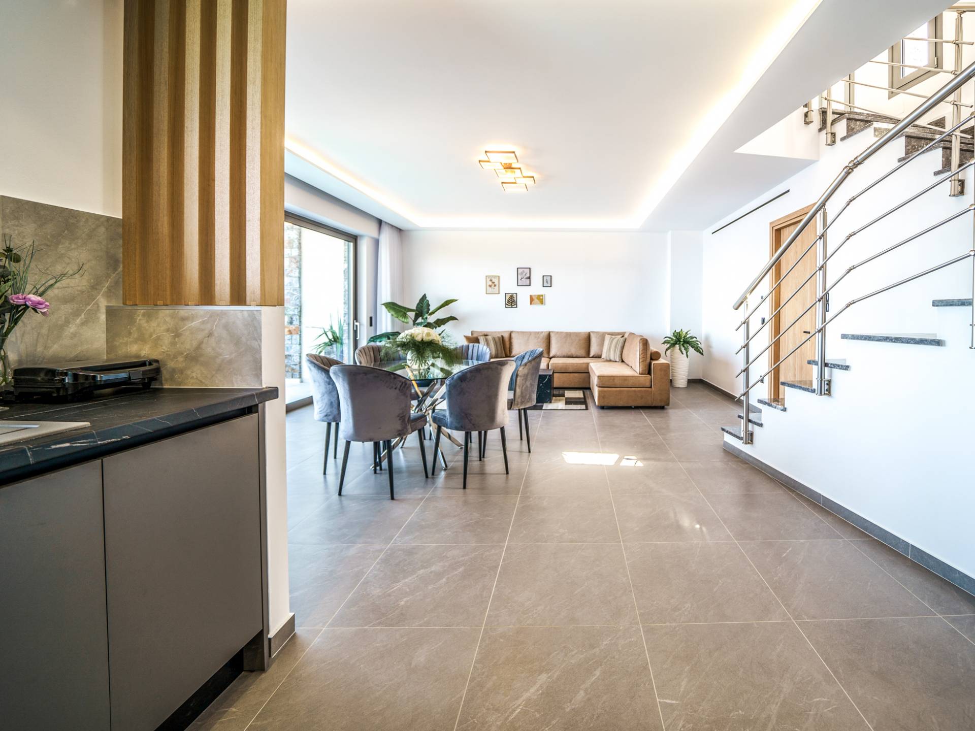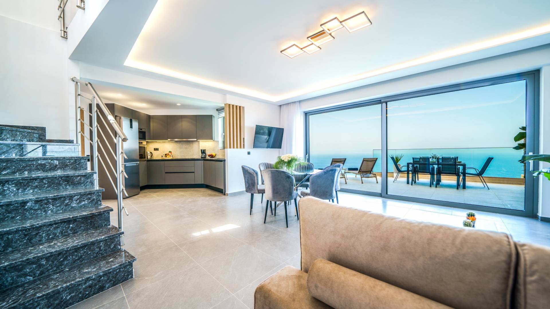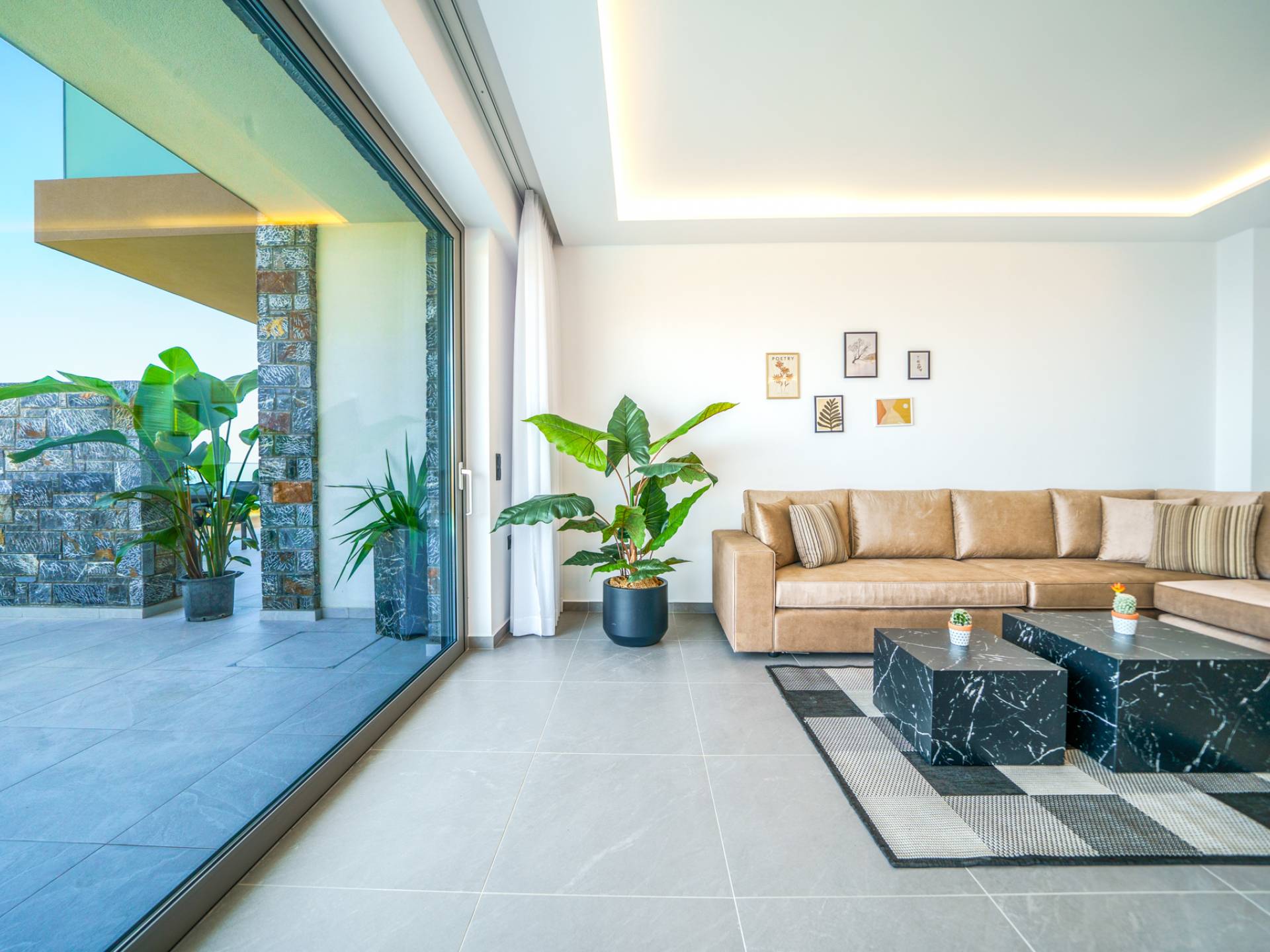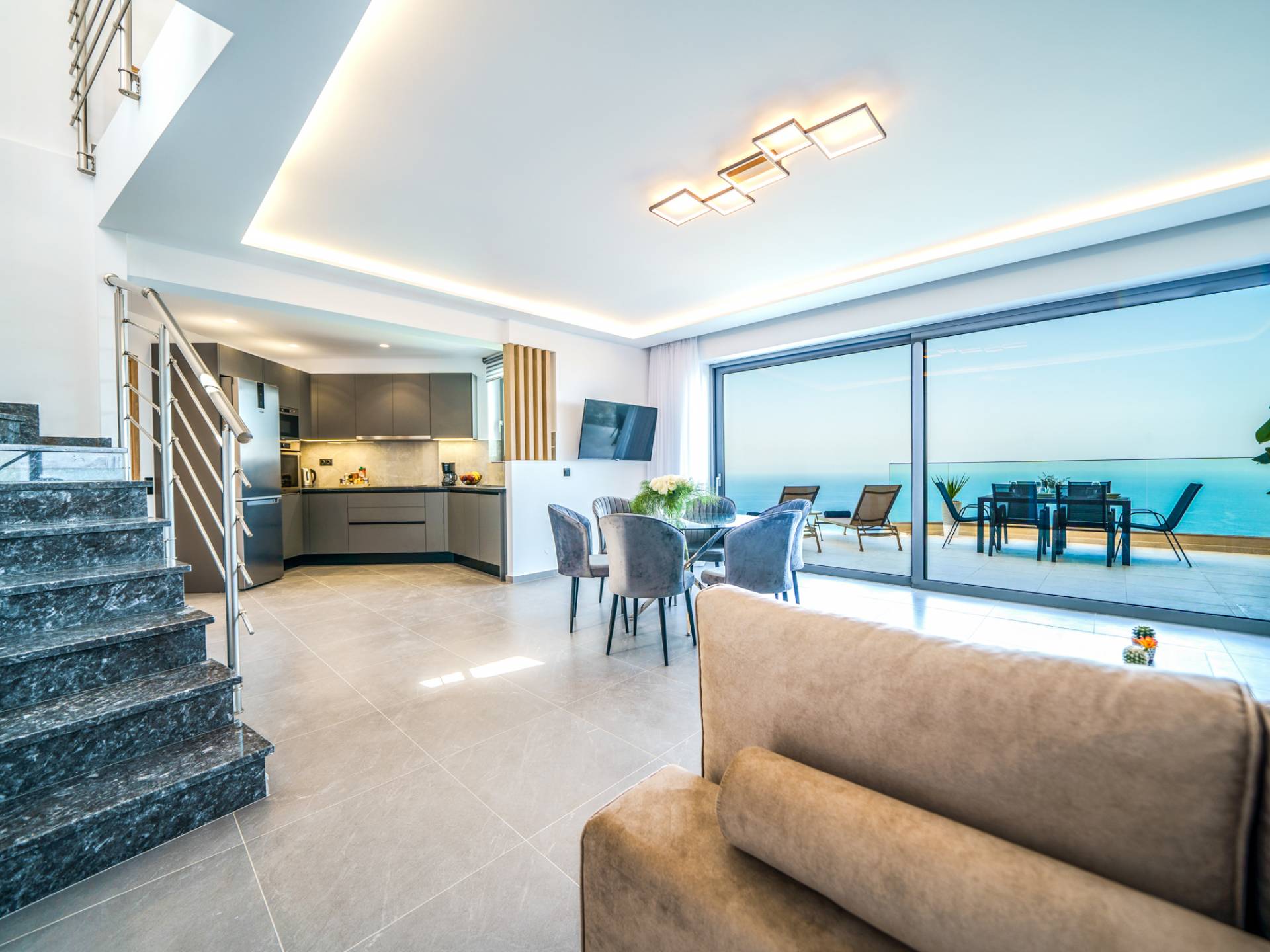 Το σαλόνι σας καλωσορίζει με ένα κομψό καθιστικό με τηλεόραση smart 50 ιντσών, ιδανικό για χαλαρωτικά βράδια καθώς εξερευνάτε περαιτέρω, θα μαγευτείτε από το κομβικό σημείο του καθιστικού: μια ευρύχωρη βεράντα με εκπληκτική θέα στη θάλασσα και σας προσκαλεί να απολαύσετε την ομορφιά της φύσης.