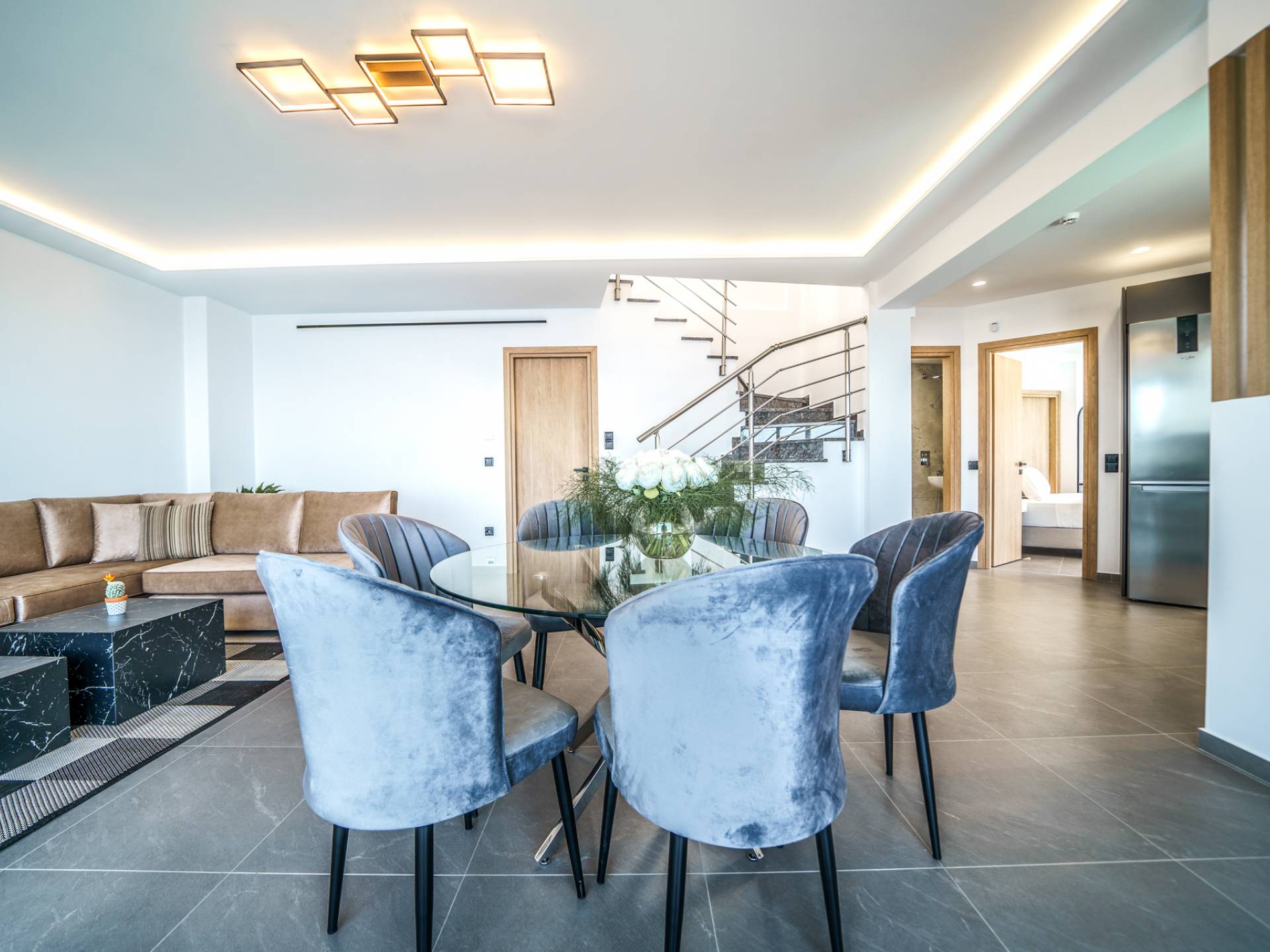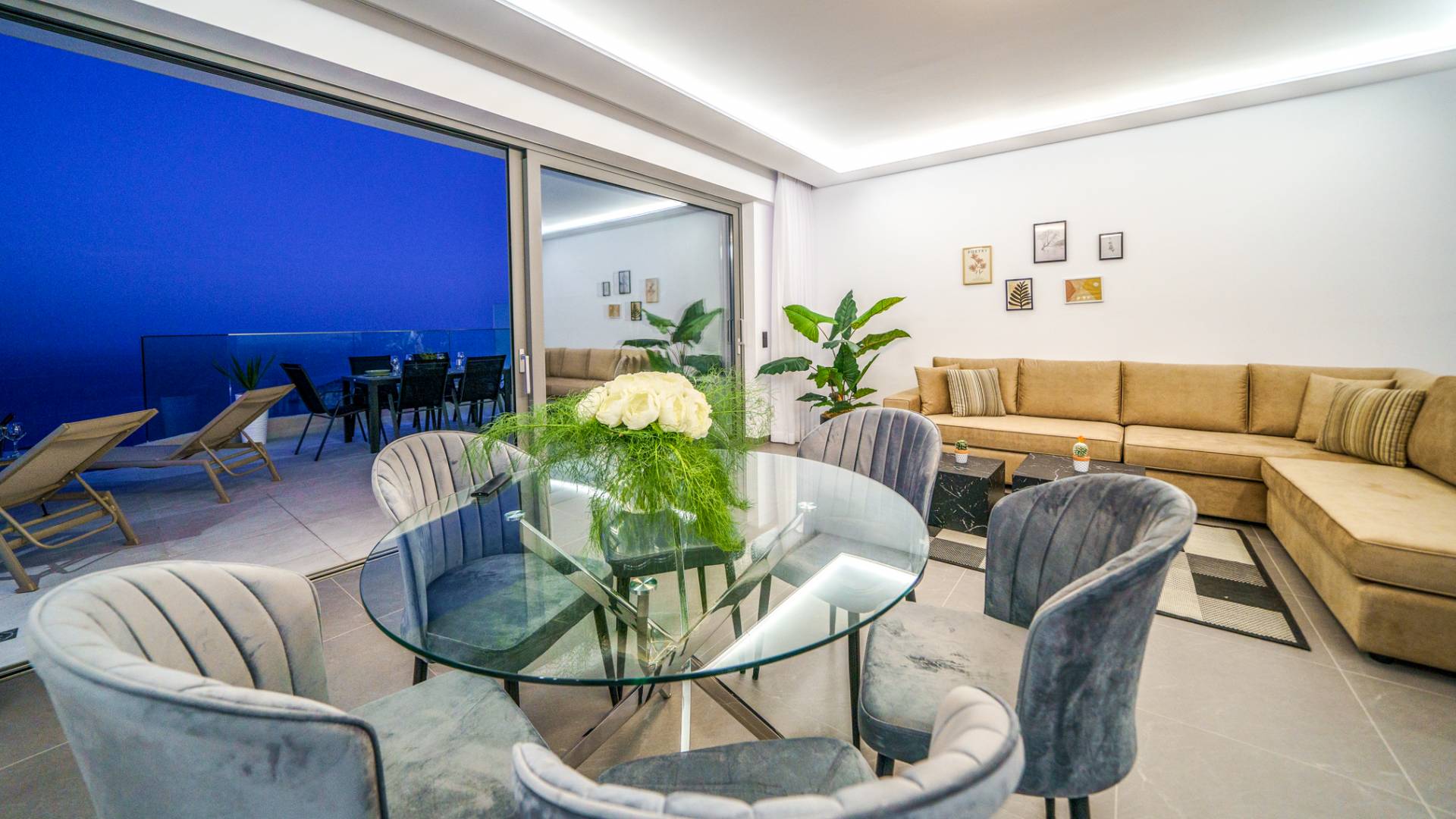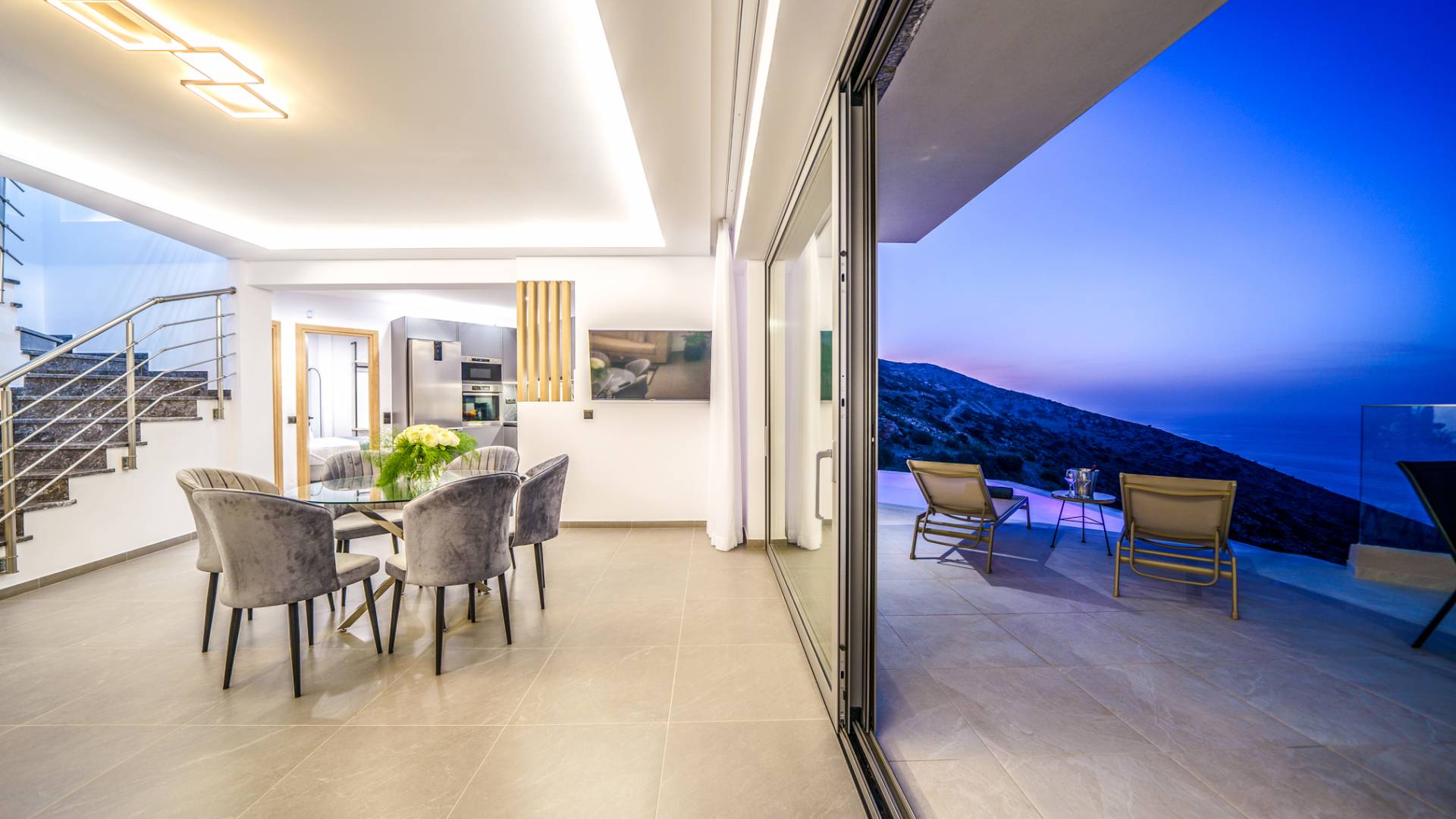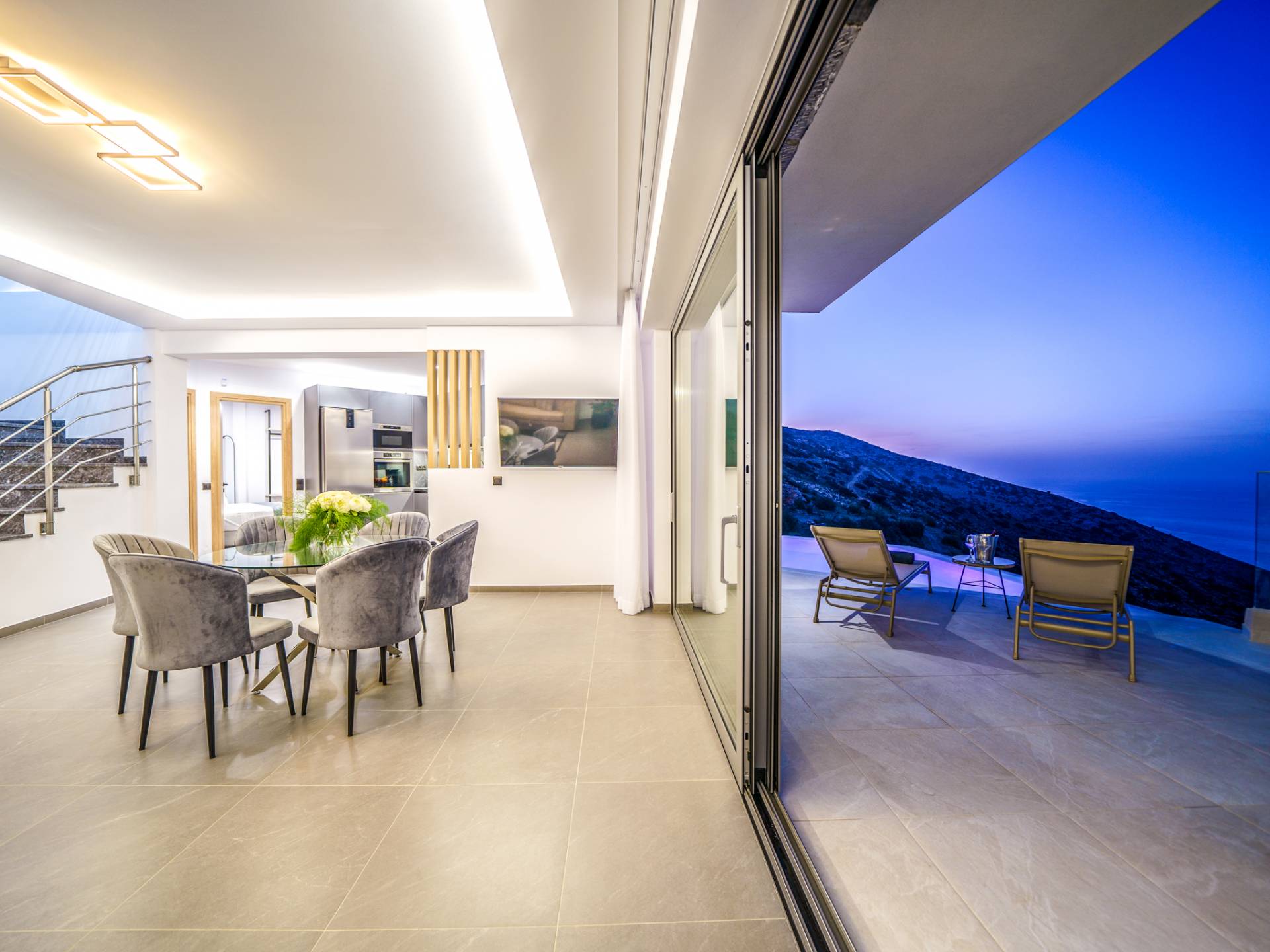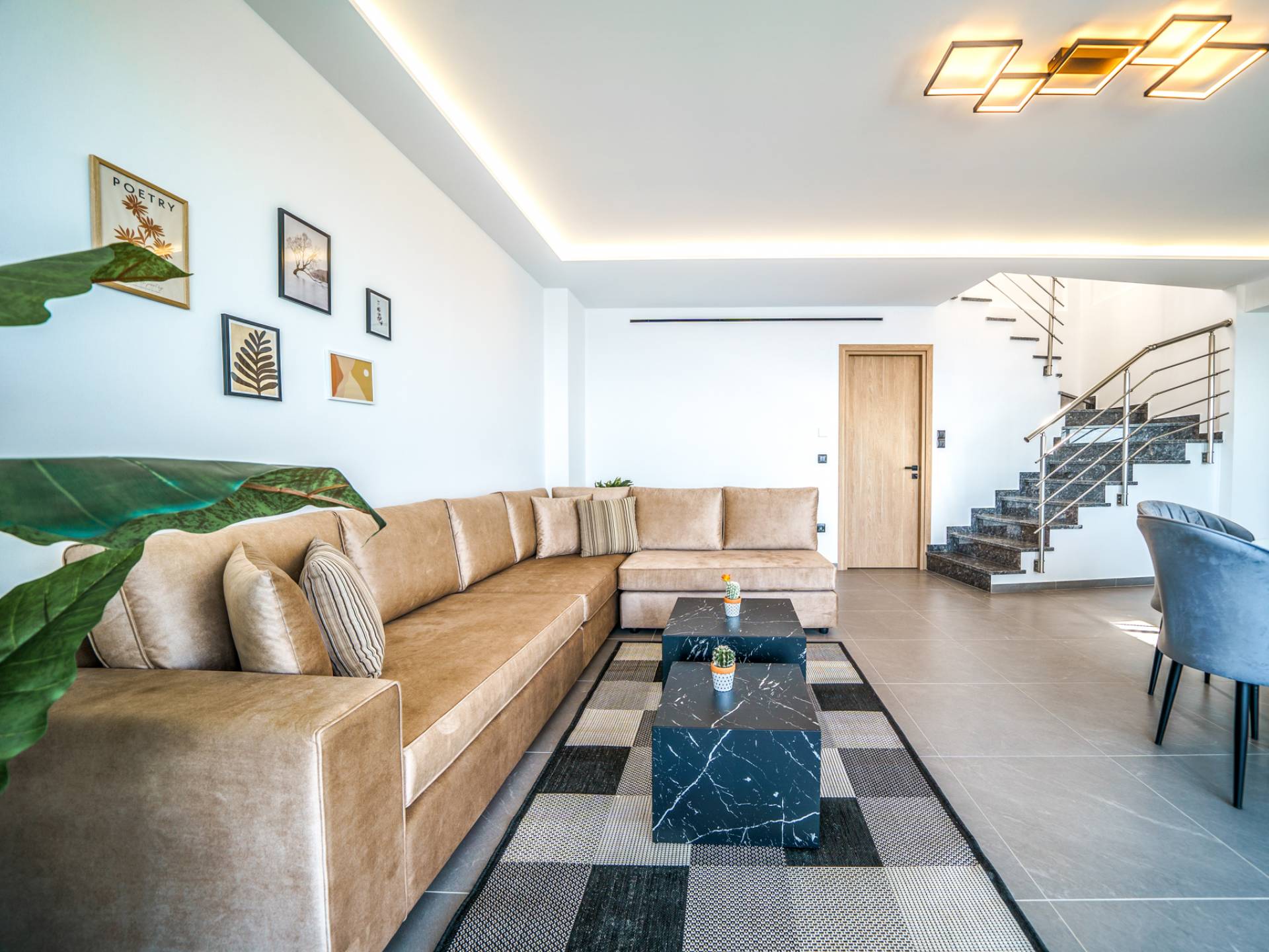 Το σαλόνι σας καλωσορίζει με ένα κομψό καθιστικό με τηλεόραση smart 50 ιντσών, ιδανικό για χαλαρωτικά βράδια καθώς εξερευνάτε περαιτέρω, θα μαγευτείτε από το κομβικό σημείο του καθιστικού: μια ευρύχωρη βεράντα με εκπληκτική θέα στη θάλασσα και σας προσκαλεί να απολαύσετε την ομορφιά της φύσης.
