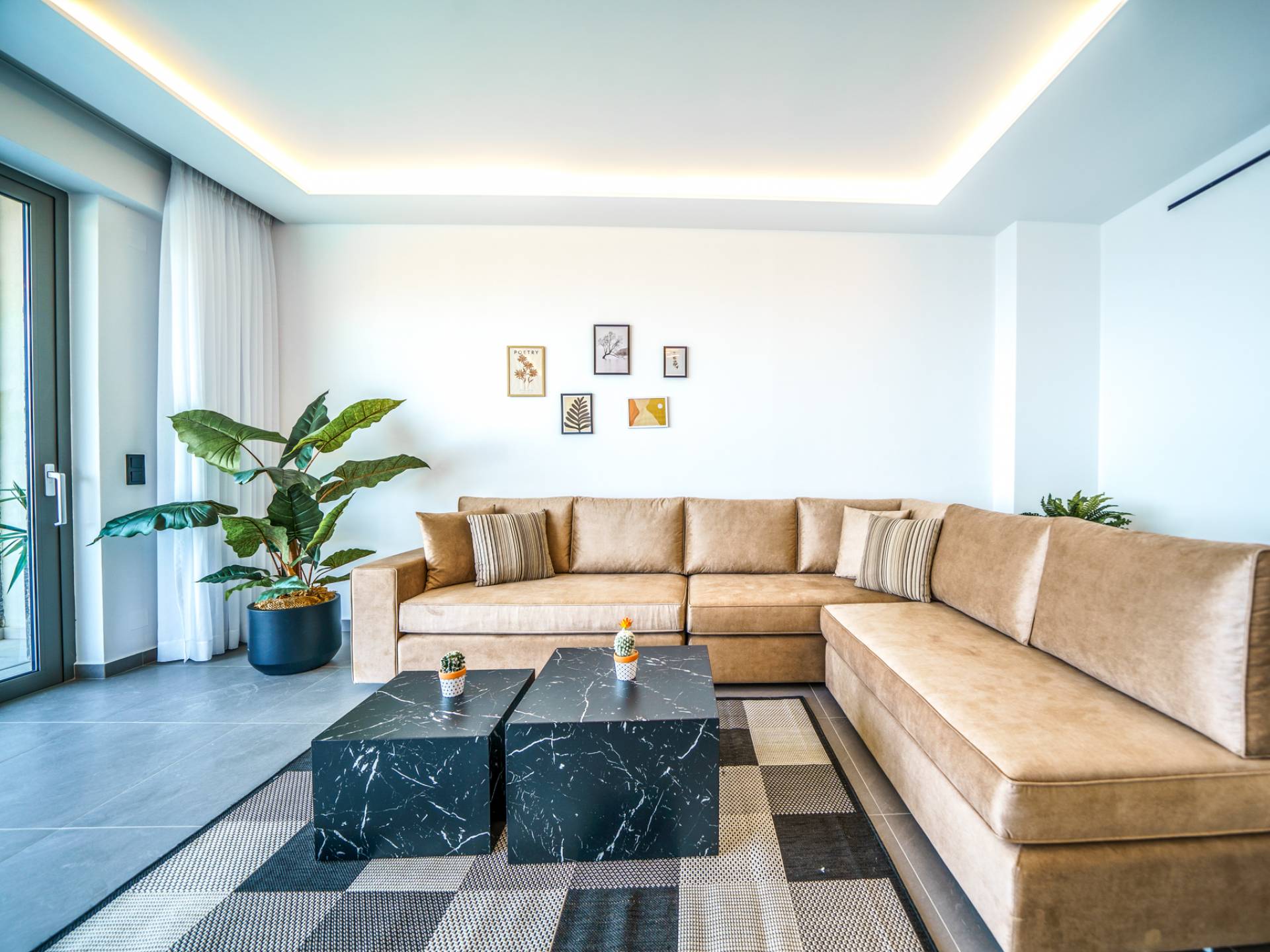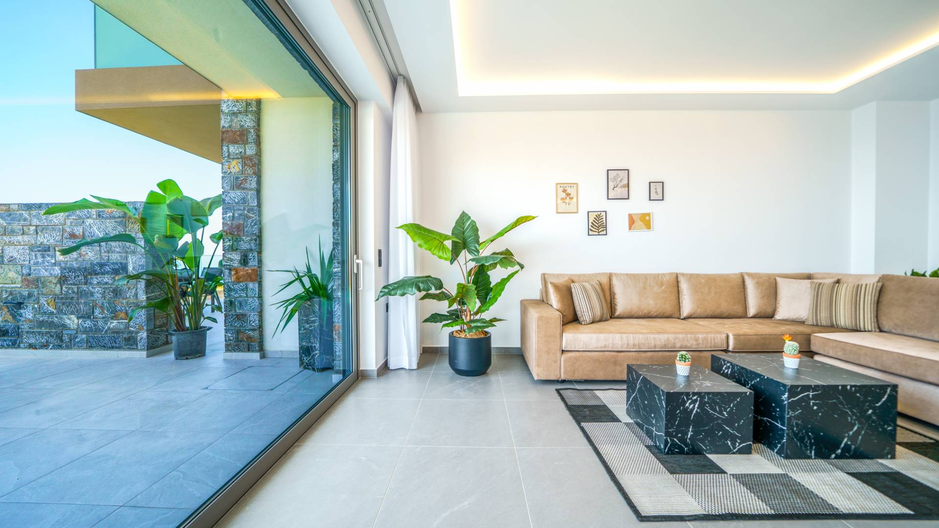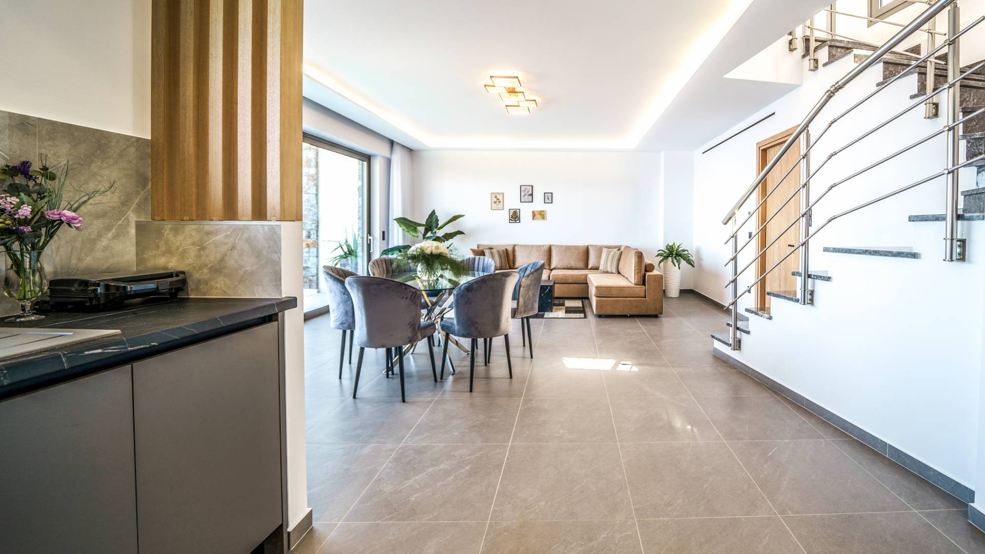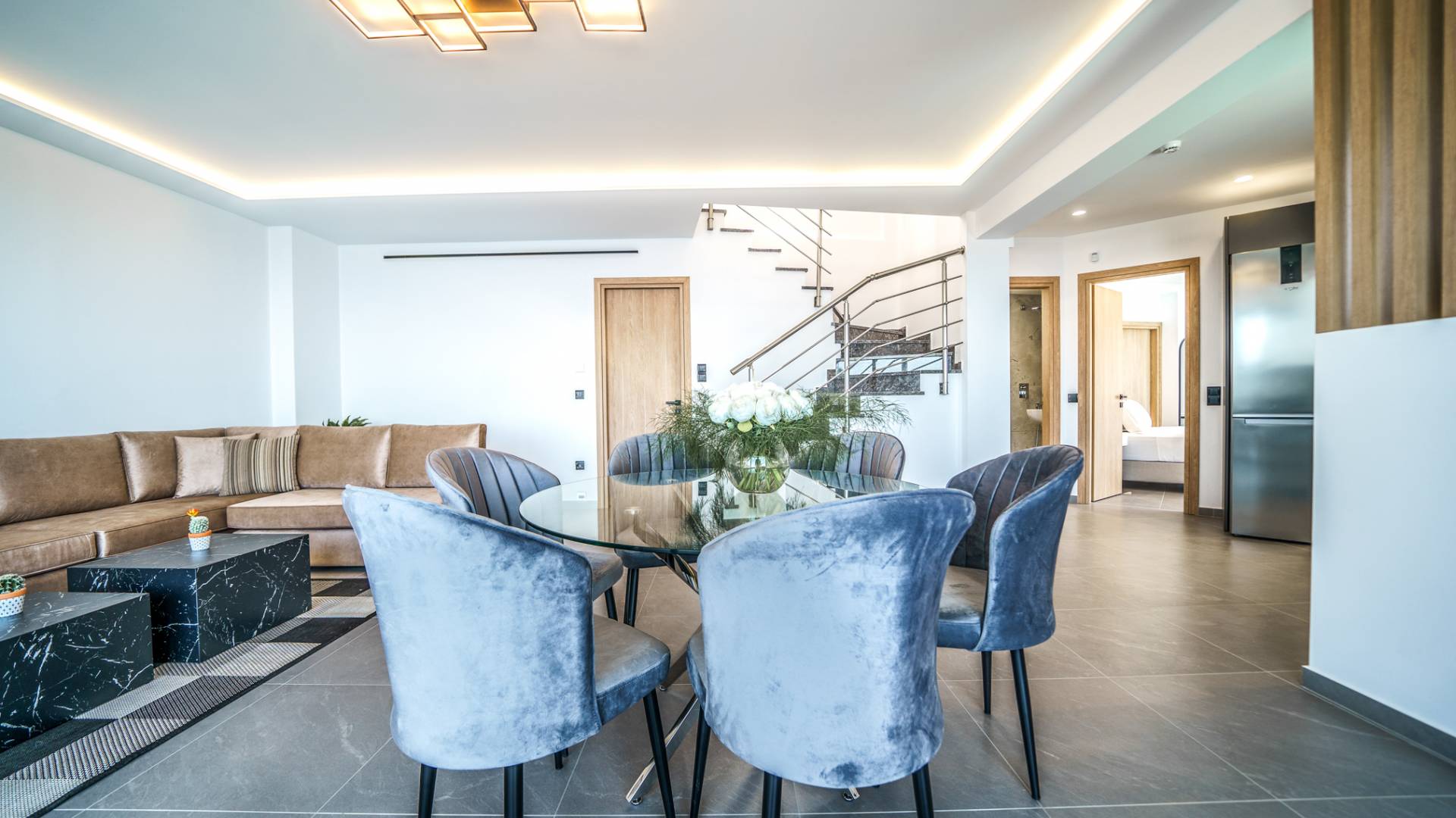 Το σαλόνι σας καλωσορίζει με ένα κομψό καθιστικό με τηλεόραση smart 50 ιντσών, ιδανικό για χαλαρωτικά βράδια καθώς εξερευνάτε περαιτέρω, θα μαγευτείτε από το κομβικό σημείο του καθιστικού: μια ευρύχωρη βεράντα με εκπληκτική θέα στη θάλασσα και σας προσκαλεί να απολαύσετε την ομορφιά της φύσης.