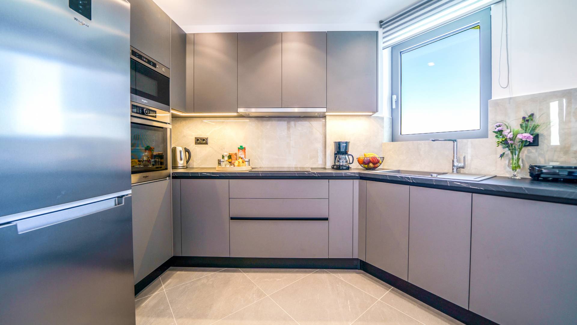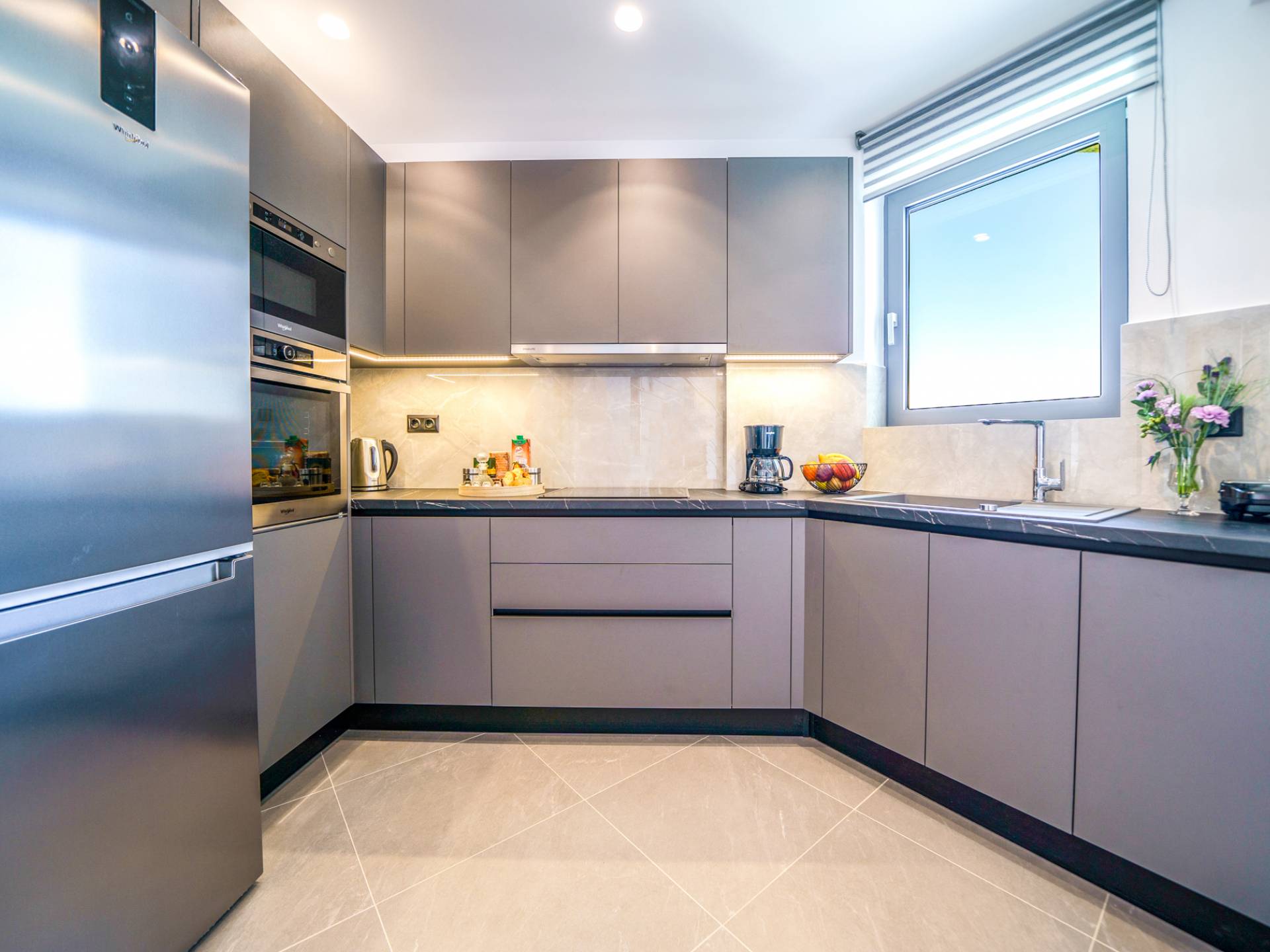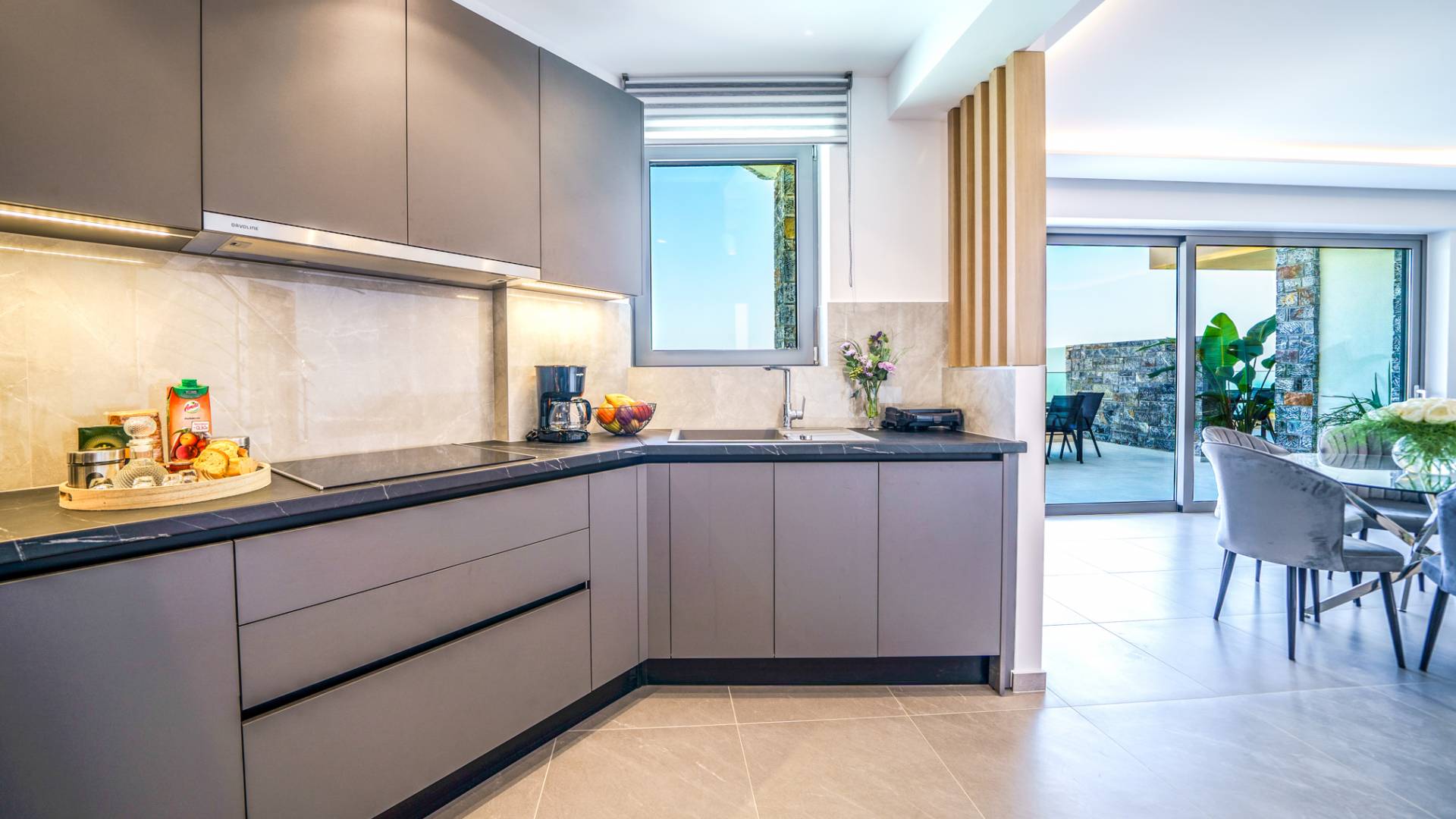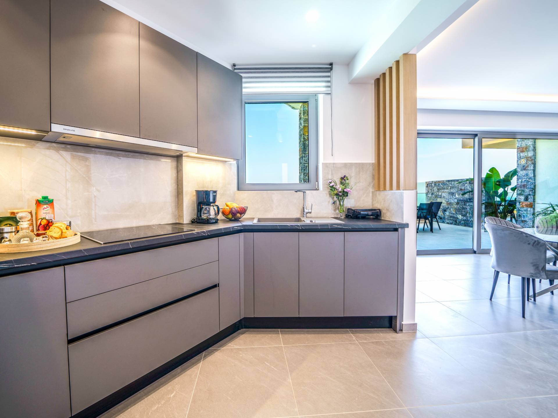 Δίπλα στο σαλόνι, θα ανακαλύψετε μια πλήρως εξοπλισμένη κουζίνα που μπορεί να καλύψει όλες τις γαστρονομικές σας επιθυμίες, καθώς και μια διπλανή τραπεζαρία για 6 άτομα με φόντο την εκπληκτική θέα μέσα από μεγάλα παράθυρα.