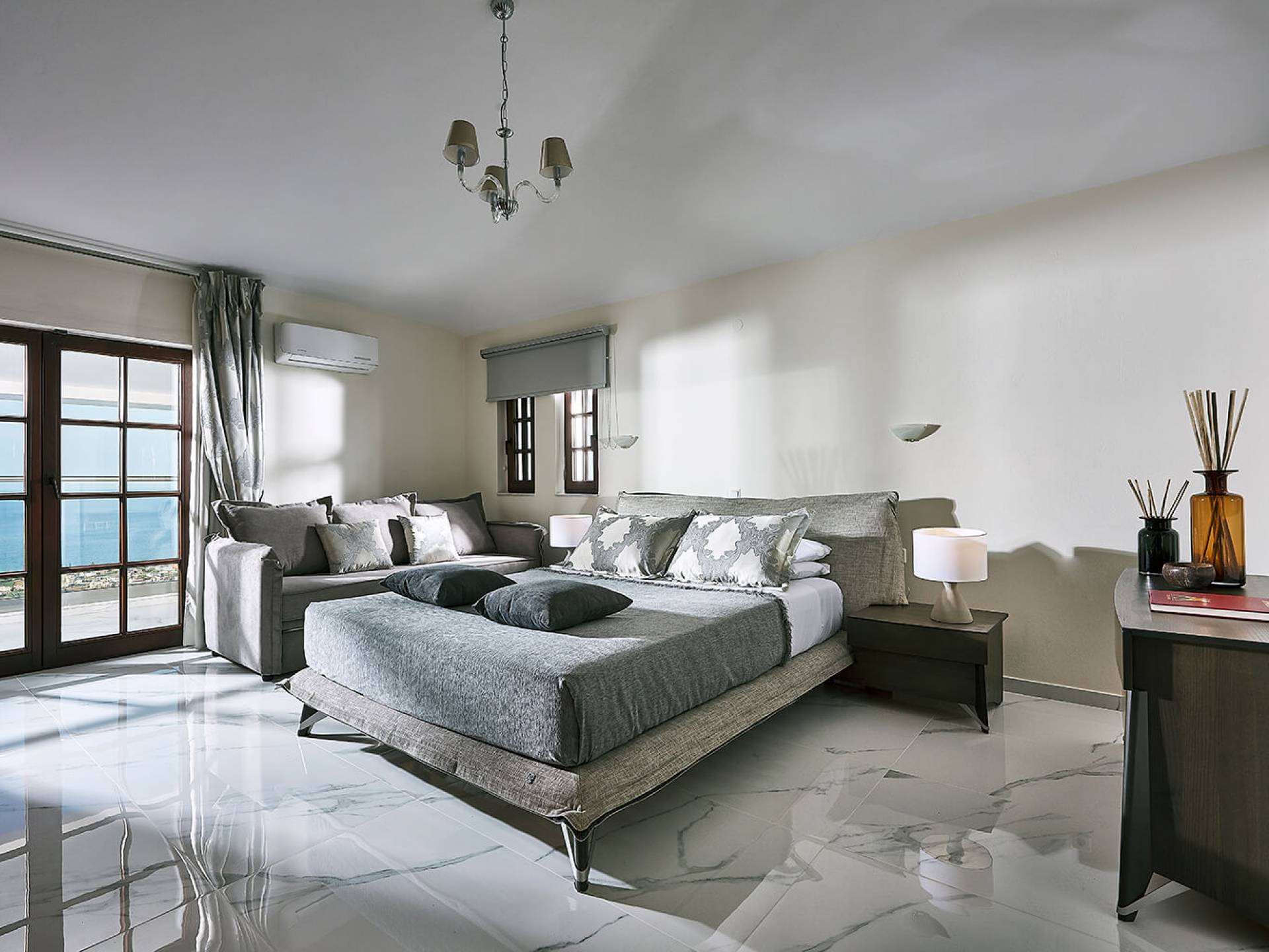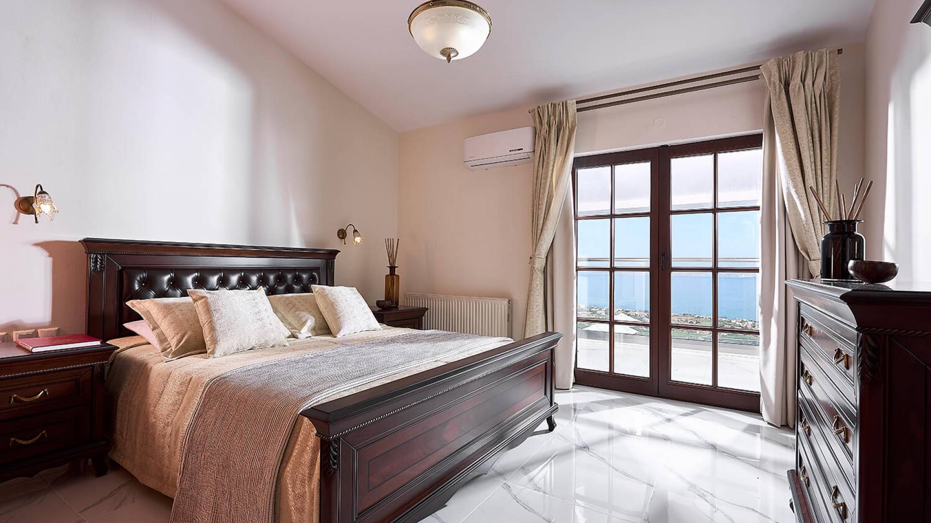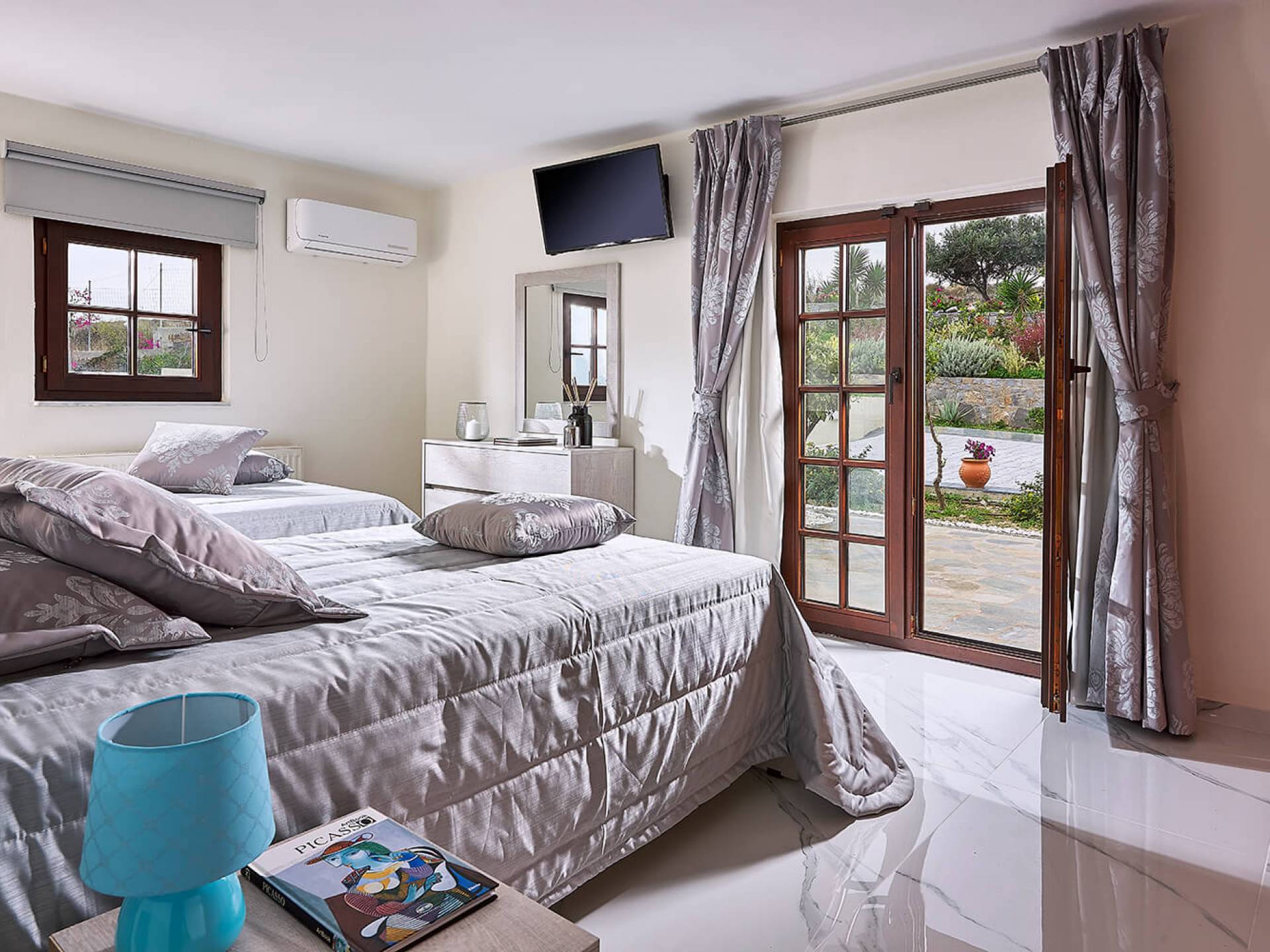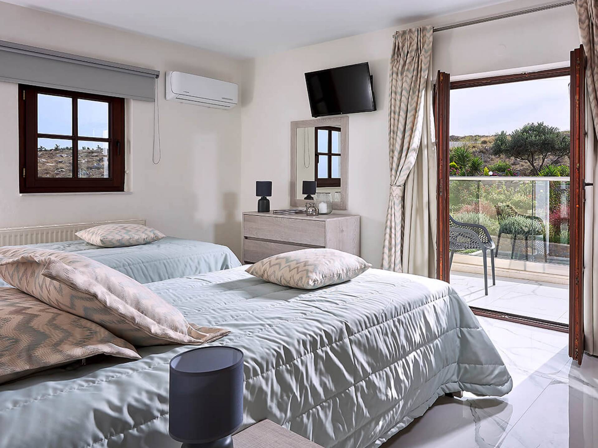 Στον πρώτο όροφο, υπάρχουν τρία υπνοδωμάτια. Το πρώτο υπνοδωμάτιο διαθέτει διπλό κρεβάτι, τηλεόραση, κλιματισμό και βεράντα με θέα στην πισίνα και τη θάλασσα. Το δεύτερο υπνοδωμάτιο διαθέτει διπλό κρεβάτι, καναπέ-κρεβάτι για δύο άτομα, τηλεόραση, κλιματισμό και βεράντα με θέα στη θάλασσα. Το τρίτο υπνοδωμάτιο, με θέα στον κήπο, διαθέτει δύο μονά κρεβάτια, τηλεόραση, κλιματισμό και πόρτα που οδηγεί στον κήπο. Στον δεύτερο όροφο υπάρχουν 2 υπνοδωμάτια και ένα μπάνιο. Το πρώτο υπνοδωμάτιο διαθέτει διπλό κρεβάτι, κλιματισμό, τηλεόραση και βεράντα με θέα στον κήπο. Το δεύτερο υπνοδωμάτιο διαθέτει δύο μονά κρεβάτια, τηλεόραση, κλιματισμό και βεράντα με θέα στον κήπο. Επίσης σε αυτόν τον όροφο, υπάρχει μια μεγάλη βεράντα (100 τμ) με εξαιρετική πανοραμική θέα στη θάλασσα.